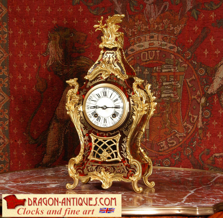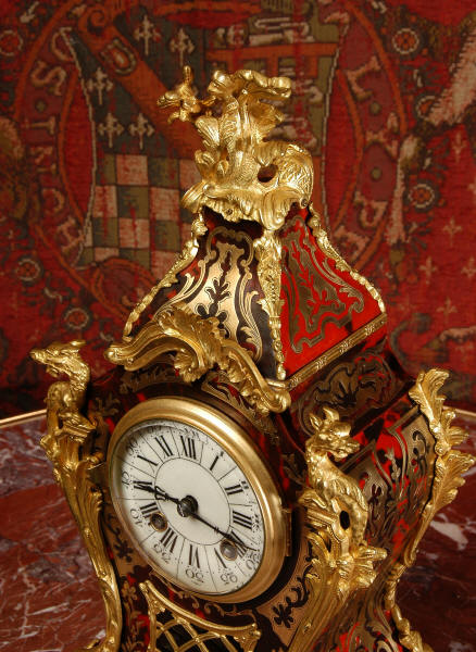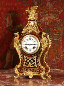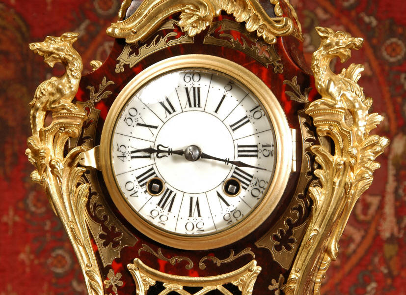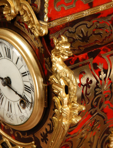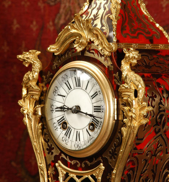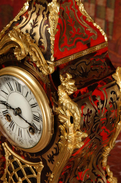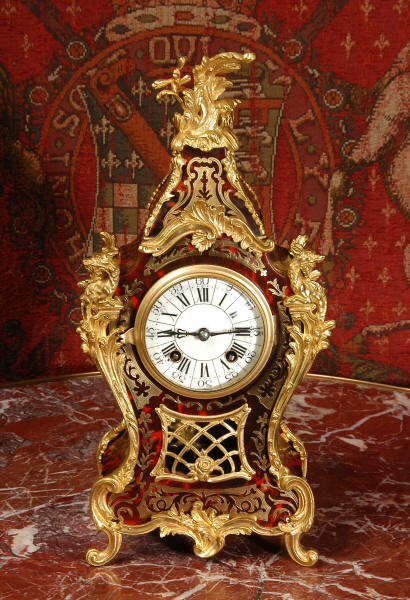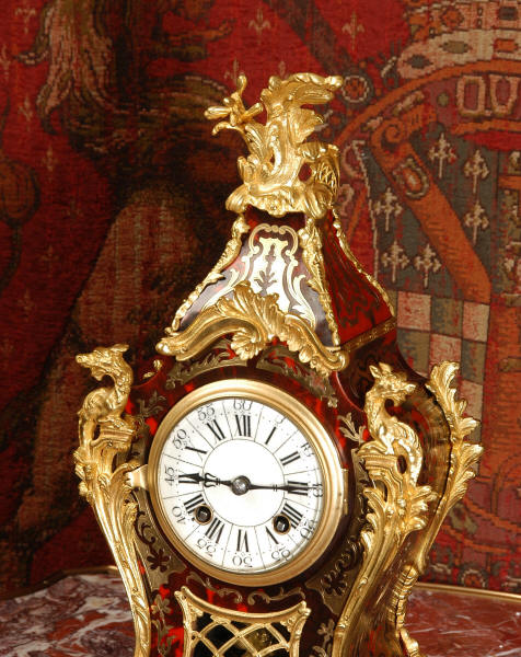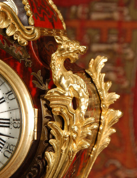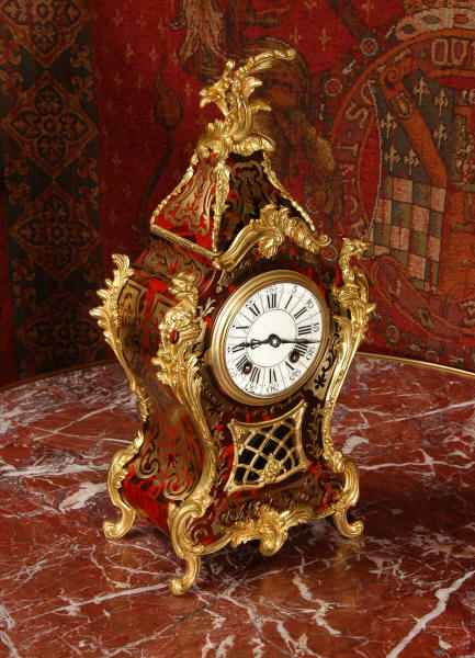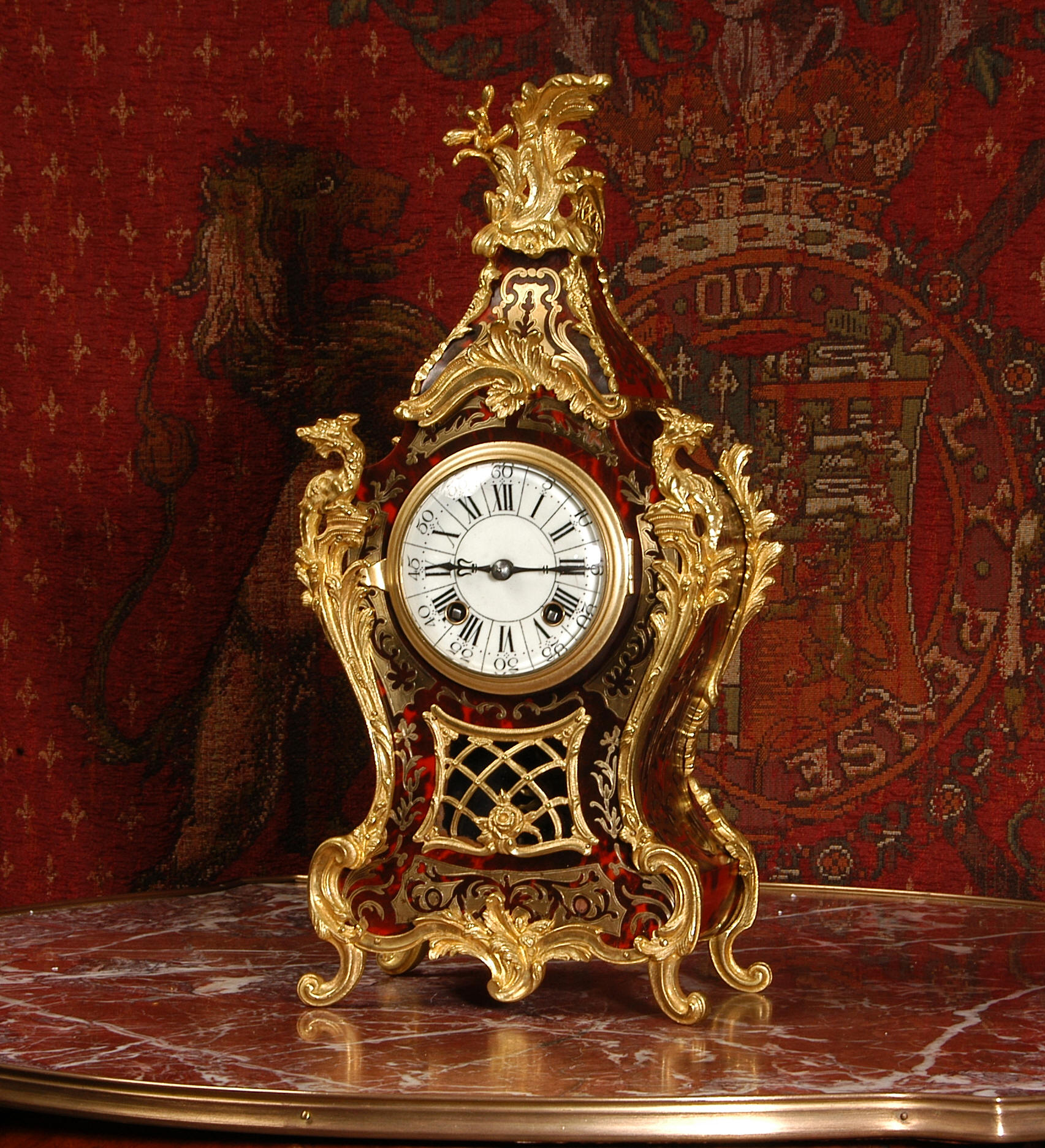 work in the Rococo style. Ornate Brass is delicately inlaid into the red veneer