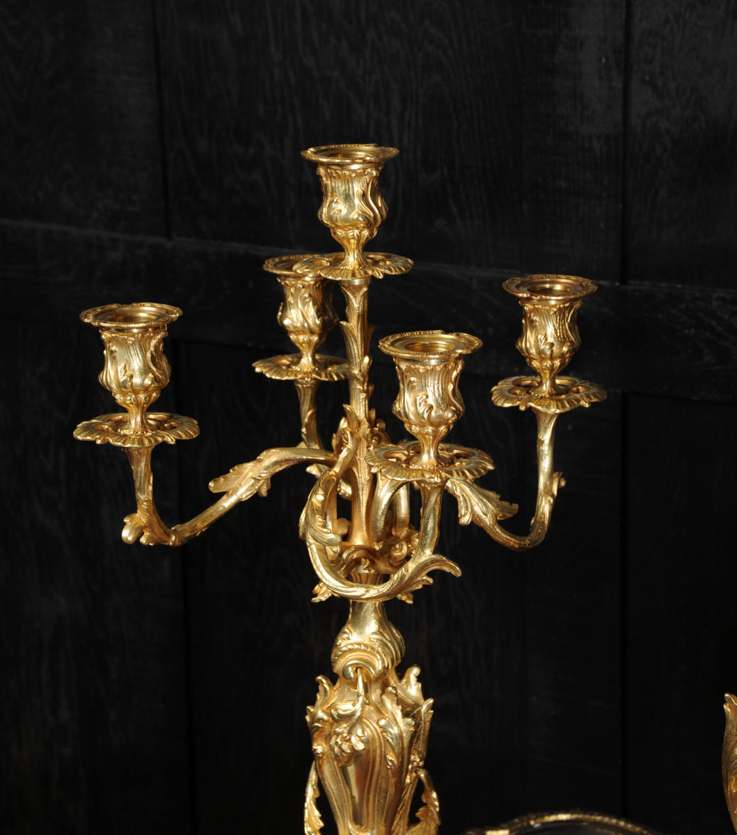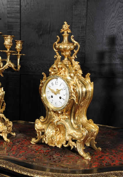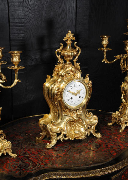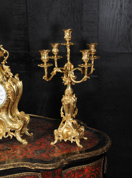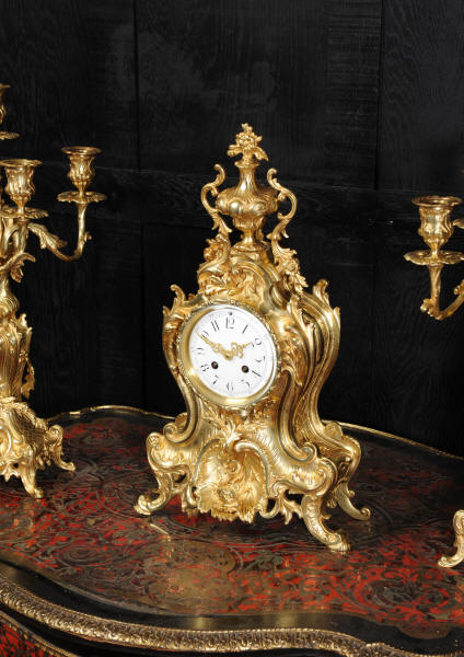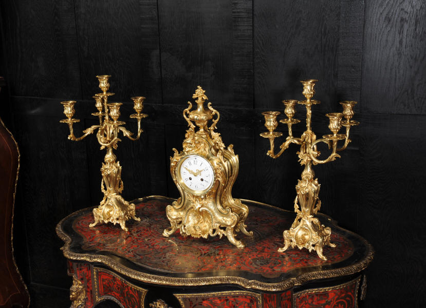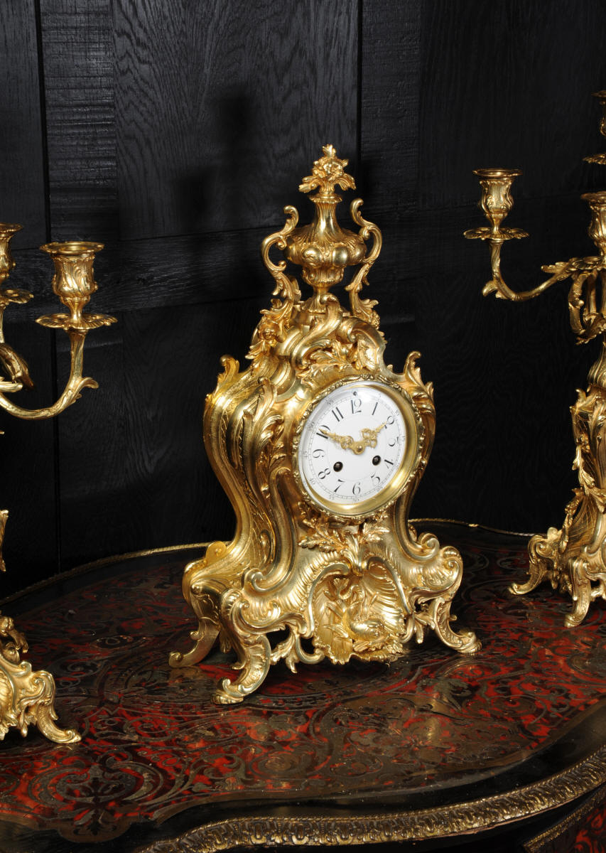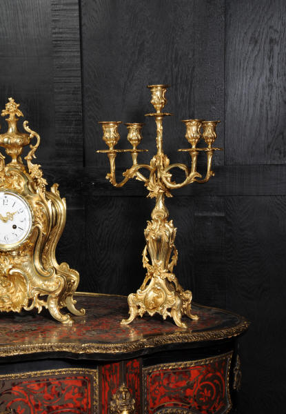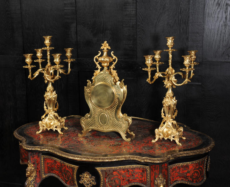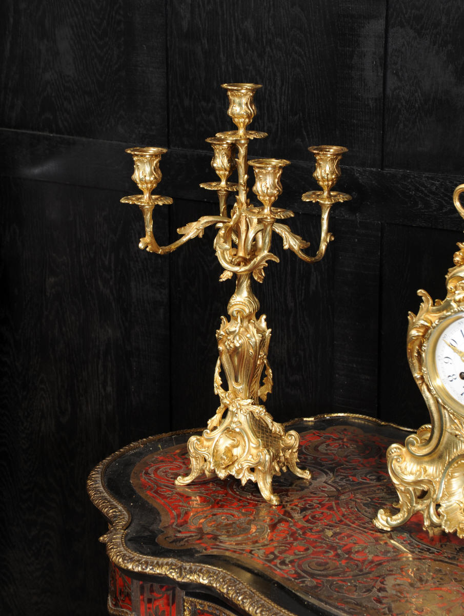 The beautiful, large enamel dial is lettered with separate minute and hour rings and is complete with the original finely cut gilt brass hands. The heavy Rococo bezel is fitted with convex glass. The French movement is of high quality and is in excellent clean and running condition having been fully overhauled and tested by our clockmaker. Pendulum is a replacement. It runs for 8 days and strikes the hours and halves on a bell. Click the video clip below to hear the bell and watch the clock running! Condition of the case is excellent, the original gilding is beautifully clean and bright with hardly any wear or discolouration and there are no losses. The urns leans forward slight as part of the design. Candelabra are slightly distorted. The dial is also in excellent condition just some faint hairlines. The set makes a stunning display as you can see below.