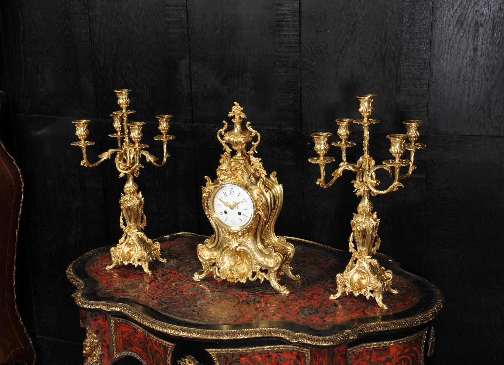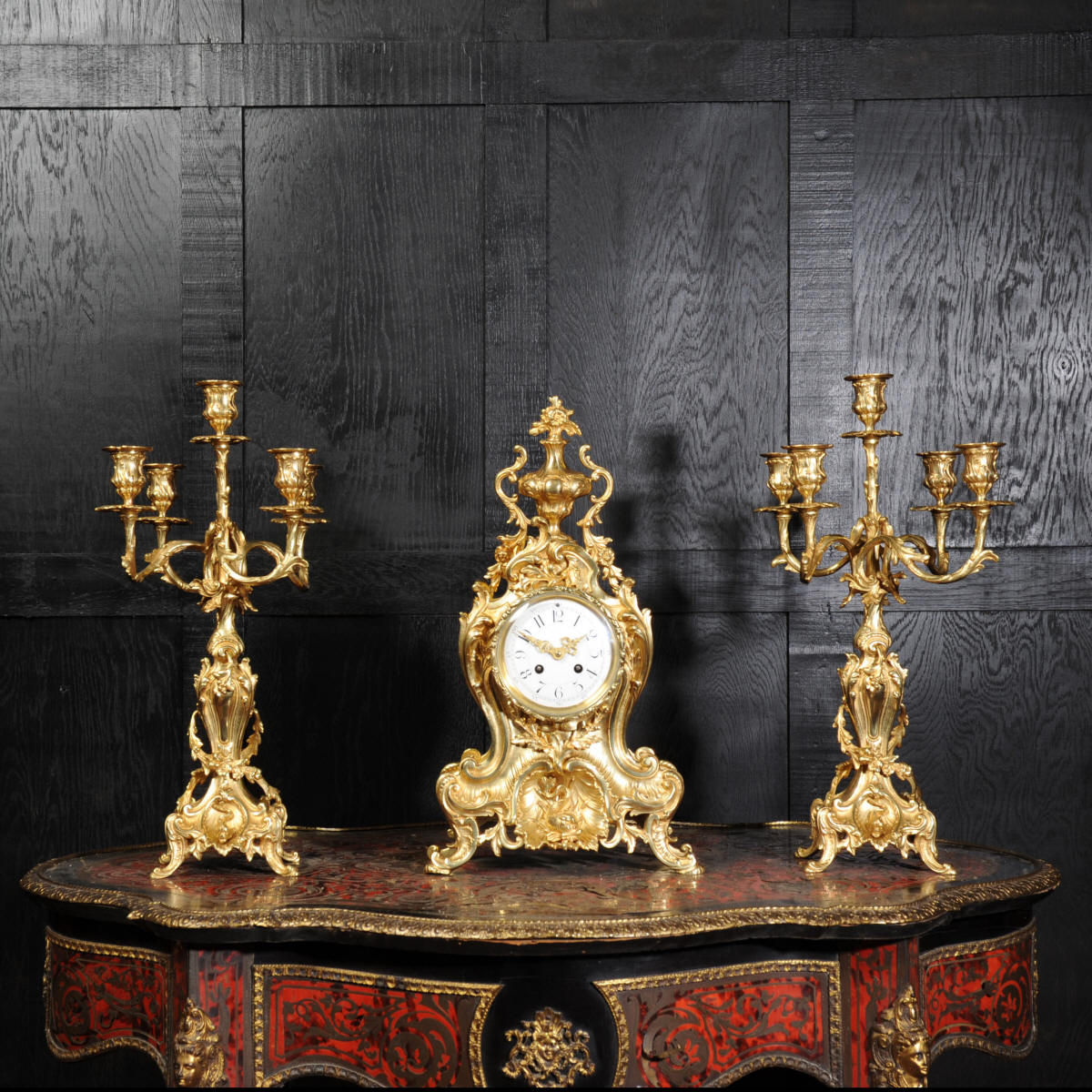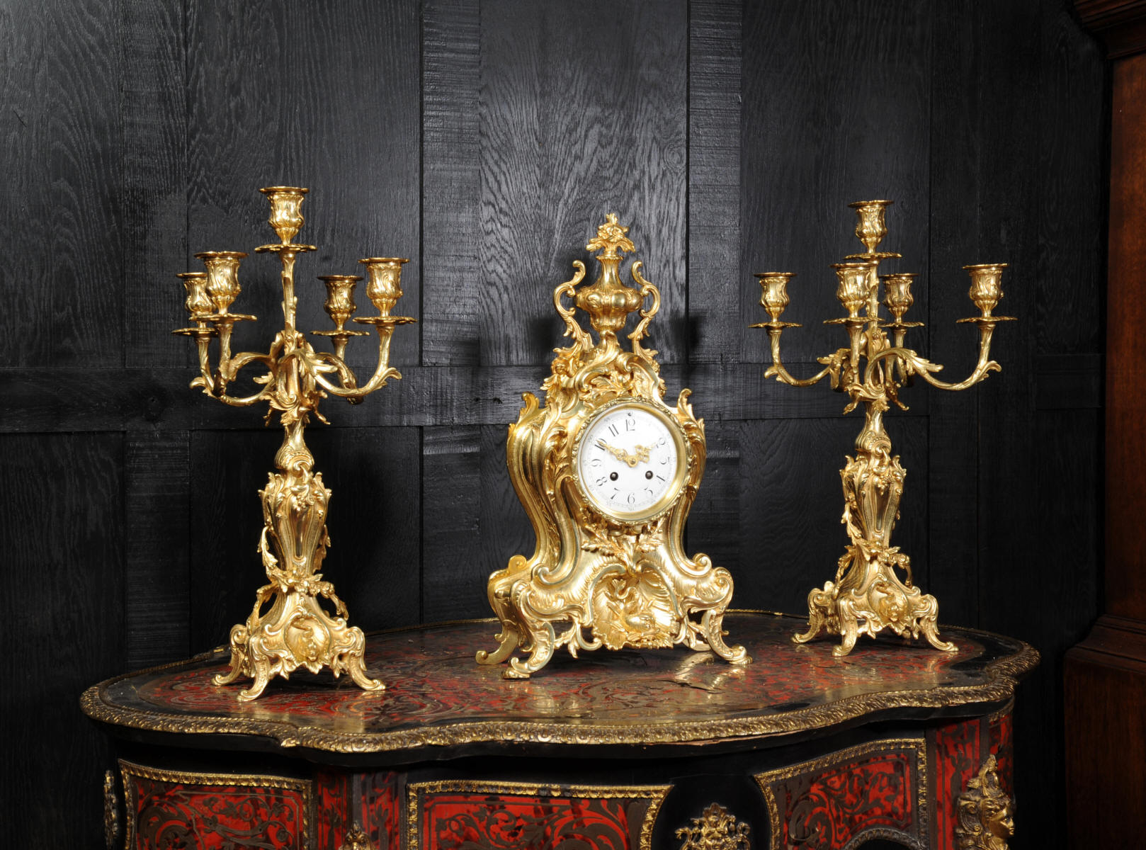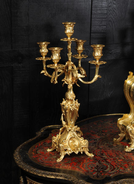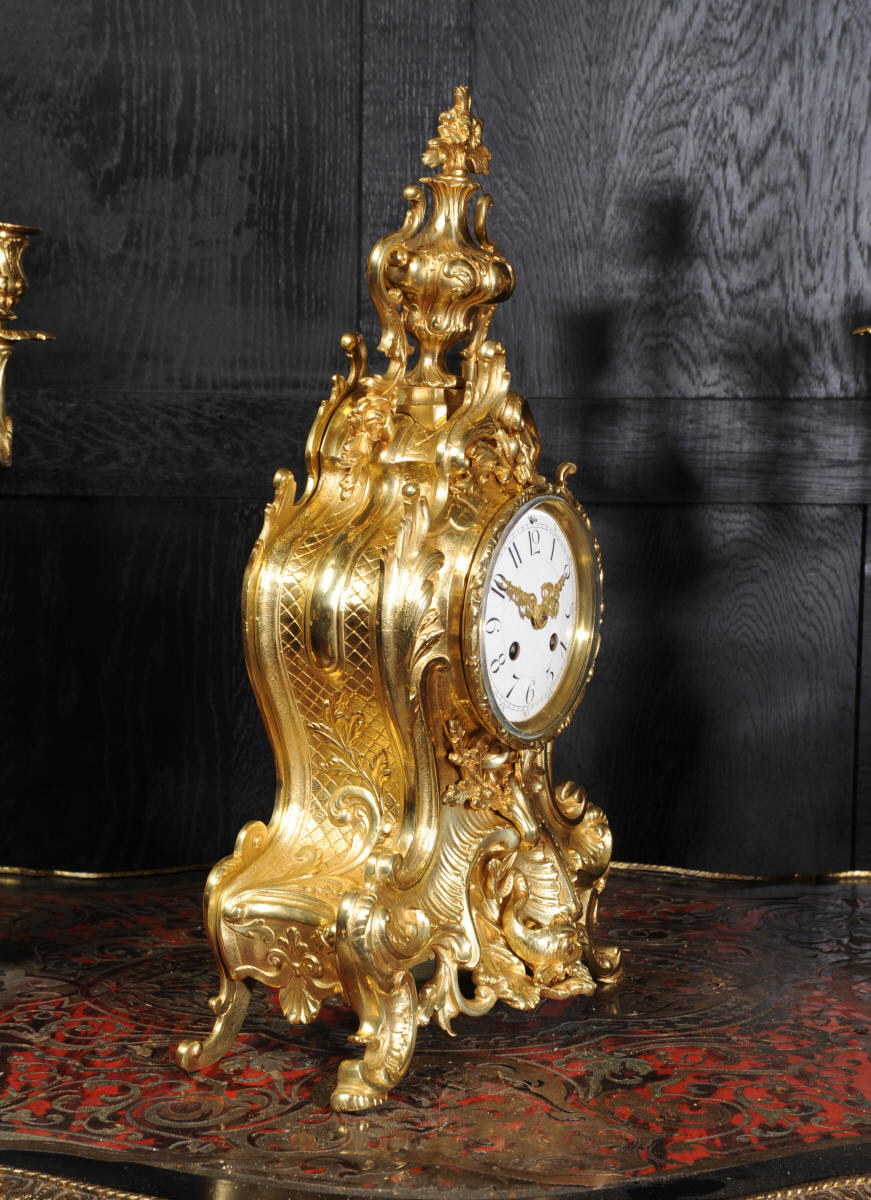 The beautiful, large enamel dial is lettered with separate minute and hour rings and is complete with the original finely cut gilt brass hands. The heavy Rococo bezel is fitted with convex glass. The French movement is of high quality and is in excellent clean and running condition having been fully overhauled and tested by our clockmaker. Pendulum is a replacement. It runs for 8 days and strikes the hours and halves on a bell. Click the video clip below to hear the bell and watch the clock running! Condition of the case is excellent, the original gilding is beautifully clean and bright with hardly any wear or discolouration and there are no losses. The urns leans forward slight as part of the design. Candelabra are slightly distorted. The dial is also in excellent condition just some faint hairlines. The set makes a stunning display as you can see below.
