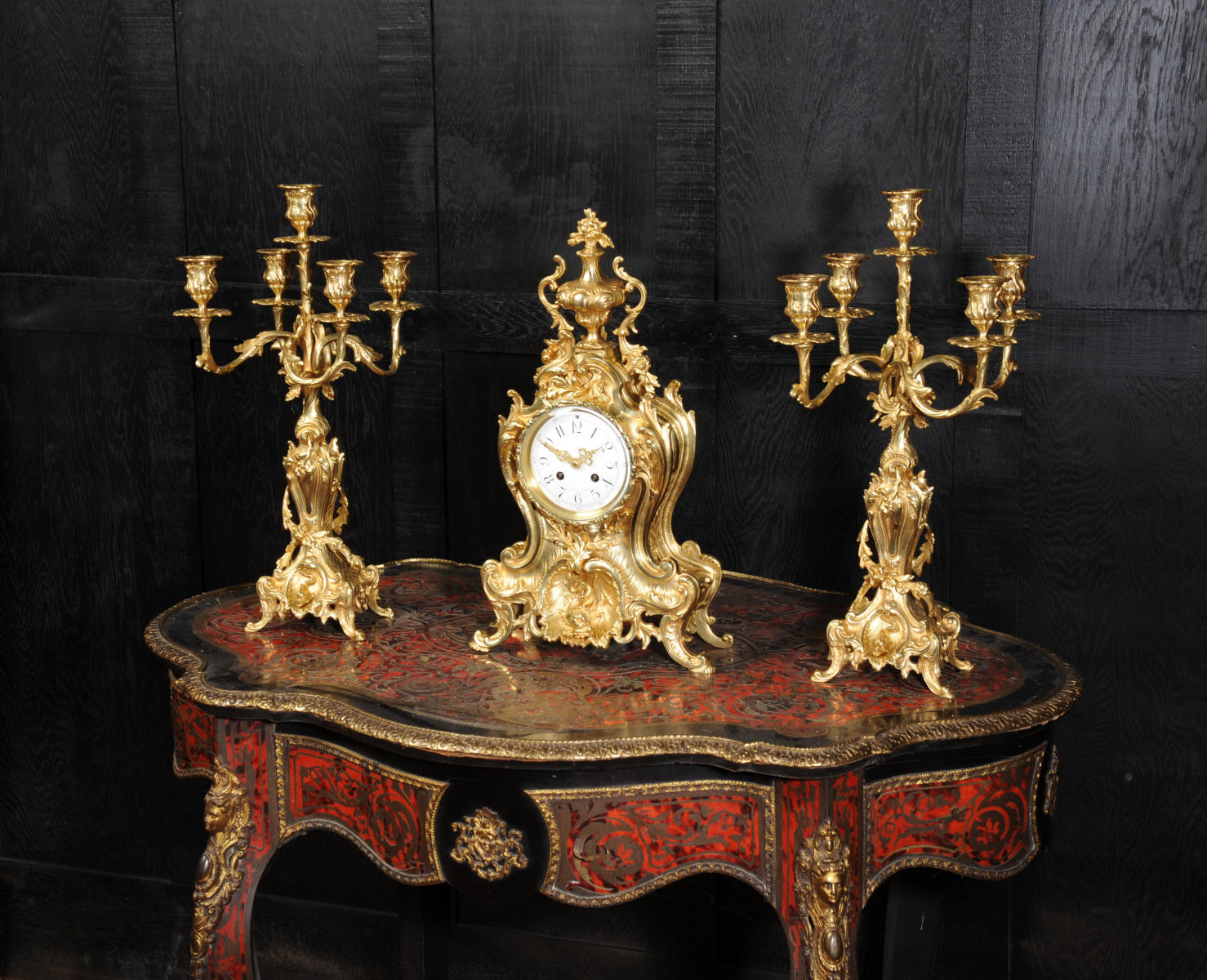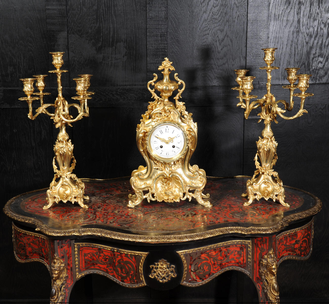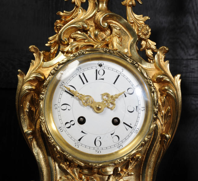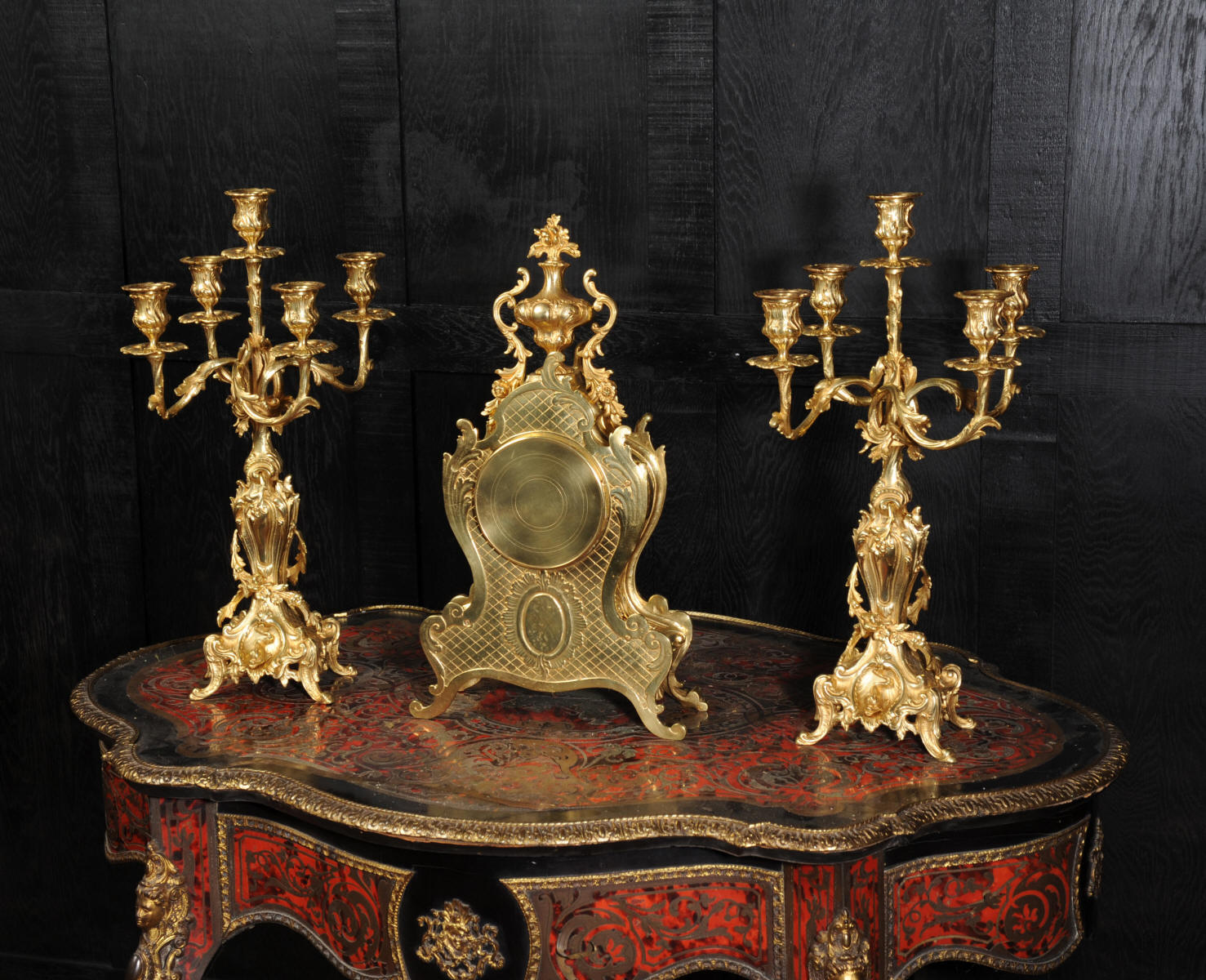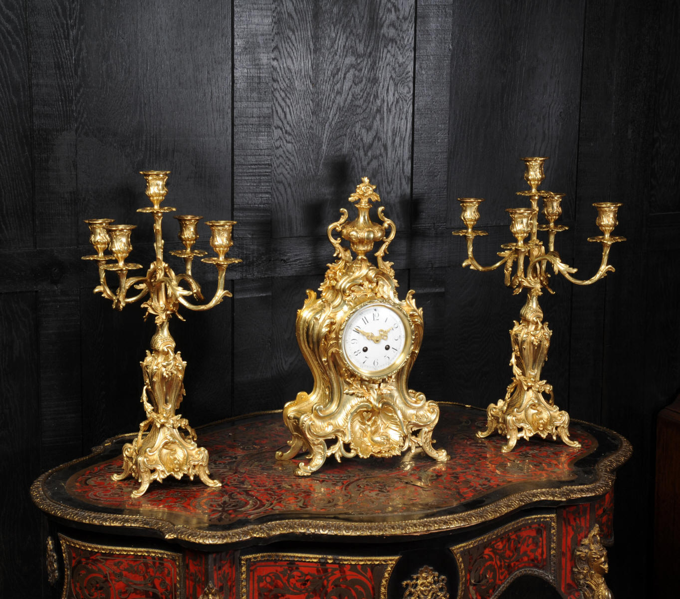 The beautiful, large enamel dial is lettered with separate minute and hour rings and is complete with the original finely cut gilt brass hands. The heavy Rococo bezel is fitted with convex glass. The French movement is of high quality and is in excellent clean and running condition having been fully overhauled and tested by our clockmaker. Pendulum is a replacement. It runs for 8 days and strikes the hours and halves on a bell. Click the video clip below to hear the bell and watch the clock running! Condition of the case is excellent, the original gilding is beautifully clean and bright with hardly any wear or discolouration and there are no losses. The urns leans forward slight as part of the design. Candelabra are slightly distorted. The dial is also in excellent condition just some faint hairlines. The set makes a stunning display as you can see below.