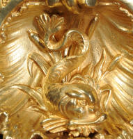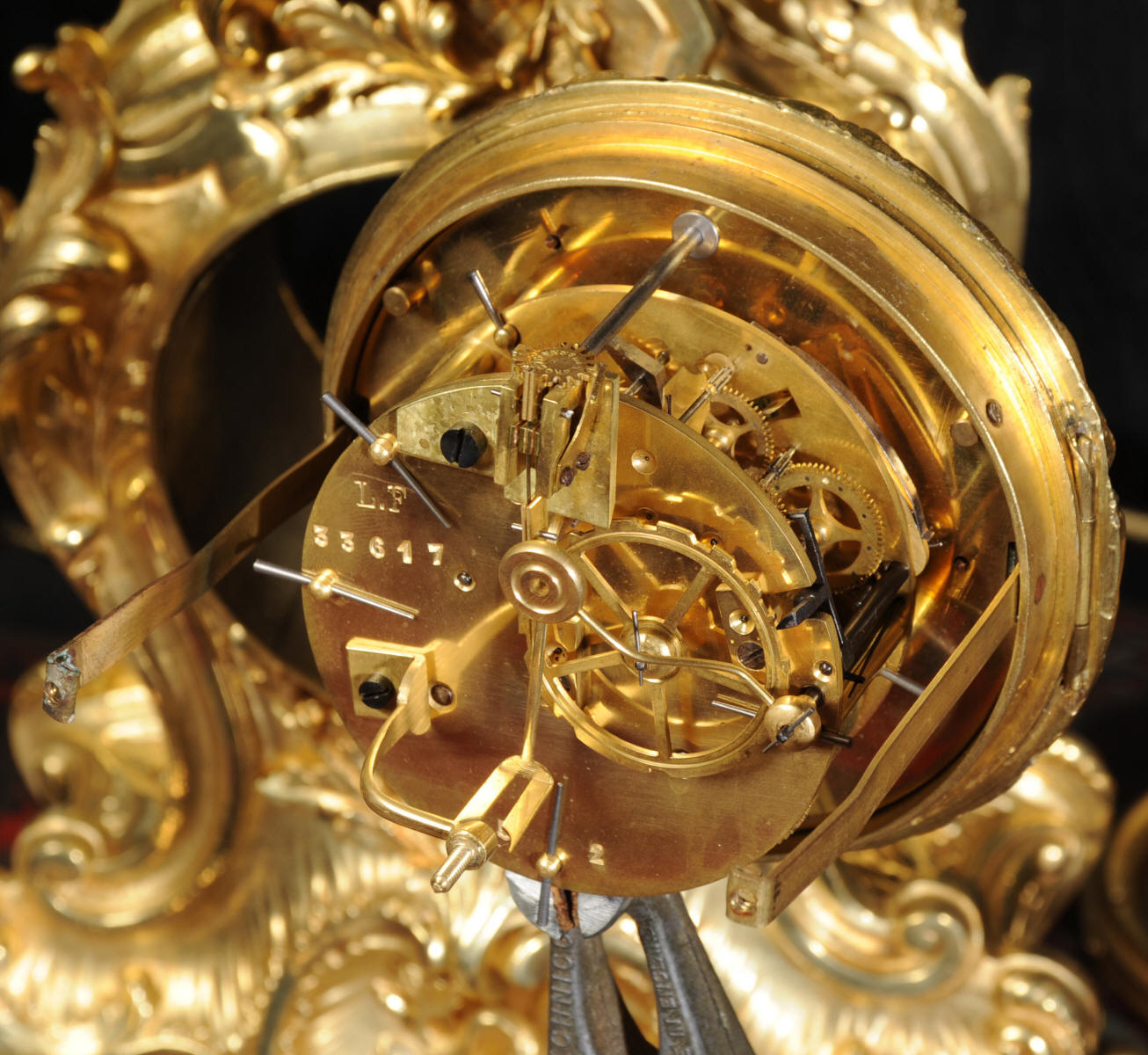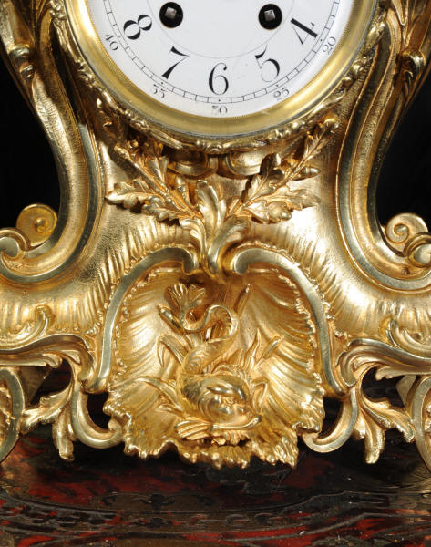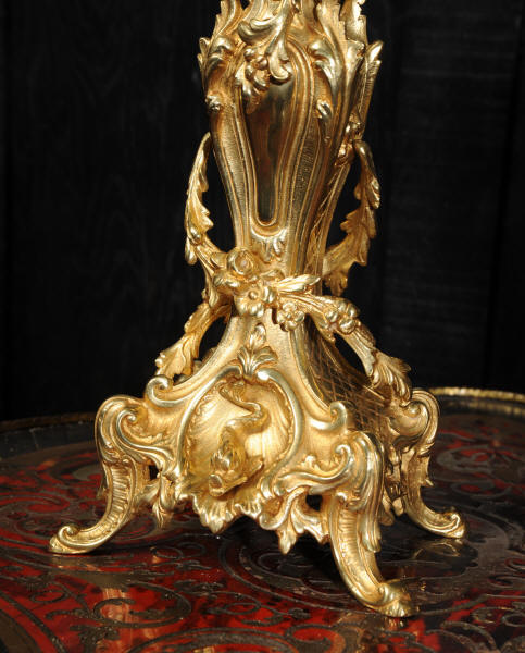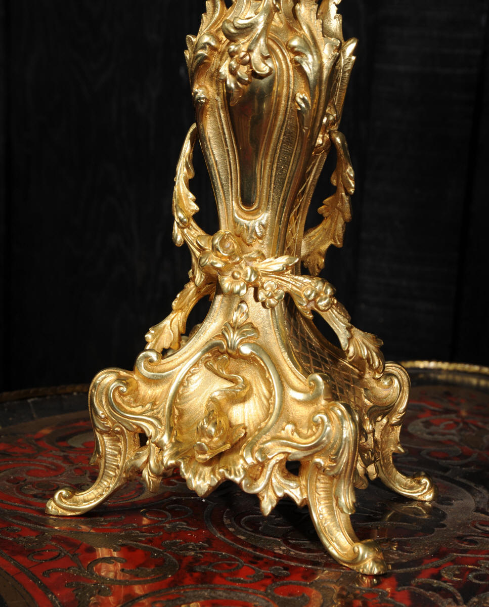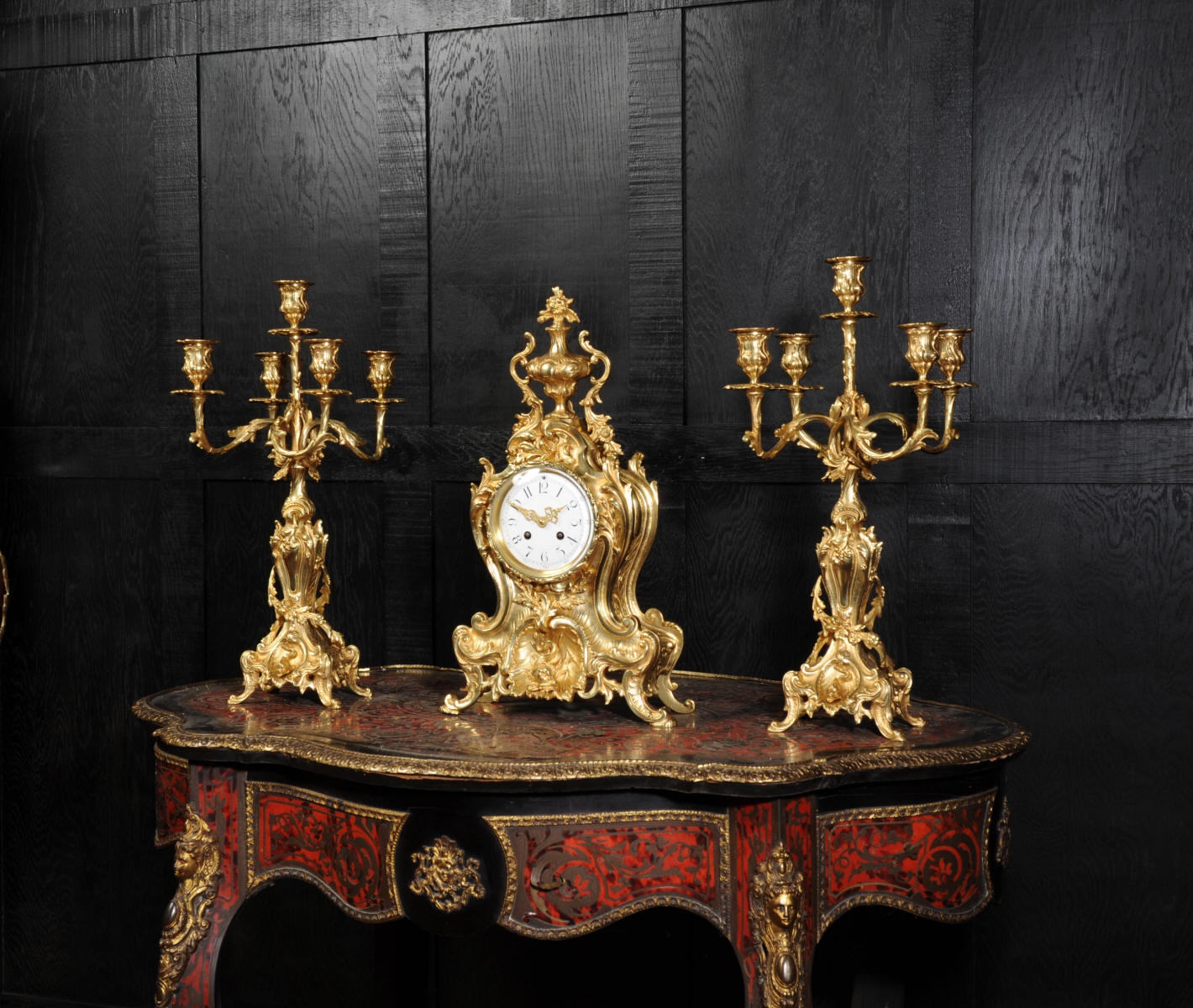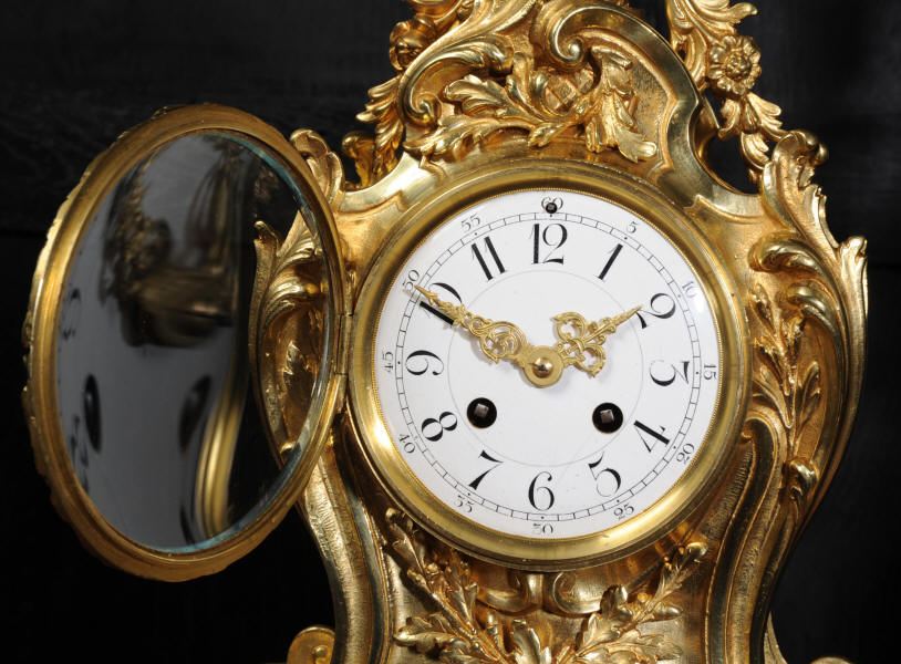 The beautiful, large enamel dial is lettered with separate minute and hour rings and is complete with the original finely cut gilt brass hands. The heavy Rococo bezel is fitted with convex glass. The French movement is of high quality and is in excellent clean and running condition having been fully overhauled and tested by our clockmaker. Pendulum is a replacement. It runs for 8 days and strikes the hours and halves on a bell. Click the video clip below to hear the bell and watch the clock running! Condition of the case is excellent, the original gilding is beautifully clean and bright with hardly any wear or discolouration and there are no losses. The urns leans forward slight as part of the design. Candelabra are slightly distorted. The dial is also in excellent condition just some faint hairlines. The set makes a stunning display as you can see below.