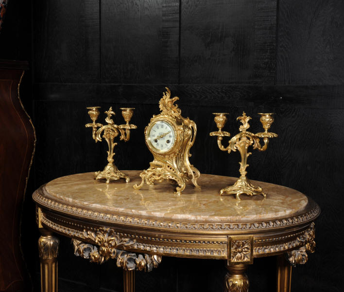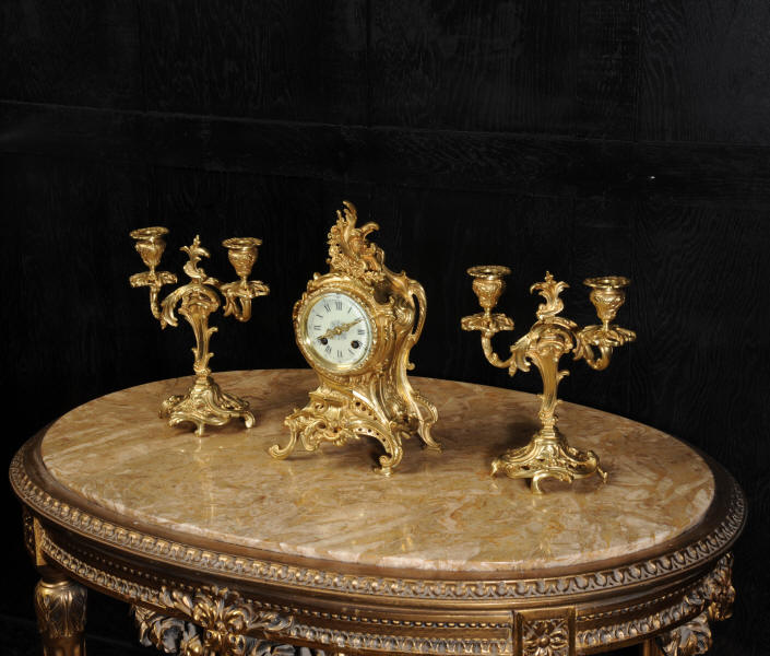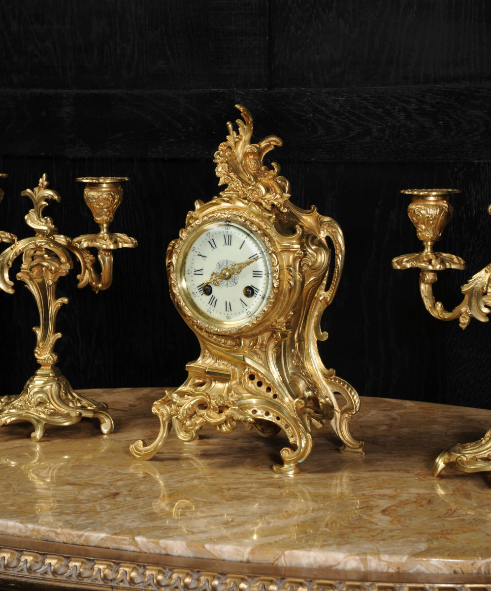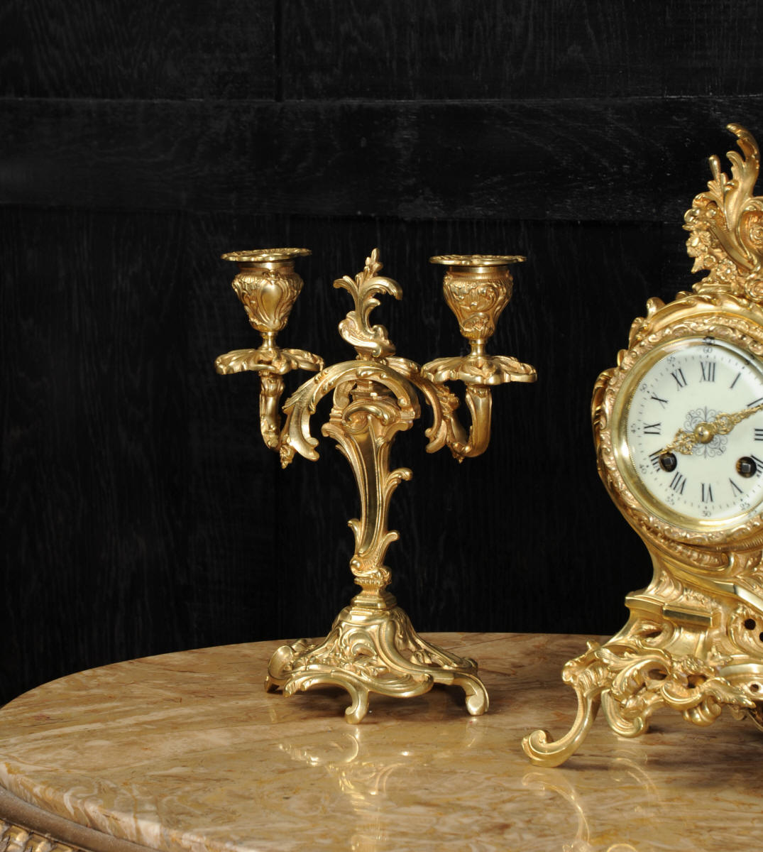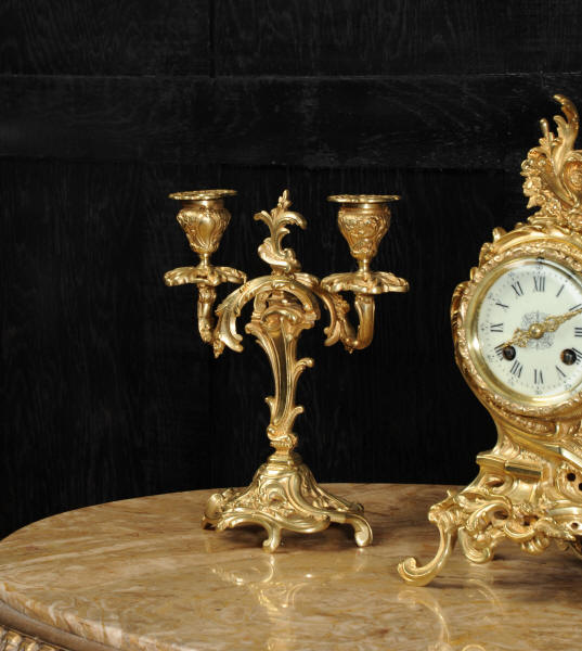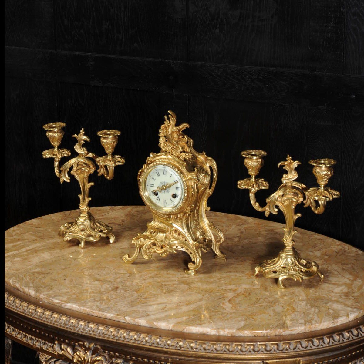 The beautiful dial is cream enamel on copper with black lettering and separate outside minute ring. The delicately fretted gilt brass hands are original. The French movement is of high quality and has the Louis Japy mark on the backplate and is in excellent clean and running condition having been fully overhauled by our clockmaker. Pendulum is a replacement. It runs for 8 days and strikes the hours and halves on a bell. Click the video clip below to hear the bell and watch the clock running! Condition of the case is excellent, the original gilding is beautifully clean and bright with hardly any wear or discolouration and there are no losses. The dial is also in excellent condition, just some light chips around the winding holes. The set makes a stunning display as you can see below.