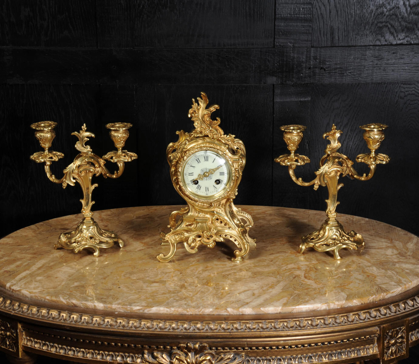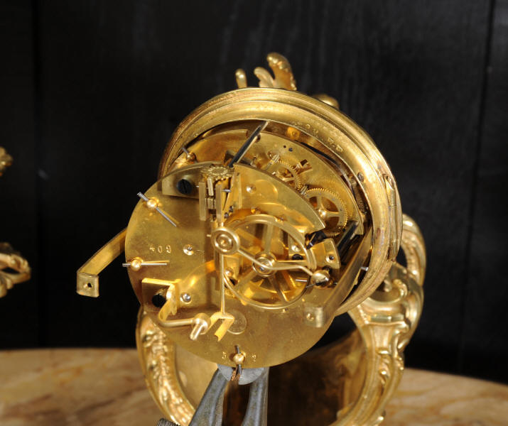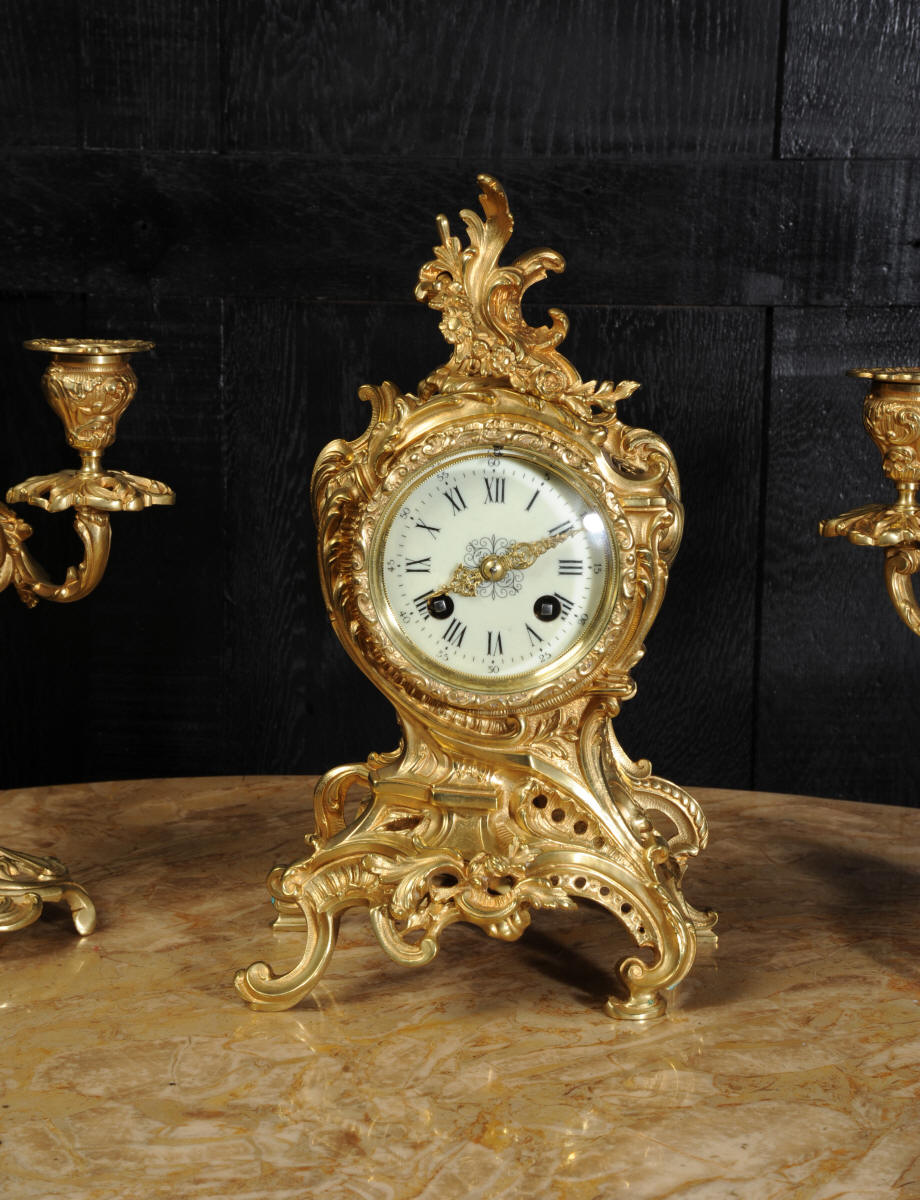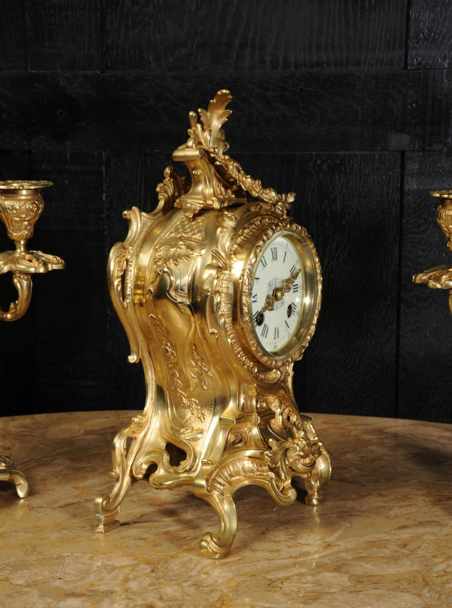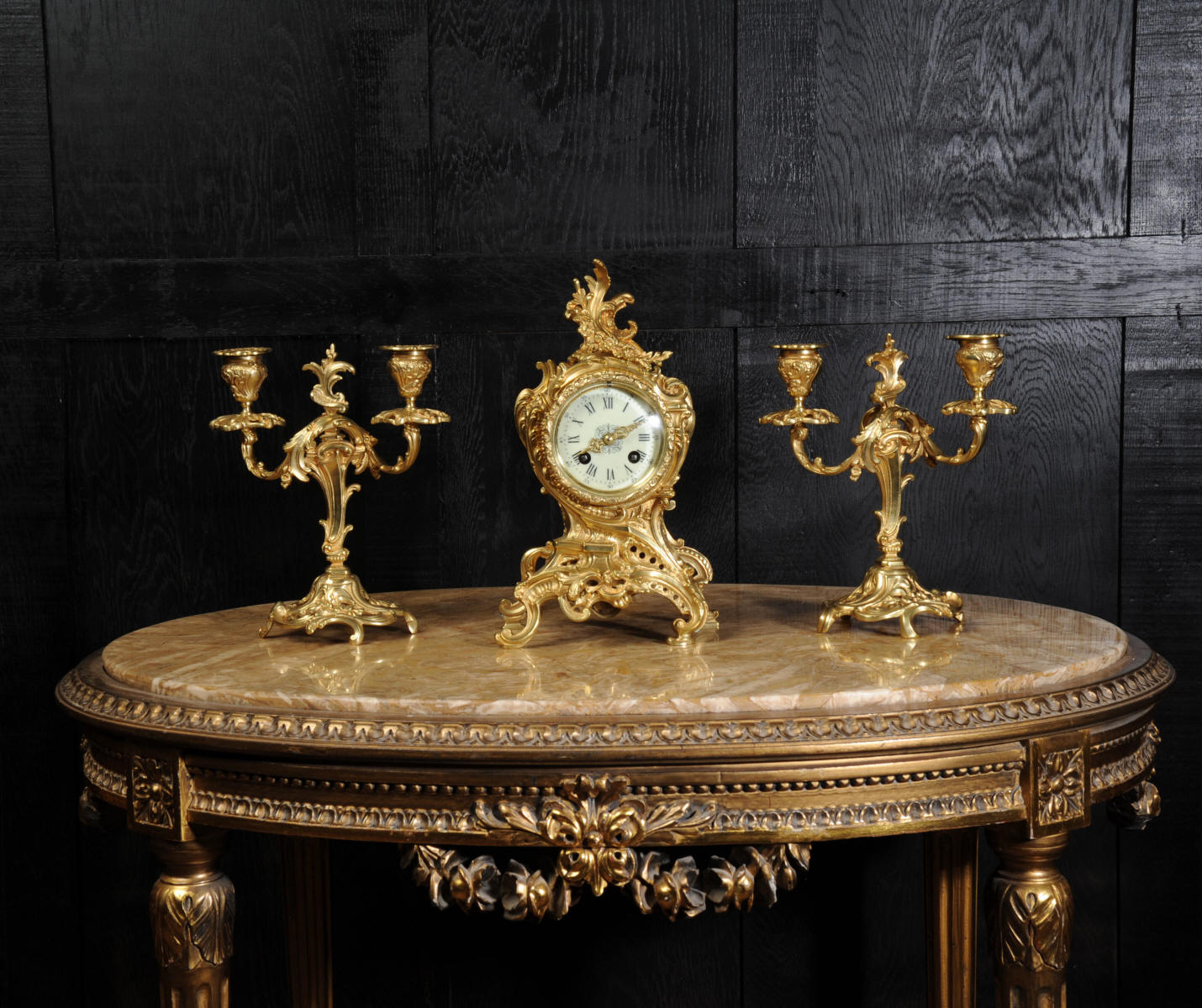 The beautiful dial is cream enamel on copper with black lettering and separate outside minute ring. The delicately fretted gilt brass hands are original. The French movement is of high quality and has the Louis Japy mark on the backplate and is in excellent clean and running condition having been fully overhauled by our clockmaker. Pendulum is a replacement. It runs for 8 days and strikes the hours and halves on a bell. Click the video clip below to hear the bell and watch the clock running! Condition of the case is excellent, the original gilding is beautifully clean and bright with hardly any wear or discolouration and there are no losses. The dial is also in excellent condition, just some light chips around the winding holes. The set makes a stunning display as you can see below.