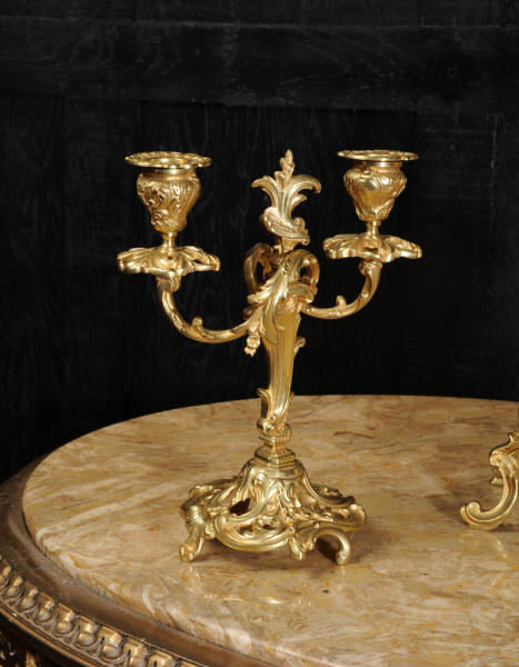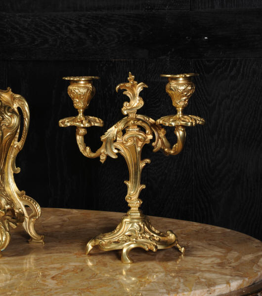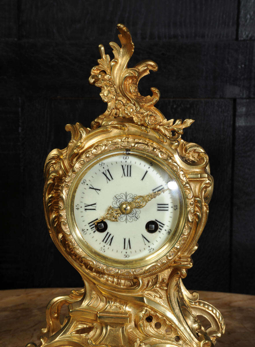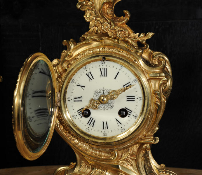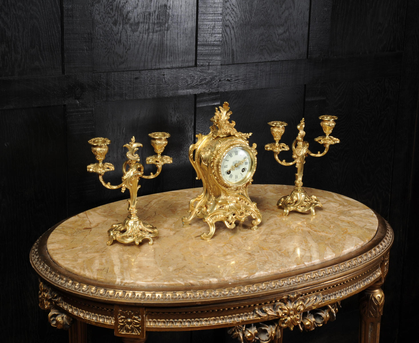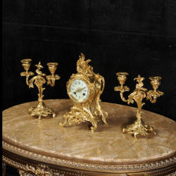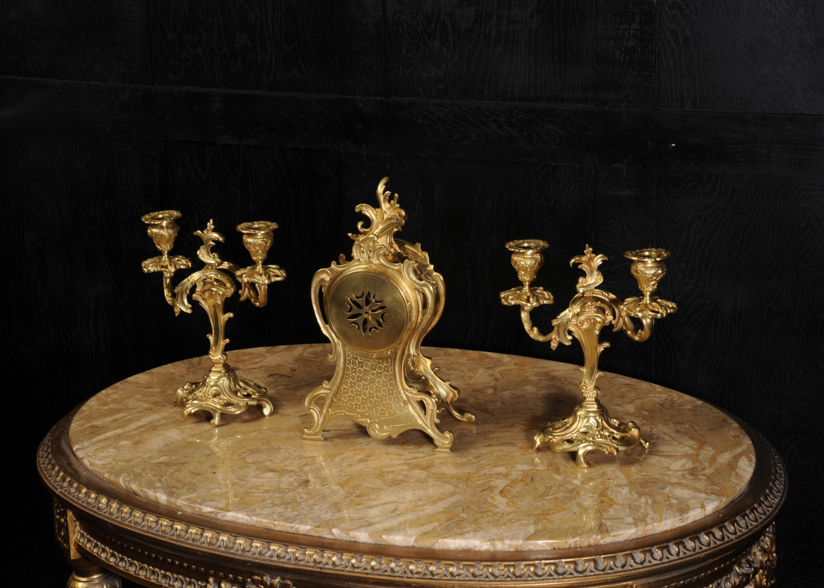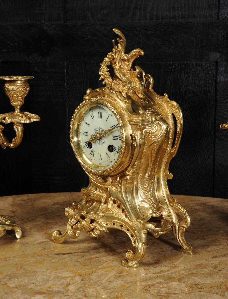 The beautiful dial is cream enamel on copper with black lettering and separate outside minute ring. The delicately fretted gilt brass hands are original. The French movement is of high quality and has the Louis Japy mark on the backplate and is in excellent clean and running condition having been fully overhauled by our clockmaker. Pendulum is a replacement. It runs for 8 days and strikes the hours and halves on a bell. Click the video clip below to hear the bell and watch the clock running! Condition of the case is excellent, the original gilding is beautifully clean and bright with hardly any wear or discolouration and there are no losses. The dial is also in excellent condition, just some light chips around the winding holes. The set makes a stunning display as you can see below.