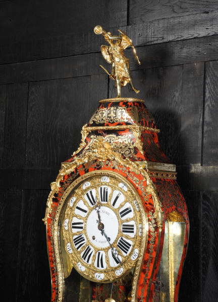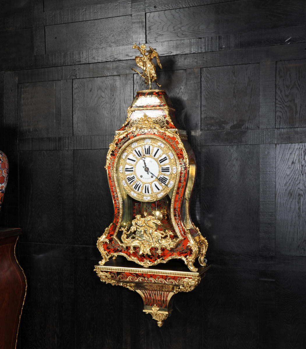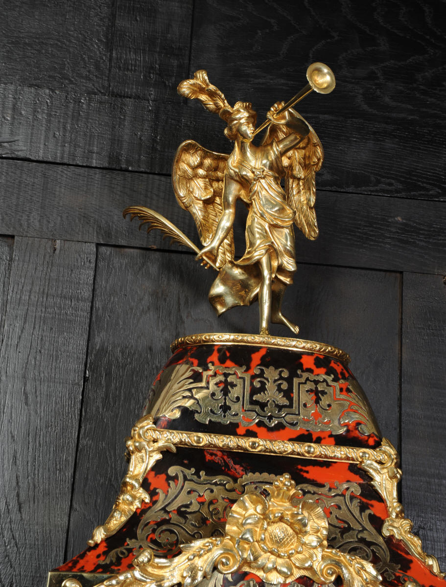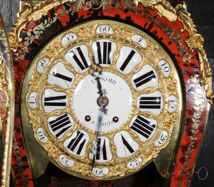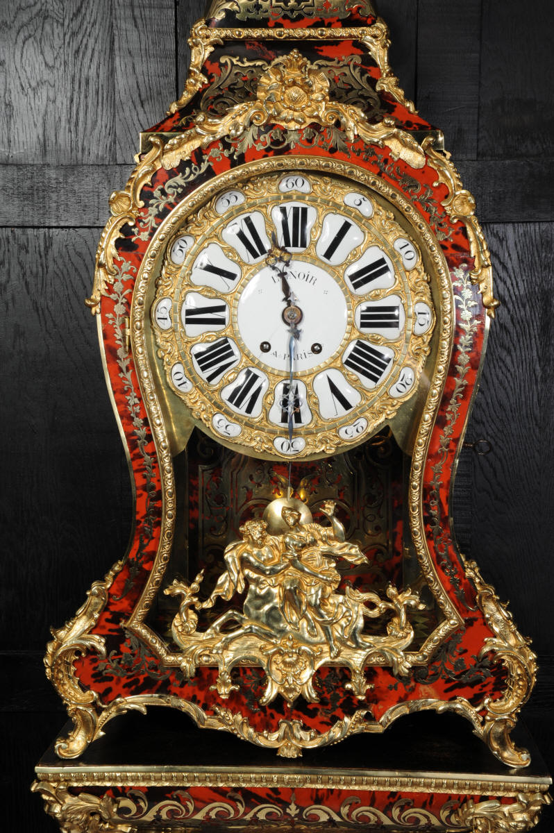 The very large dial is ormolu mounted with 24 individual enamel cartouches for the hours and minutes and one to the centre which is signed for the Paris retailer, Lenoir. It is fitted with the original beautifully hand cut and blued steel hands.. The French movement is by A. D. Mougin and is of the highest quality. It is the very large square plated version of the Pendule de Paris movement. It is in excellent clean and running condition having been fully overhauled by our clockmaker. The large pendulum is original and the clock is complete with original winding key and front door key. It runs for 8 days on one wind and strikes the hours and halves on a large bell. Click the video clip below to hear the bell and watch the clock running! Condition of the case is excellent, the shell veneer is excellent with only very minor losses. Brass inlay is also excellent, very slight losses and only some very very slight lifting in places. Ormolu is also excellent, clean, bright. Dial is also excellent with just some slight chipping to the '60', restoration to the 5 and 10 and some light hairlines to the centre cartouche. The front door lock is fully working with original key.
