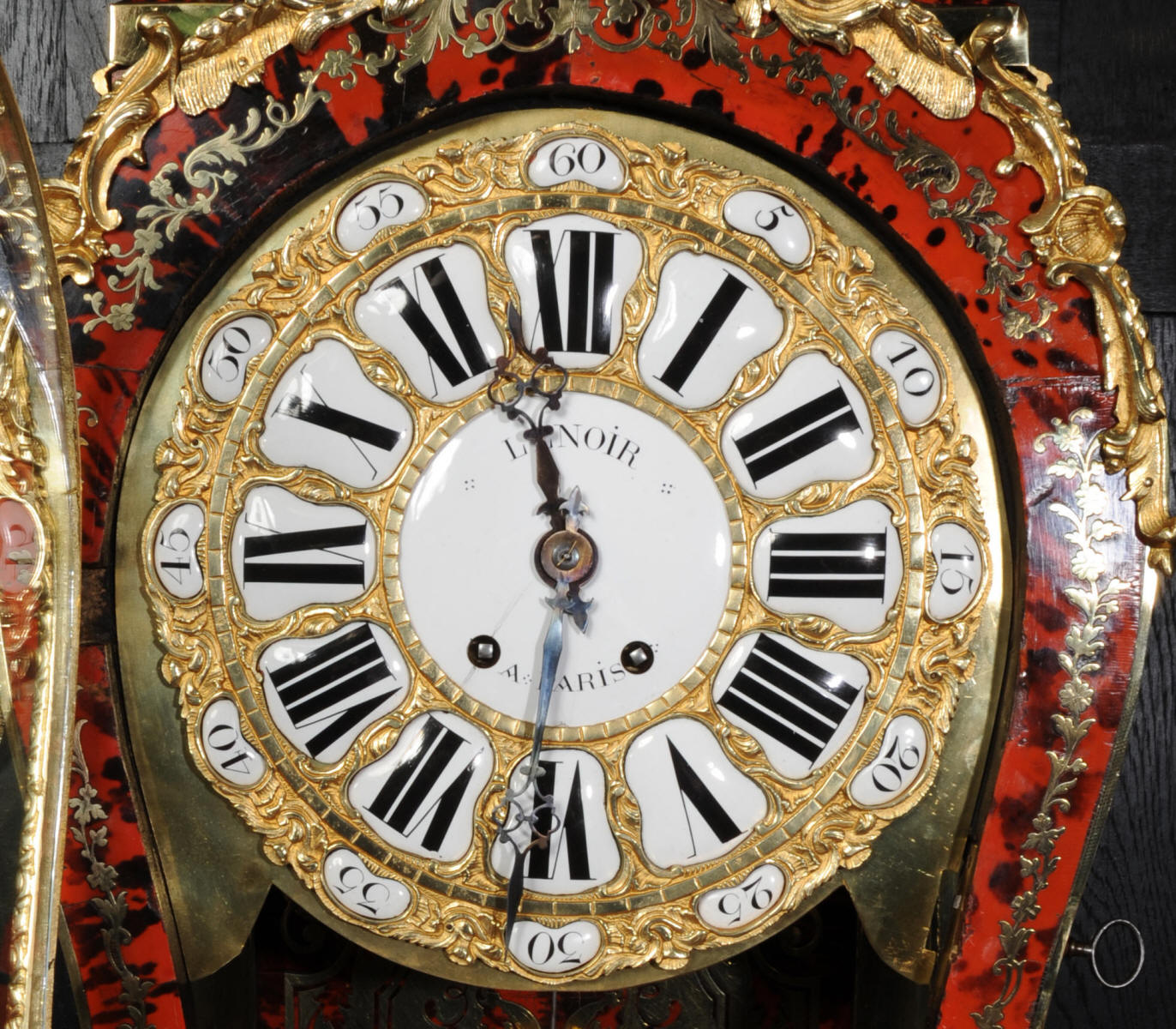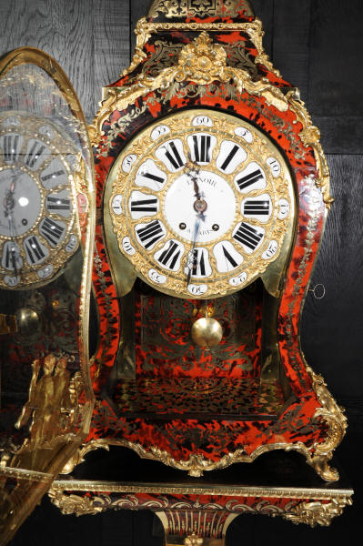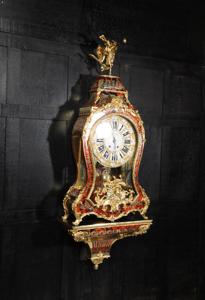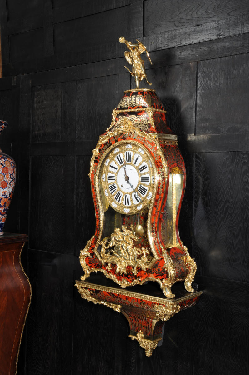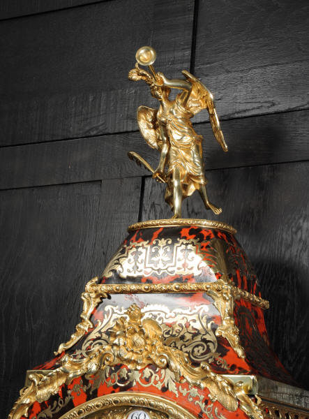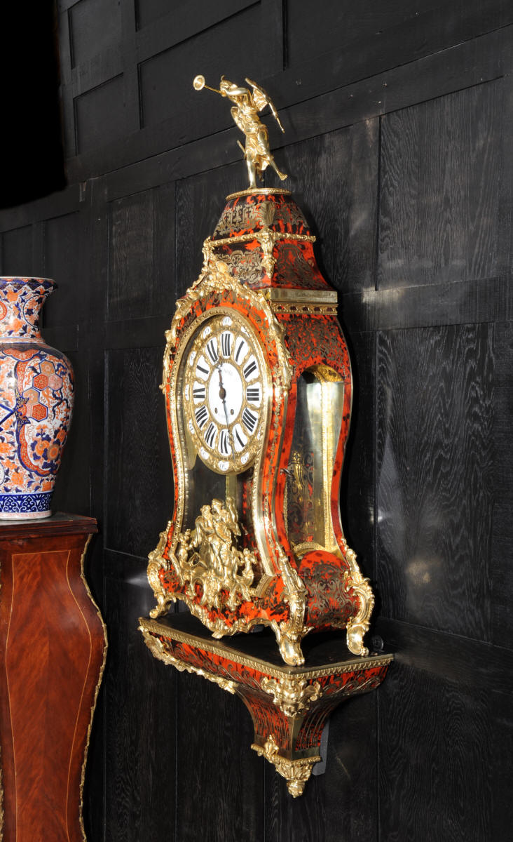 The very large dial is ormolu mounted with 24 individual enamel cartouches for the hours and minutes and one to the centre which is signed for the Paris retailer, Lenoir. It is fitted with the original beautifully hand cut and blued steel hands.. The French movement is by A. D. Mougin and is of the highest quality. It is the very large square plated version of the Pendule de Paris movement. It is in excellent clean and running condition having been fully overhauled by our clockmaker. The large pendulum is original and the clock is complete with original winding key and front door key. It runs for 8 days on one wind and strikes the hours and halves on a large bell. Click the video clip below to hear the bell and watch the clock running! Condition of the case is excellent, the shell veneer is excellent with only very minor losses. Brass inlay is also excellent, very slight losses and only some very very slight lifting in places. Ormolu is also excellent, clean, bright. Dial is also excellent with just some slight chipping to the '60', restoration to the 5 and 10 and some light hairlines to the centre cartouche. The front door lock is fully working with original key.