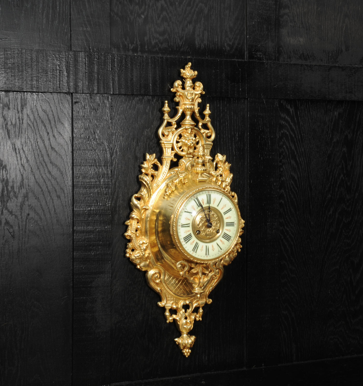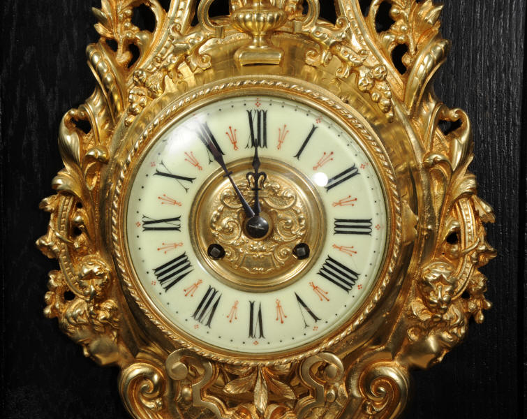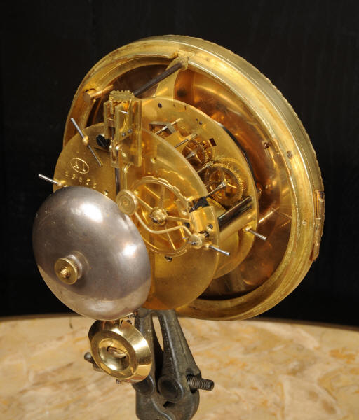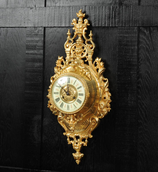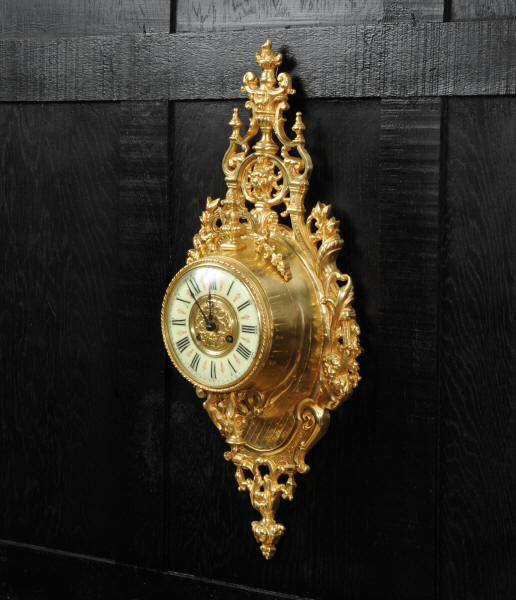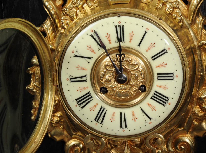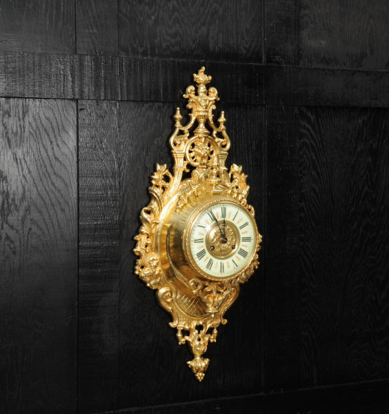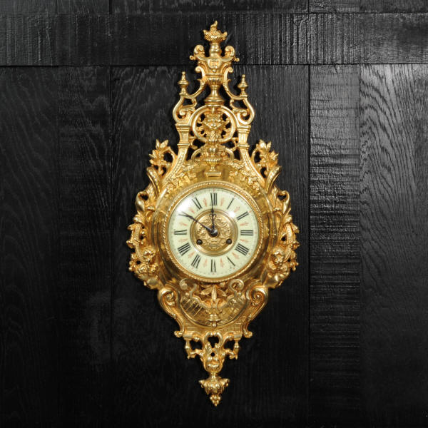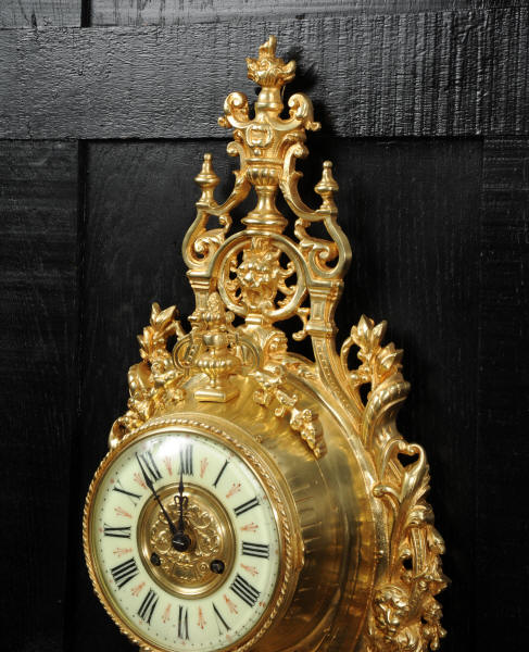 The super, large dial is enamel on copper with a heavy bronze centre, red half-hour makers and original blued steel hands. It is covered by convex bevelled glass. The French movement is by Japy Frères and has the clockmakers mark on the movement backplate. It is of high quality and is in excellent clean and running condition having been fully overhauled by our clockmaker. Pendulum is an old replacement. It runs for 8 days and strikes the hours and halves on a bell. Click the video clip below to hear the bell and watch the clock running. Condition of the case is excellent, the original gilding is beautifully clean and bright with hardly any wear or discolouration. The dial is also in excellent condition with no damage.