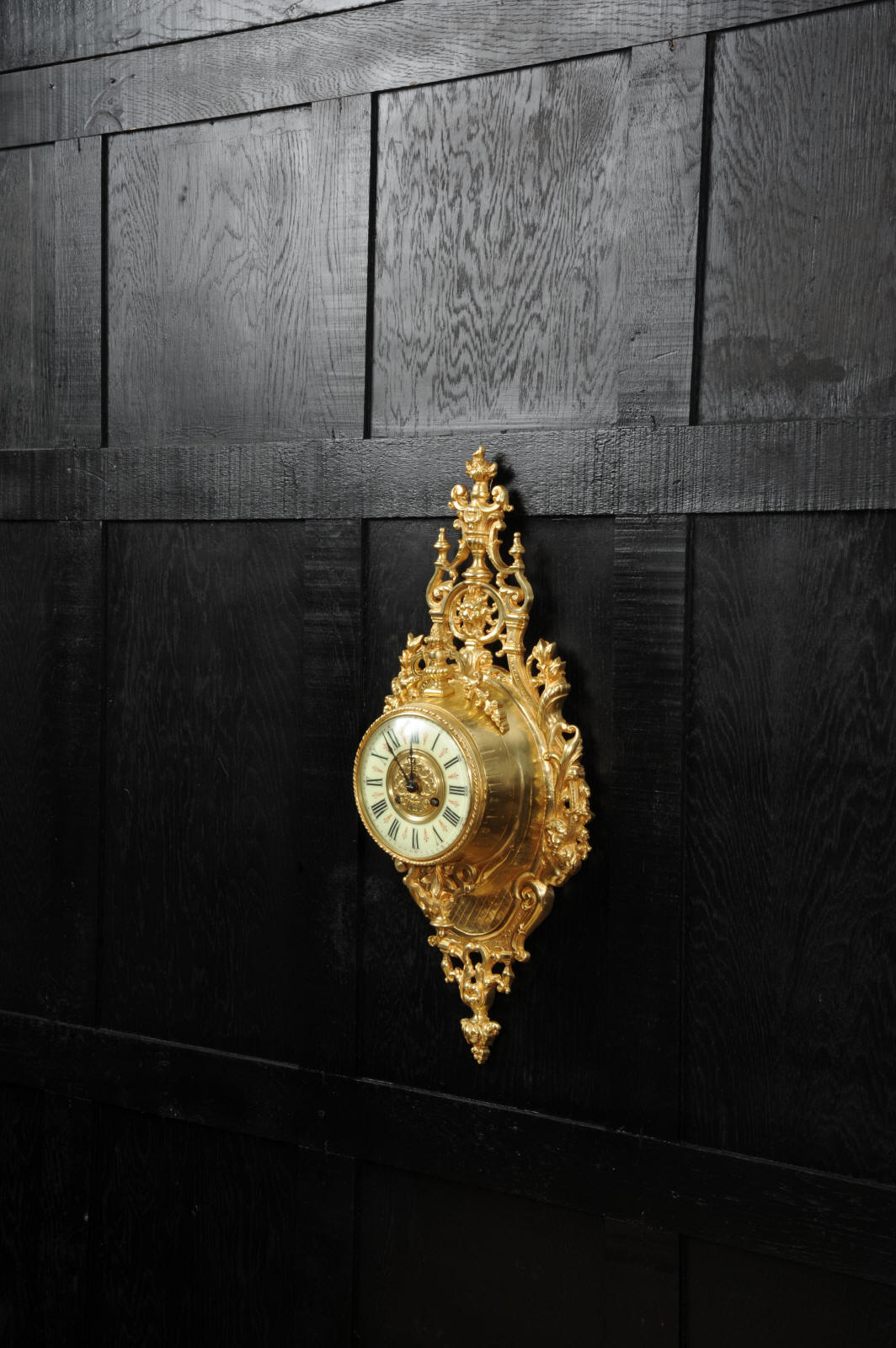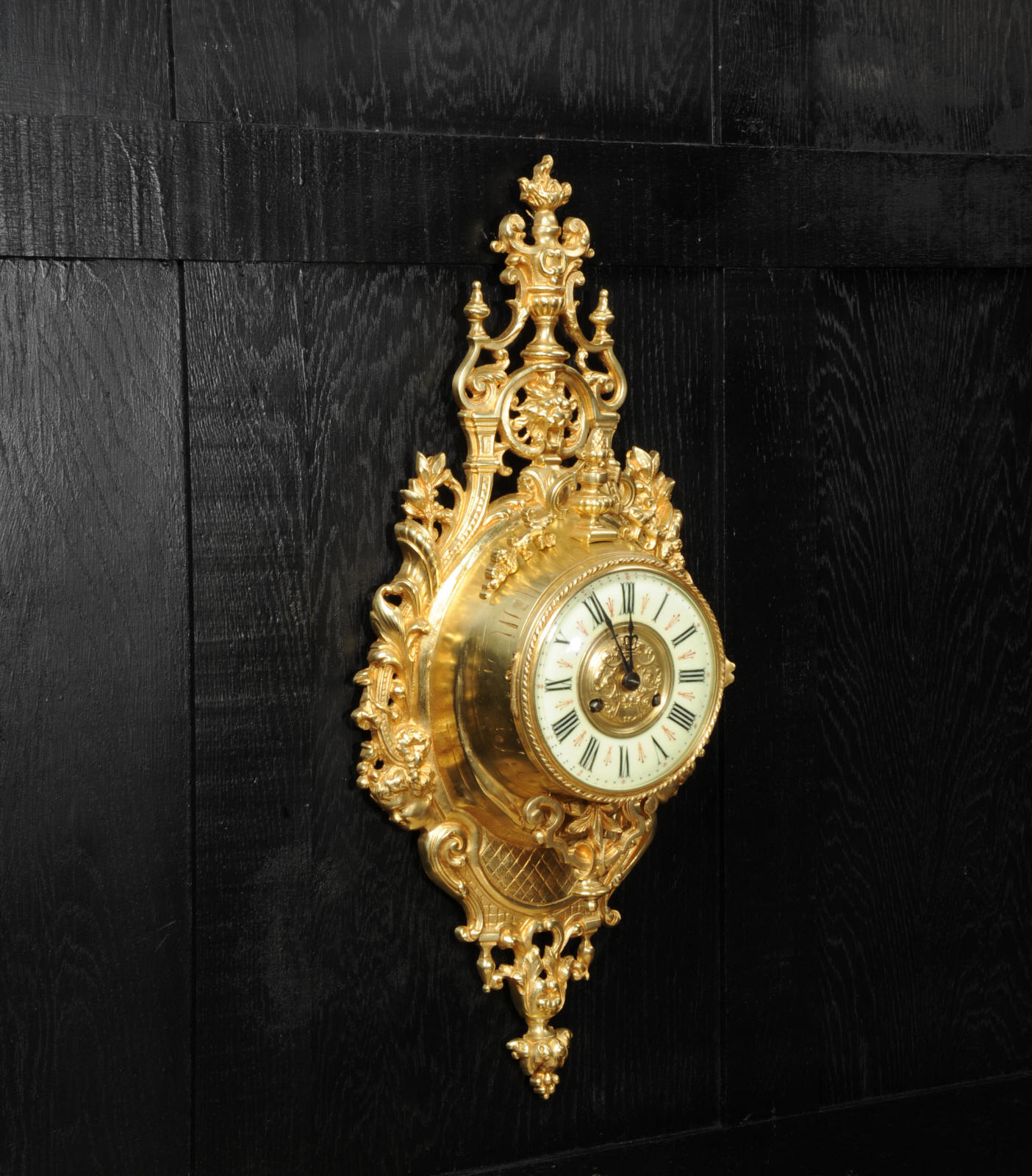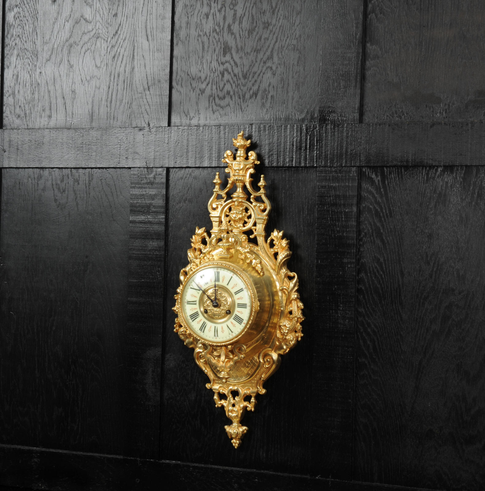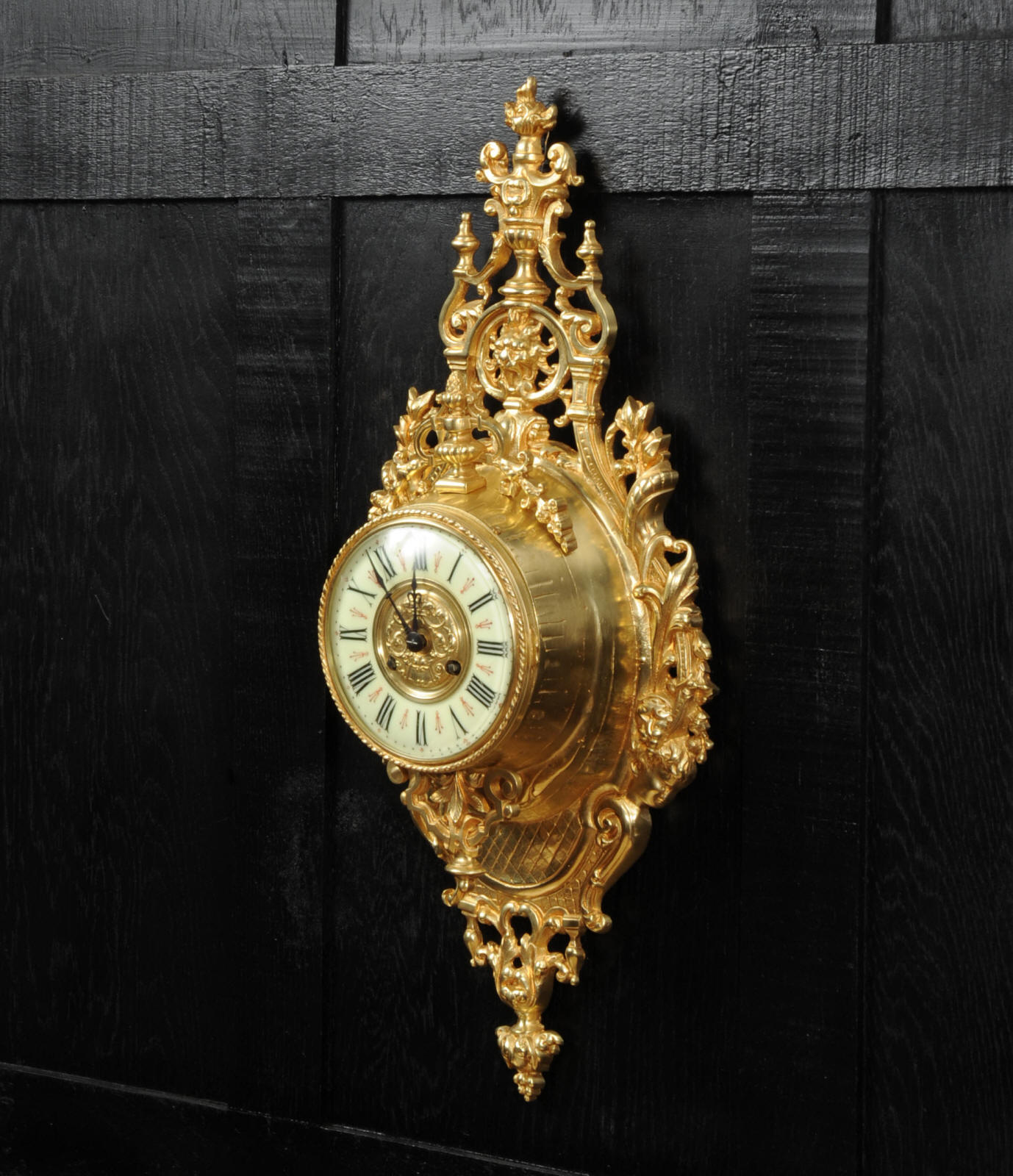 The super, large dial is enamel on copper with a heavy bronze centre, red half-hour makers and original blued steel hands. It is covered by convex bevelled glass. The French movement is by Japy Frères and has the clockmakers mark on the movement backplate. It is of high quality and is in excellent clean and running condition having been fully overhauled by our clockmaker. Pendulum is an old replacement. It runs for 8 days and strikes the hours and halves on a bell. Click the video clip below to hear the bell and watch the clock running. Condition of the case is excellent, the original gilding is beautifully clean and bright with hardly any wear or discolouration. The dial is also in excellent condition with no damage.