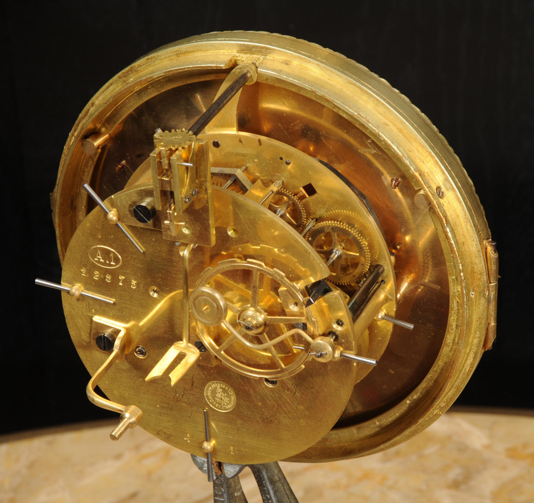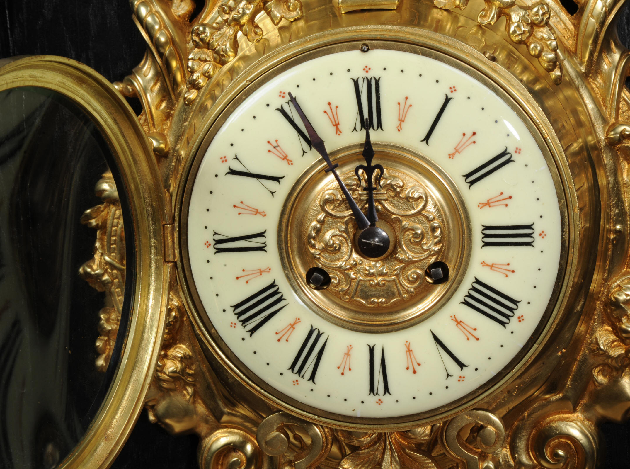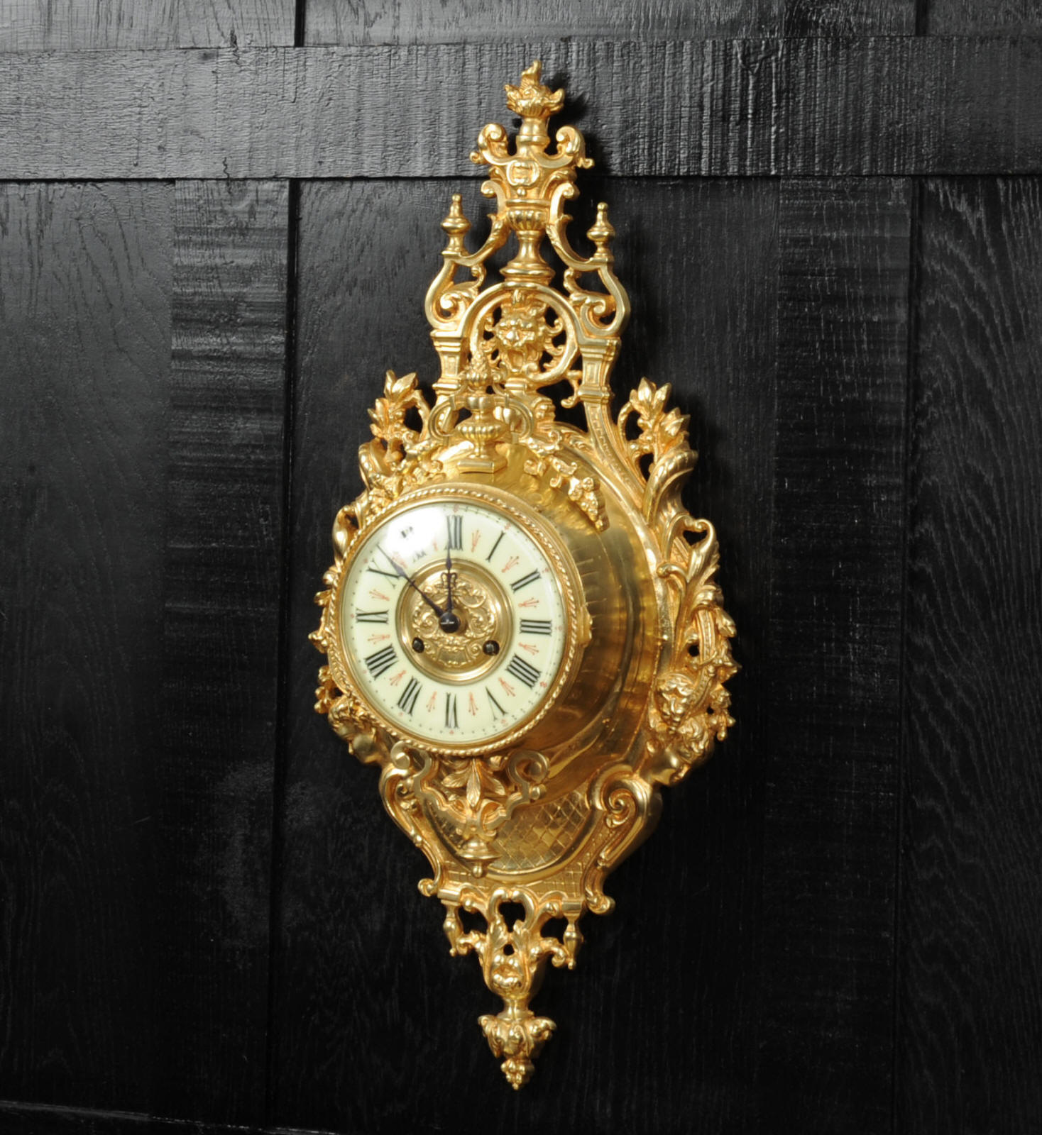 The super, large dial is enamel on copper with a heavy bronze centre, red half-hour makers and original blued steel hands. It is covered by convex bevelled glass. The French movement is by Japy Frères and has the clockmakers mark on the movement backplate. It is of high quality and is in excellent clean and running condition having been fully overhauled by our clockmaker. Pendulum is an old replacement. It runs for 8 days and strikes the hours and halves on a bell. Click the video clip below to hear the bell and watch the clock running. Condition of the case is excellent, the original gilding is beautifully clean and bright with hardly any wear or discolouration. The dial is also in excellent condition with no damage.