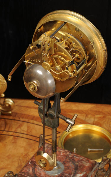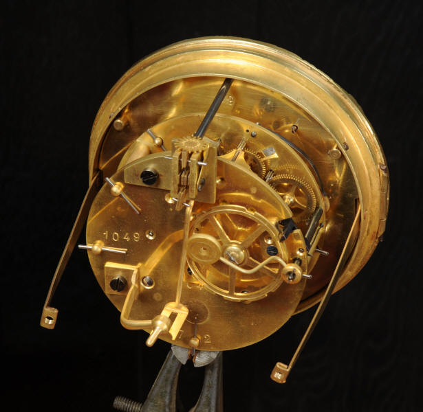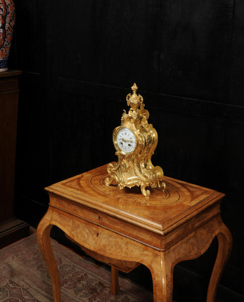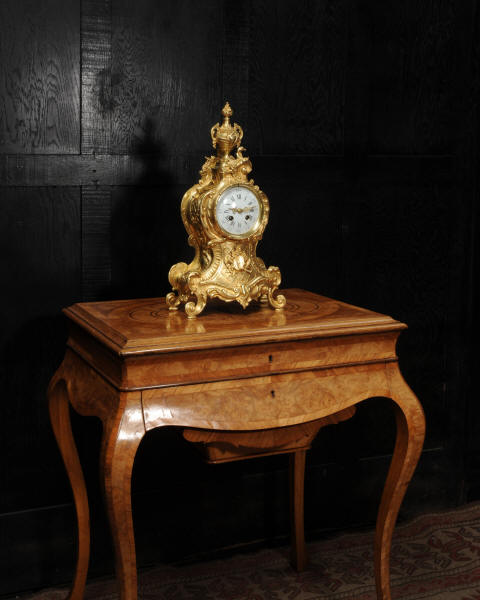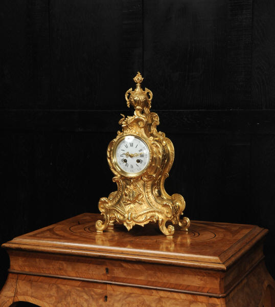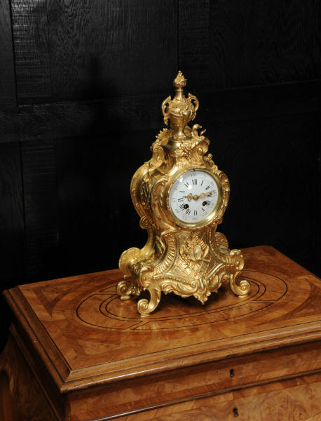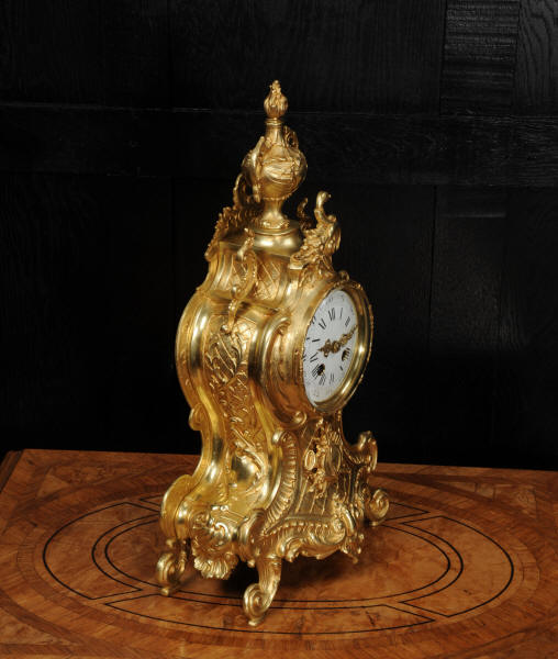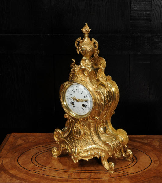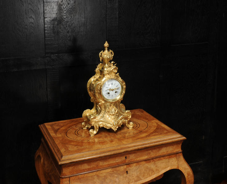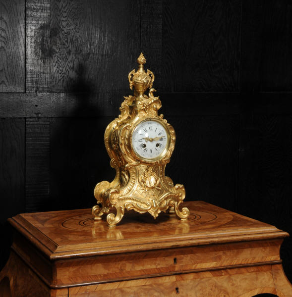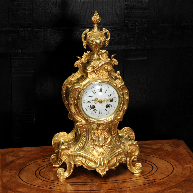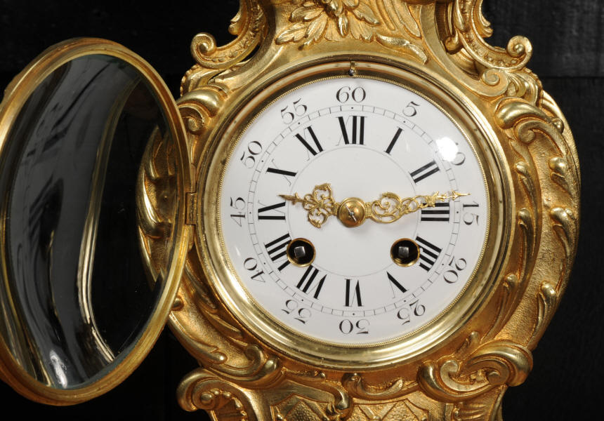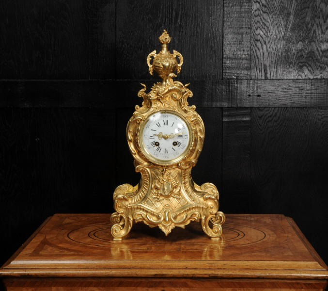 The dial is white porcelain enamel on copper with a separate minute ring and original finely fretted gilt brass hands. The French movement is by A. D. Mougin and is of the maker's usual high quality. It is in excellent clean and running condition having been fully overhauled by our clockmaker. Pendulum is original. It runs for 8 days and strikes the hours and halves on a bell. Click the video clip below to hear the bell and watch the clock running. Condition of the case is excellent, the original gilding is beautifully clean and bright with hardly any wear or discolouration and there are no losses. The dial is also in excellent condition just some chips the winding holes.