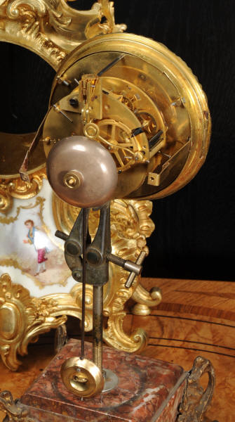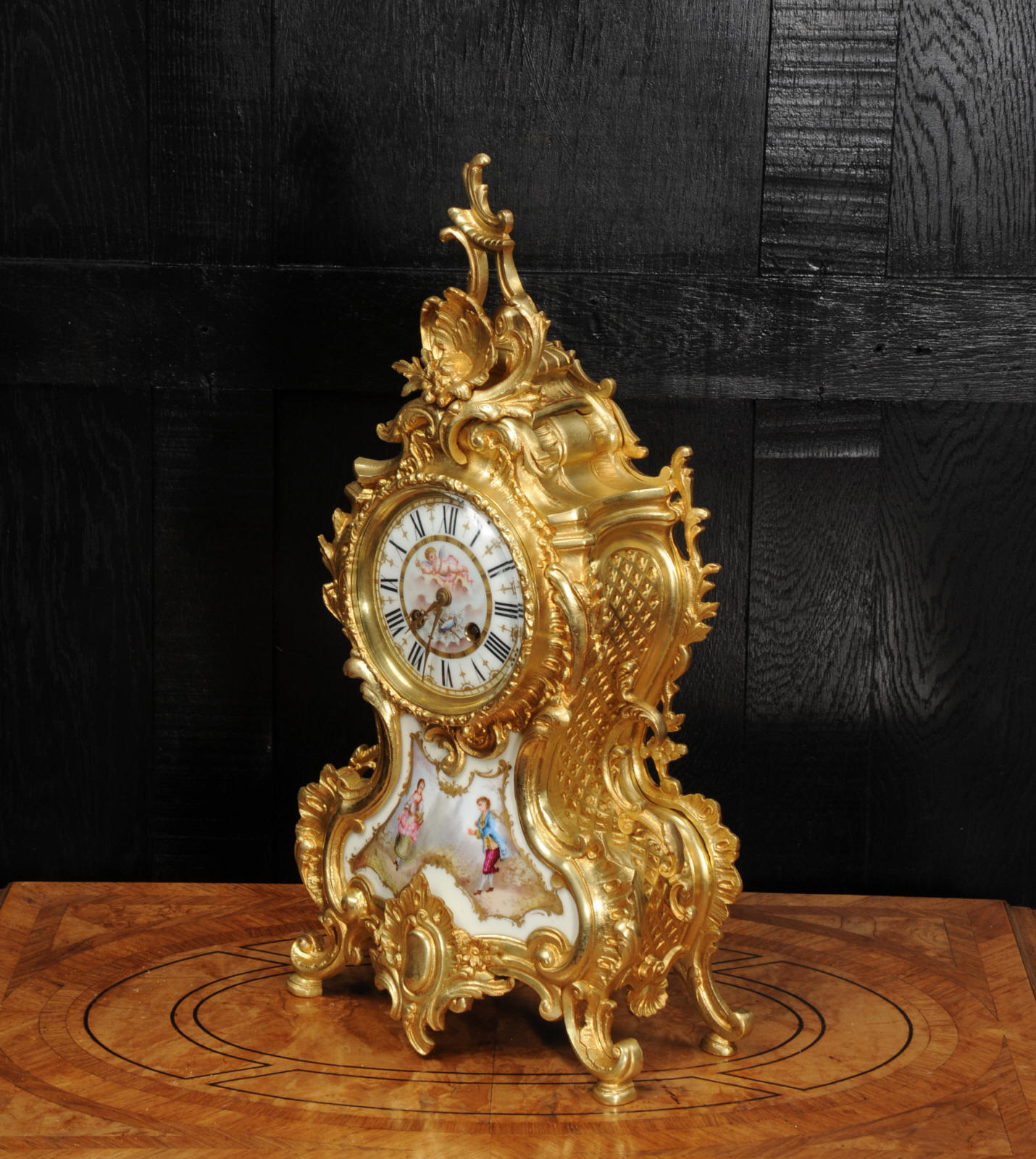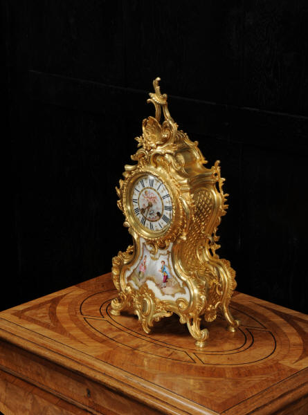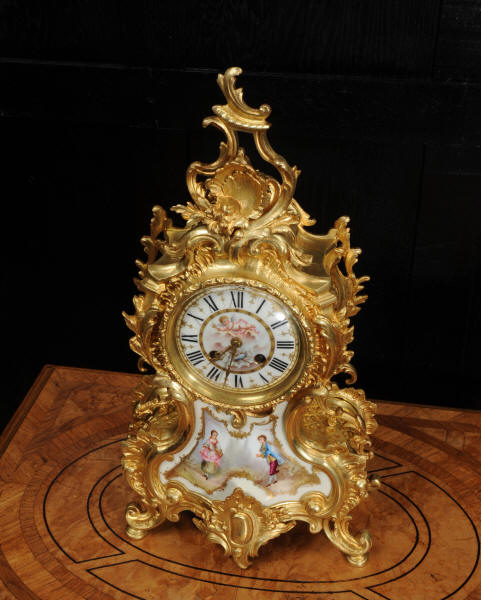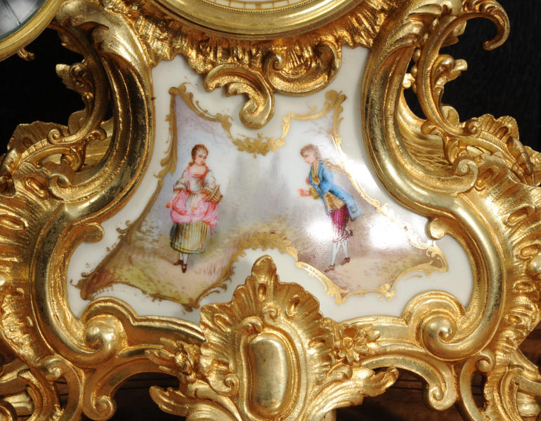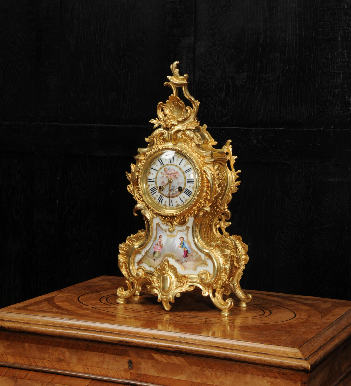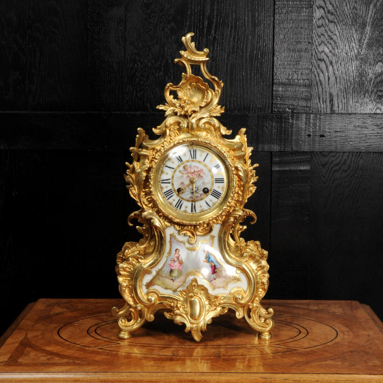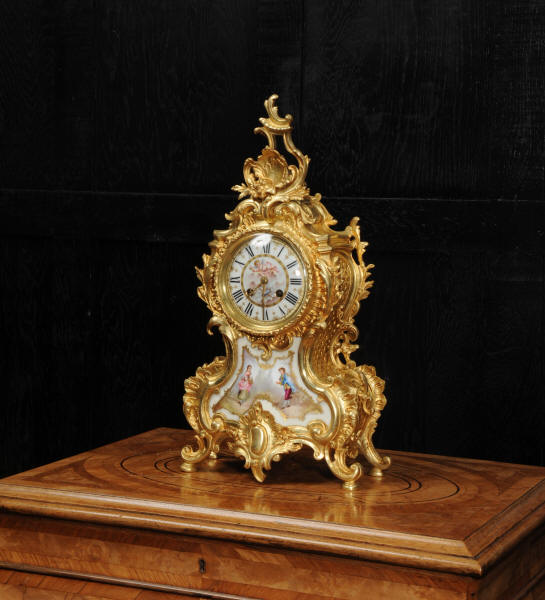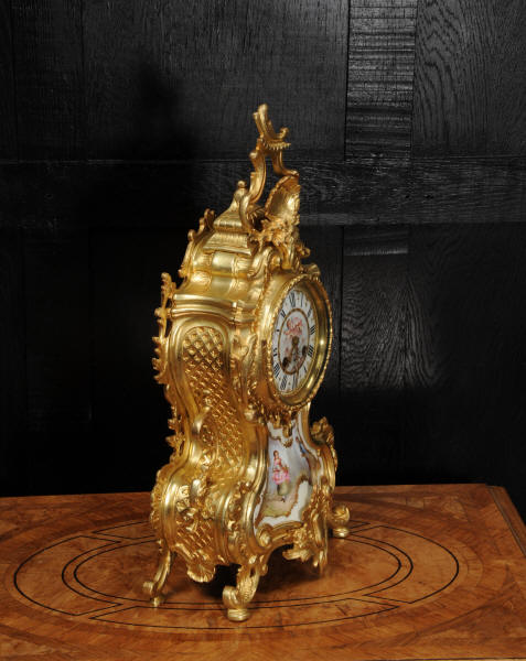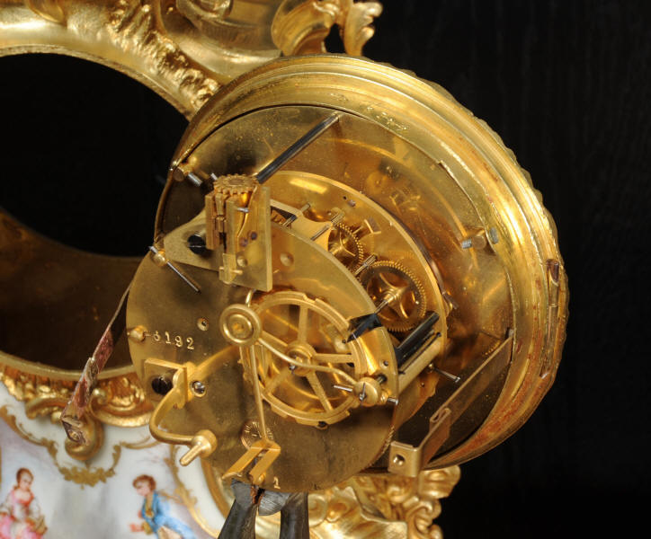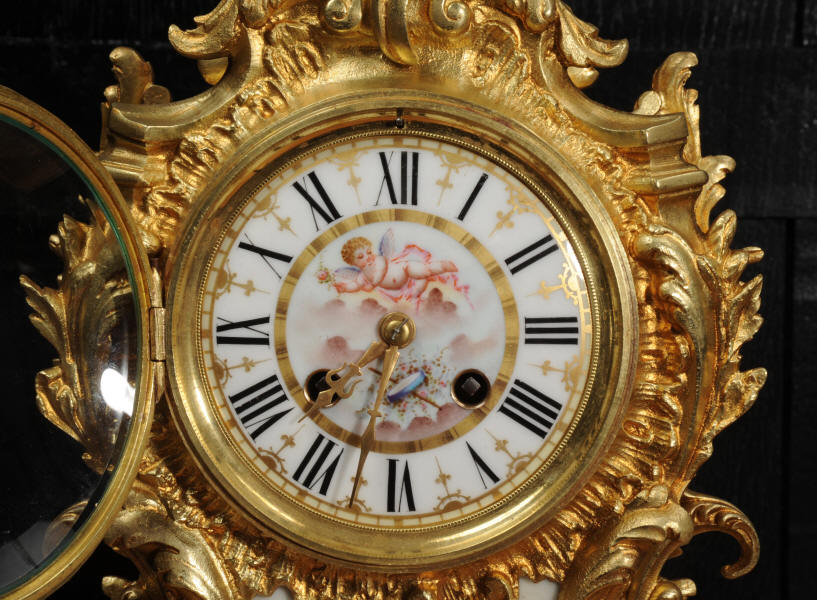 The case is of a waisted design with profuse, twirling acanthus decoration and scrolls. The dial is also porcelain with a charming cherub amongst the clouds. It is complete with it's original finely fretted gilt brass hands. The French movement is by A. D. Mougin and is of the maker's usual high quality. It is in excellent clean and running condition having been fully overhauled by our clockmaker. Pendulum is original. It runs for 8 days and strikes the hours and halves on a bell. Click the video clip below to hear the bell and watch the clock running. Condition of the case is excellent, the original gilding is beautifully clean, bright and crisp. The porcelain is also in excellent condition, some slight wear to the over glaze gilt decoration, very occasional marks and discolouration.