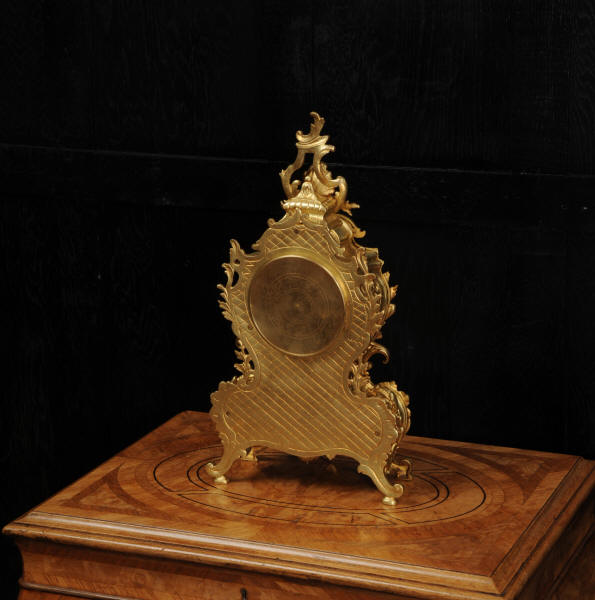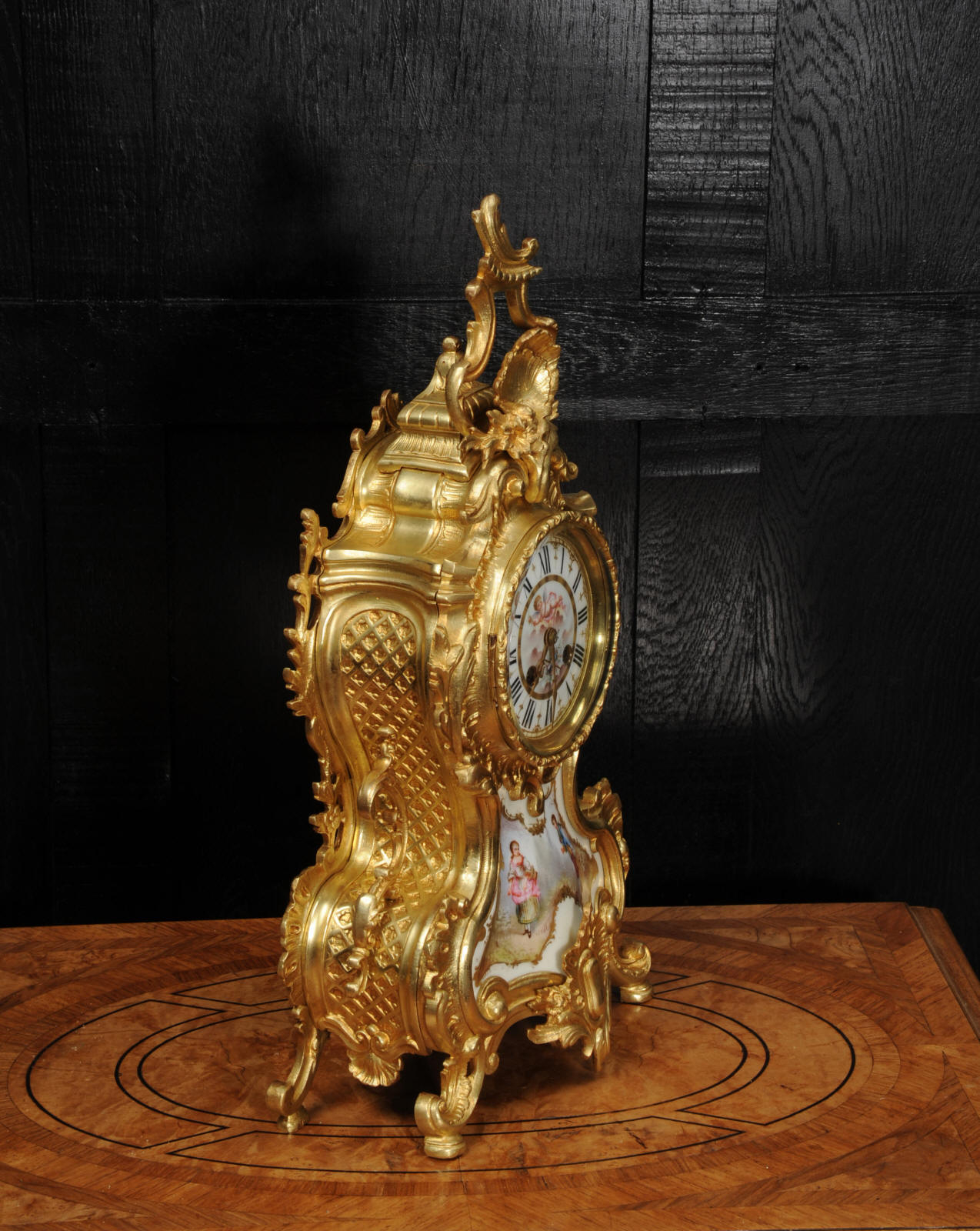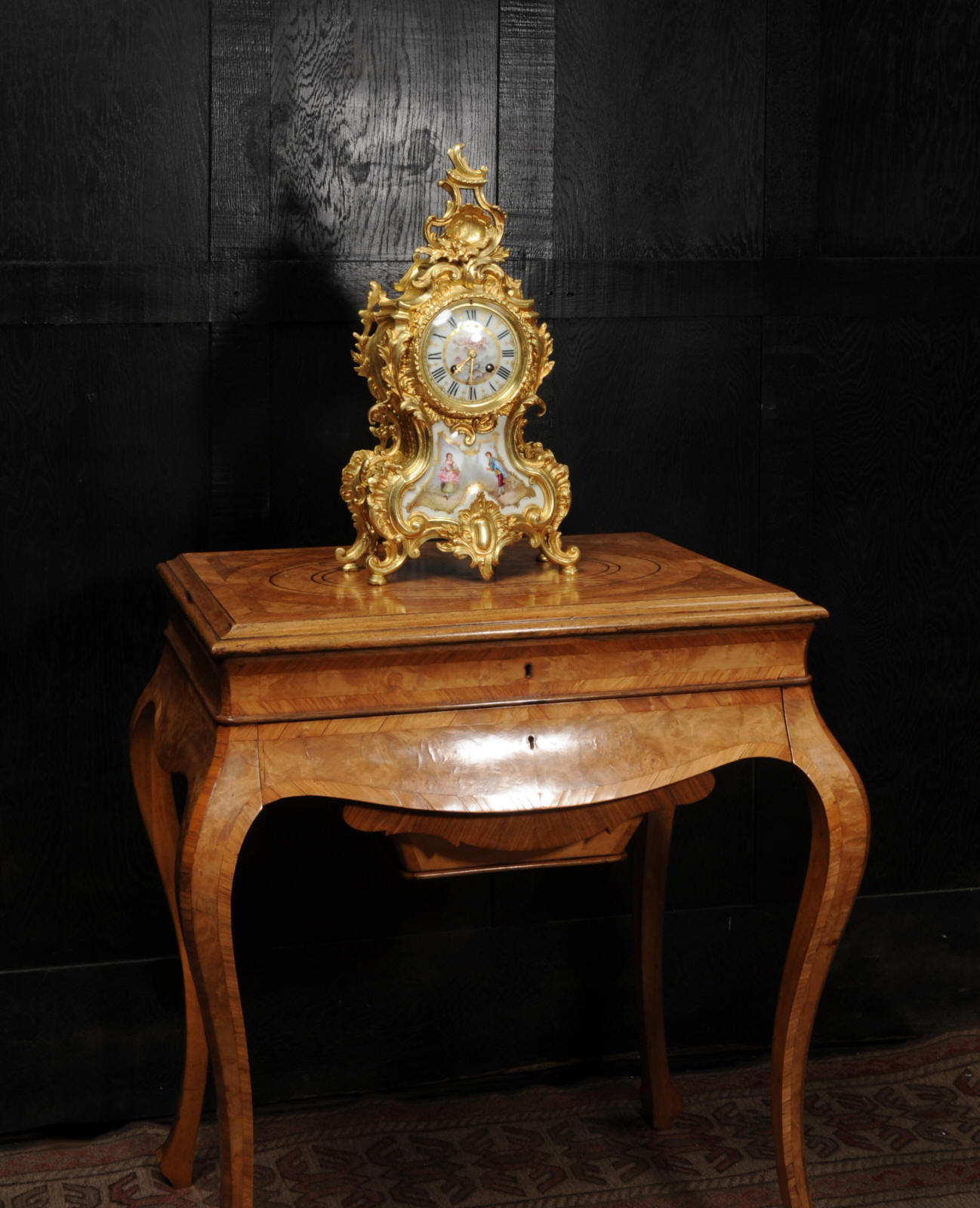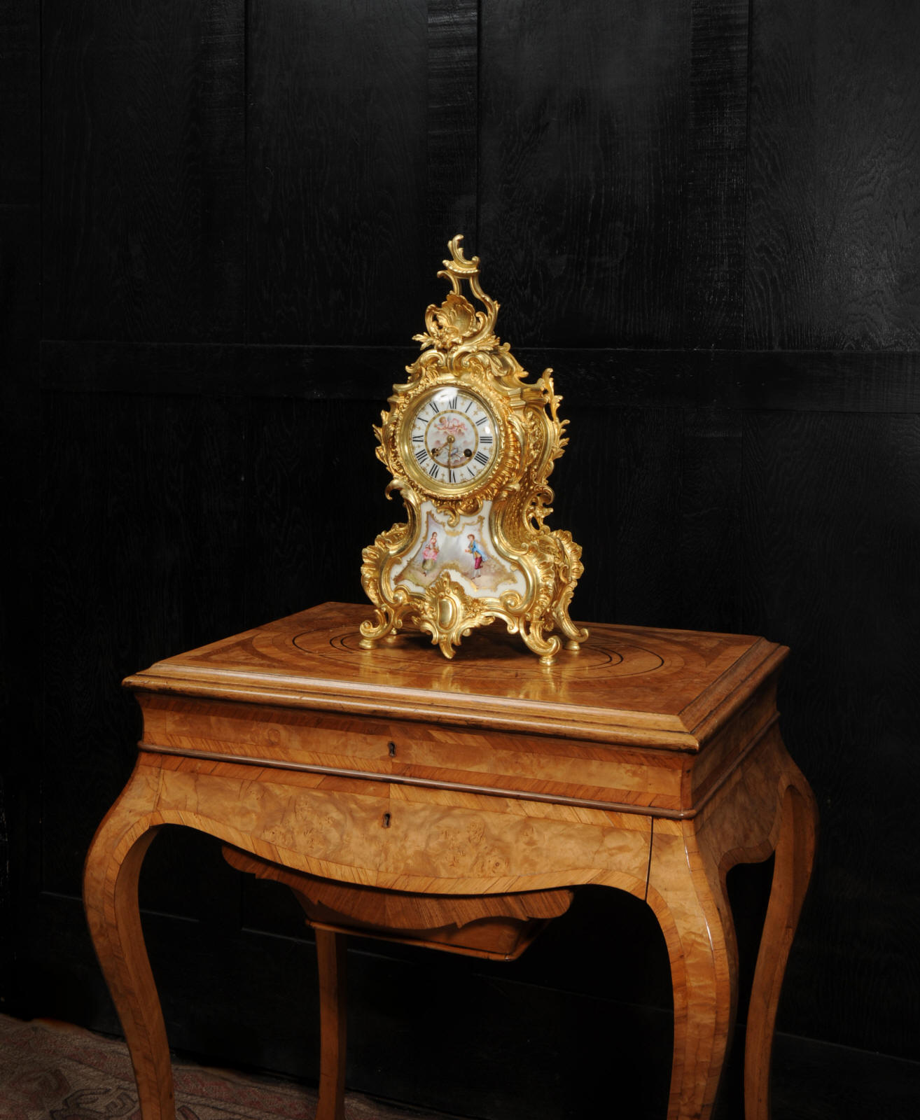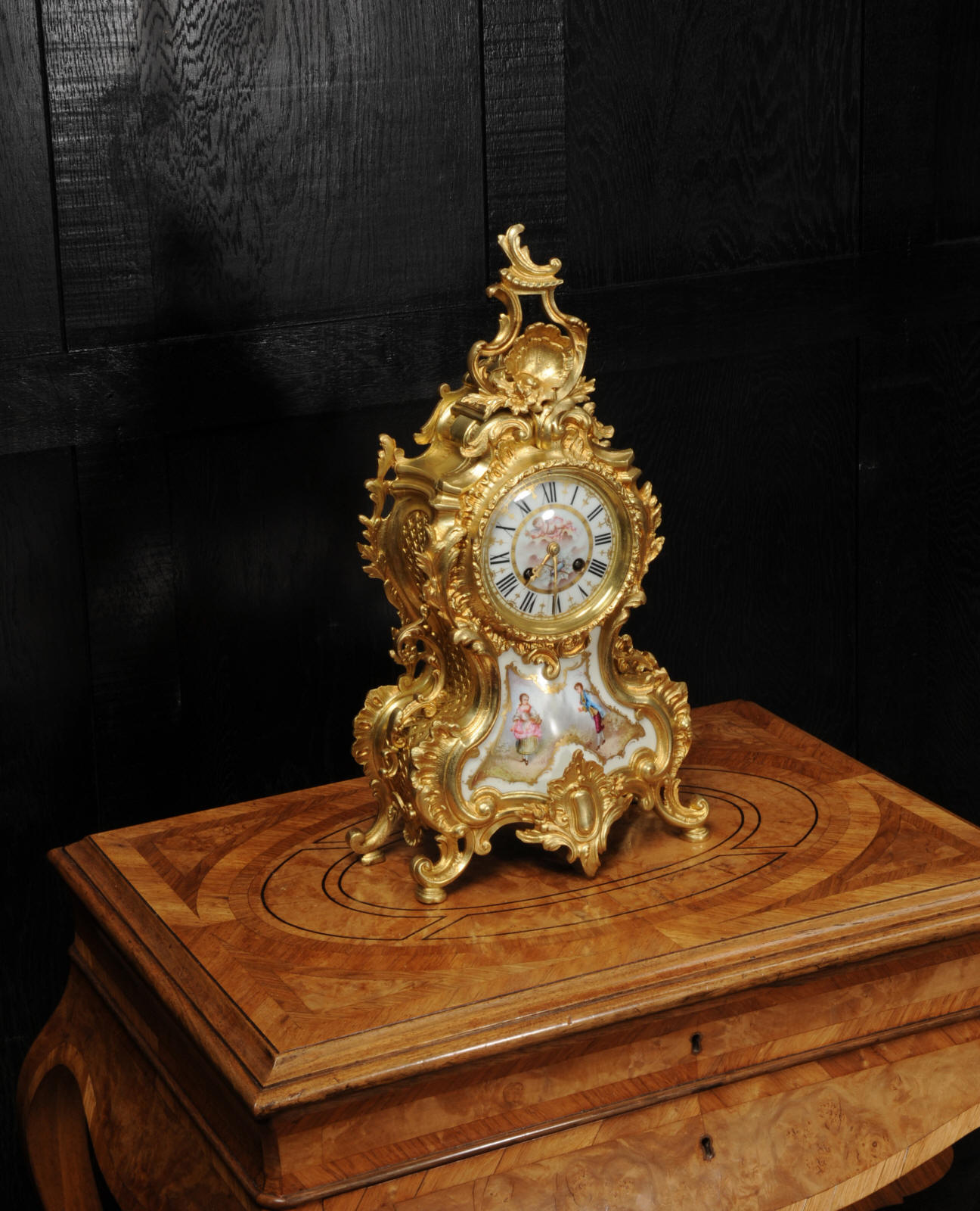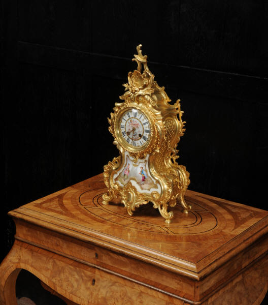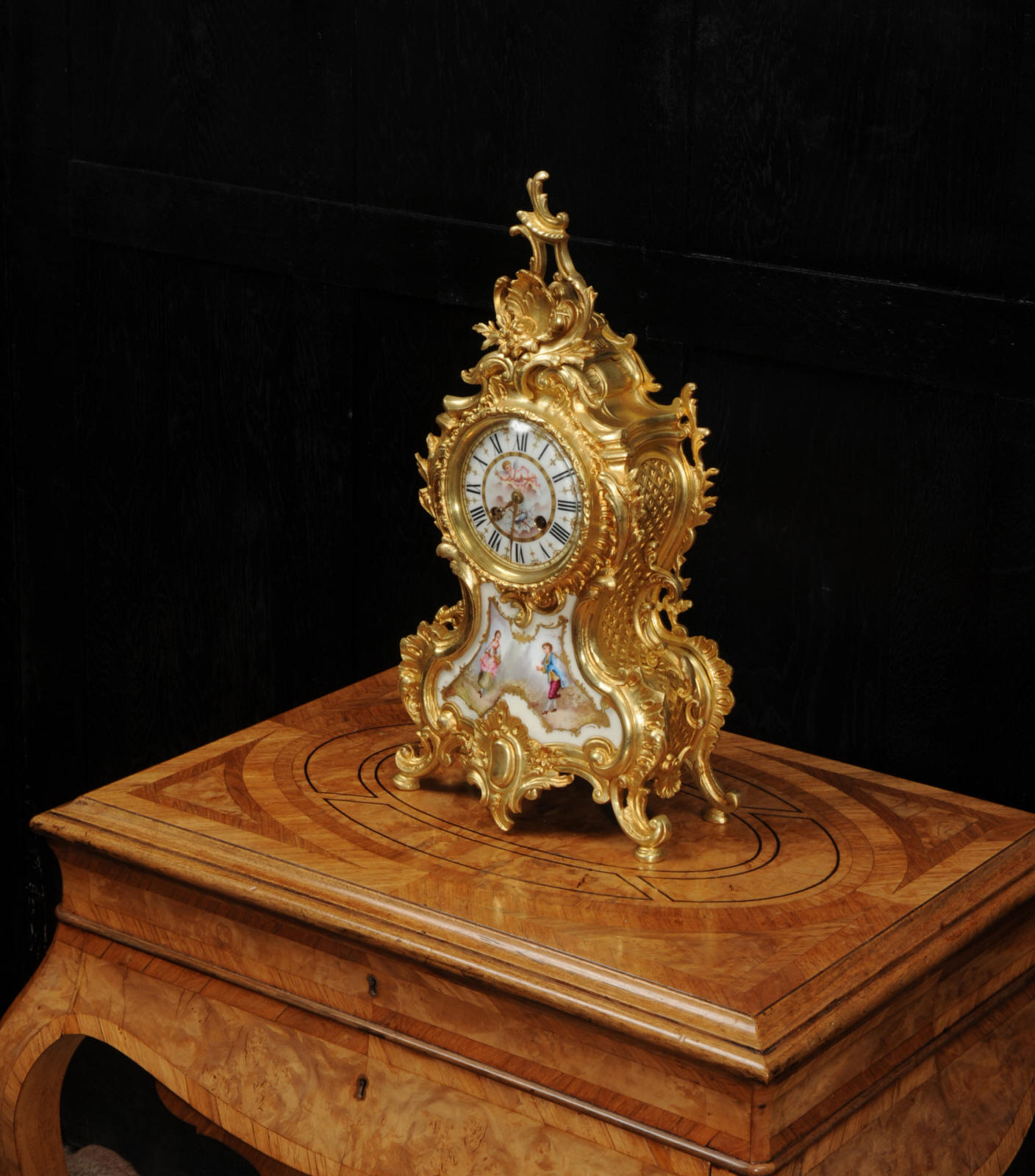 The case is of a waisted design with profuse, twirling acanthus decoration and scrolls. The dial is also porcelain with a charming cherub amongst the clouds. It is complete with it's original finely fretted gilt brass hands. The French movement is by A. D. Mougin and is of the maker's usual high quality. It is in excellent clean and running condition having been fully overhauled by our clockmaker. Pendulum is original. It runs for 8 days and strikes the hours and halves on a bell. Click the video clip below to hear the bell and watch the clock running. Condition of the case is excellent, the original gilding is beautifully clean, bright and crisp. The porcelain is also in excellent condition, some slight wear to the over glaze gilt decoration, very occasional marks and discolouration.