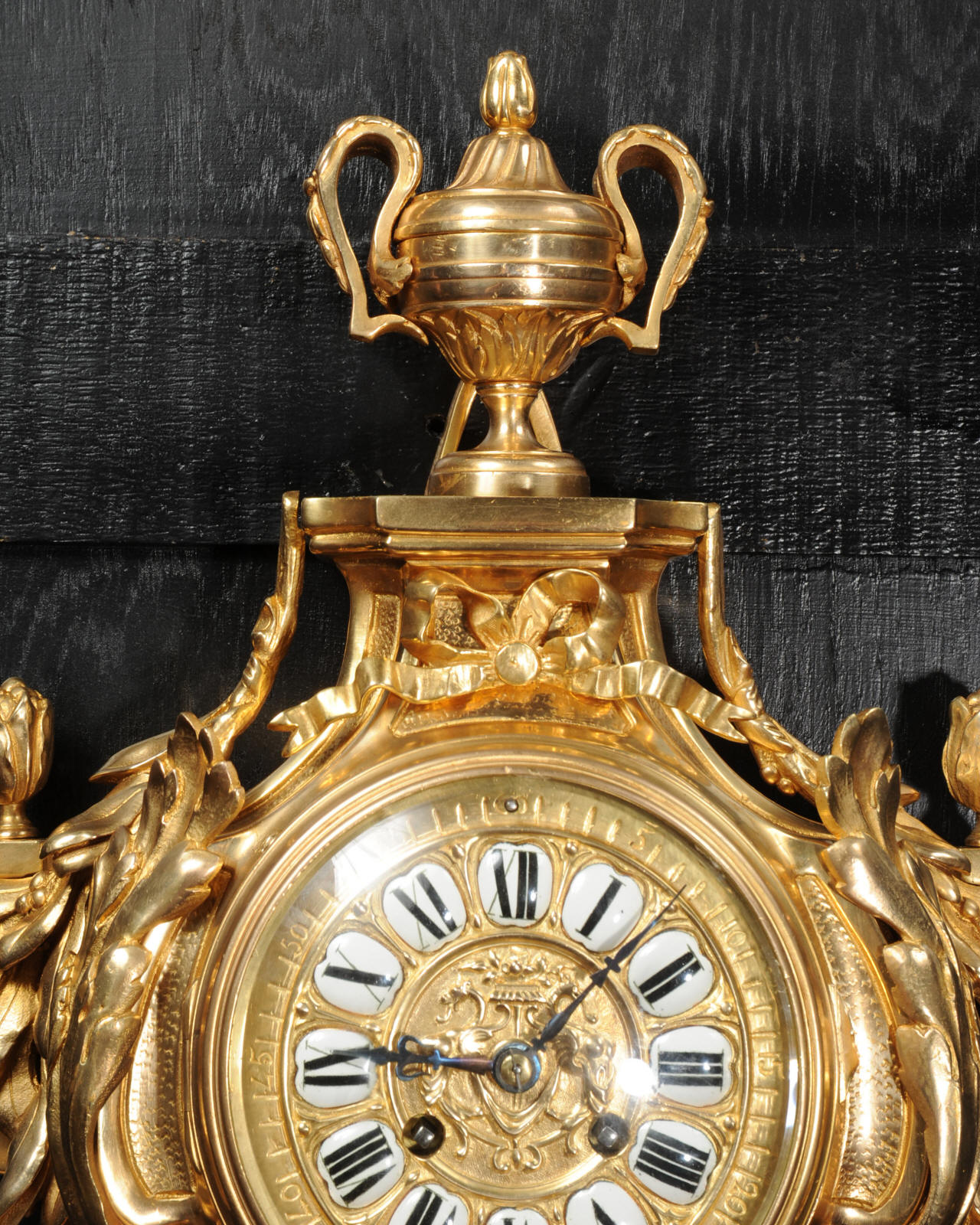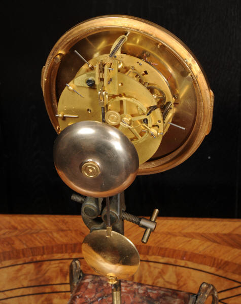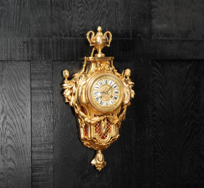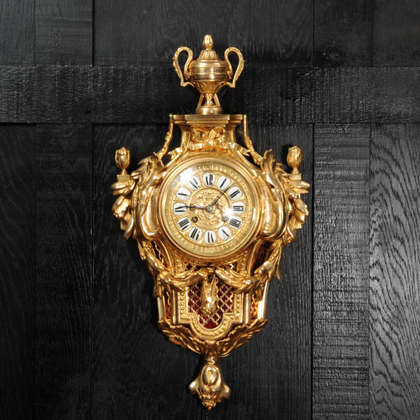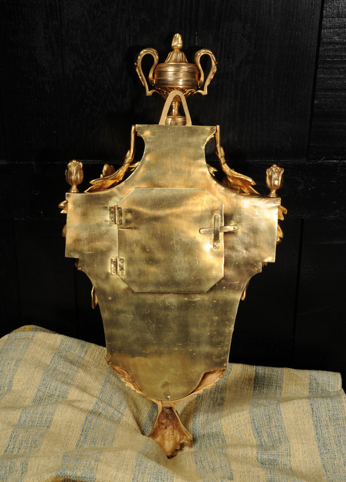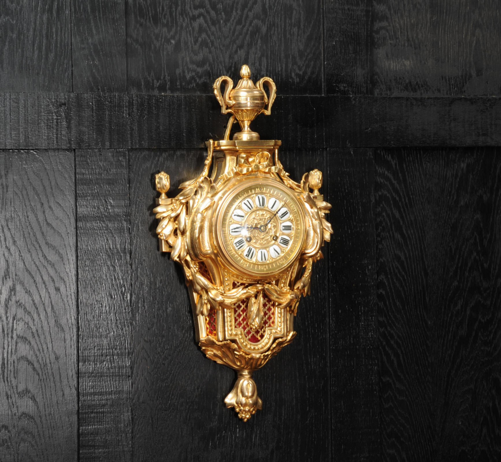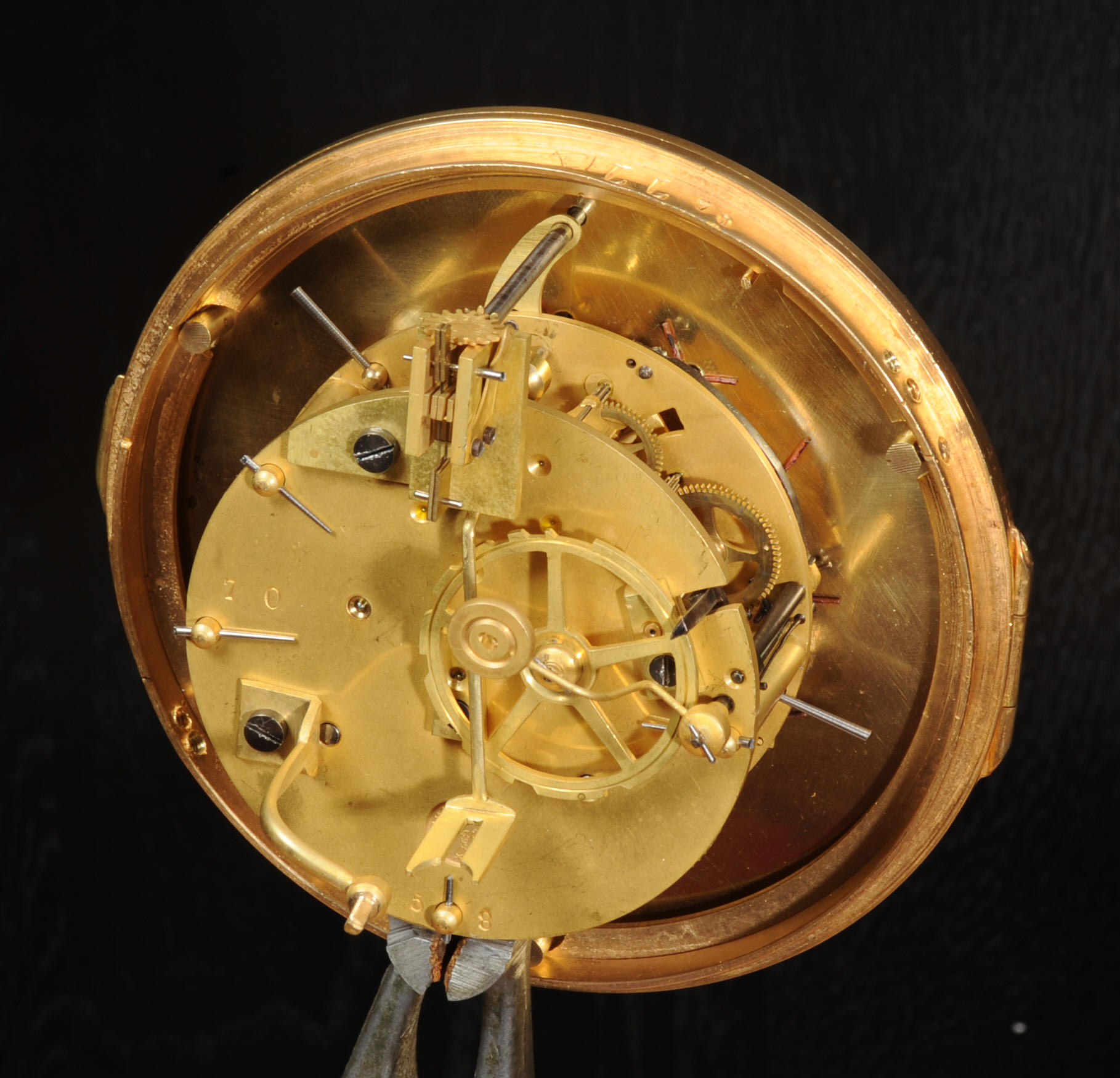 The dial is also gilt bronze with 12 individual enamel cartouches, an engraved minute ring and is complete with its original blued steel hands. The bezel is fitted with convex beveled glass. The French movement is by Samuel Marti and is of the makers usual high quality. It is in excellent clean and running condition having been fully overhauled by our clockmaker. Pendulum is original. It runs for 8 days and strikes the hours and halves on a bell. Click the video below to hear the bell and watch the clock running. Condition of the case is excellent; the gilding is beautifully clean and bright with hardly any wear or discolouration. The dial is also in excellent condition with no damaged. We have replaced the fabric behind the sound frets.