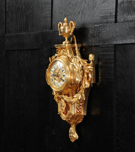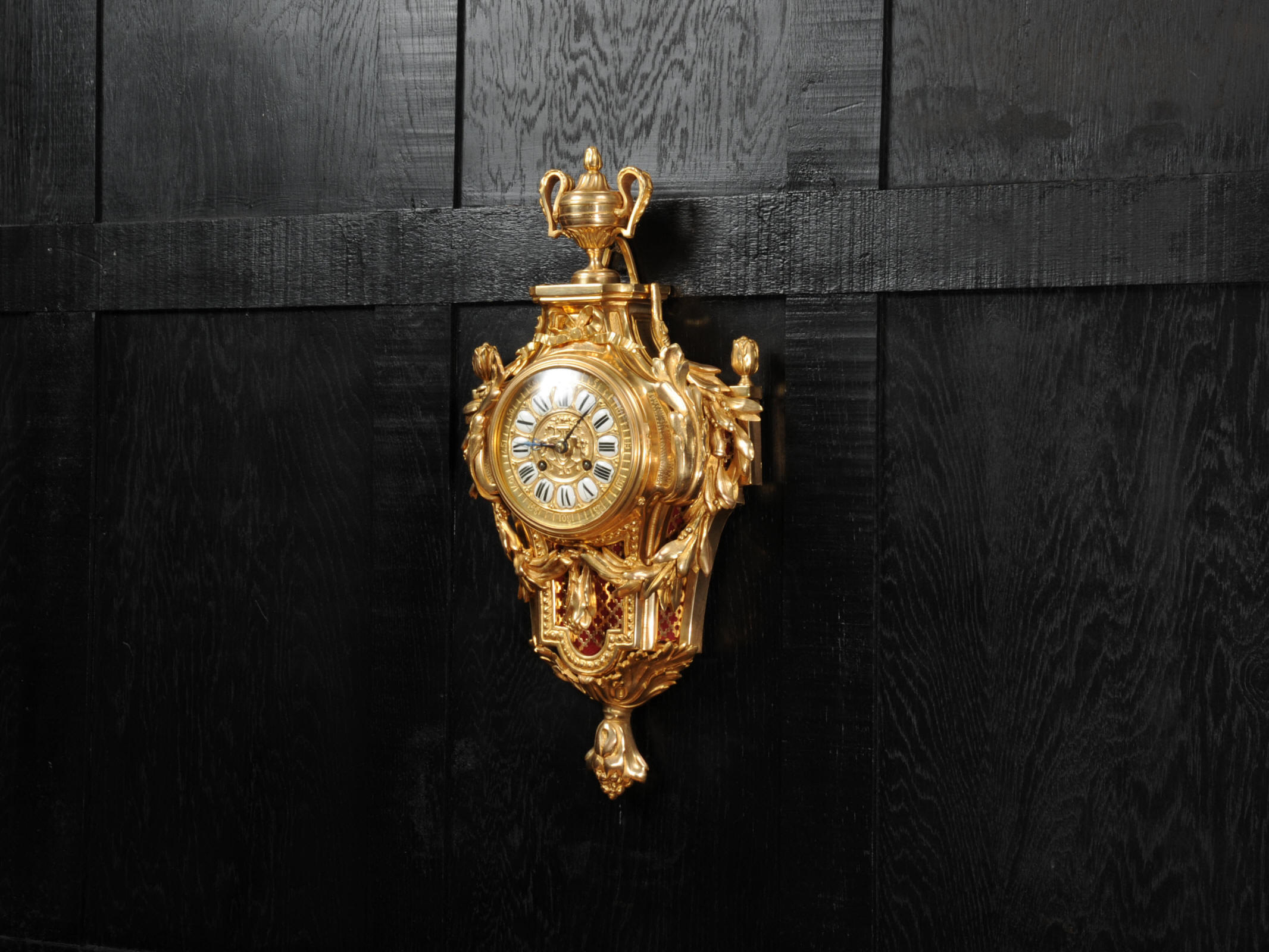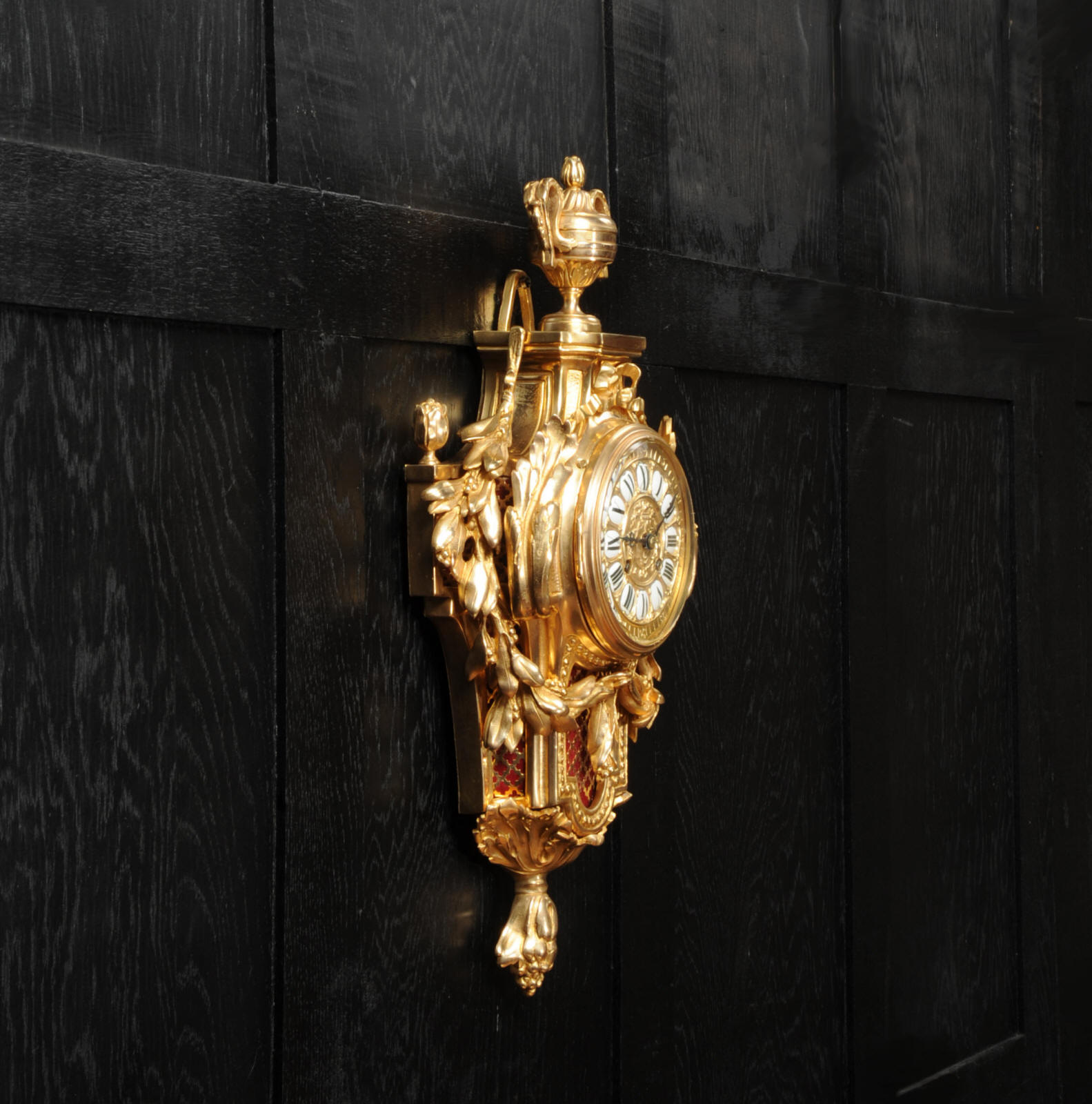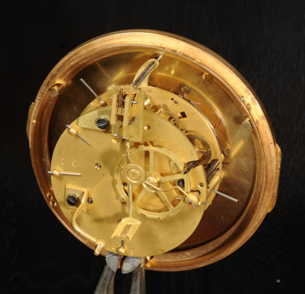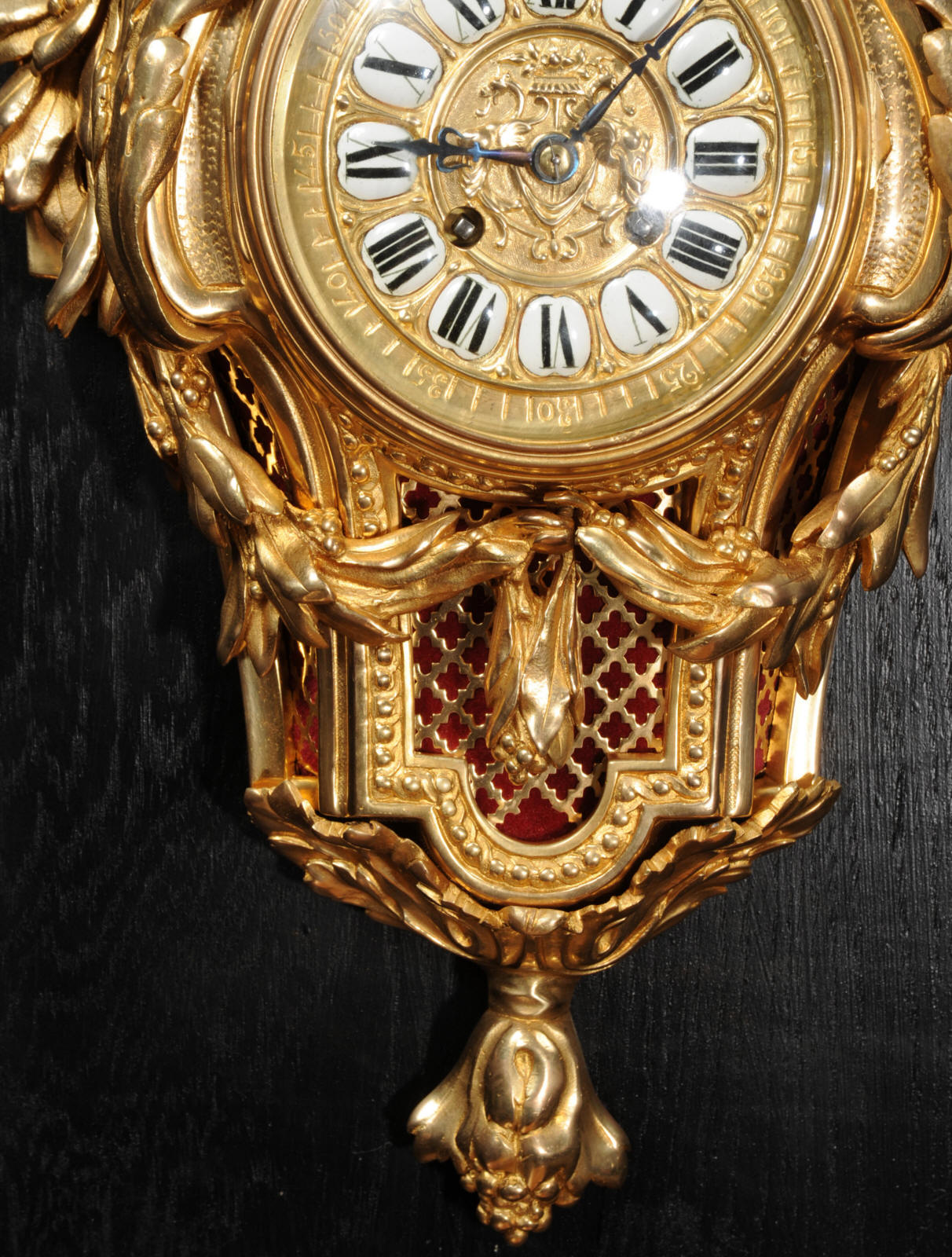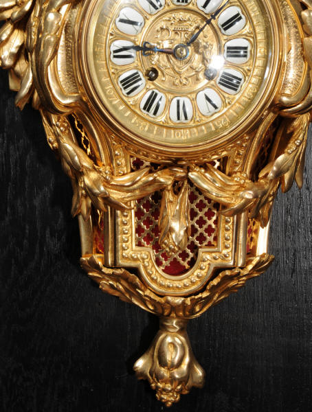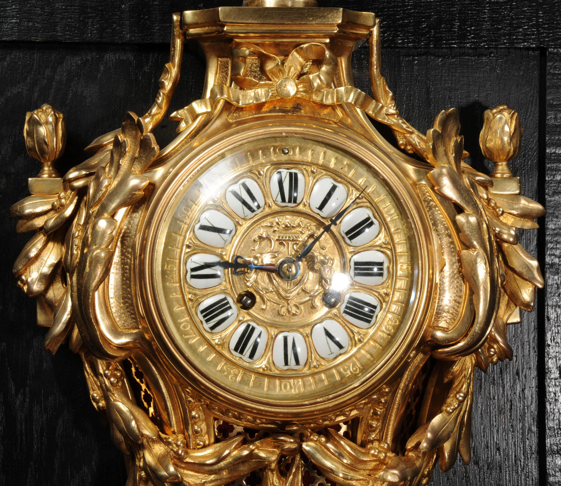 The dial is also gilt bronze with 12 individual enamel cartouches, an engraved minute ring and is complete with its original blued steel hands. The bezel is fitted with convex beveled glass. The French movement is by Samuel Marti and is of the makers usual high quality. It is in excellent clean and running condition having been fully overhauled by our clockmaker. Pendulum is original. It runs for 8 days and strikes the hours and halves on a bell. Click the video below to hear the bell and watch the clock running. Condition of the case is excellent; the gilding is beautifully clean and bright with hardly any wear or discolouration. The dial is also in excellent condition with no damaged. We have replaced the fabric behind the sound frets.