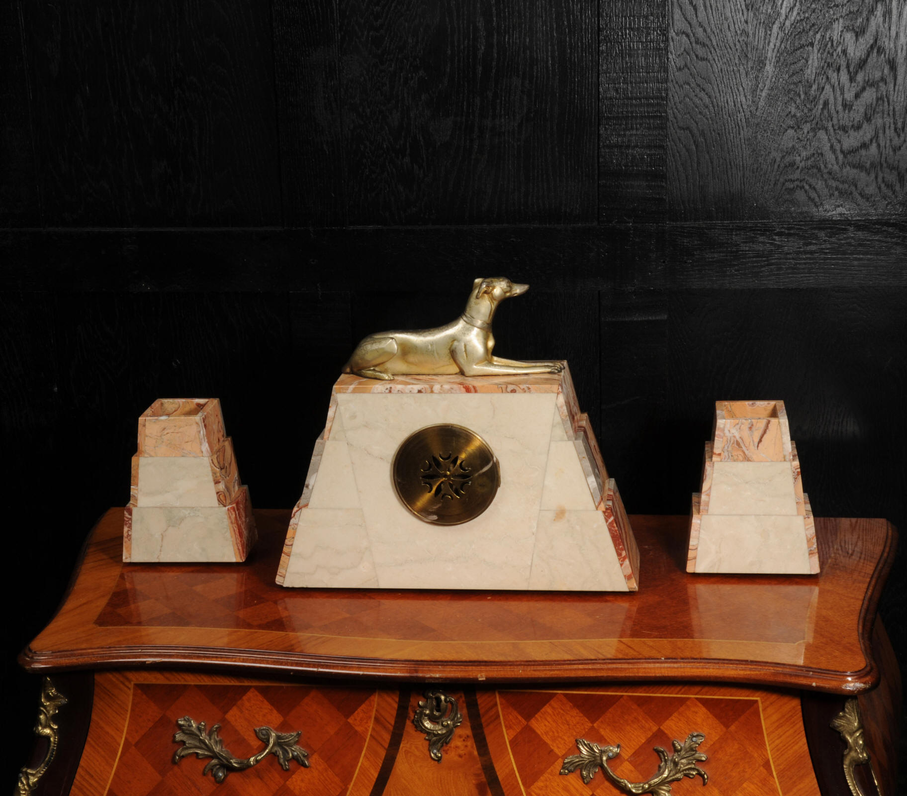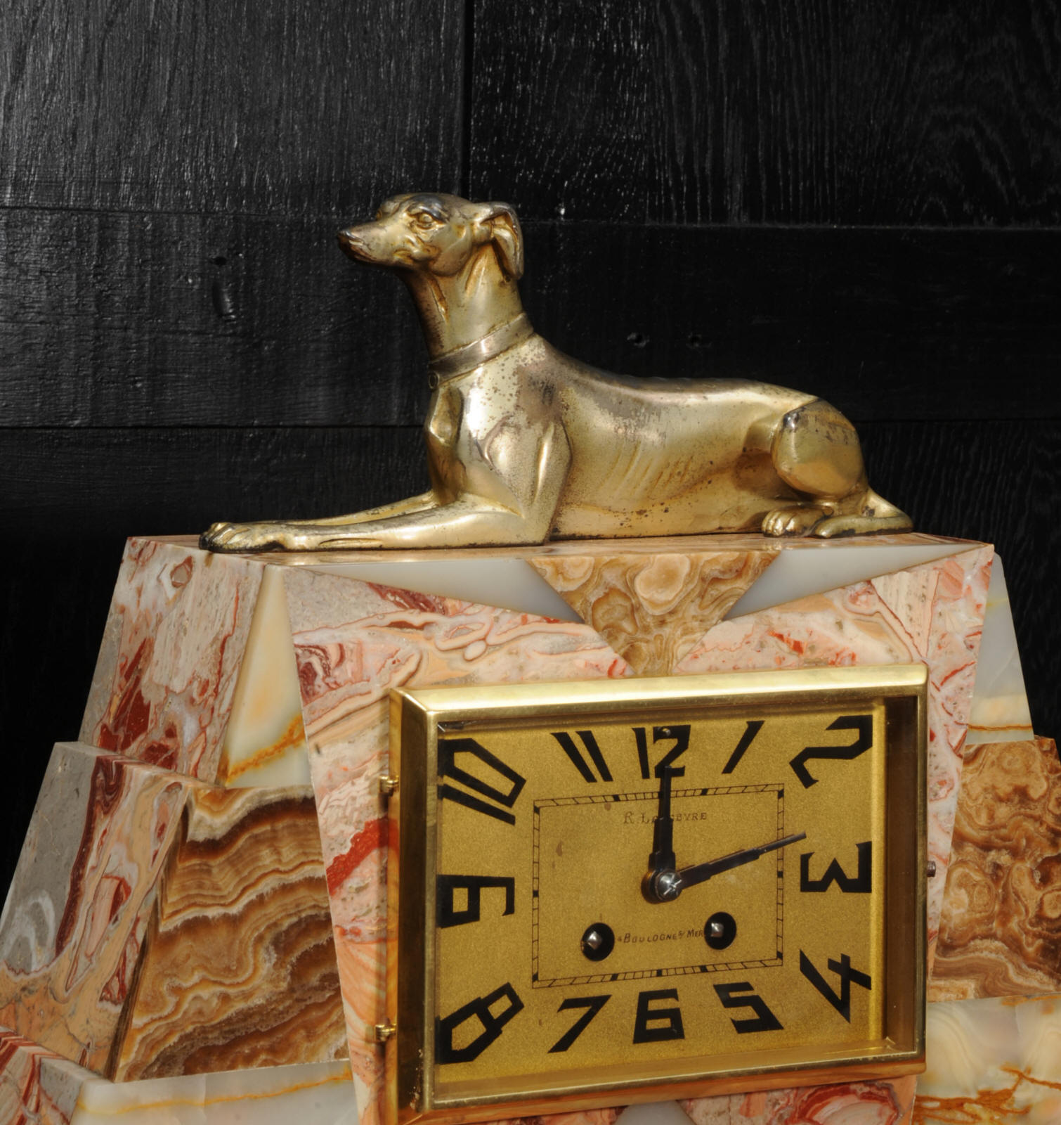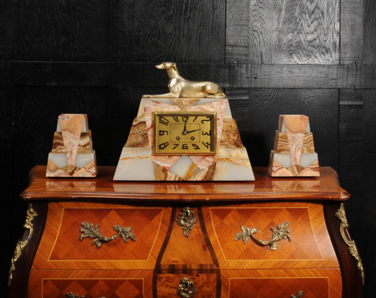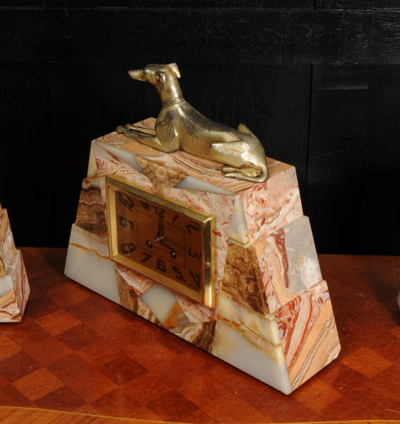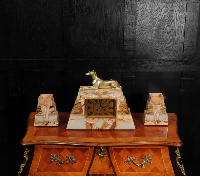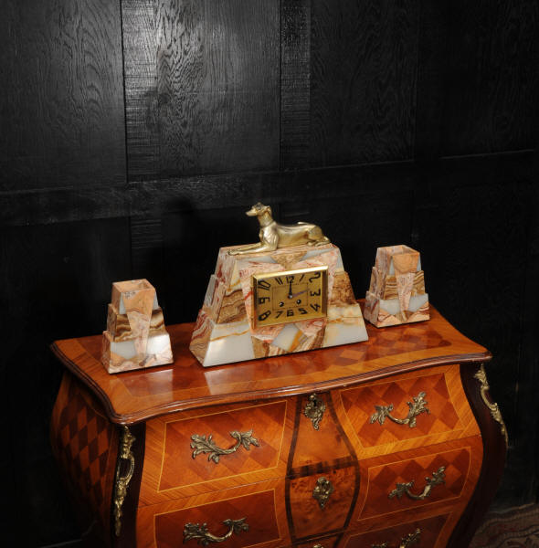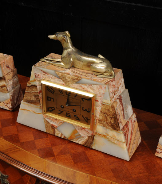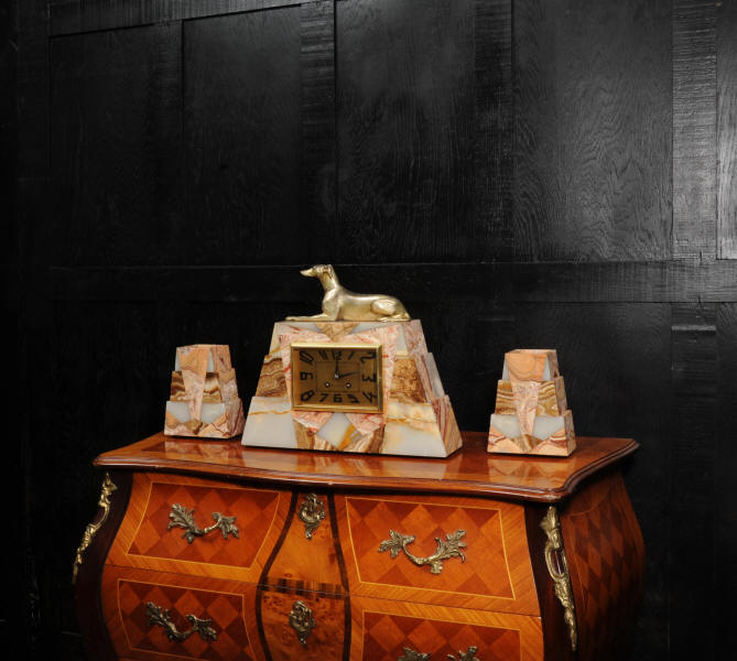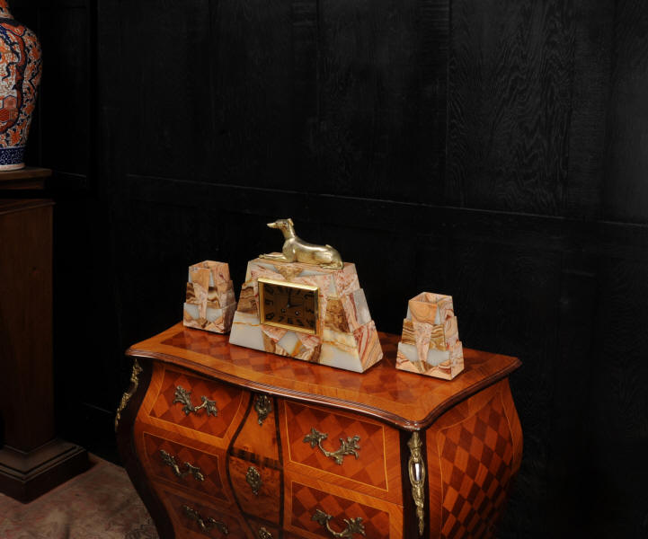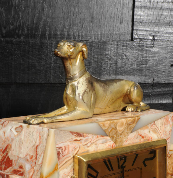 The dial is matted gold, screen printed with stylised elongated numerals and complete with it's original square form blued steel hands. The French movement is of high quality and is in excellent clean and running condition having been fully overhauled by our clockmaker. It is a traditional 'Pendule de Paris' movement with a pendulum. Pendulum is a replacement. It runs for 8 days and strikes the hours and halves on a bell. Click the video below to hear the bell and watch the clock running. Condition of the case is excellent, the greyhound has its original finish with a lovely patina that has worn where the clock has been held for winding. Marble is also excellent with a very good polish and only very slight nibbles to the edges and corners. Dial is also very good with just some very slight marks.