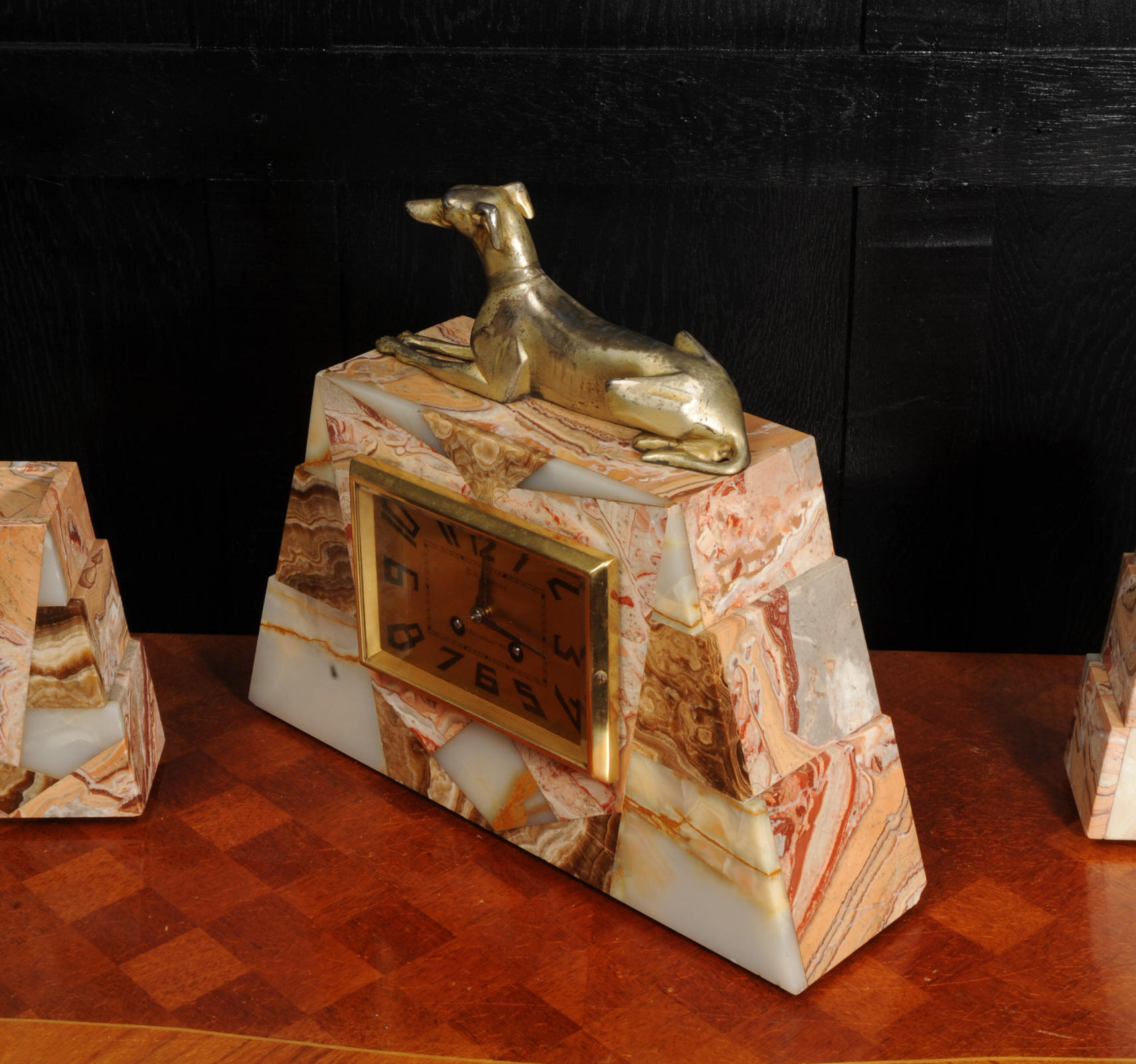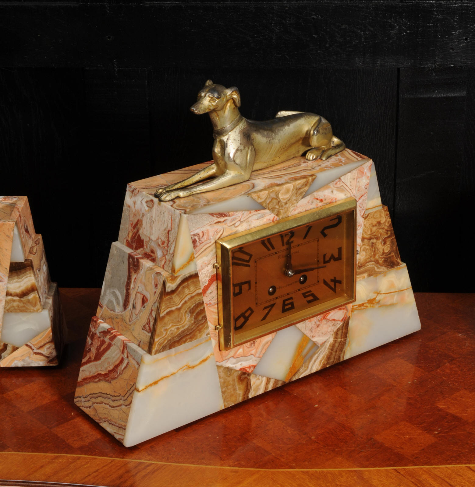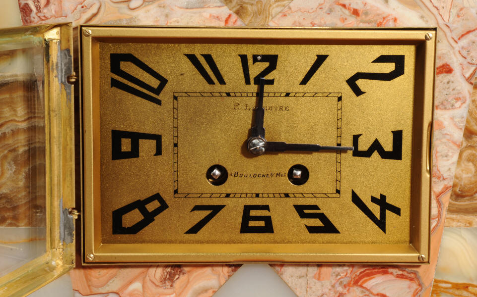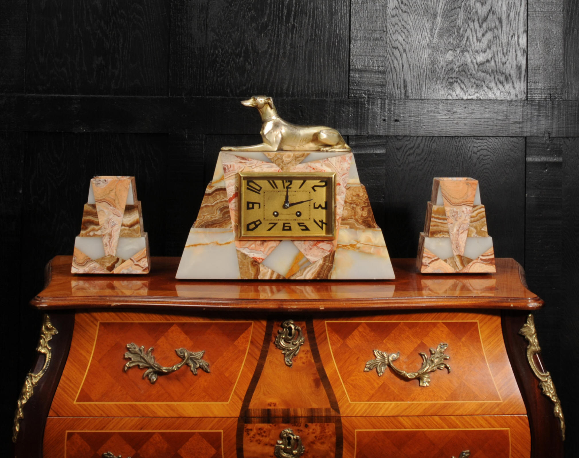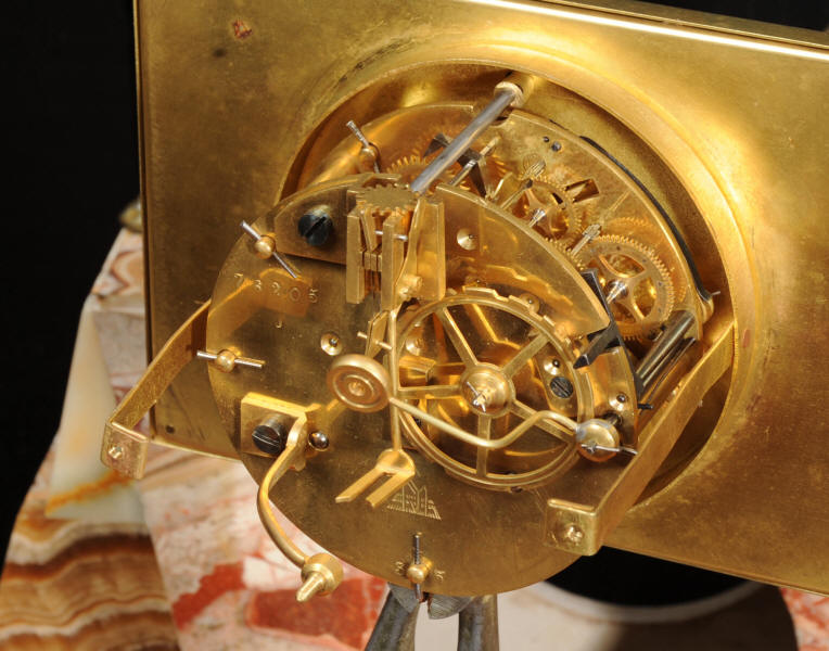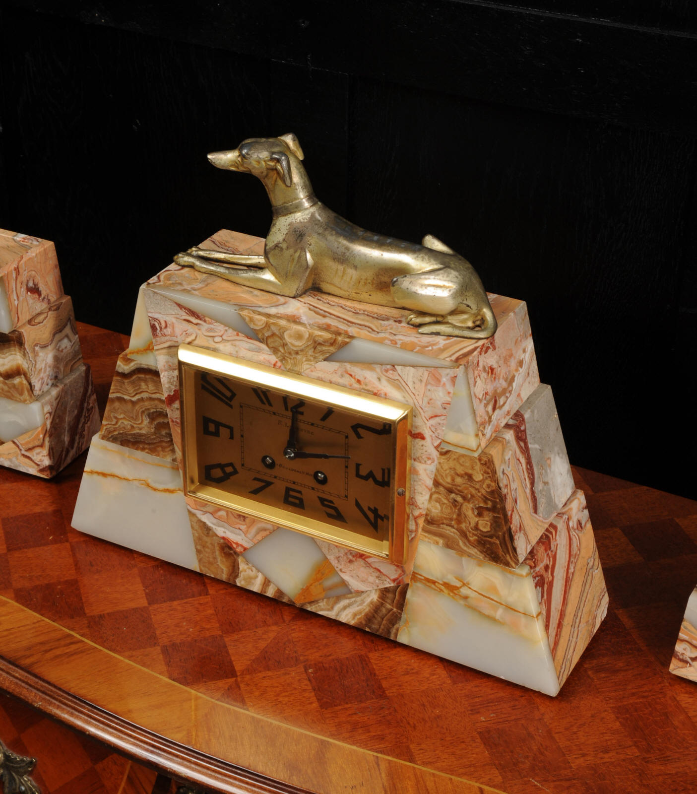 The dial is matted gold, screen printed with stylised elongated numerals and complete with it's original square form blued steel hands. The French movement is of high quality and is in excellent clean and running condition having been fully overhauled by our clockmaker. It is a traditional 'Pendule de Paris' movement with a pendulum. Pendulum is a replacement. It runs for 8 days and strikes the hours and halves on a bell. Click the video below to hear the bell and watch the clock running. Condition of the case is excellent, the greyhound has its original finish with a lovely patina that has worn where the clock has been held for winding. Marble is also excellent with a very good polish and only very slight nibbles to the edges and corners. Dial is also very good with just some very slight marks.