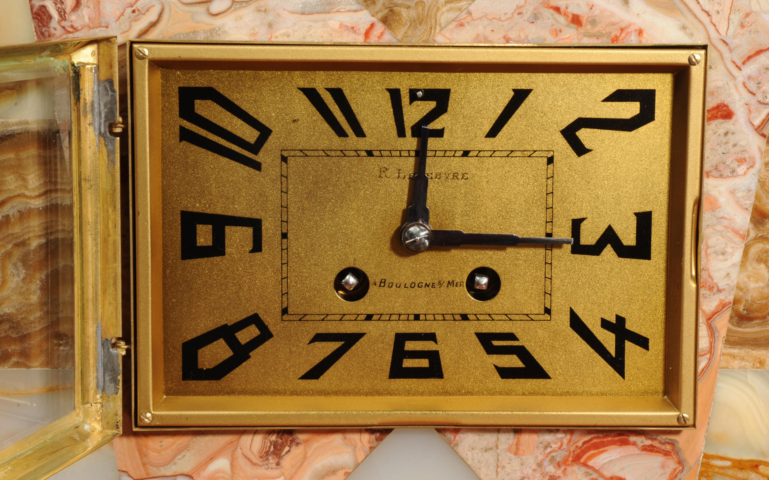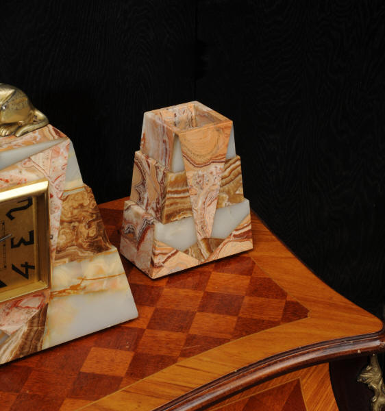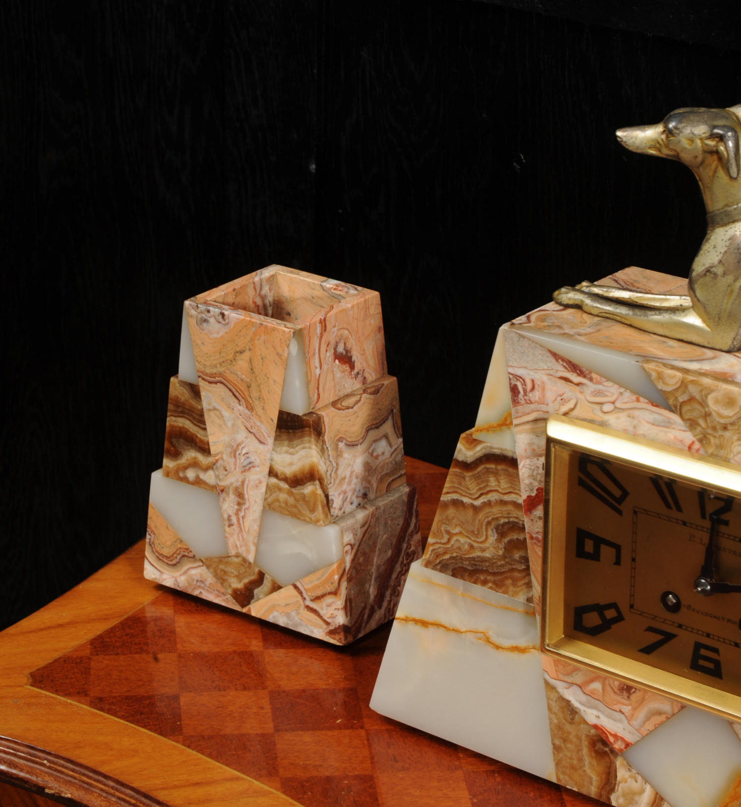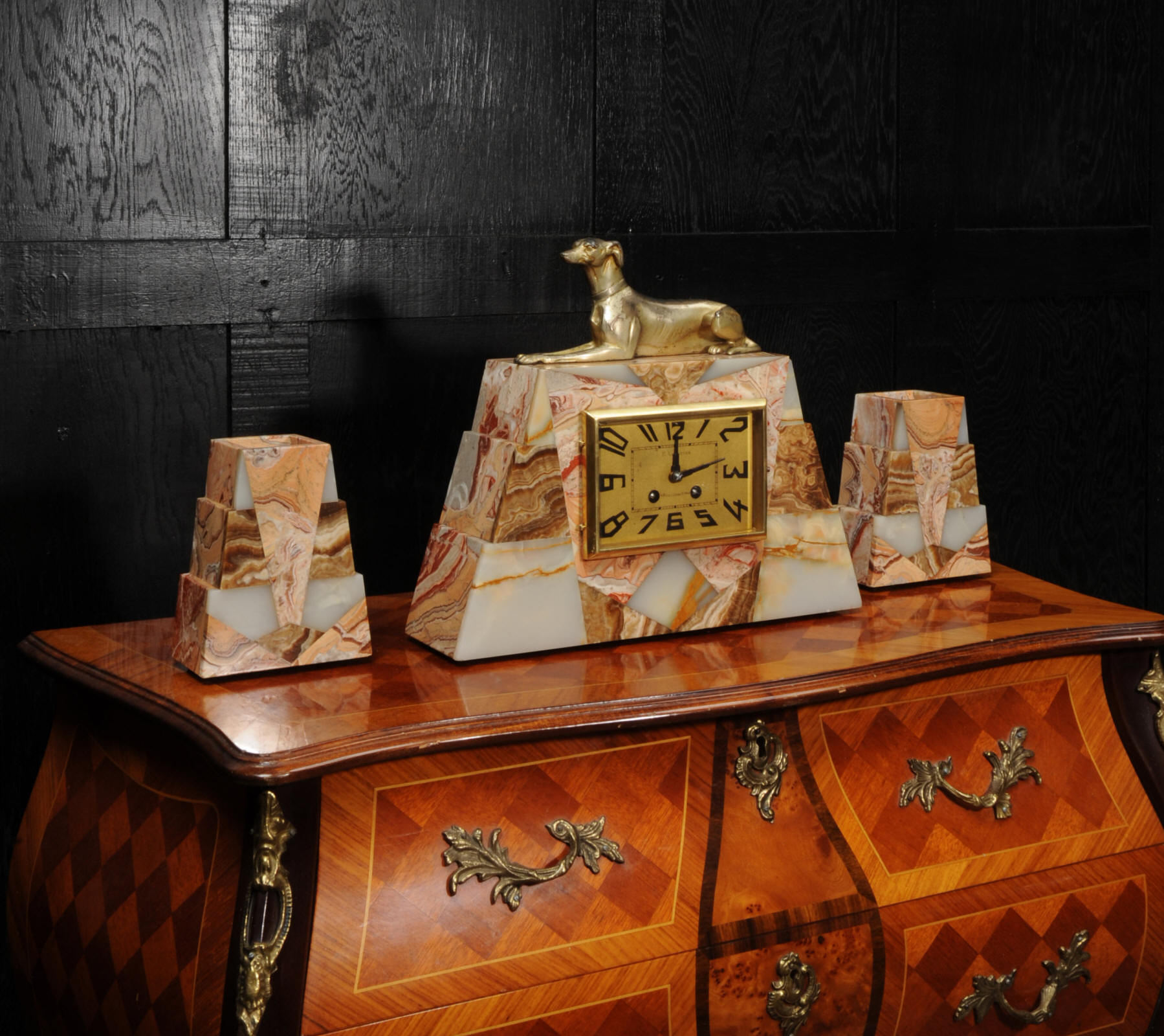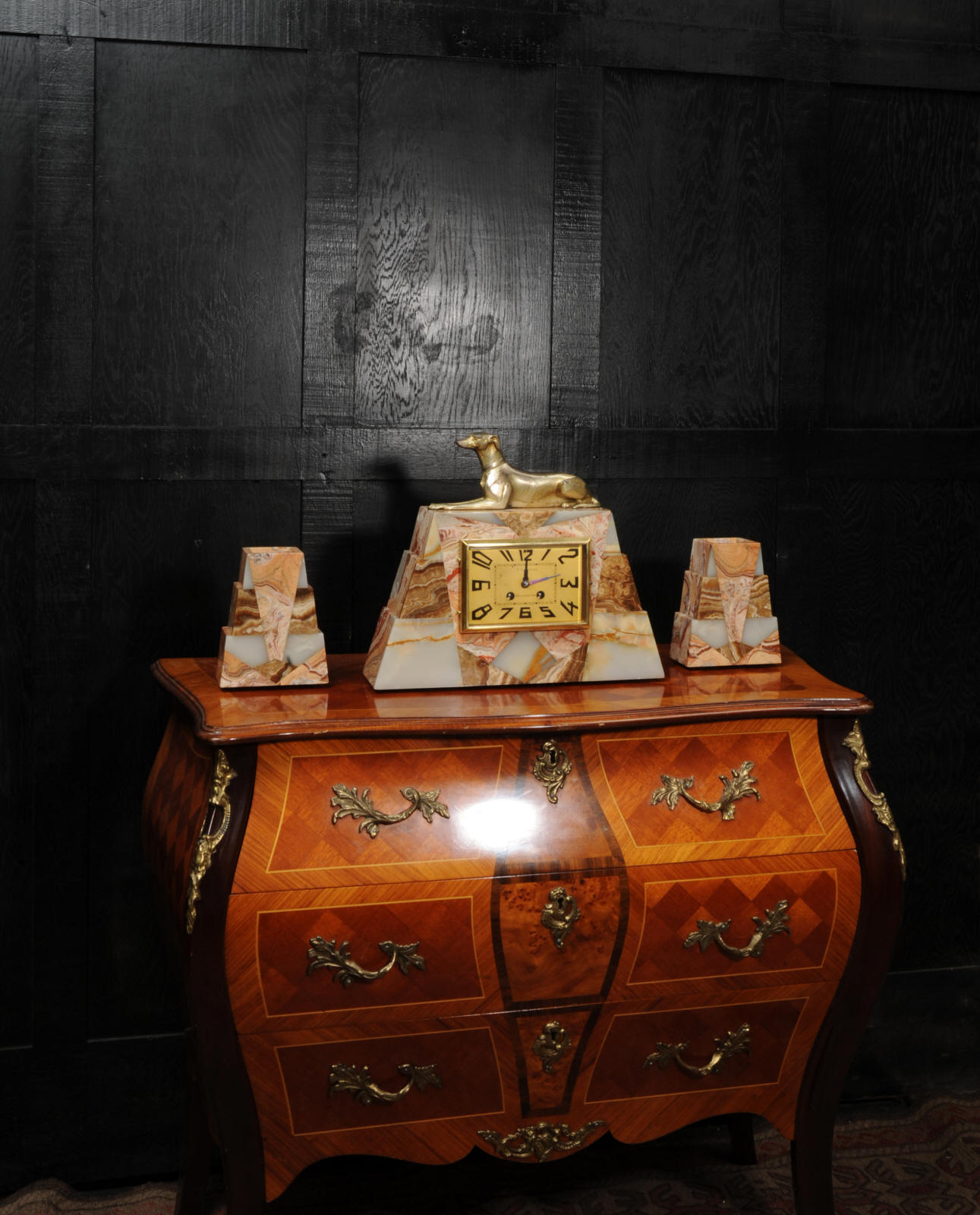 The dial is matted gold, screen printed with stylised elongated numerals and complete with it's original square form blued steel hands. The French movement is of high quality and is in excellent clean and running condition having been fully overhauled by our clockmaker. It is a traditional 'Pendule de Paris' movement with a pendulum. Pendulum is a replacement. It runs for 8 days and strikes the hours and halves on a bell. Click the video below to hear the bell and watch the clock running. Condition of the case is excellent, the greyhound has its original finish with a lovely patina that has worn where the clock has been held for winding. Marble is also excellent with a very good polish and only very slight nibbles to the edges and corners. Dial is also very good with just some very slight marks.