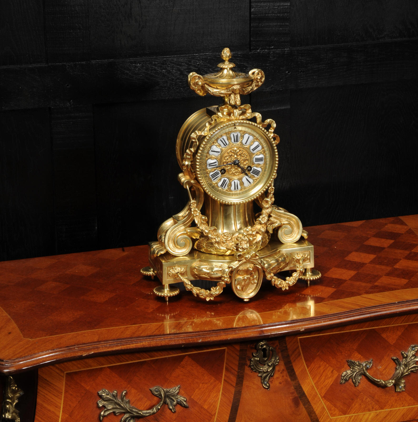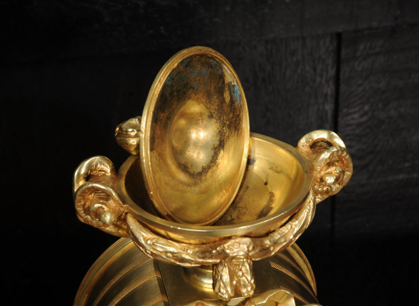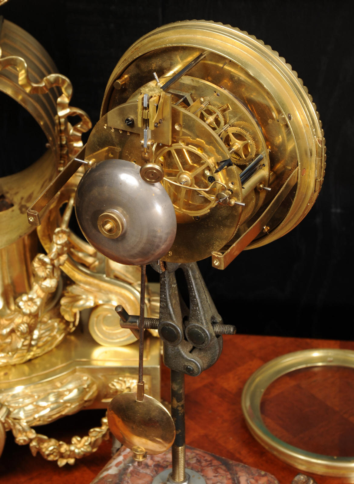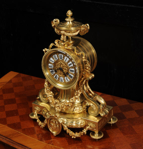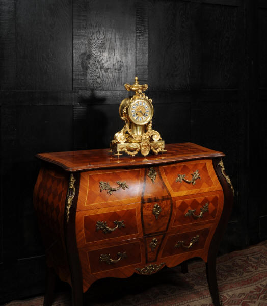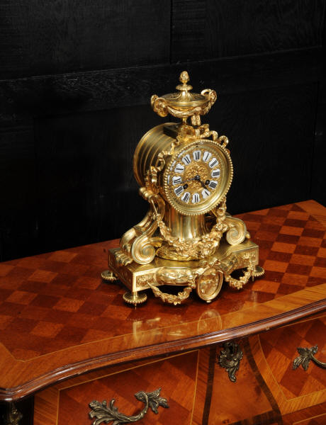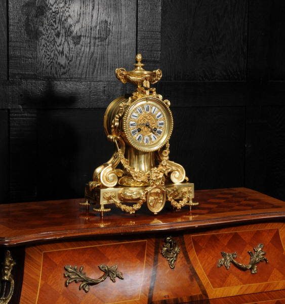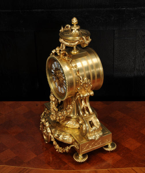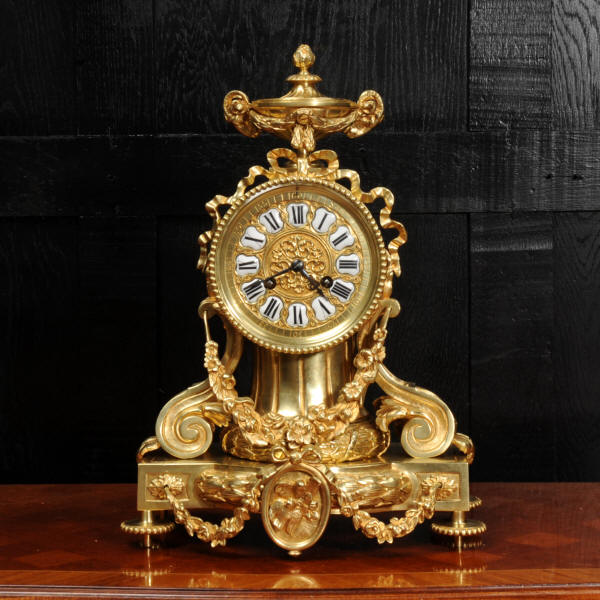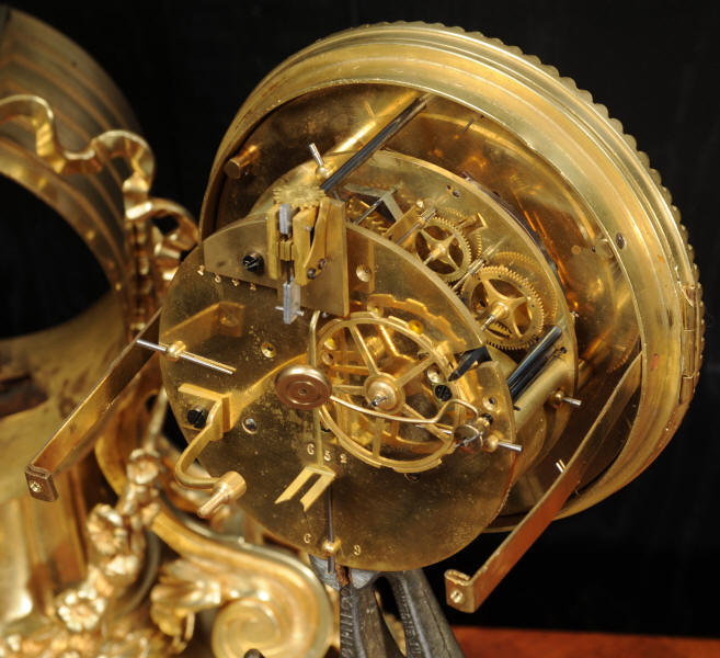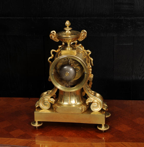 The dial is also gilt bronze with 12 individual enamel cartouches and blued steel hands. The rear door is glazed to allow the movement to be seen. The French movement is of high quality and is in excellent clean and running condition having been fully overhauled by our clockmaker. Pendulum is original. It runs for 8 days and strikes the hours and halves on a bell. Click the video below to hear the bell and watch the clock running.