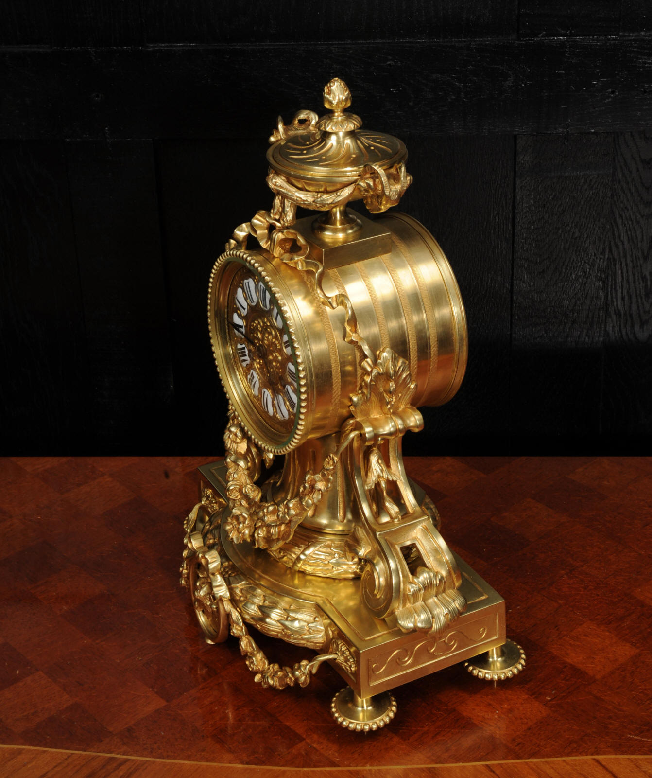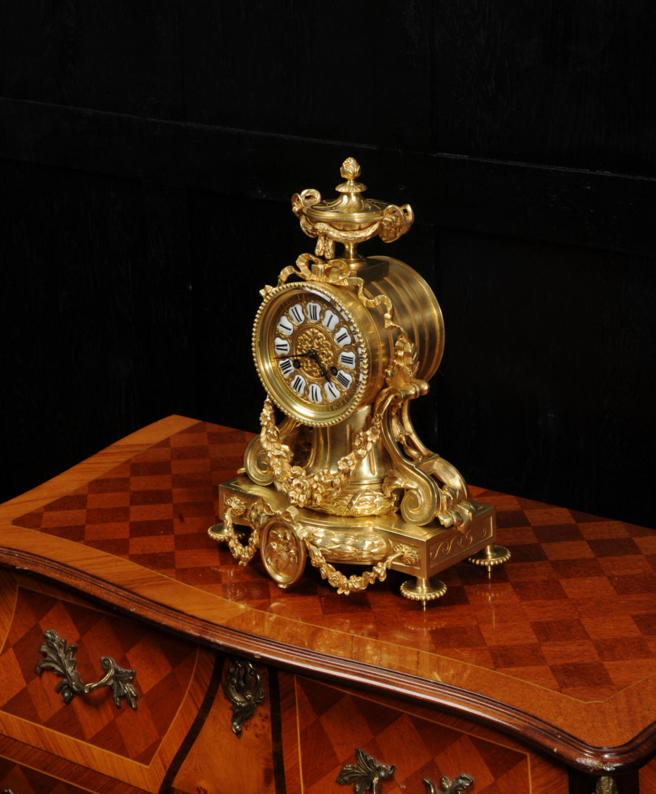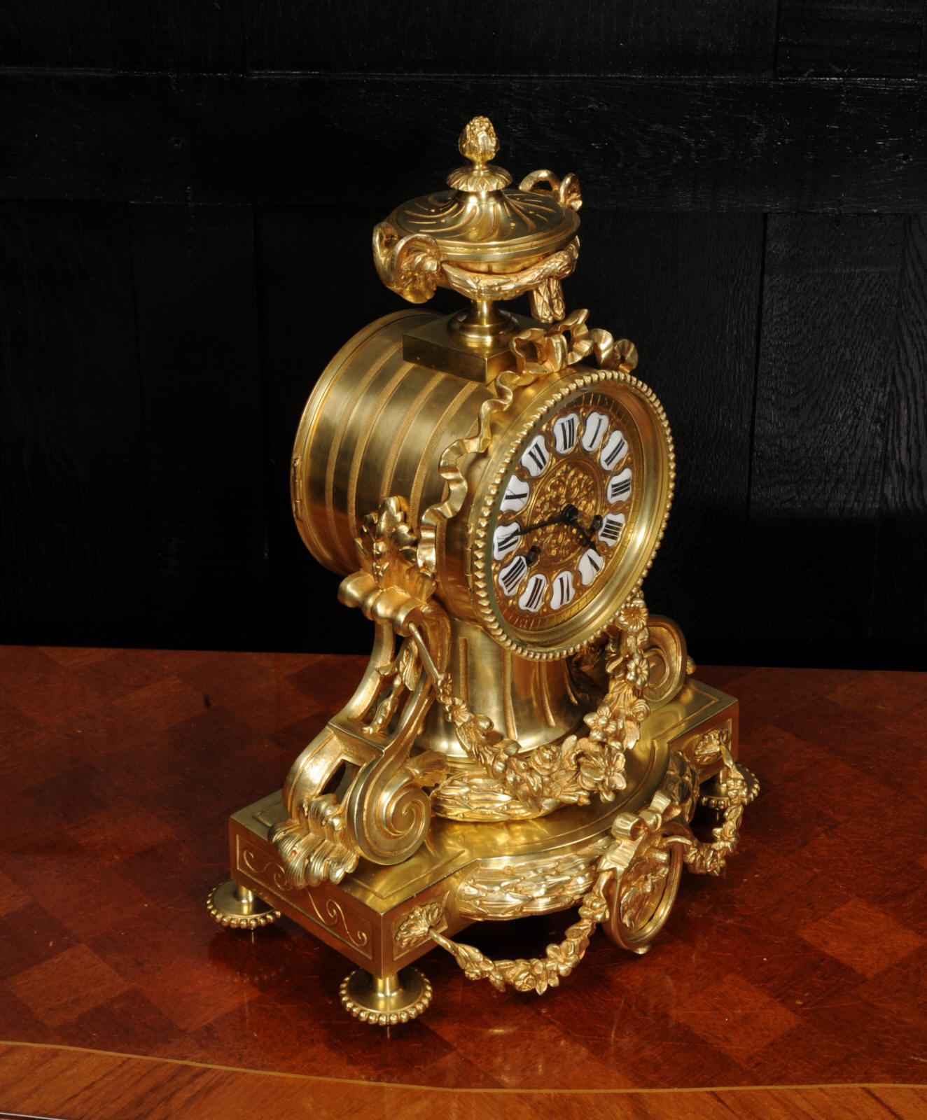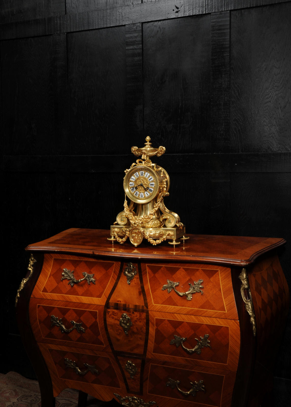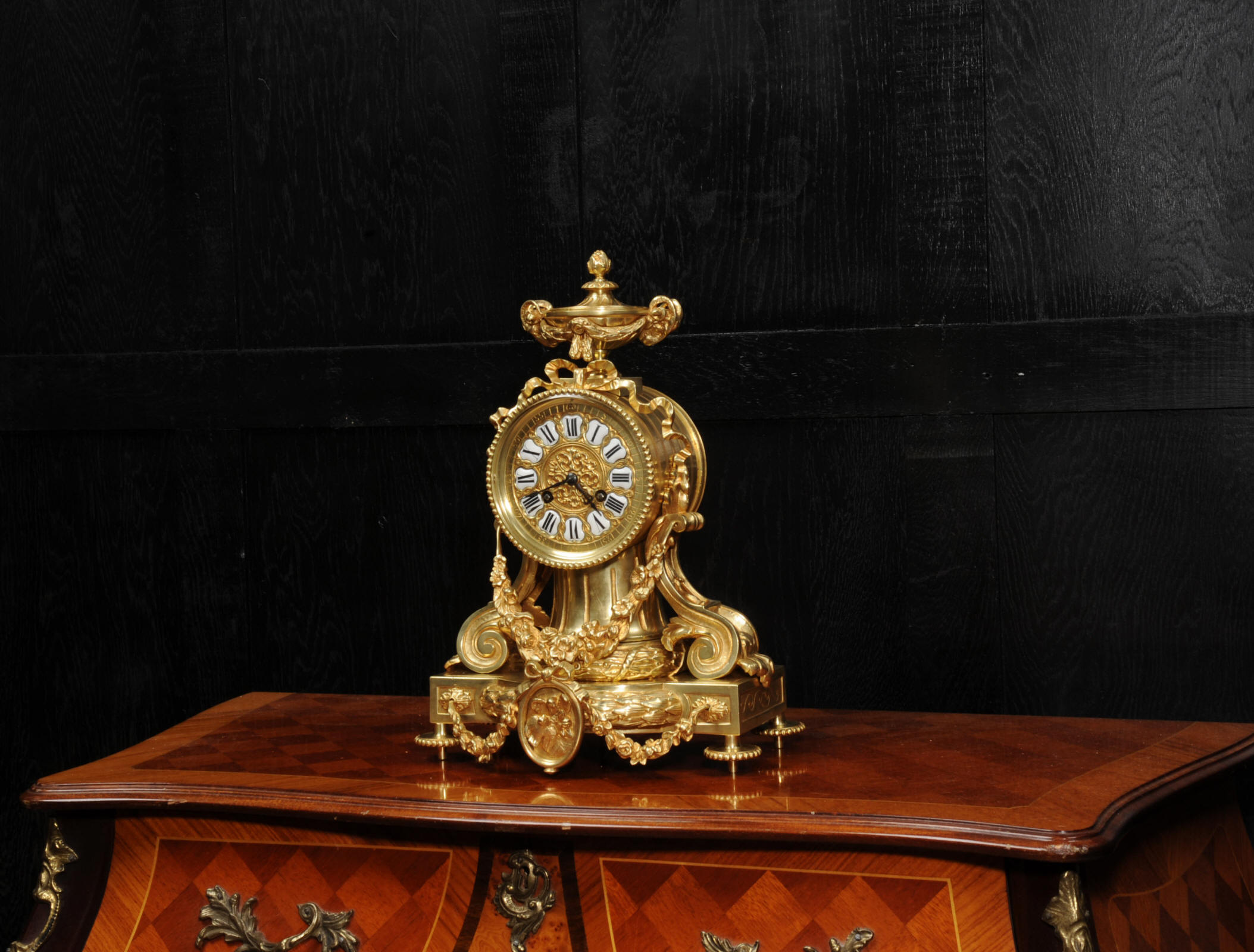The dial is also gilt bronze with 12 individual enamel cartouches and blued steel hands. The rear door is glazed to allow the movement to be seen. The French movement is of high quality and is in excellent clean and running condition having been fully overhauled by our clockmaker. Pendulum is original. It runs for 8 days and strikes the hours and halves on a bell. Click the video below to hear the bell and watch the clock running.