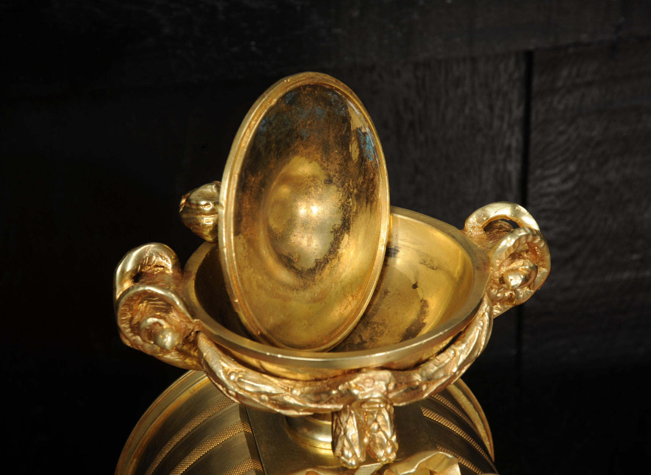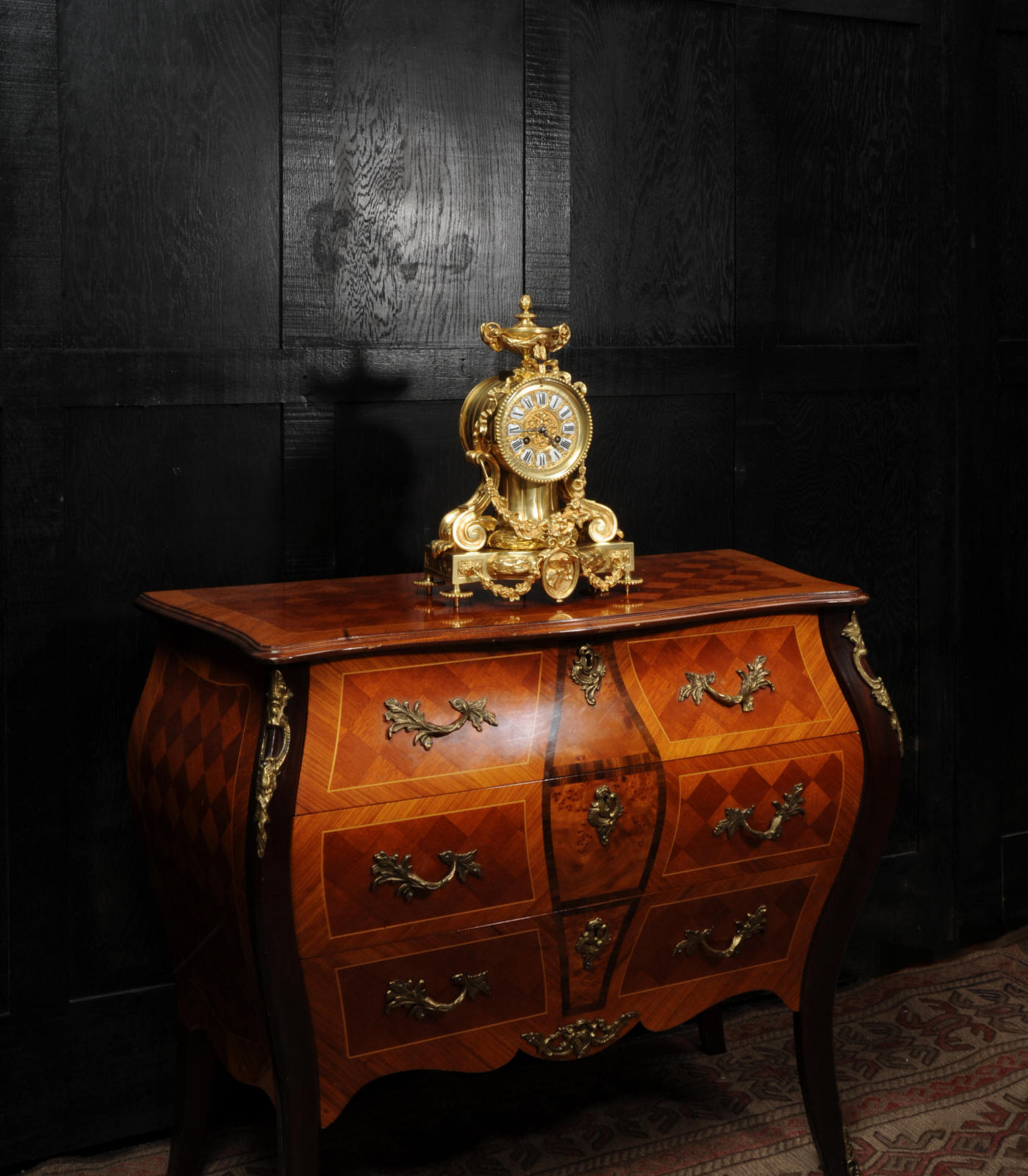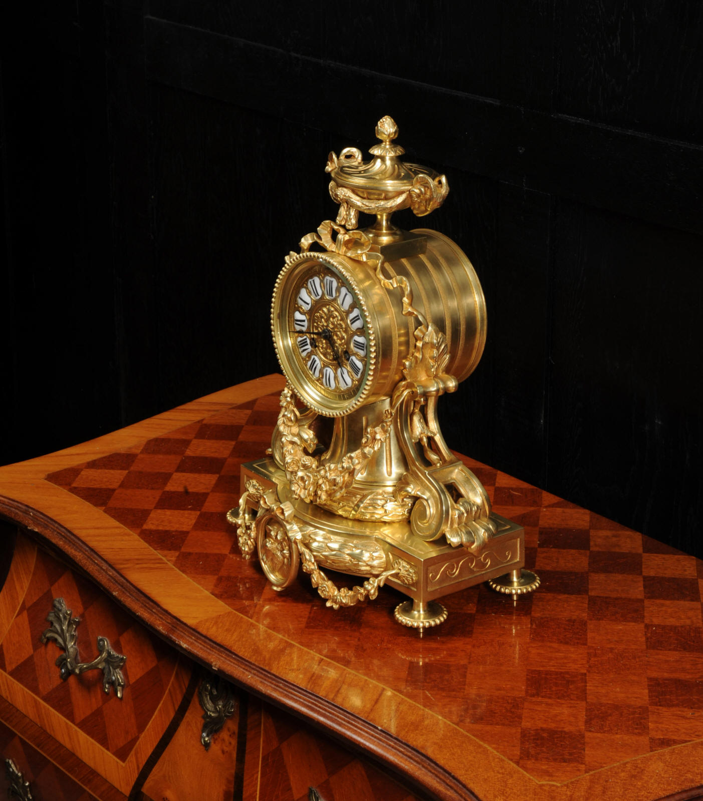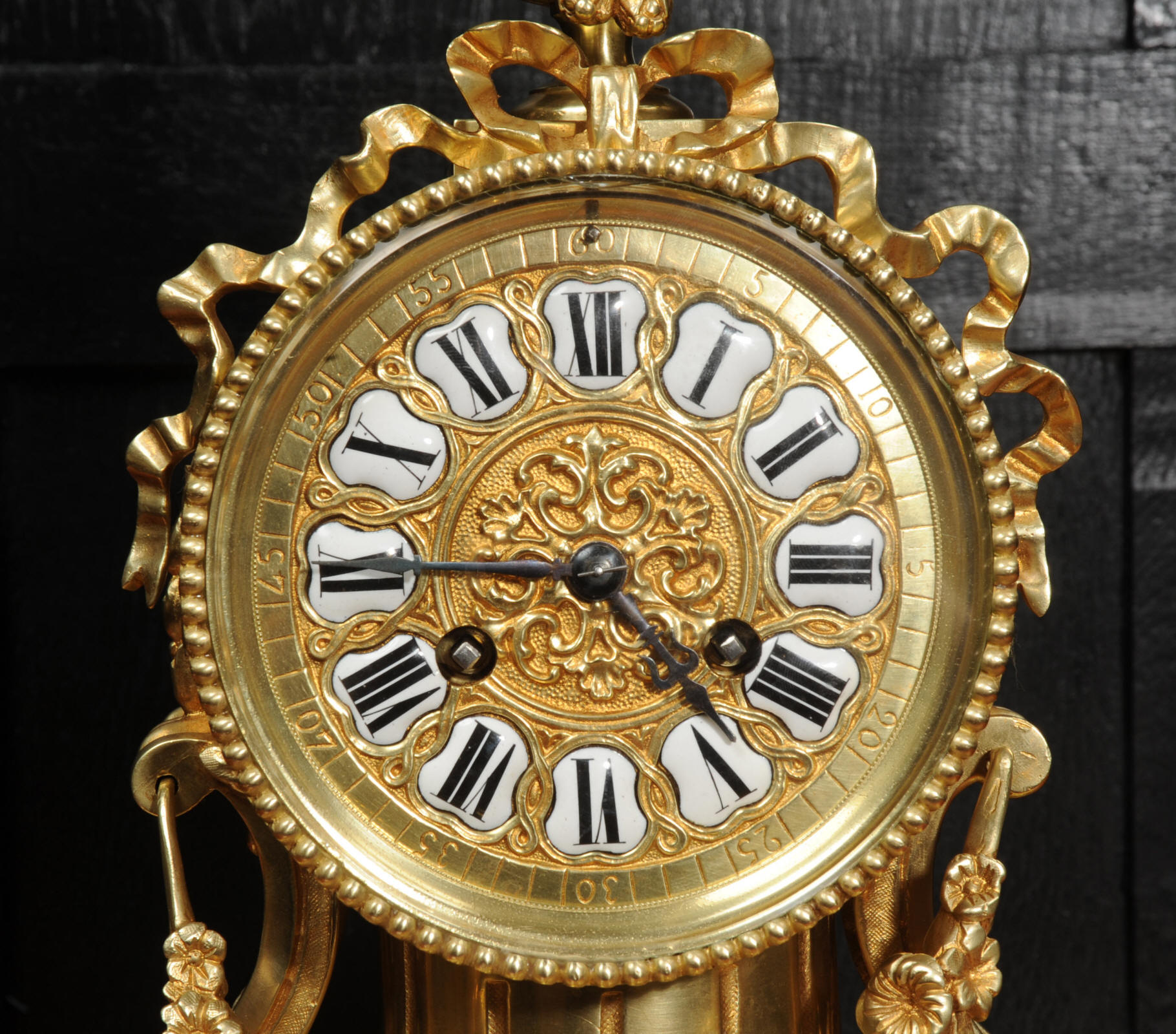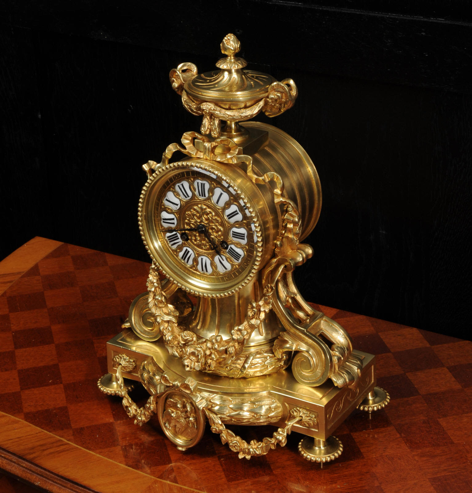 The dial is also gilt bronze with 12 individual enamel cartouches and blued steel hands. The rear door is glazed to allow the movement to be seen. The French movement is of high quality and is in excellent clean and running condition having been fully overhauled by our clockmaker. Pendulum is original. It runs for 8 days and strikes the hours and halves on a bell. Click the video below to hear the bell and watch the clock running.