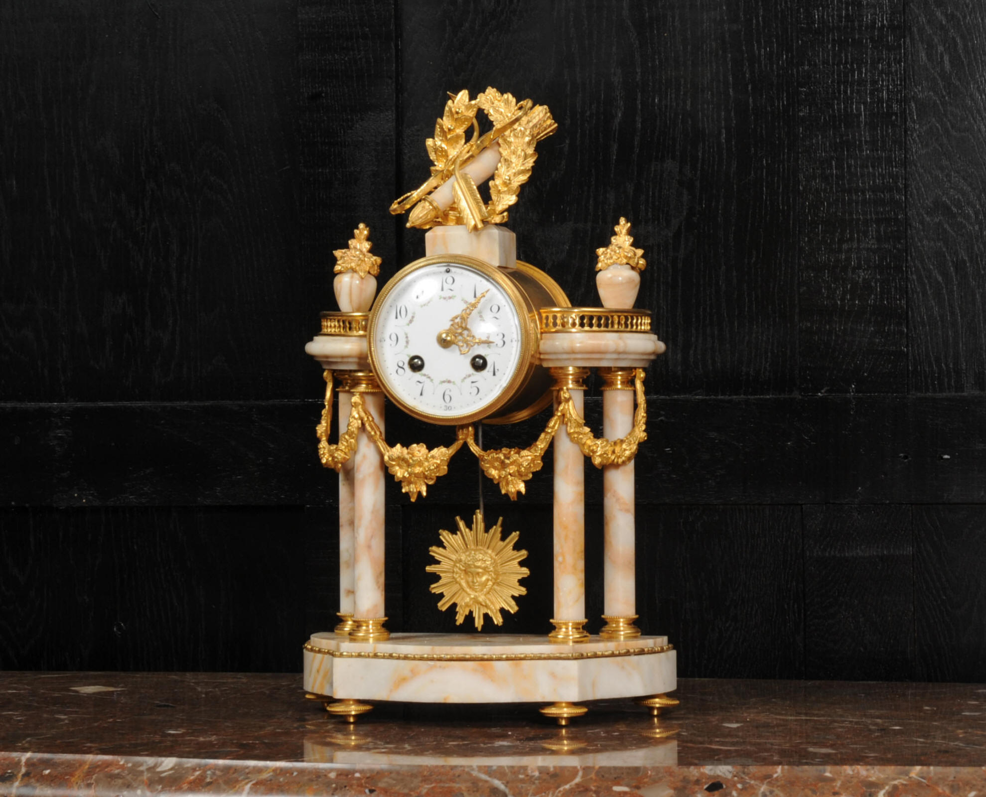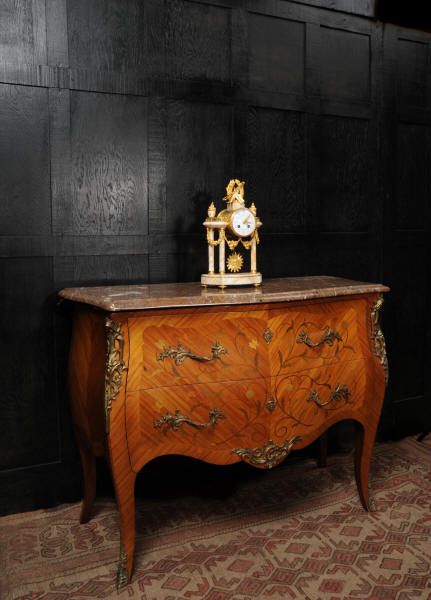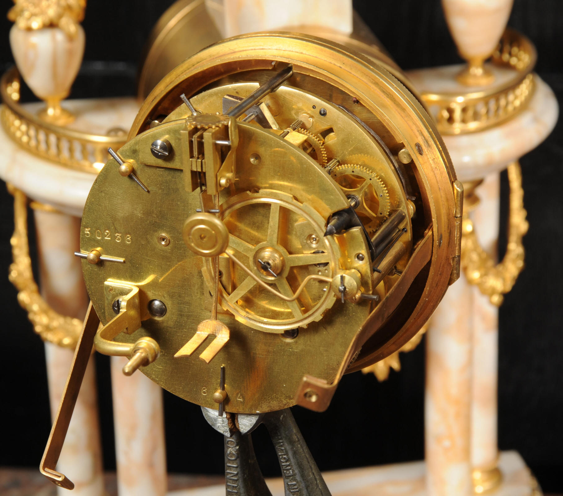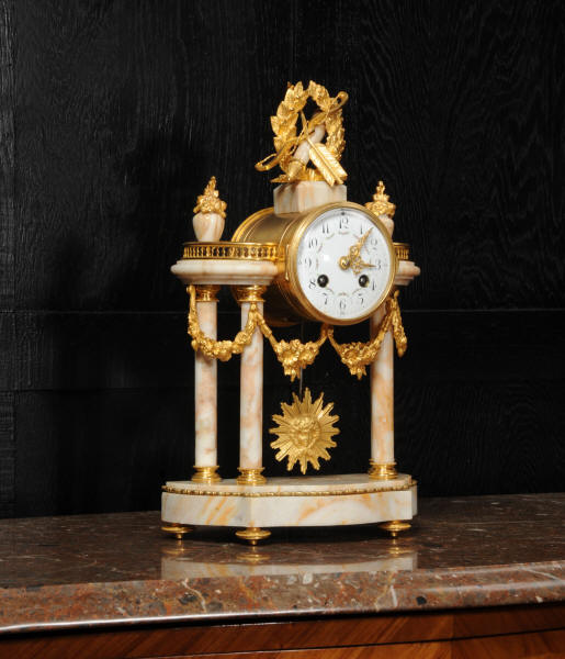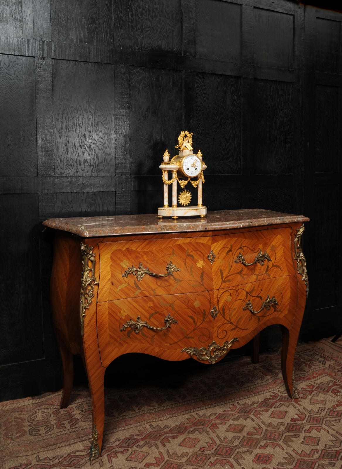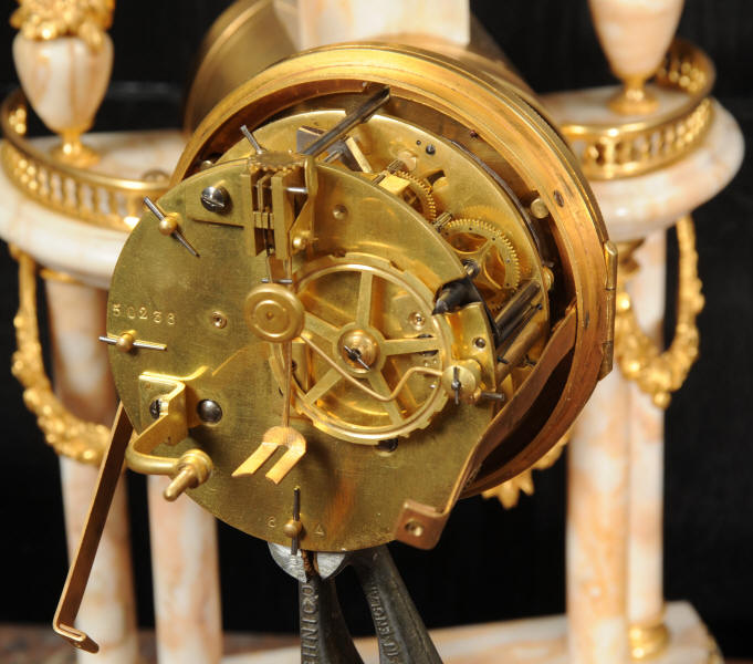 The dial is porcelain enamel on copper with delicate floral swags between the numbers and finely cut gilt brass hands. The French movement is of high quality and is in excellent clean and running condition having been fully overhauled by our clockmaker. Pendulum is original. It runs for 8 days and strikes the hours and halves on a bell. Click the video below to hear the bell and watch the clock running.
