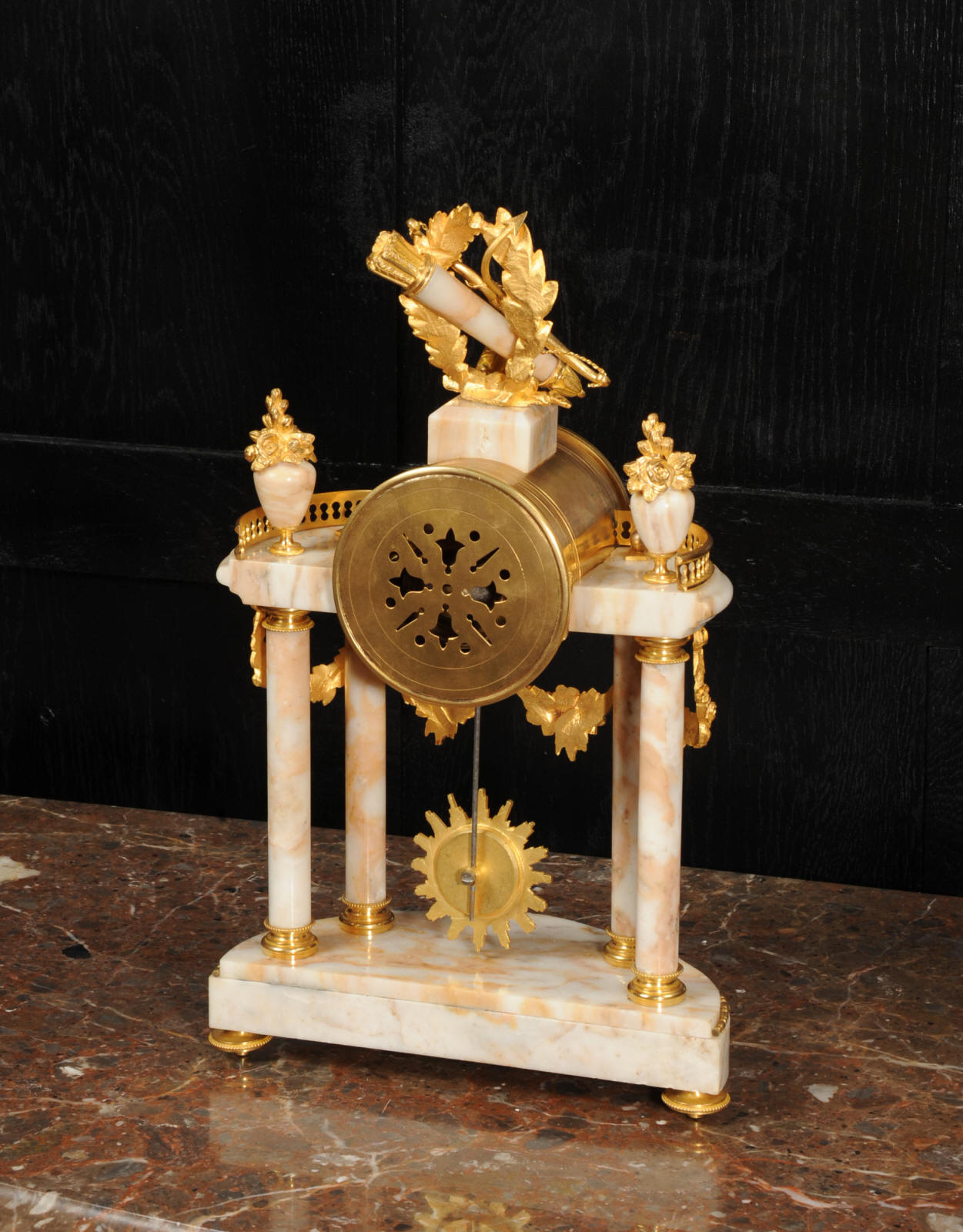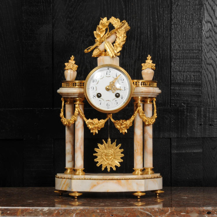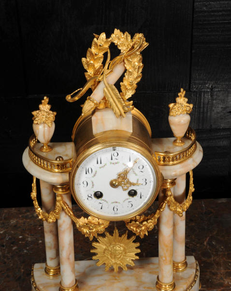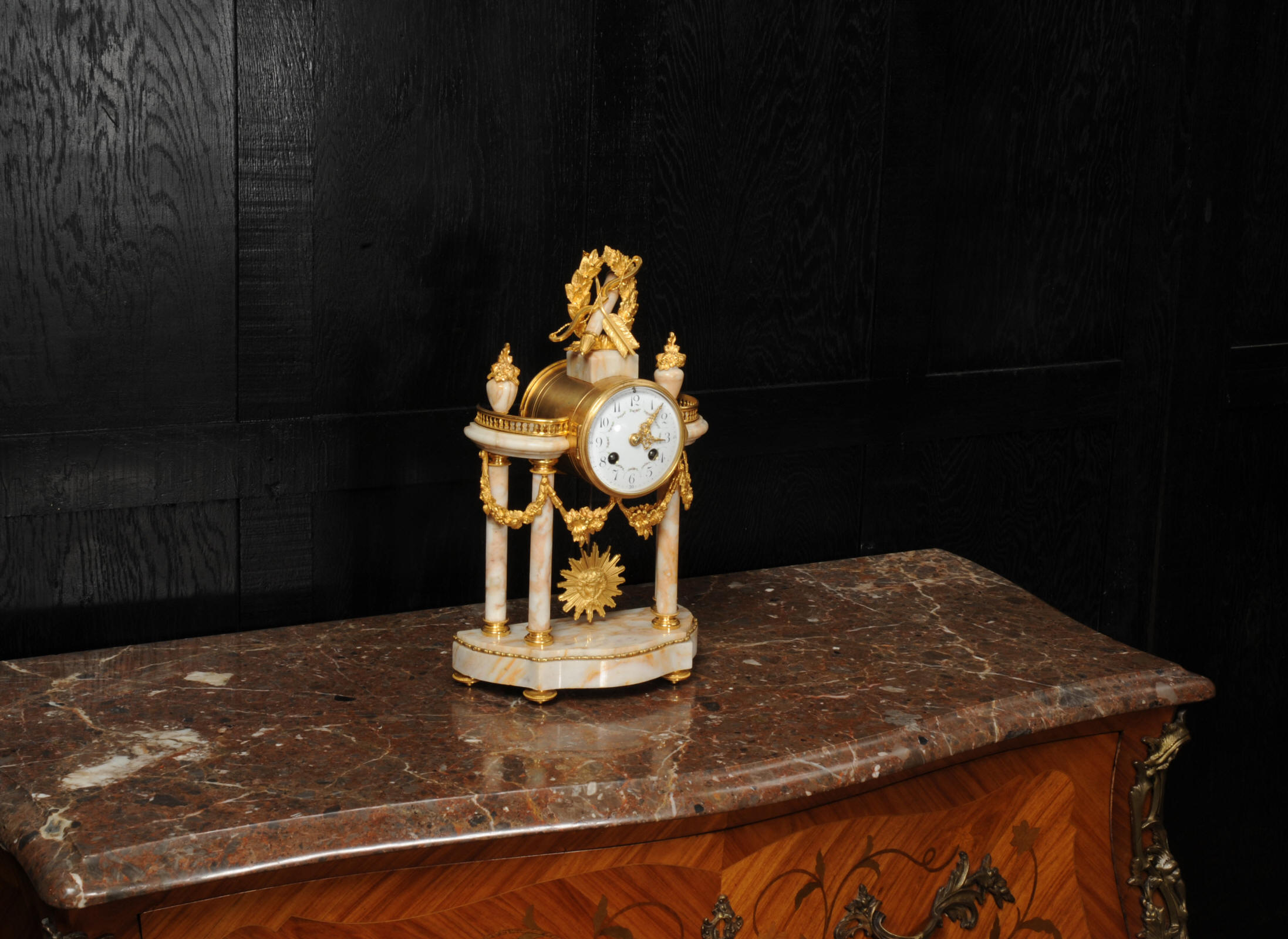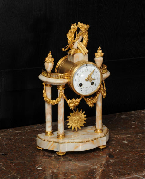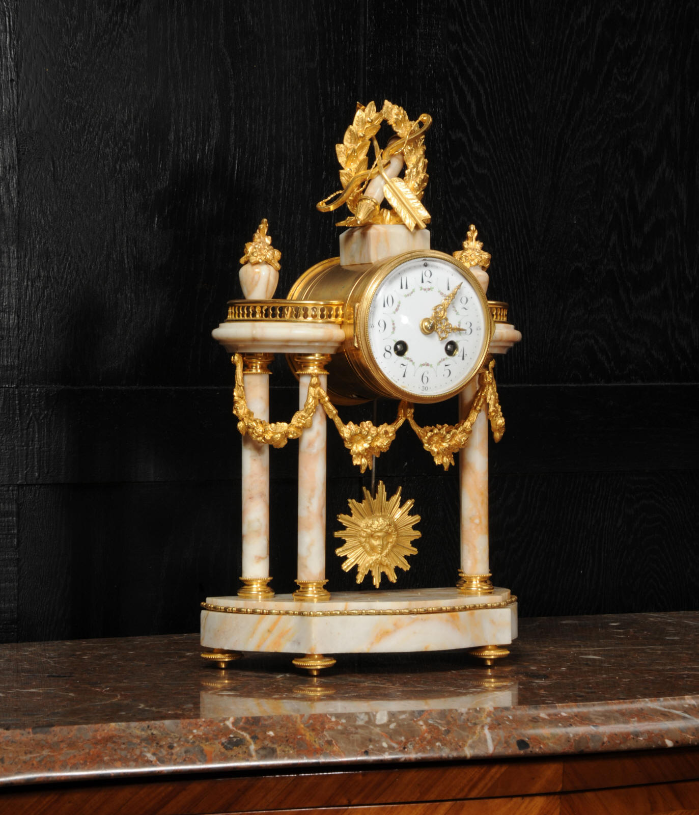 The dial is porcelain enamel on copper with delicate floral swags between the numbers and finely cut gilt brass hands. The French movement is of high quality and is in excellent clean and running condition having been fully overhauled by our clockmaker. Pendulum is original. It runs for 8 days and strikes the hours and halves on a bell. Click the video below to hear the bell and watch the clock running.