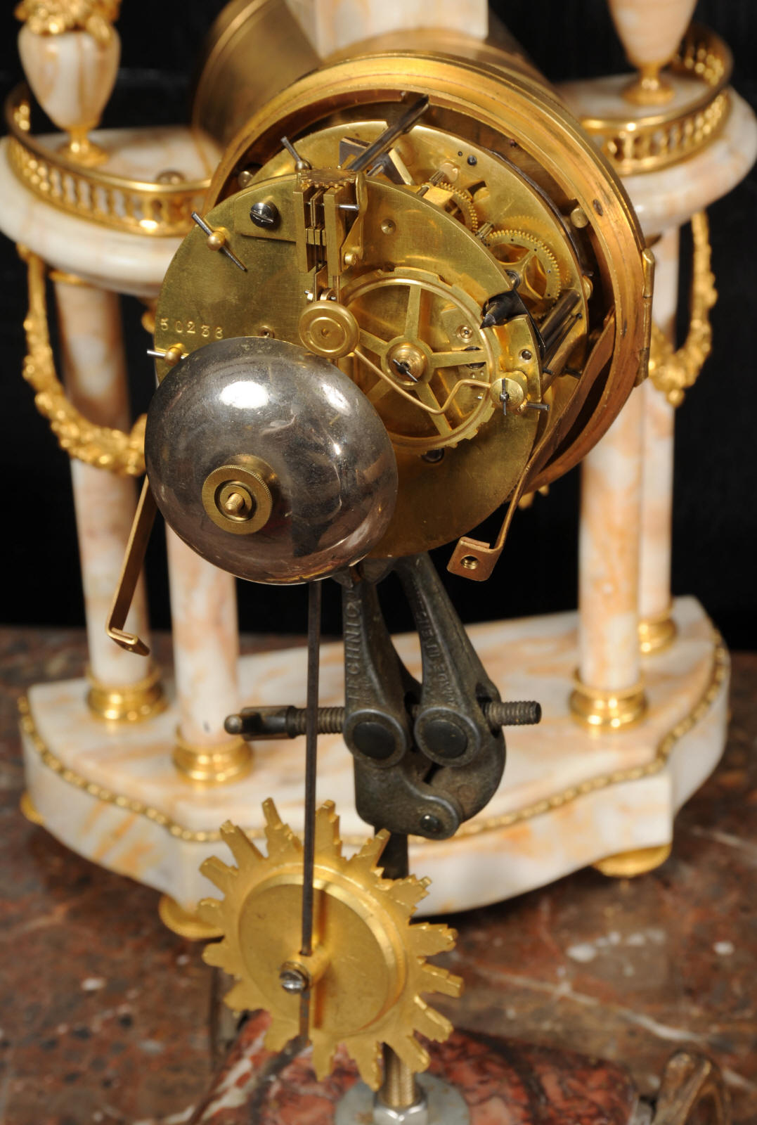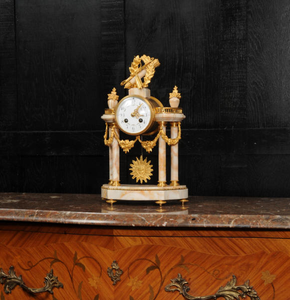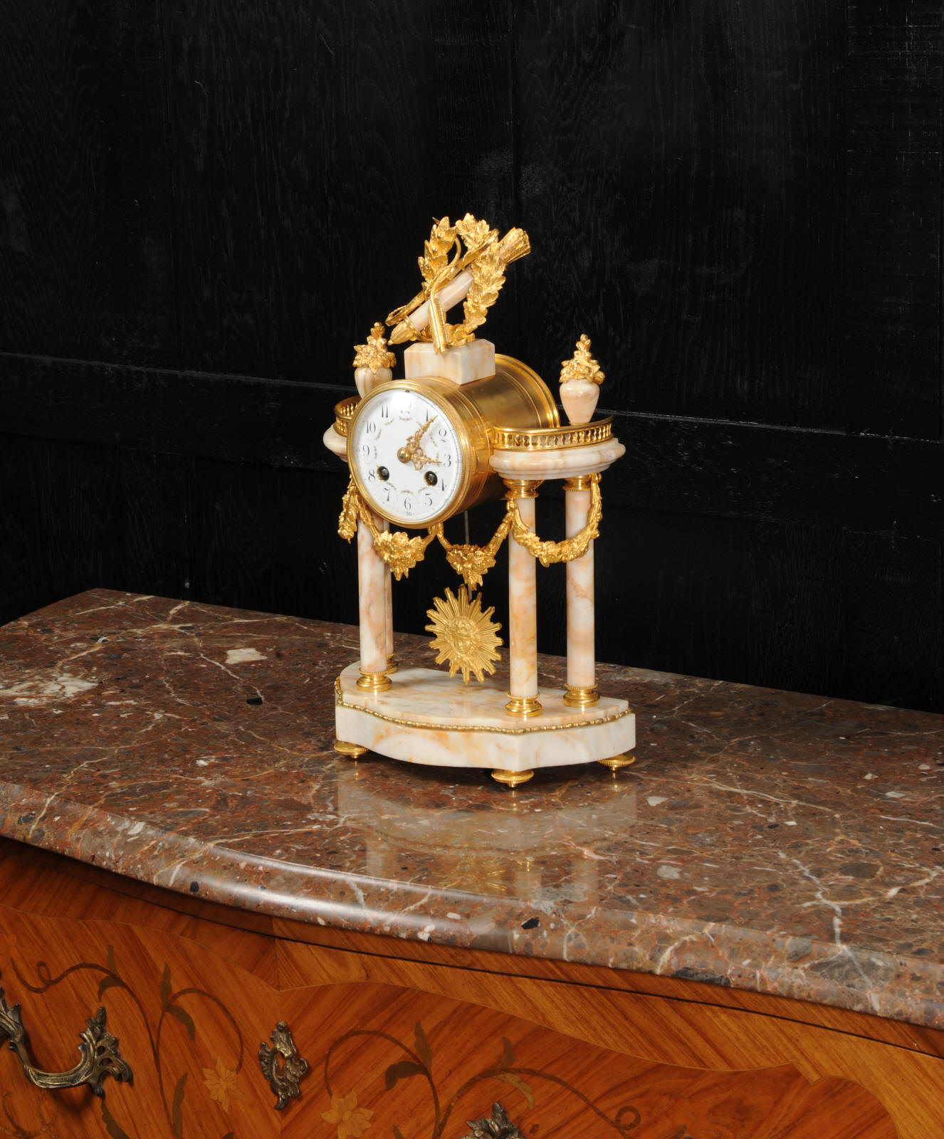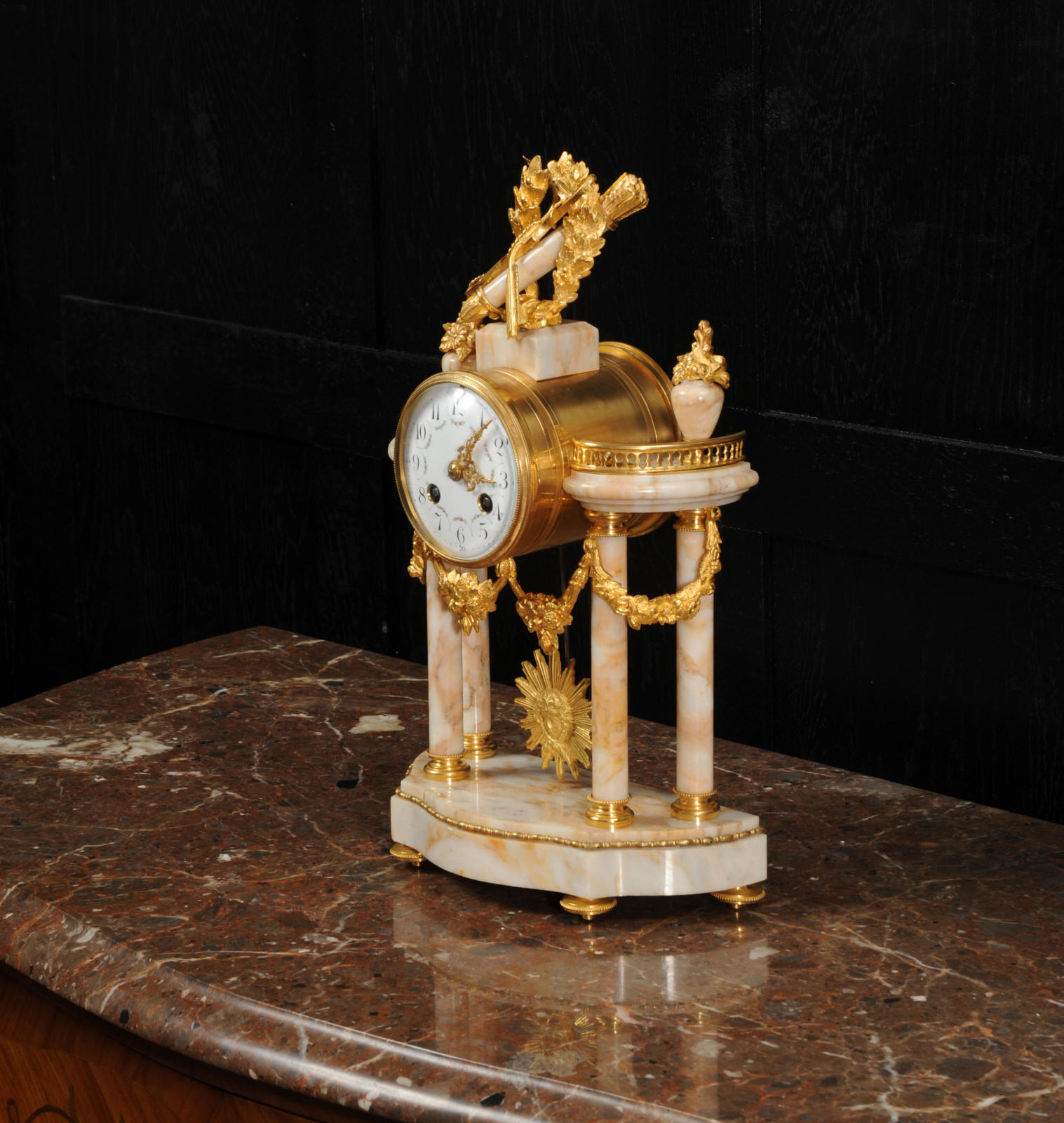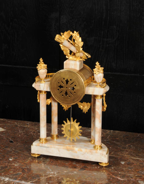 The dial is porcelain enamel on copper with delicate floral swags between the numbers and finely cut gilt brass hands. The French movement is of high quality and is in excellent clean and running condition having been fully overhauled by our clockmaker. Pendulum is original. It runs for 8 days and strikes the hours and halves on a bell. Click the video below to hear the bell and watch the clock running.