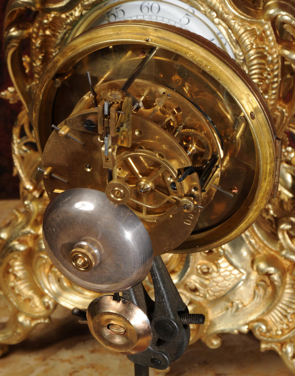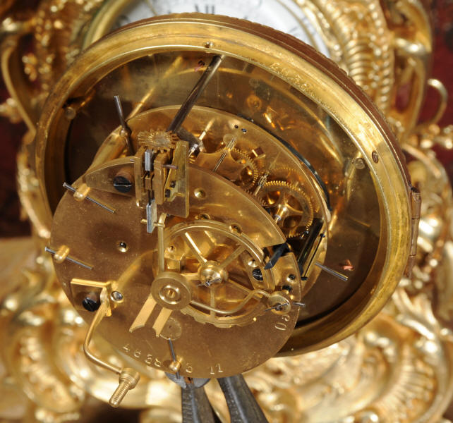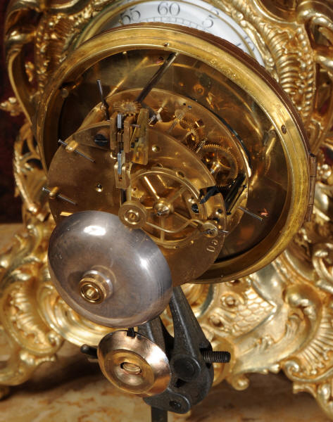 The French movement is by Vincenti et Cie and has the maker's Medaille D' Argent mark on the movement backplate. It is of high quality and is in excellent clean and running condition having been fully overhauled by our clockmaker. Pendulum is original. It runs for 8 days and strikes the hours and halves on a bell. Click the video clip below to hear the bell and watch the clock running!