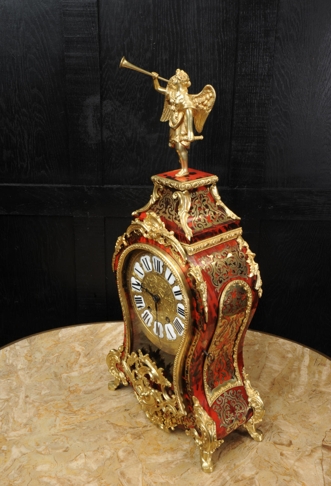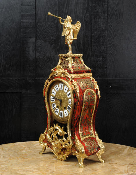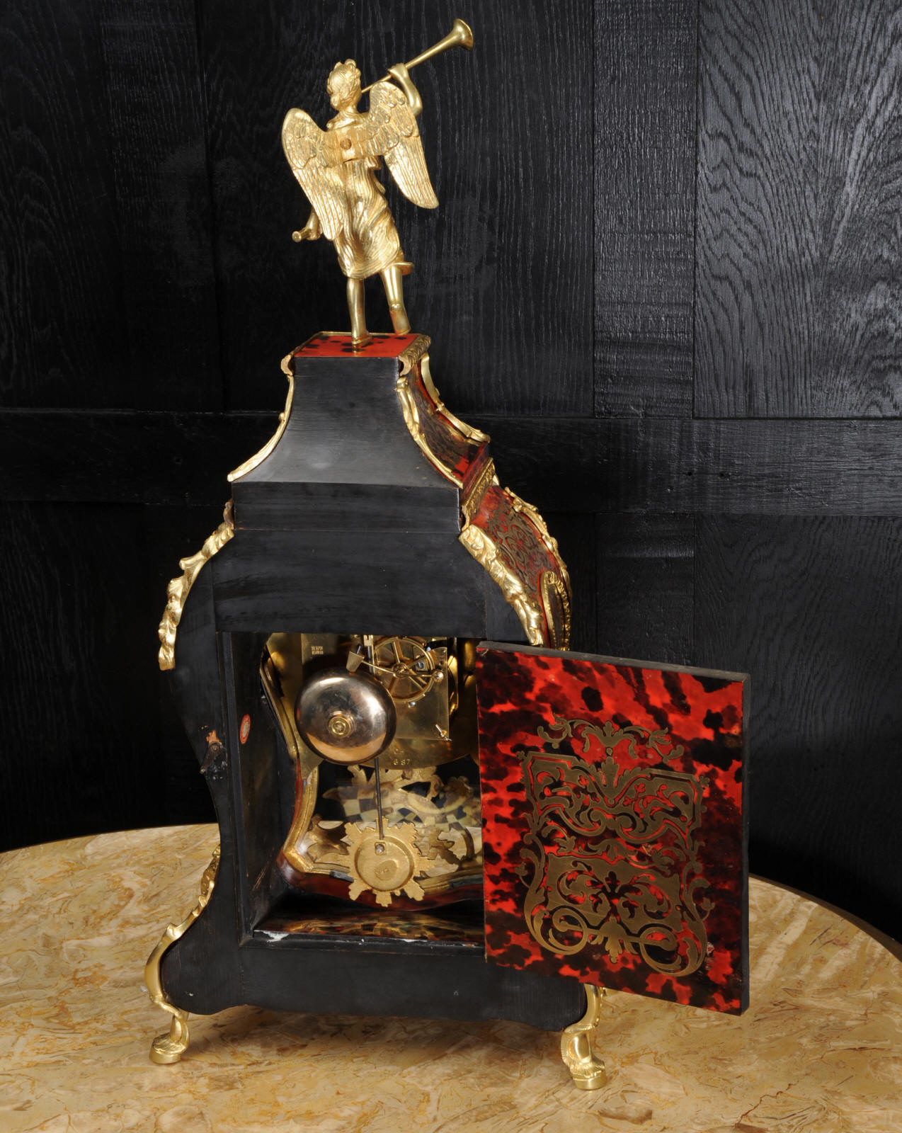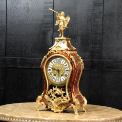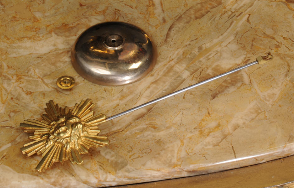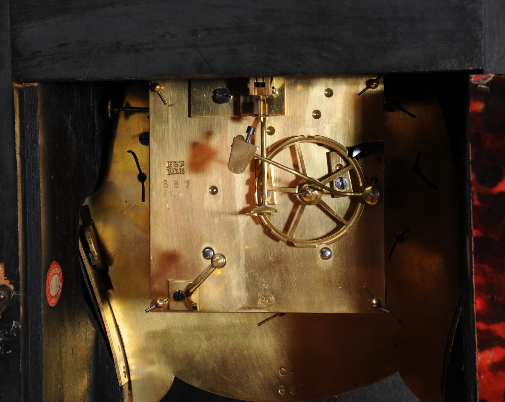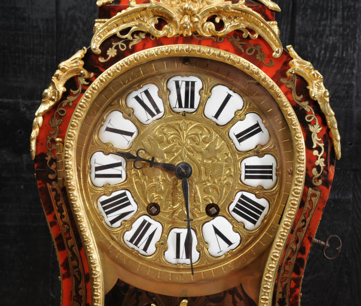 The dial is also gilt bronze with 12 individual enamel cartouches and blued steel hands. The French movement is by H & F of Paris and is of the highest quality. It is the large square plated version of the Pendule de Paris movement. It is in excellent clean and running condition having been fully overhauled by our clockmaker. The large sunburst pendulum is original and the clock is complete with original front door key. It runs for 8 days on one wind and strikes the hours and halves on a large bell. Click the video clip below to hear the bell and watch the clock running! Condition of the case is excellent, the veneer is excellent with only very minor losses. Brass inlay is also excellent, very slight losses and only some very very slight lifting in places. Ormolu is also excellent, clean and bright. Dial is also excellent with just some very slight nibbles to the cartouches. The front door lock is fully working with original key.