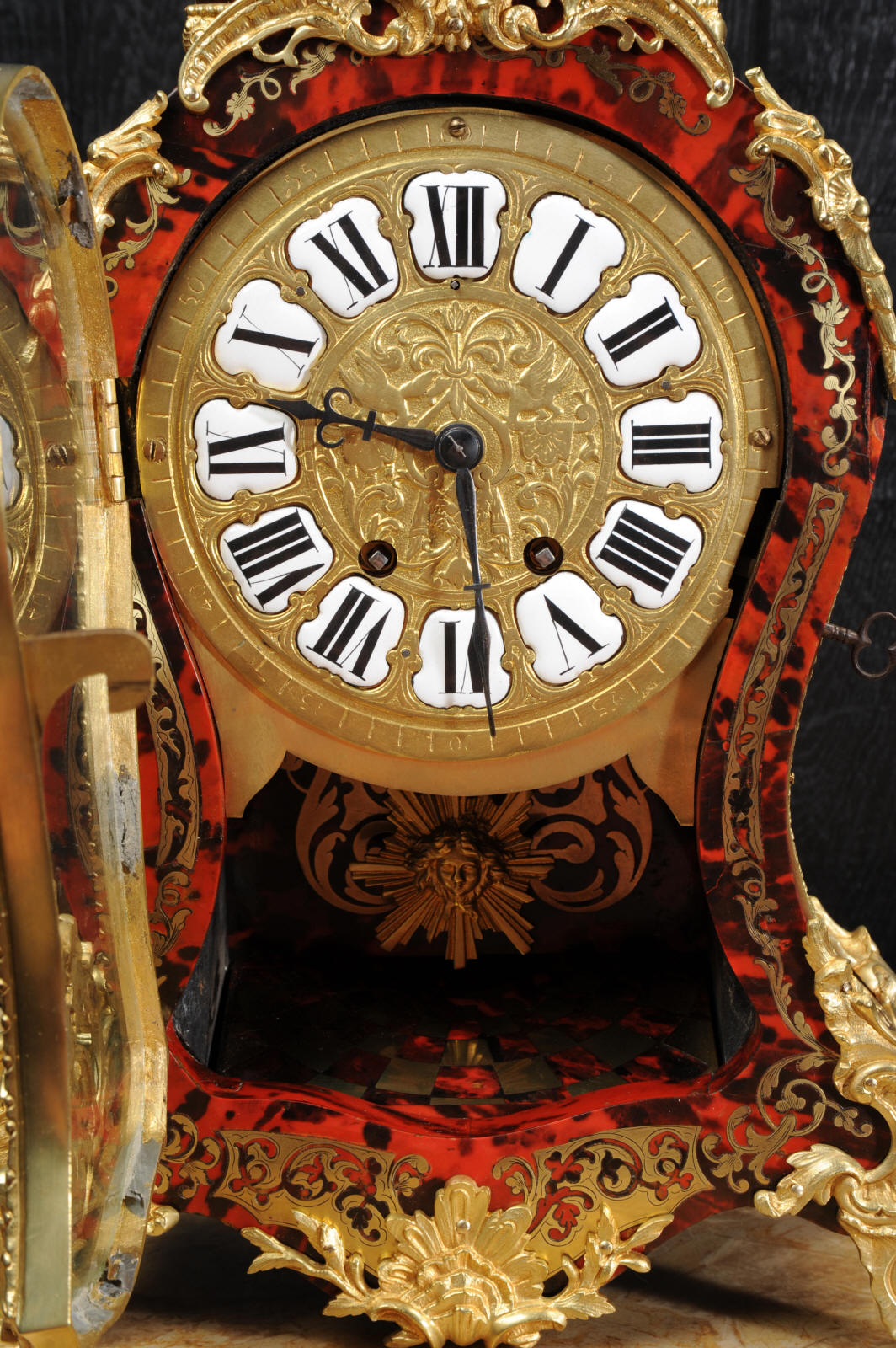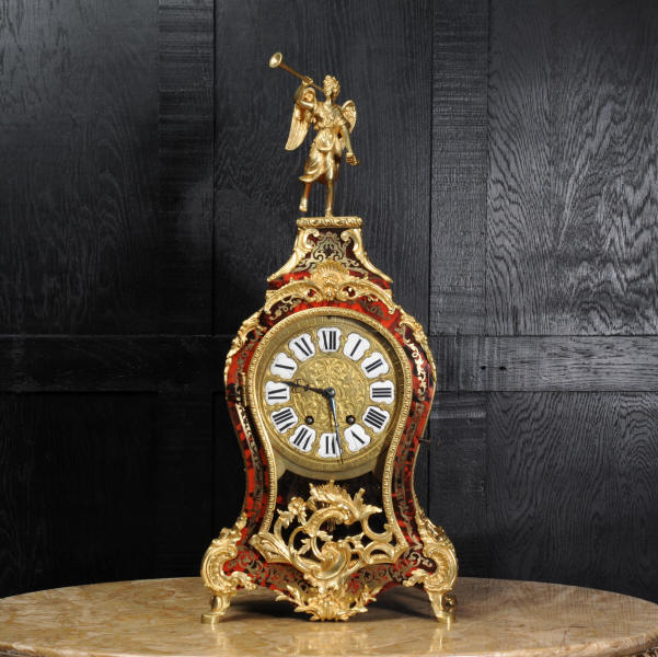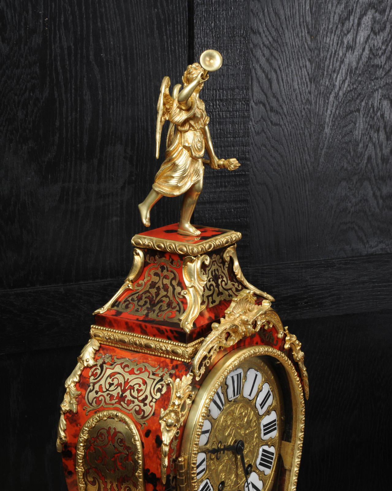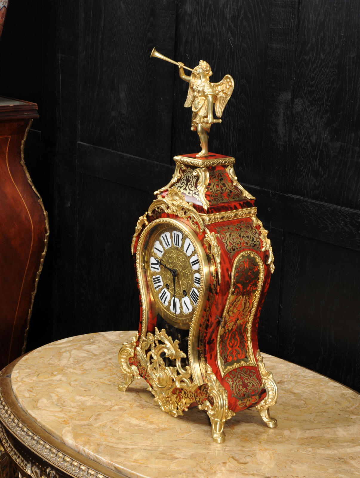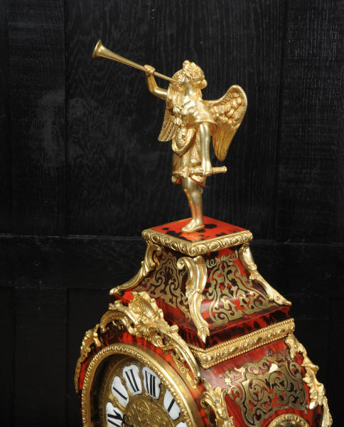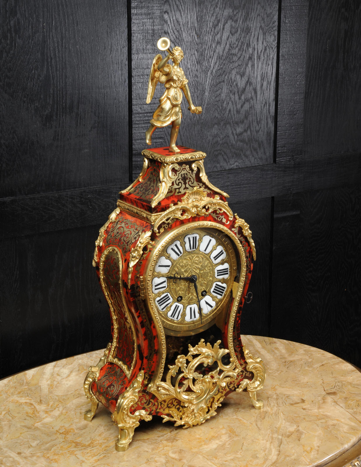 The dial is also gilt bronze with 12 individual enamel cartouches and blued steel hands. The French movement is by H & F of Paris and is of the highest quality. It is the large square plated version of the Pendule de Paris movement. It is in excellent clean and running condition having been fully overhauled by our clockmaker. The large sunburst pendulum is original and the clock is complete with original front door key. It runs for 8 days on one wind and strikes the hours and halves on a large bell. Click the video clip below to hear the bell and watch the clock running! Condition of the case is excellent, the veneer is excellent with only very minor losses. Brass inlay is also excellent, very slight losses and only some very very slight lifting in places. Ormolu is also excellent, clean and bright. Dial is also excellent with just some very slight nibbles to the cartouches. The front door lock is fully working with original key.