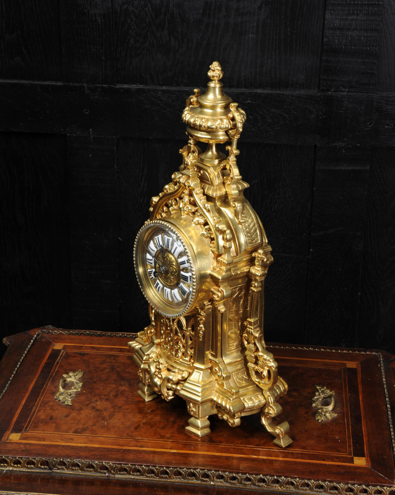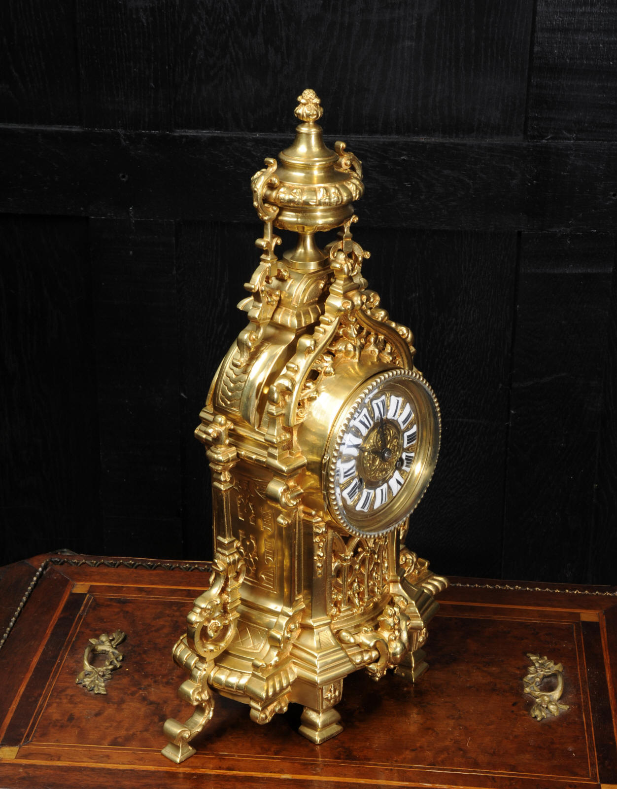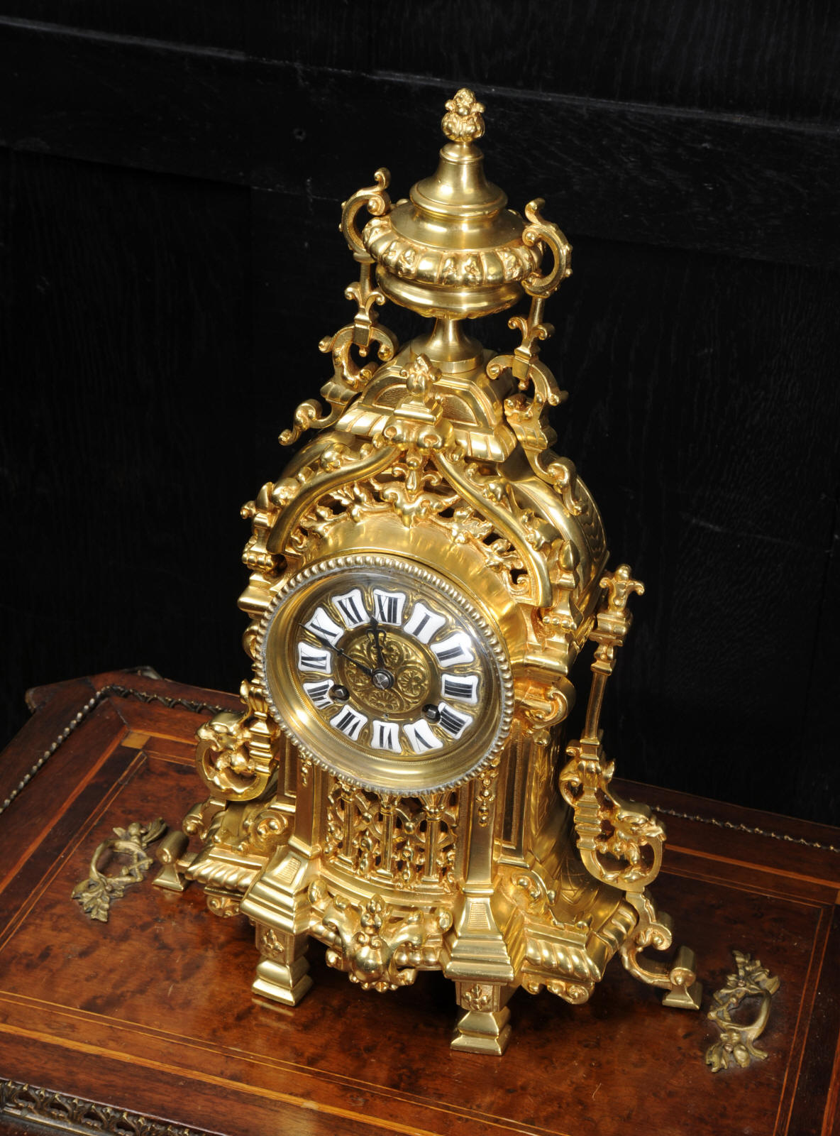 The French movement is of high quality and is by A. D. Mougin. It is in excellent clean and running condition having been fully overhauled by our clockmaker. Pendulum is a replacement. It runs for 8 days and strikes the hours and halves on a bell. Click the video clip below to hear the bell and watch the clock running. Condition of the case is excellent, clean and bright with hardly any wear or discolouration. The dial is also in excellent condition just some tiny nibbles next to the winding holes.