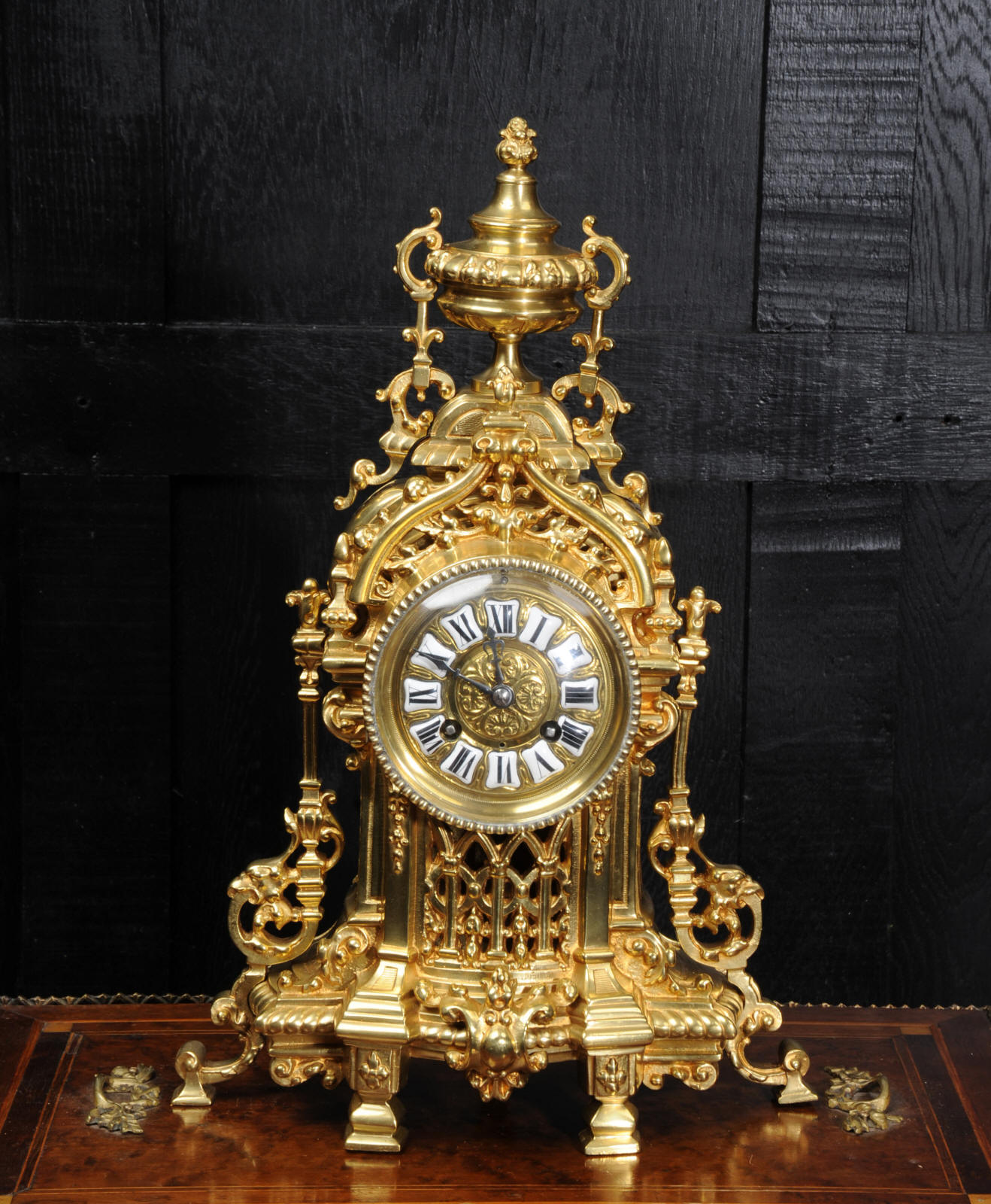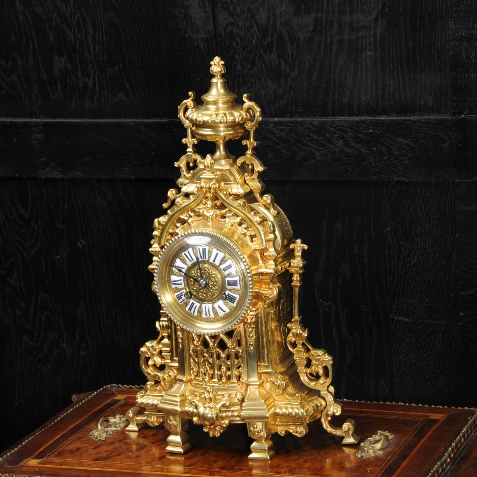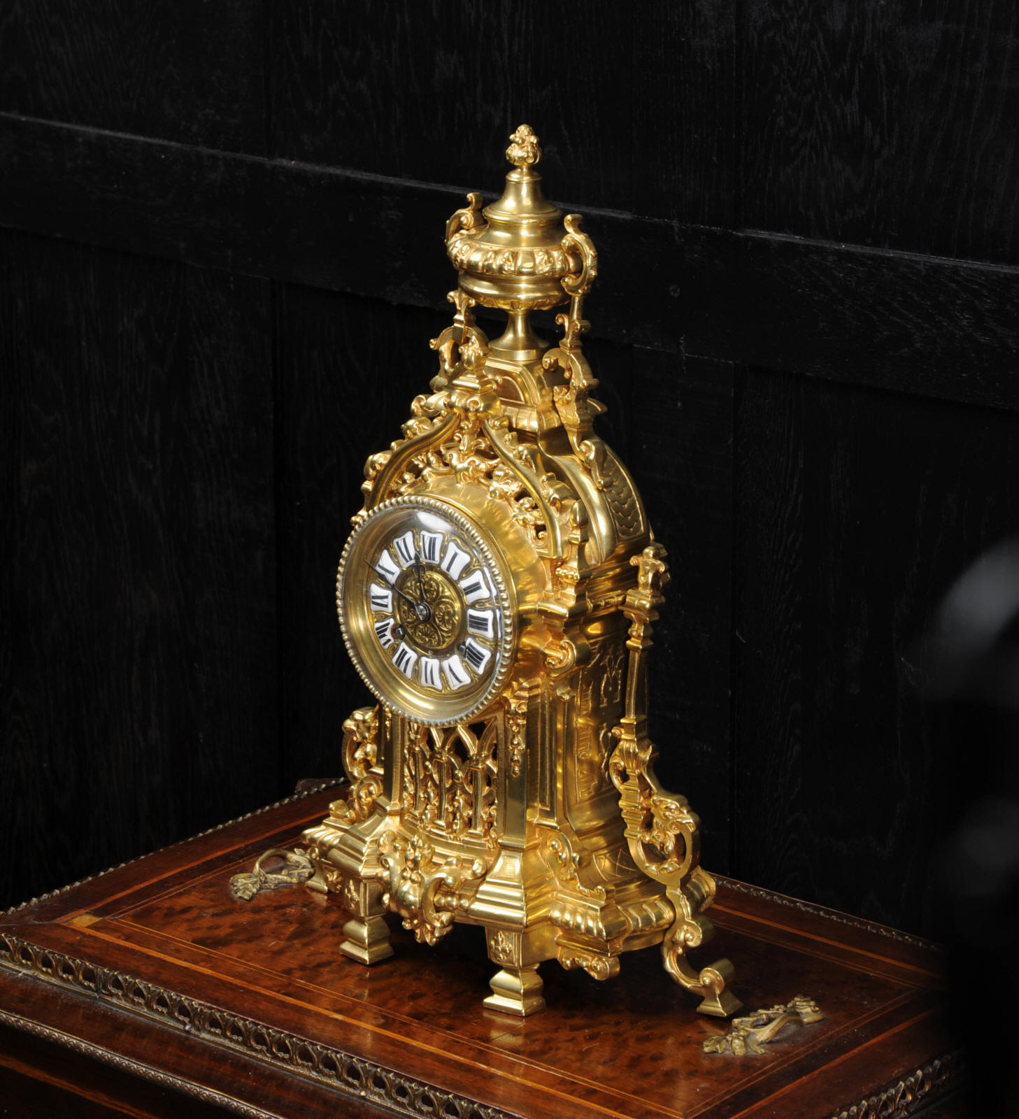 The French movement is of high quality and is by A. D. Mougin. It is in excellent clean and running condition having been fully overhauled by our clockmaker. Pendulum is a replacement. It runs for 8 days and strikes the hours and halves on a bell. Click the video clip below to hear the bell and watch the clock running. Condition of the case is excellent, clean and bright with hardly any wear or discolouration. The dial is also in excellent condition just some tiny nibbles next to the winding holes.