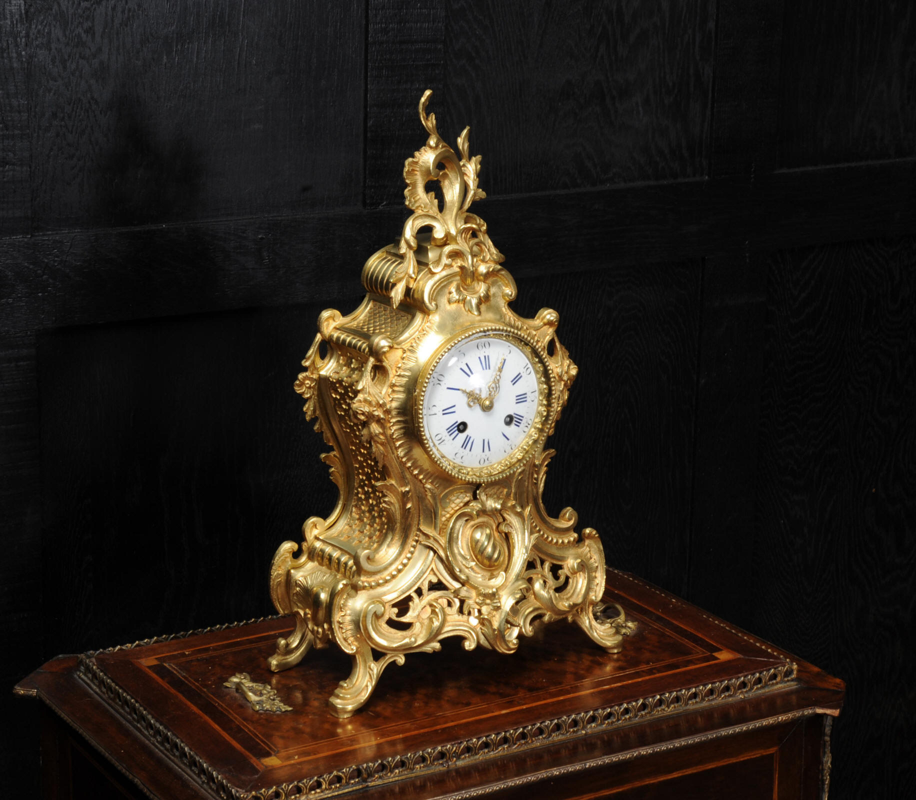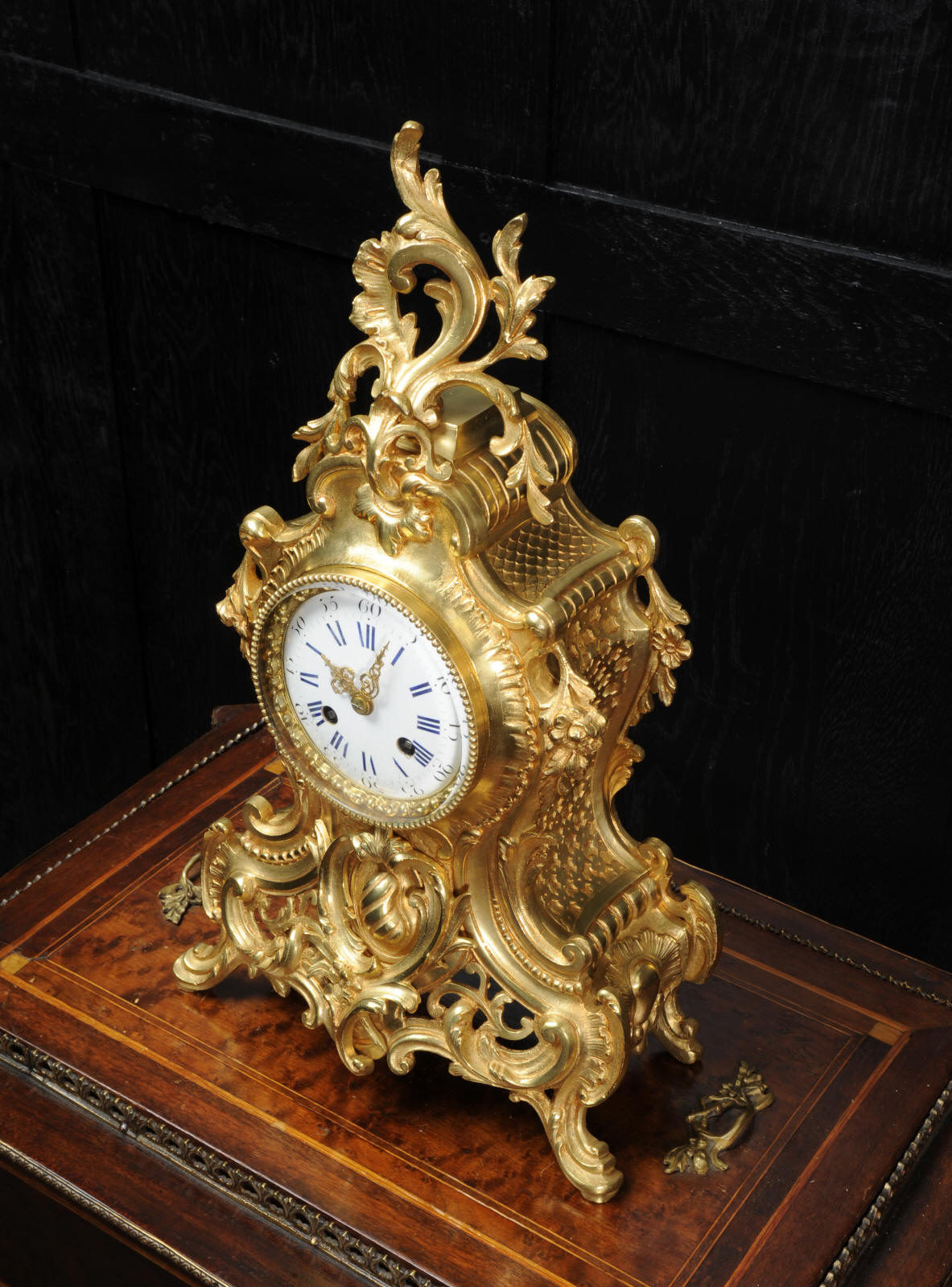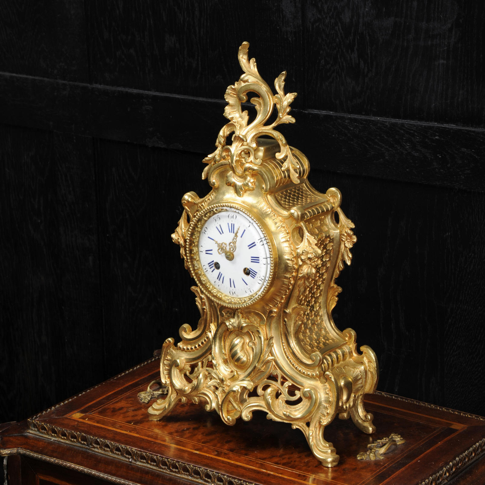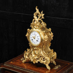 The dial is porcelain enamel on copper with blue lettering. It is complete with original finely fretted hands and convex glass. The French movement is by Japy Freres and is of high quality and is in excellent clean and running condition having been fully overhauled by our clockmaker. It is an early version of the Pendule de Paris movement with spring hammer stop and silk suspension. Pendulum is a replacement. It runs for 8 days and strikes the hours and halves on a bell. Click the video clip to hear the bell and watch the clock running! Condition of the case is excellent, the original gilding is beautifully clean and bright with hardly any wear or discolouration and there are no losses. The dial is also in excellent condition just some slight nibbles to the winding holes.