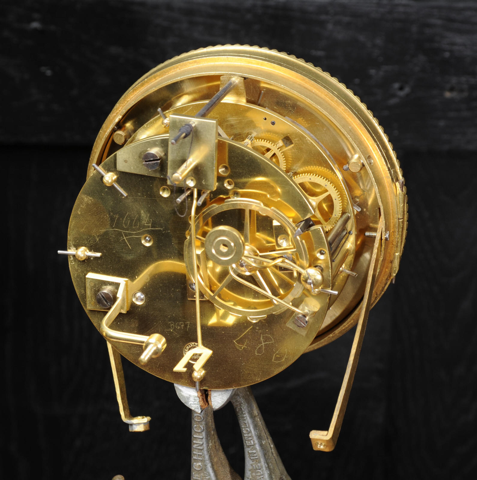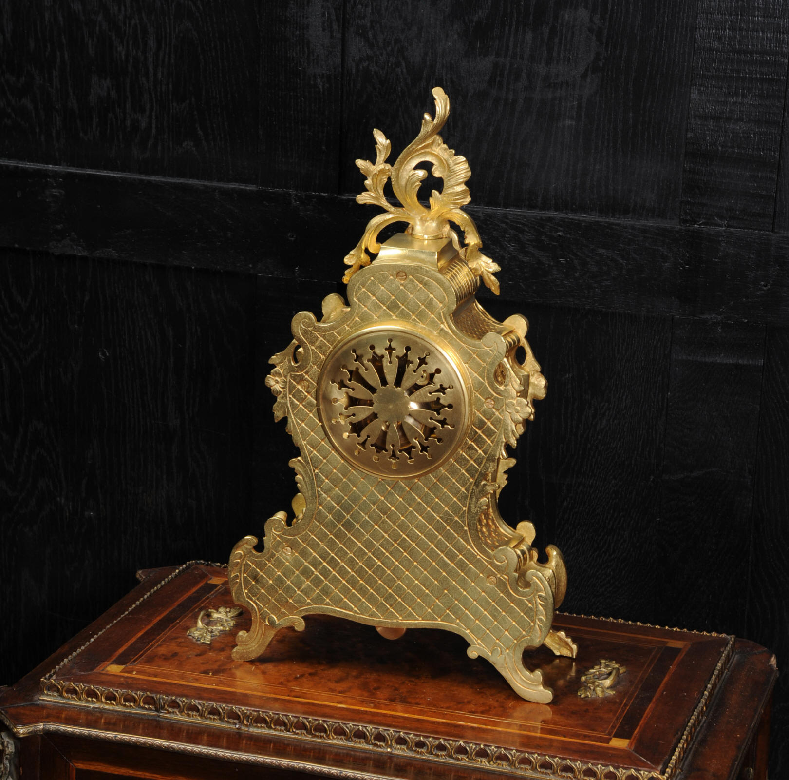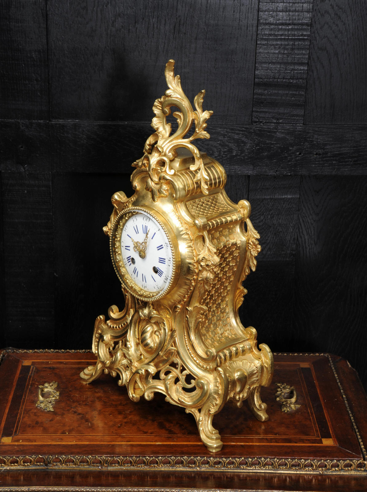 The dial is porcelain enamel on copper with blue lettering. It is complete with original finely fretted hands and convex glass. The French movement is by Japy Freres and is of high quality and is in excellent clean and running condition having been fully overhauled by our clockmaker. It is an early version of the Pendule de Paris movement with spring hammer stop and silk suspension. Pendulum is a replacement. It runs for 8 days and strikes the hours and halves on a bell. Click the video clip to hear the bell and watch the clock running! Condition of the case is excellent, the original gilding is beautifully clean and bright with hardly any wear or discolouration and there are no losses. The dial is also in excellent condition just some slight nibbles to the winding holes.