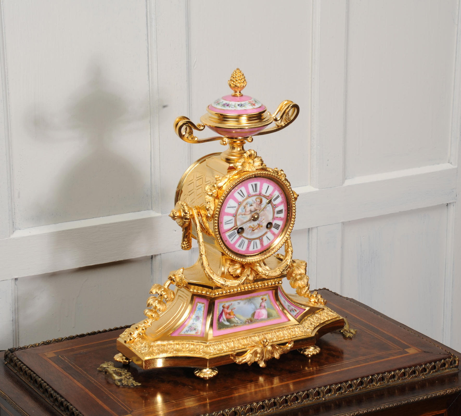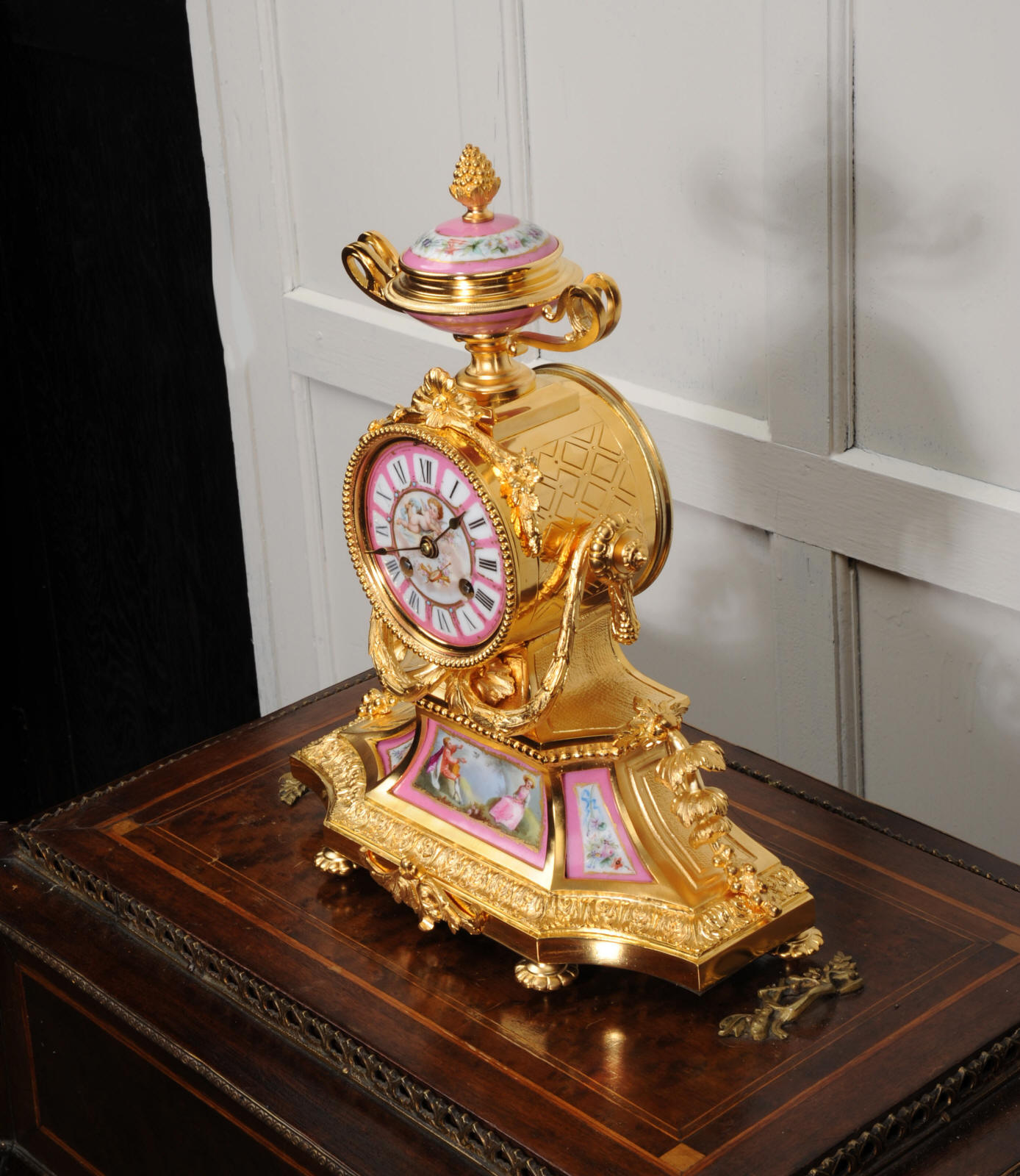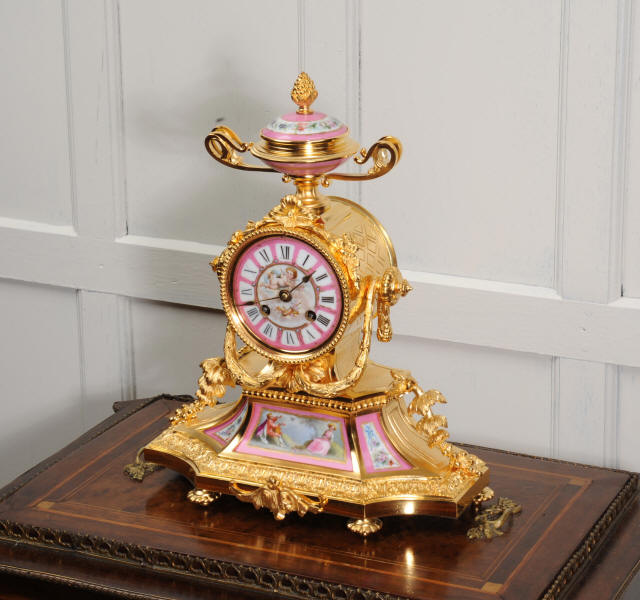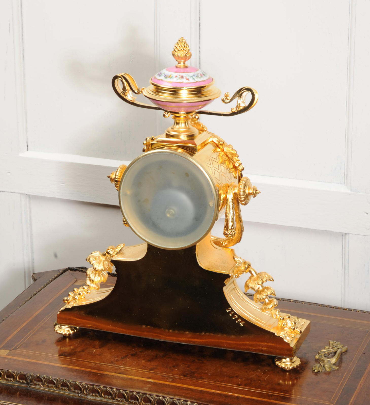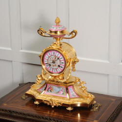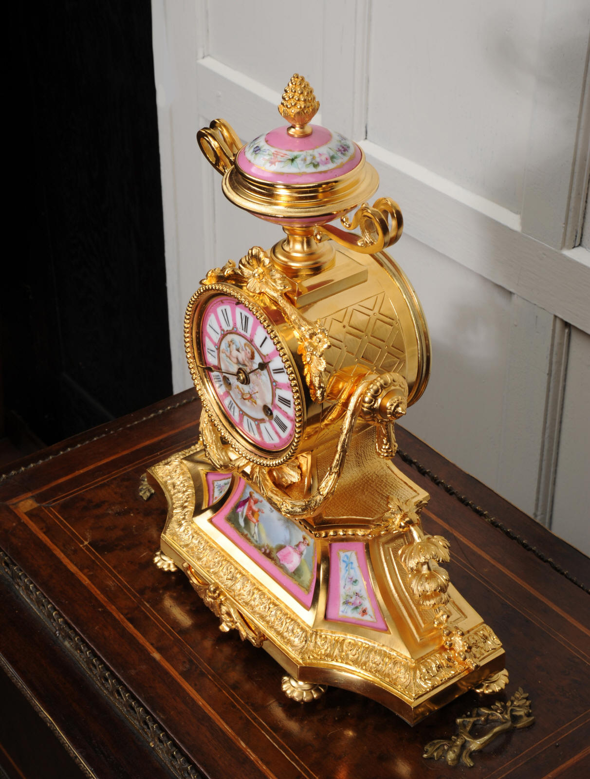 The dial is decorated with a cherub with with musical instruments. It is lettered in white cartouches against the pink background with turquoise coloured enamel 'jewel' half-hour markers. The rear door is glazed with convex frosted glass. (Please note that this style of clock does not have a glazed bezel over the dial). The French movement is by Japy Freres and has the makers mark on the backplate. It is of high quality and is in excellent clean and running condition having been fully overhauled by our clockmaker. Pendulum is original. The movement is fitted with the superior rack striking system. It runs for 8 days and strikes the hours and halves on a bell. Click the video clip below to hear the bell and watch the clock running! Condition of the case is excellent, the gilding is beautifully clean and bright. The dial is in good condition, some of the turquoise 'jewels' are missing and there is some chipping around the winding holes. The over-glaze gilt decoration has some wear. The porcelain is very good with no damage, there is some wear to the over-glaze gilt decoration.