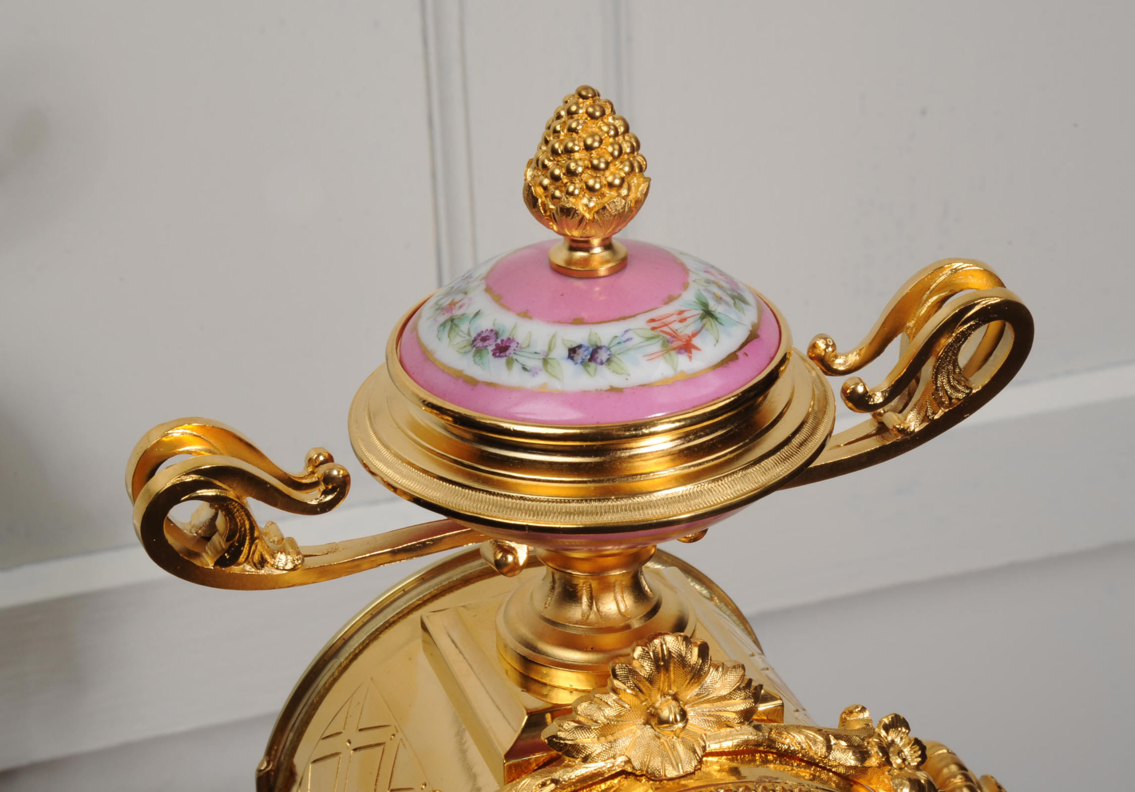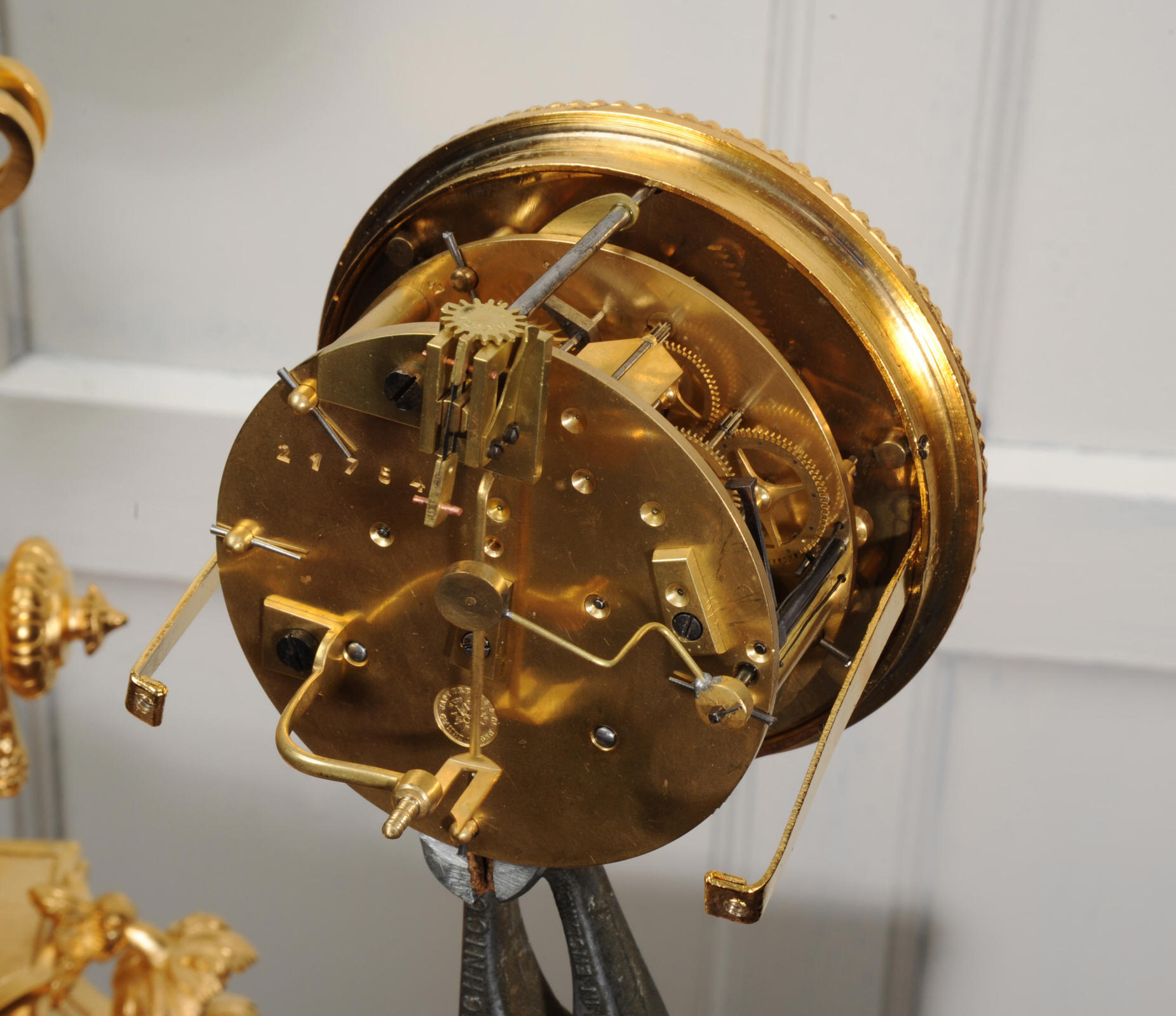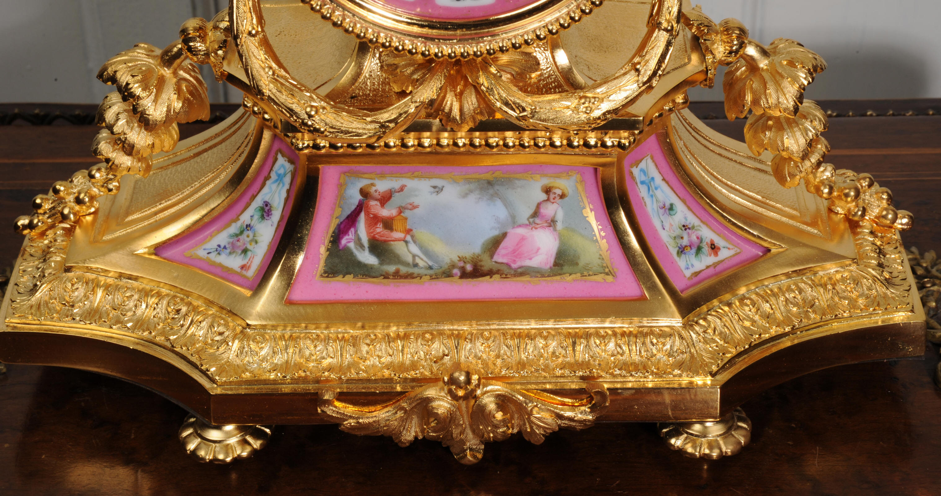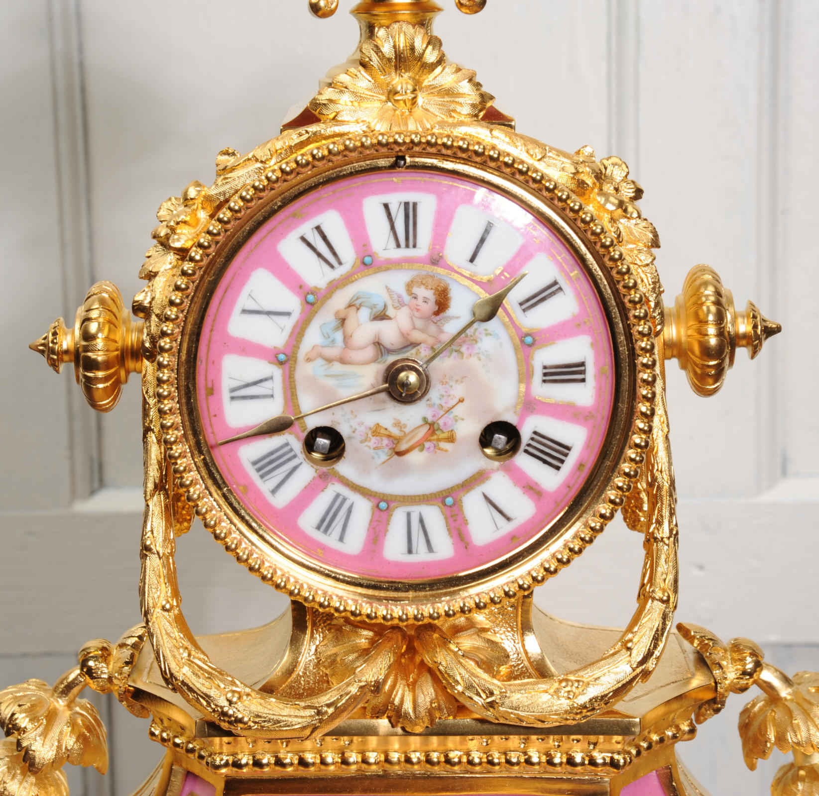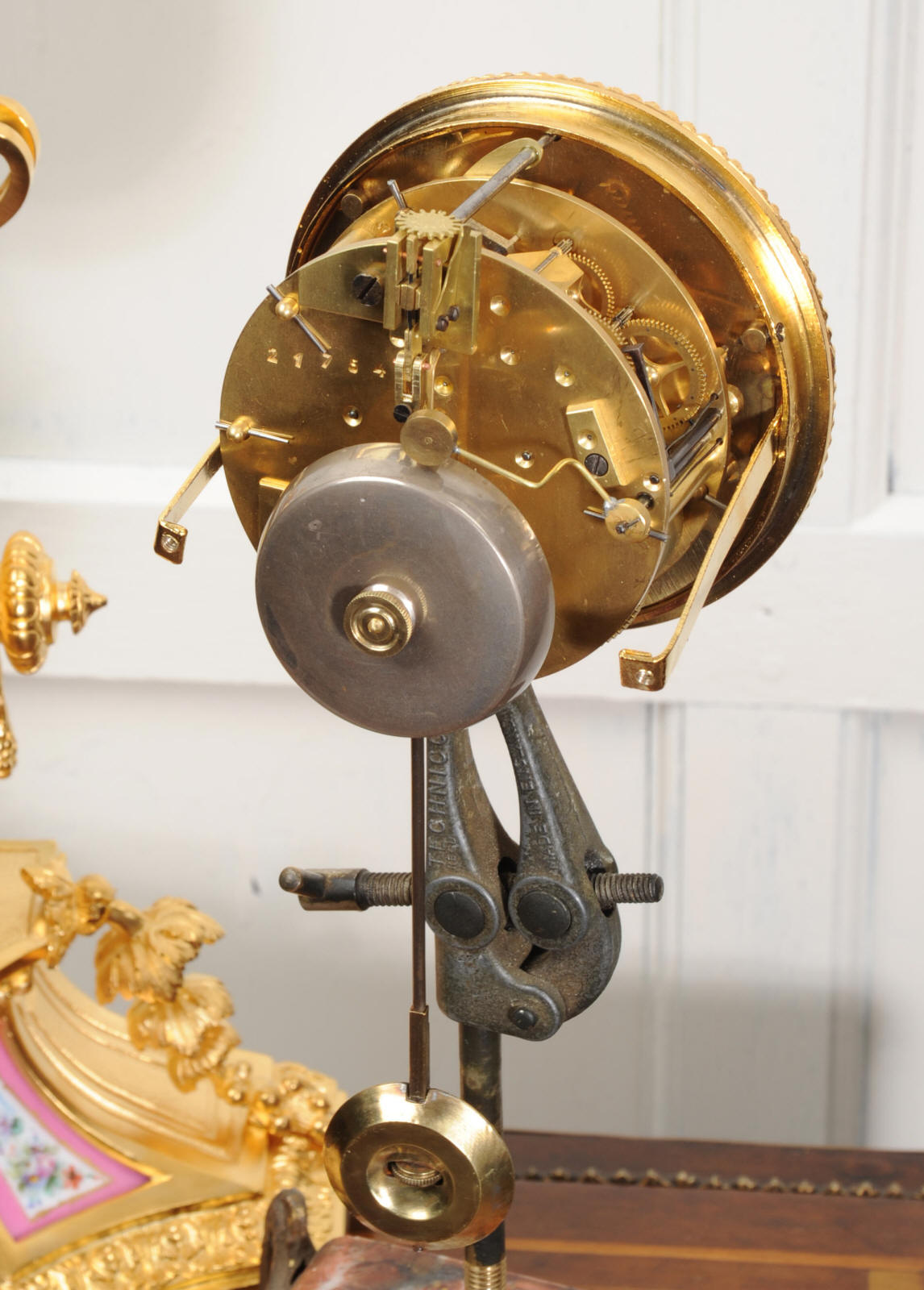 The dial is decorated with a cherub with with musical instruments. It is lettered in white cartouches against the pink background with turquoise coloured enamel 'jewel' half-hour markers. The rear door is glazed with convex frosted glass. (Please note that this style of clock does not have a glazed bezel over the dial). The French movement is by Japy Freres and has the makers mark on the backplate. It is of high quality and is in excellent clean and running condition having been fully overhauled by our clockmaker. Pendulum is original. The movement is fitted with the superior rack striking system. It runs for 8 days and strikes the hours and halves on a bell. Click the video clip below to hear the bell and watch the clock running! Condition of the case is excellent, the gilding is beautifully clean and bright. The dial is in good condition, some of the turquoise 'jewels' are missing and there is some chipping around the winding holes. The over-glaze gilt decoration has some wear. The porcelain is very good with no damage, there is some wear to the over-glaze gilt decoration.