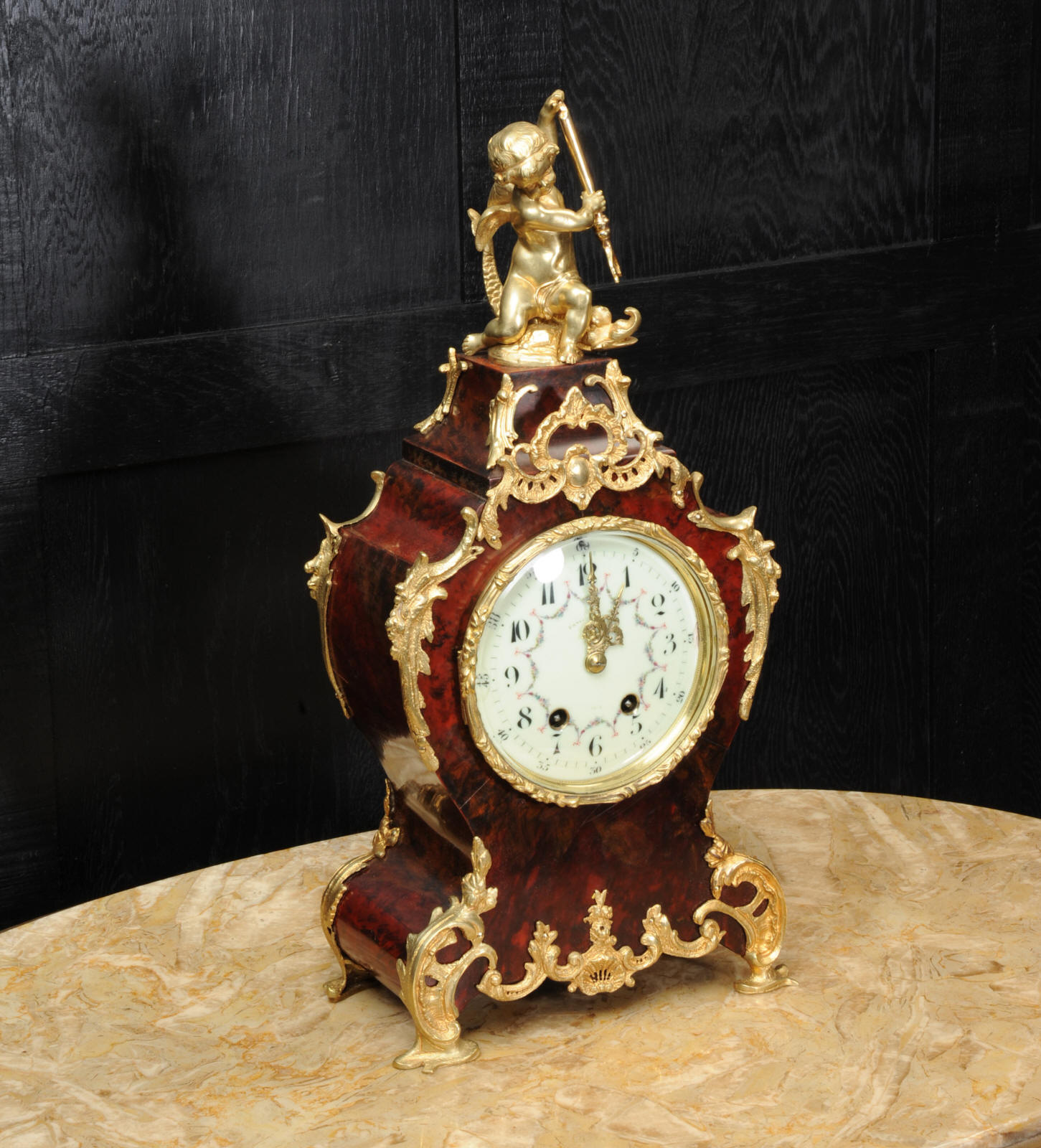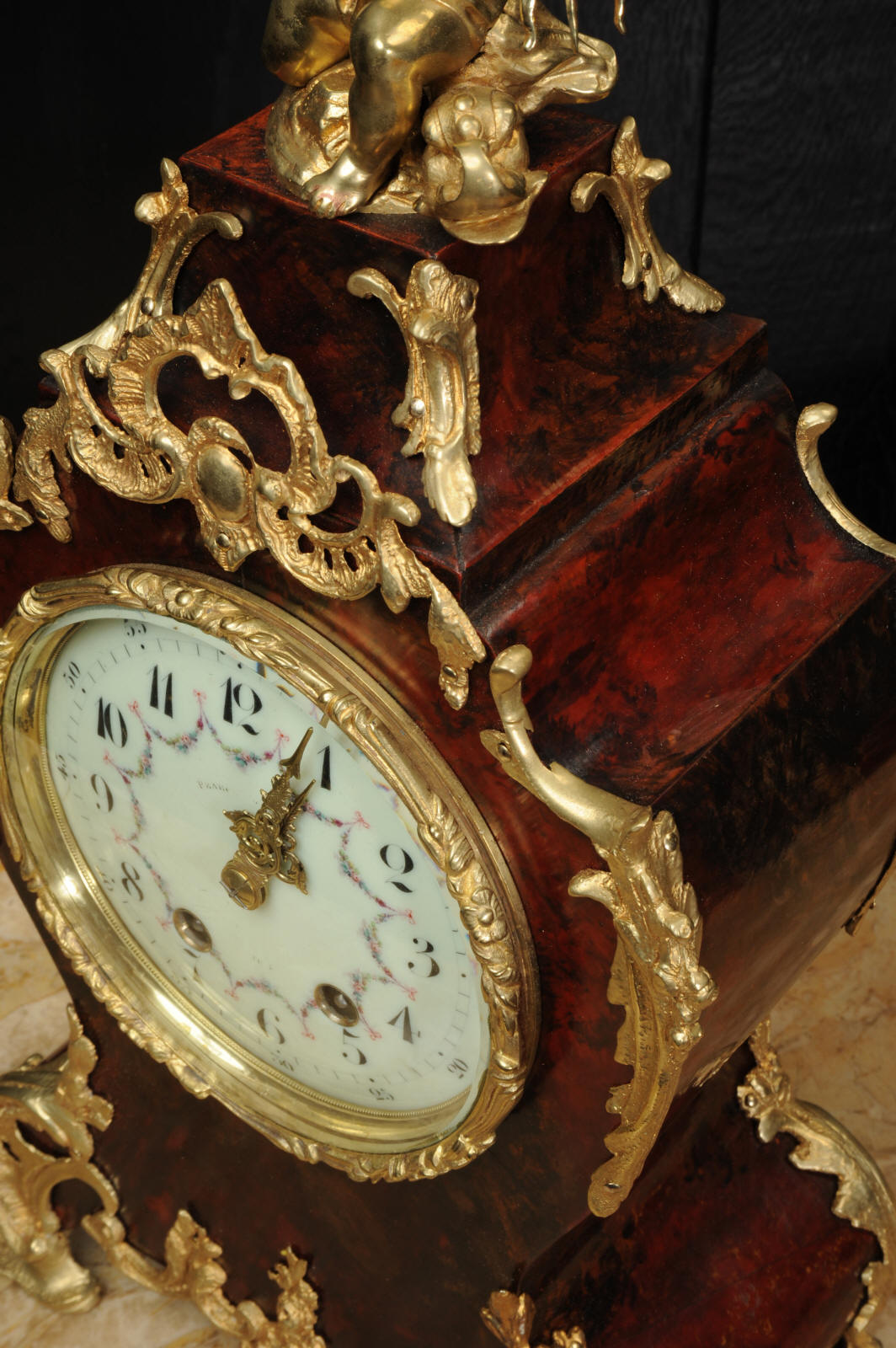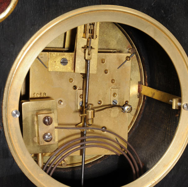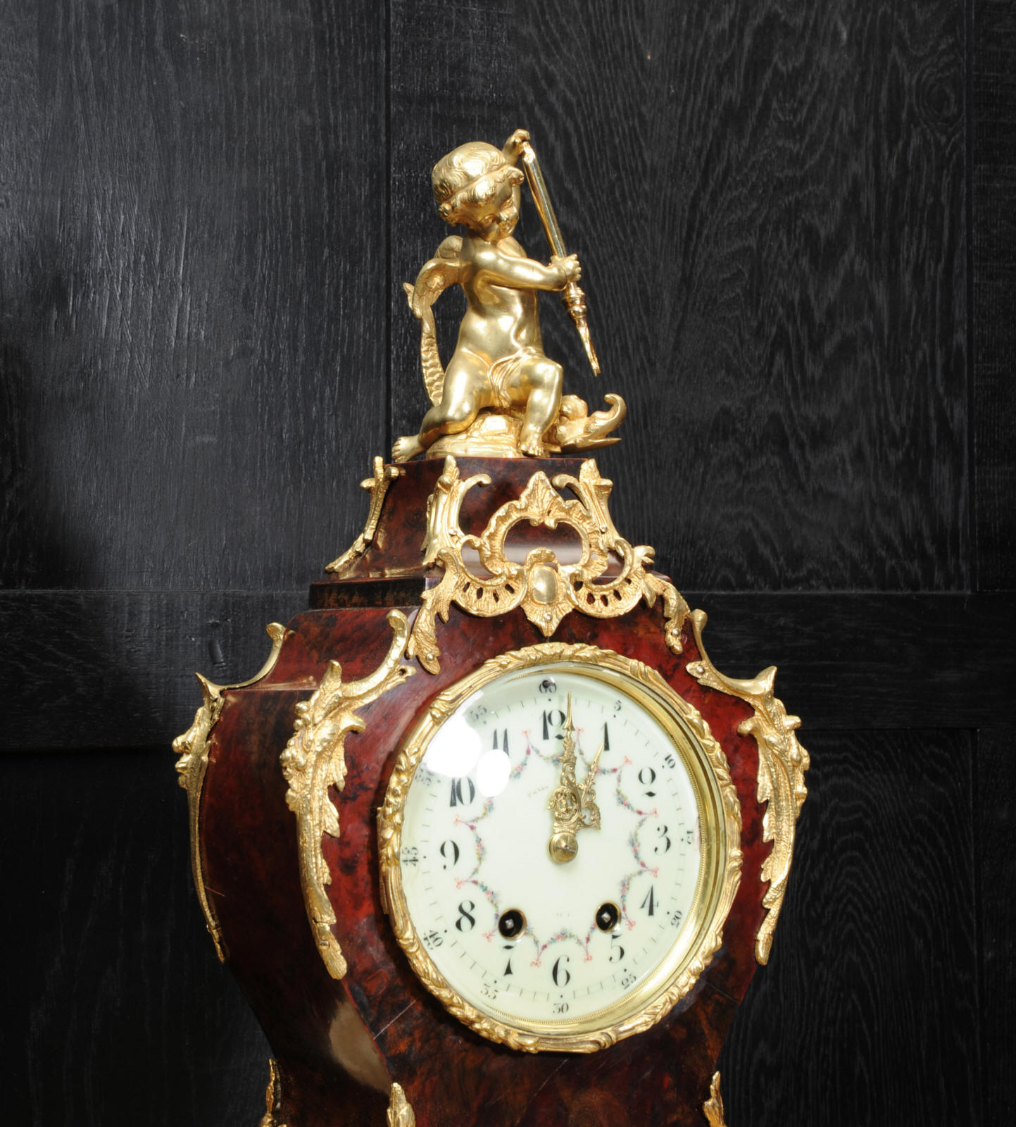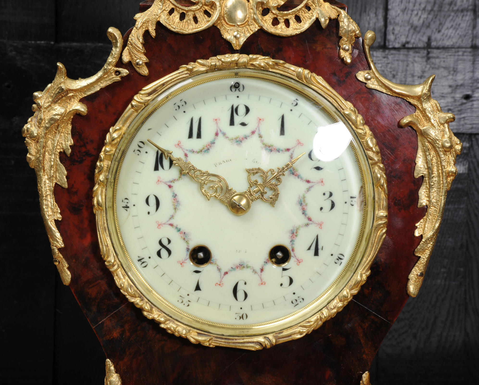 The large and superb dial is porcelain enamel on copper, delicately painted with floral swags between the hours. It is complete with original finely fretted gilt hands. The dial is faintly signed for the retailer Peace and Sons, Paris. The French movement is of high quality and is in excellent clean and running condition having been fully overhauled by our clockmaker. It is the large square plate version of the Pendule de Paris movement with dead beat escapement and rack striking. Pendulum is original. It runs for 8 days and strikes the hours and halves on gong. Click the video clip below to hear the gong and watch the clock running! Condition of the case is excellent, the shell veneer is in lovely condition beautifully mellowed and figured. There are a few slight marks and minor cracking. The ormolu is beautifully clean and bright. The dial is also in excellent condition just a small chip near the edge at the 3 o'clock and some hairlining near the 9 o'clock.