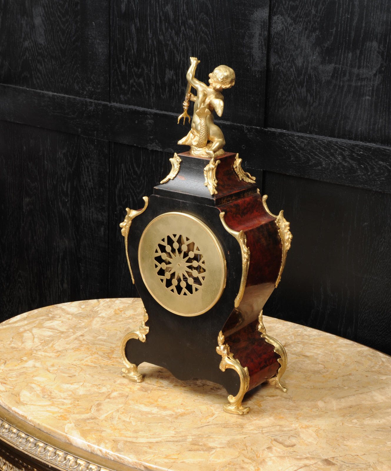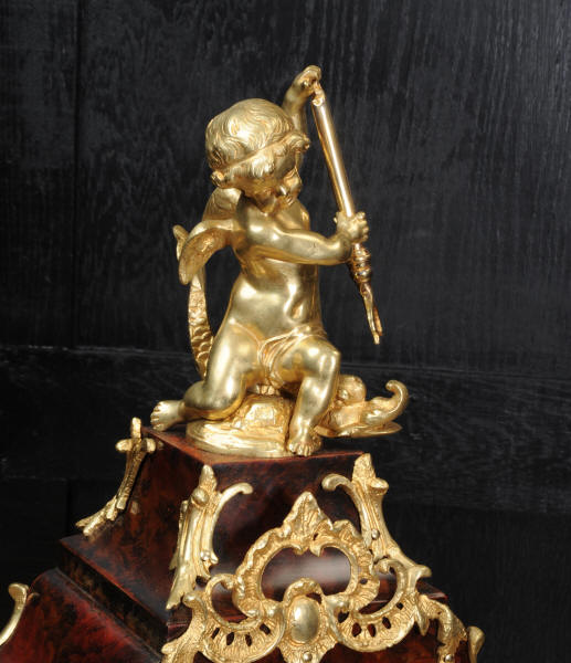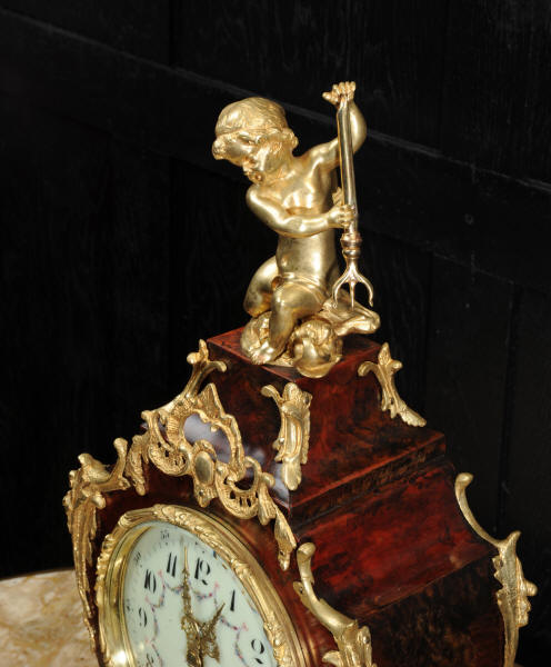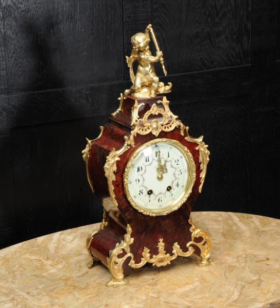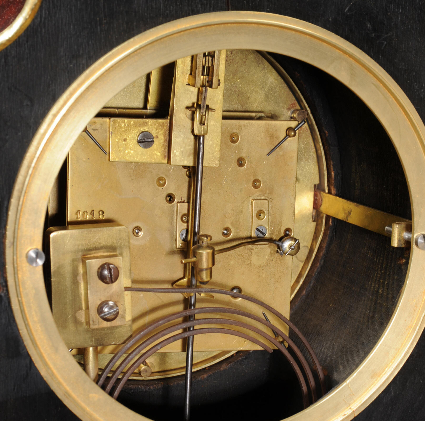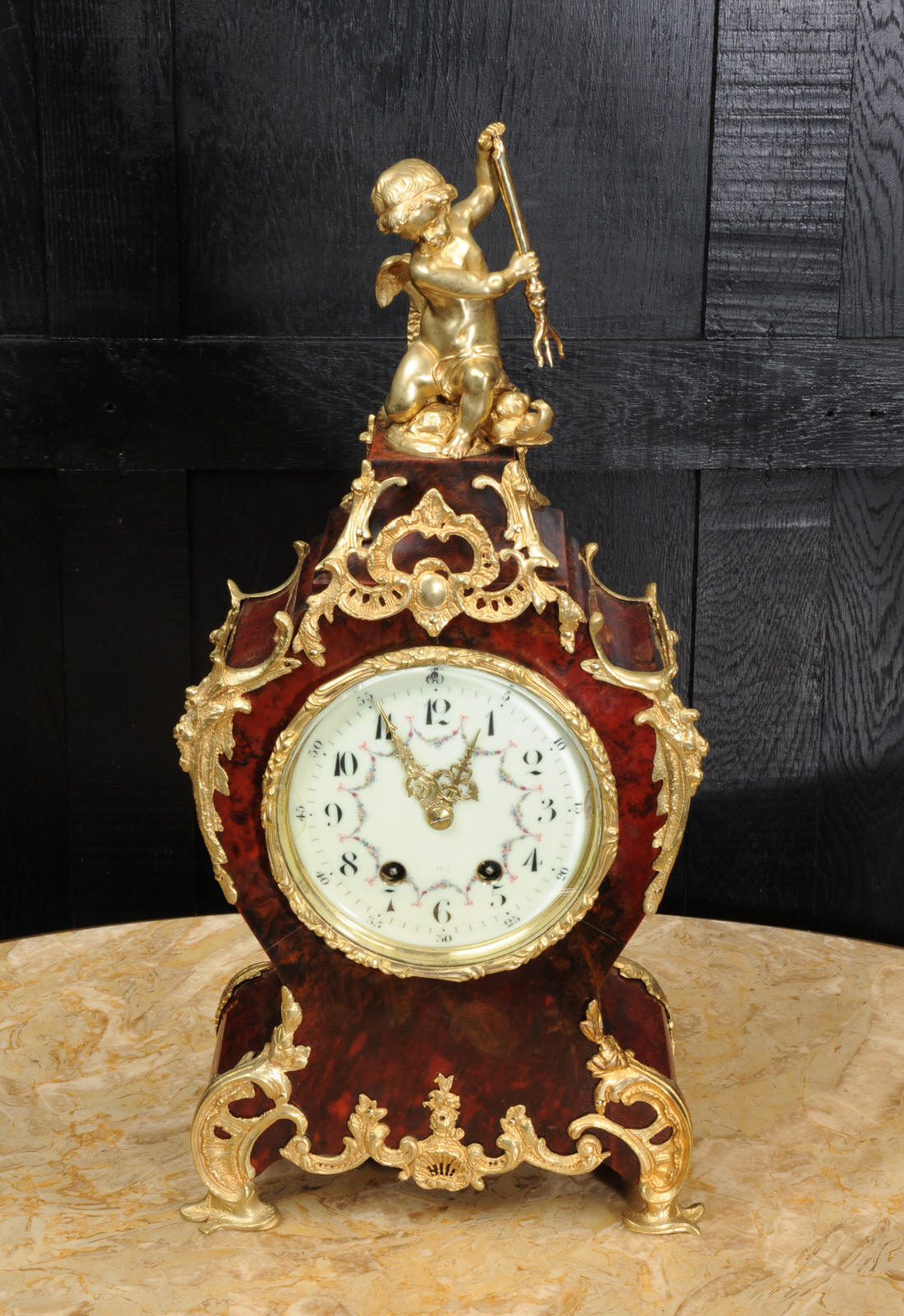 The large and superb dial is porcelain enamel on copper, delicately painted with floral swags between the hours. It is complete with original finely fretted gilt hands. The dial is faintly signed for the retailer Peace and Sons, Paris. The French movement is of high quality and is in excellent clean and running condition having been fully overhauled by our clockmaker. It is the large square plate version of the Pendule de Paris movement with dead beat escapement and rack striking. Pendulum is original. It runs for 8 days and strikes the hours and halves on gong. Click the video clip below to hear the gong and watch the clock running! Condition of the case is excellent, the shell veneer is in lovely condition beautifully mellowed and figured. There are a few slight marks and minor cracking. The ormolu is beautifully clean and bright. The dial is also in excellent condition just a small chip near the edge at the 3 o'clock and some hairlining near the 9 o'clock.