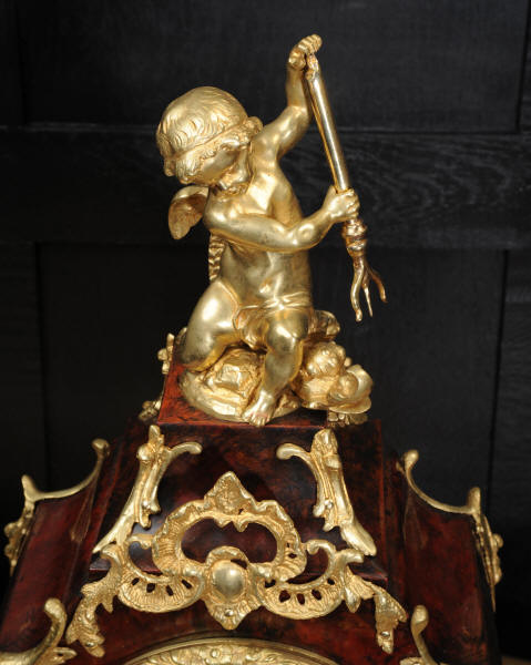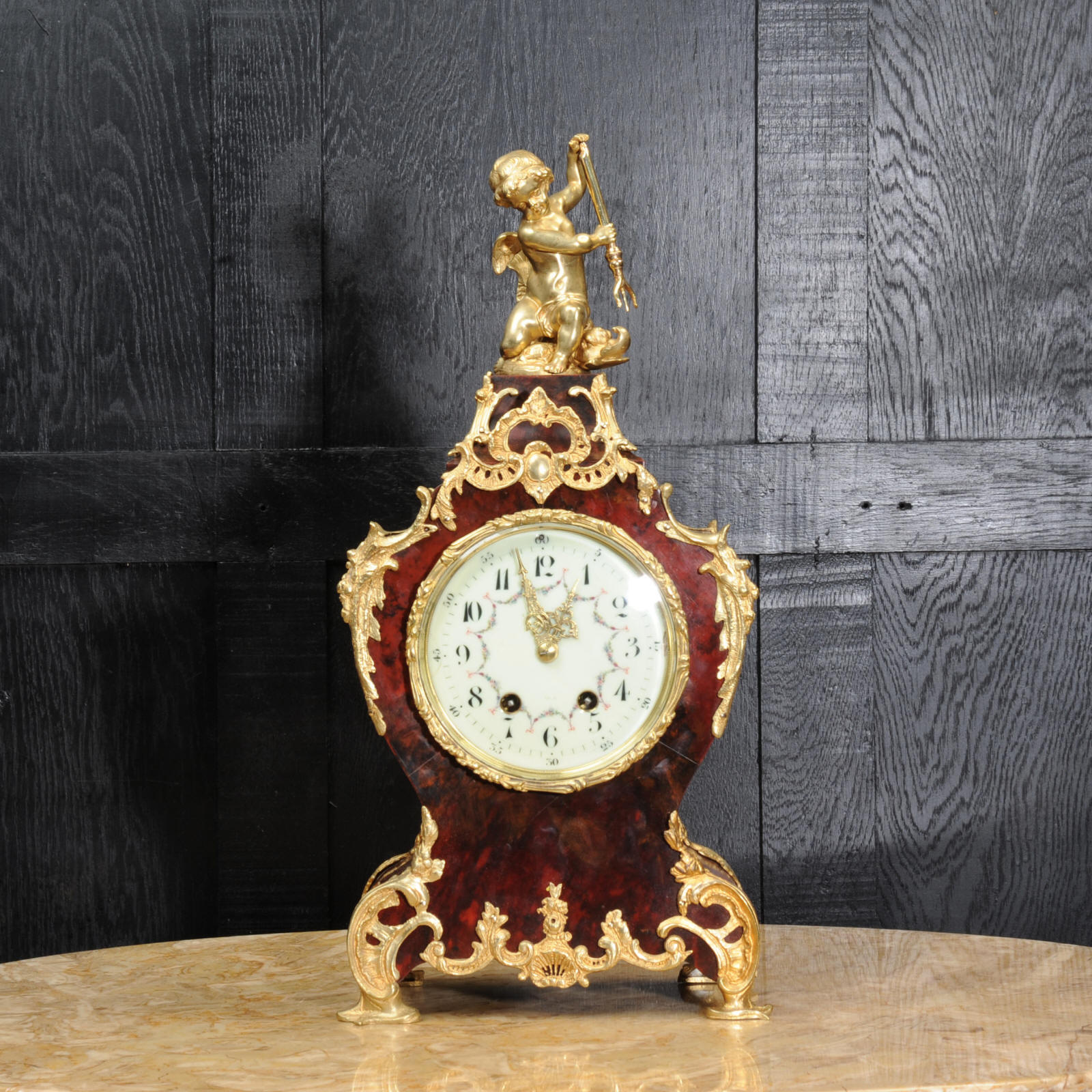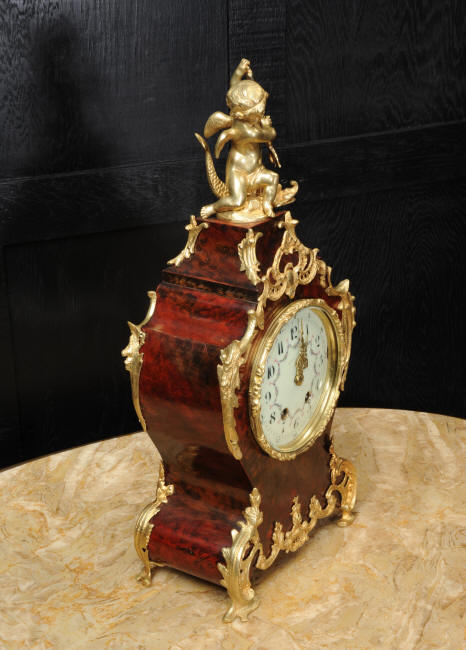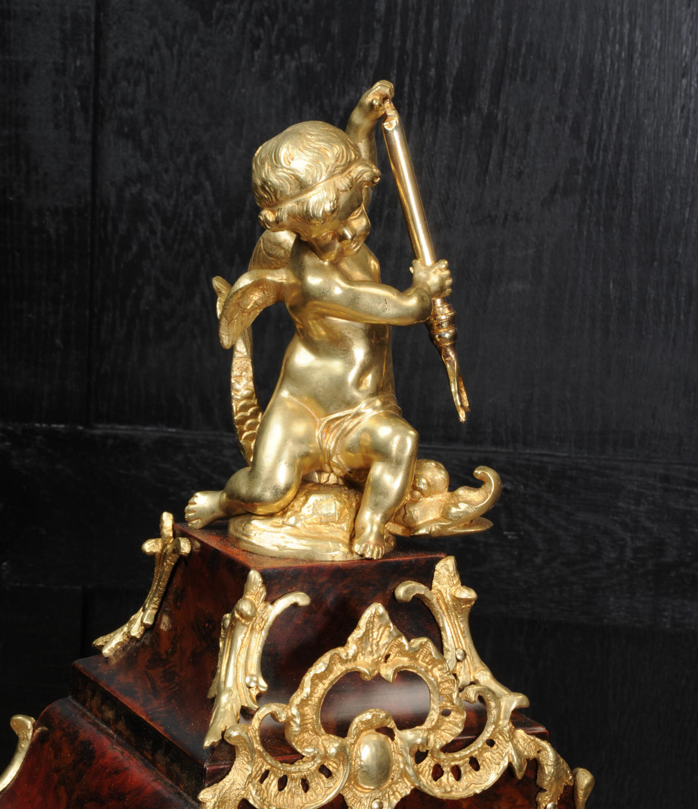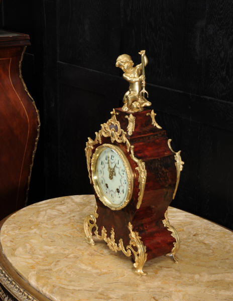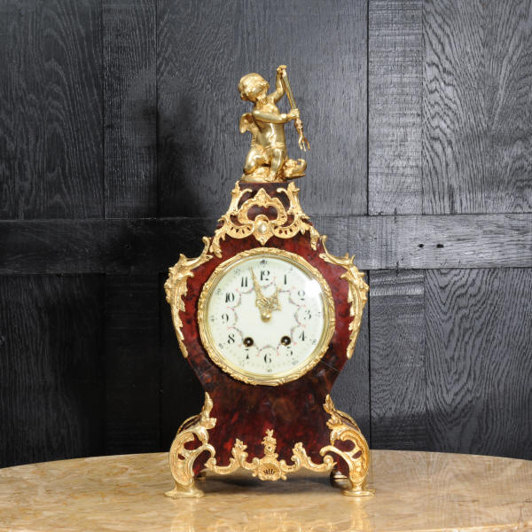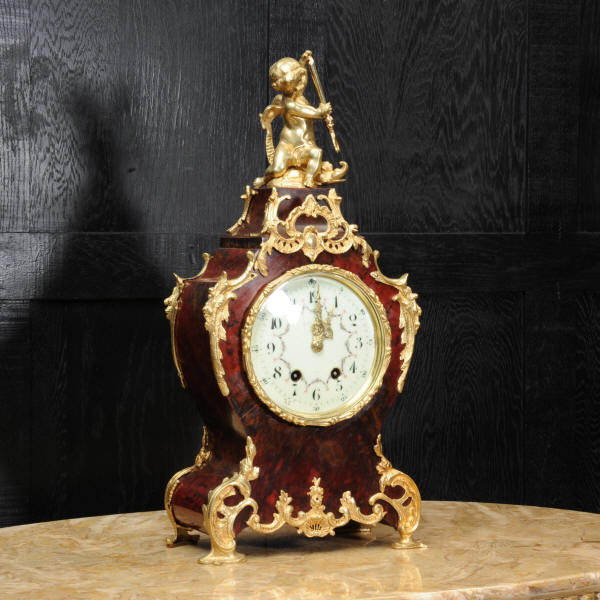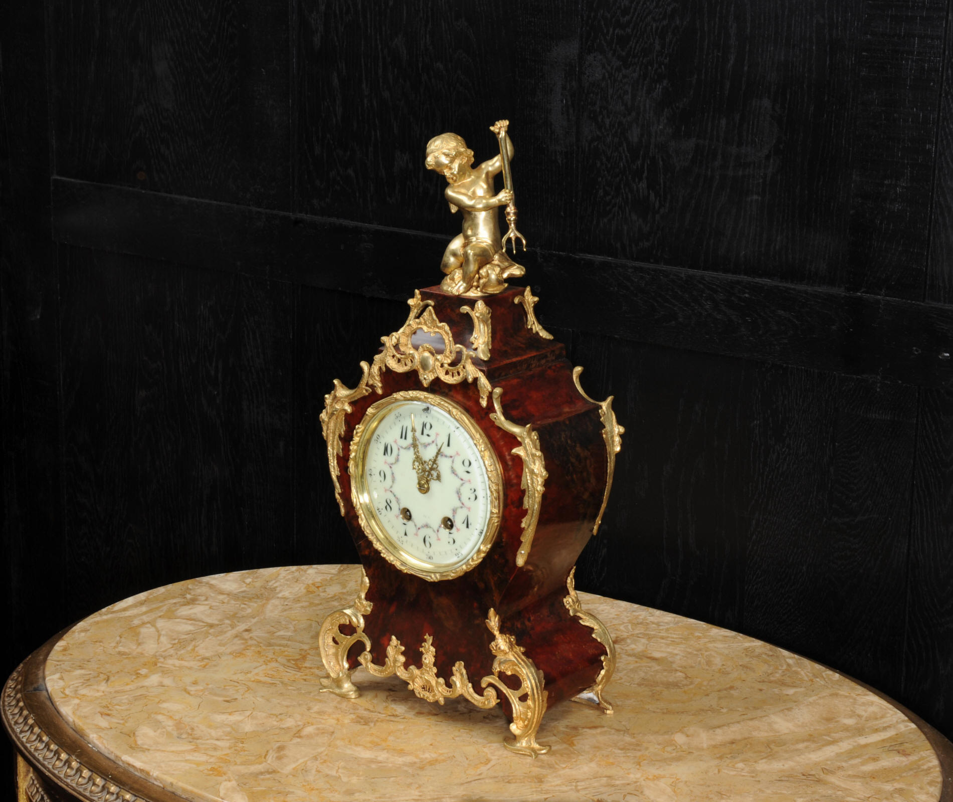 The large and superb dial is porcelain enamel on copper, delicately painted with floral swags between the hours. It is complete with original finely fretted gilt hands. The dial is faintly signed for the retailer Peace and Sons, Paris. The French movement is of high quality and is in excellent clean and running condition having been fully overhauled by our clockmaker. It is the large square plate version of the Pendule de Paris movement with dead beat escapement and rack striking. Pendulum is original. It runs for 8 days and strikes the hours and halves on gong. Click the video clip below to hear the gong and watch the clock running! Condition of the case is excellent, the shell veneer is in lovely condition beautifully mellowed and figured. There are a few slight marks and minor cracking. The ormolu is beautifully clean and bright. The dial is also in excellent condition just a small chip near the edge at the 3 o'clock and some hairlining near the 9 o'clock.