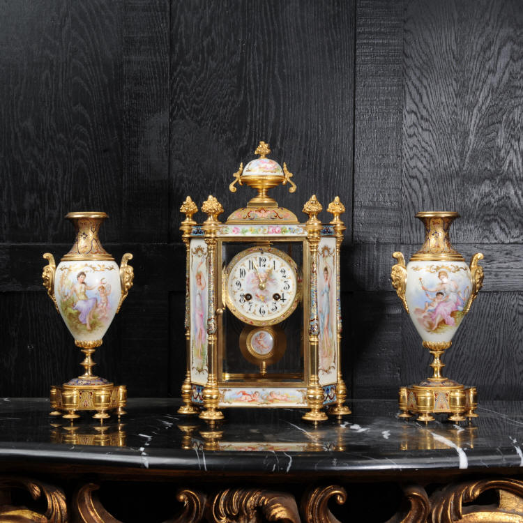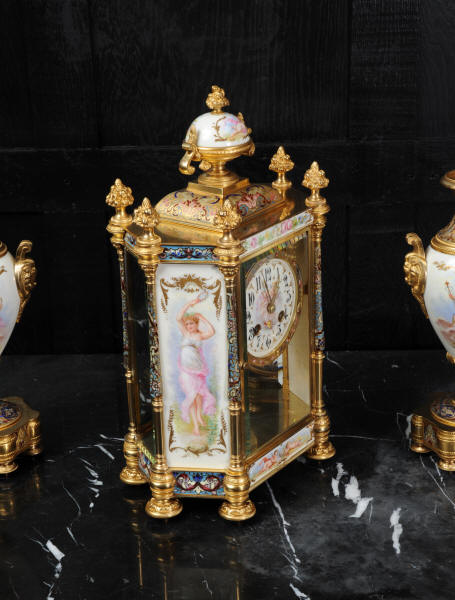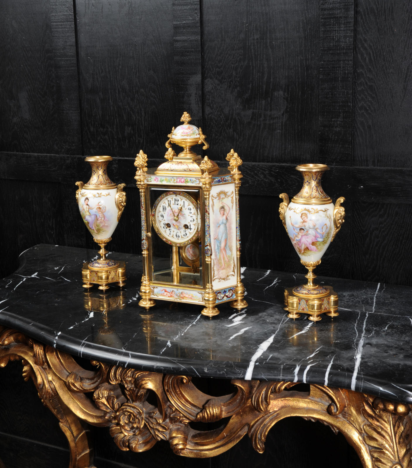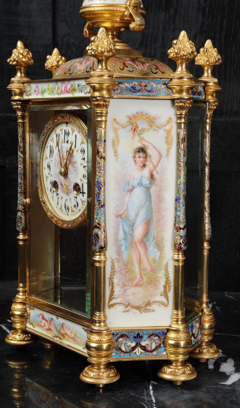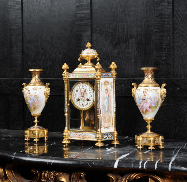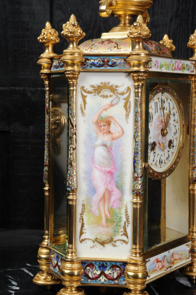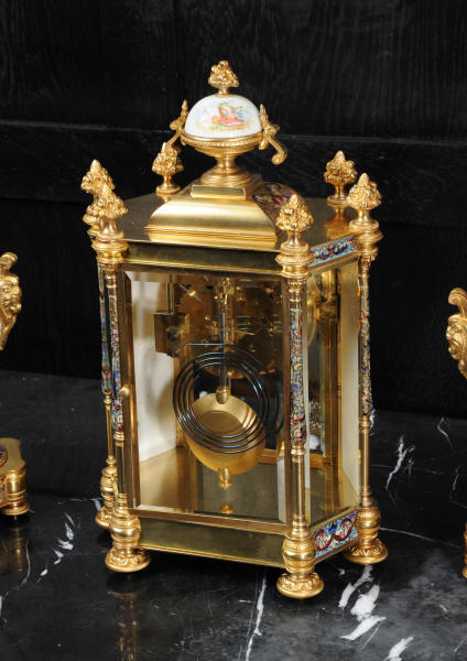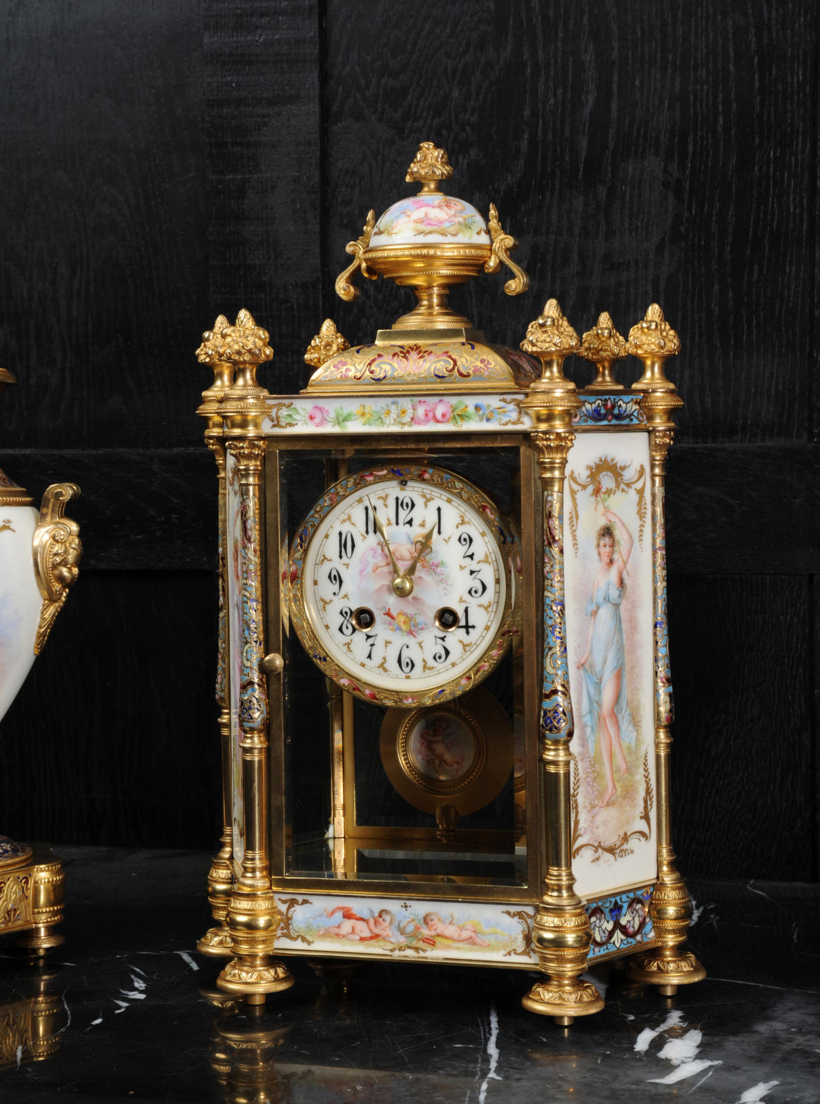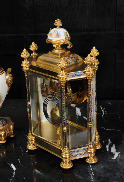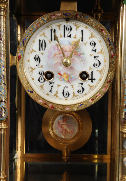The case is hexagonal in shape with beveled glass to the rear 3 sides to allow the movement to be seen and the pendulum gently swinging within. The dial is also porcelain decorated with a putto with a Champlevé enamel surround. The French movement is of high quality and is in excellent clean and running condition having been fully overhauled by our clockmaker. Pendulum is original, ormolu with silver steel rod and inset with porcelain. It runs for 8 days and strikes the hours and halves on a gong. Click the video clip below to hear the gong and watch the clock running! Condition of the case is excellent, the original gilding is beautifully clean and bright with only minor marks and discolouration. The porcelain is also excellent with no damage just some very slight wear to the over-glaze gilt decoration mainly to the dial. Champlevé enamel is in good condition with some slight losses in places. The front glass has some light scratches and the right hand glass panel has small chip to the edge which is not noticable.
