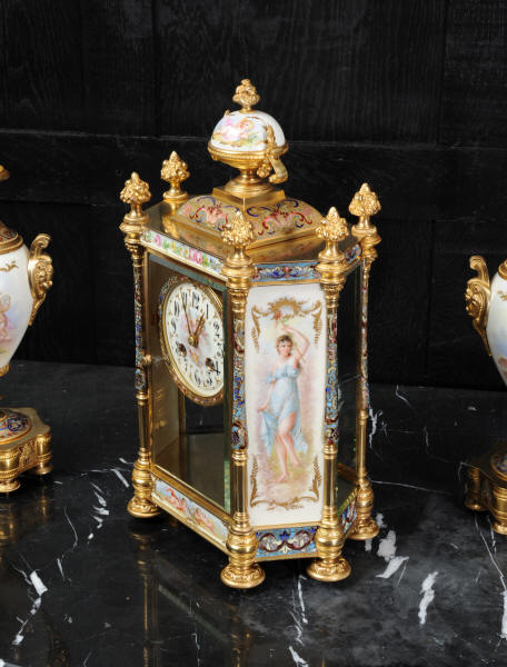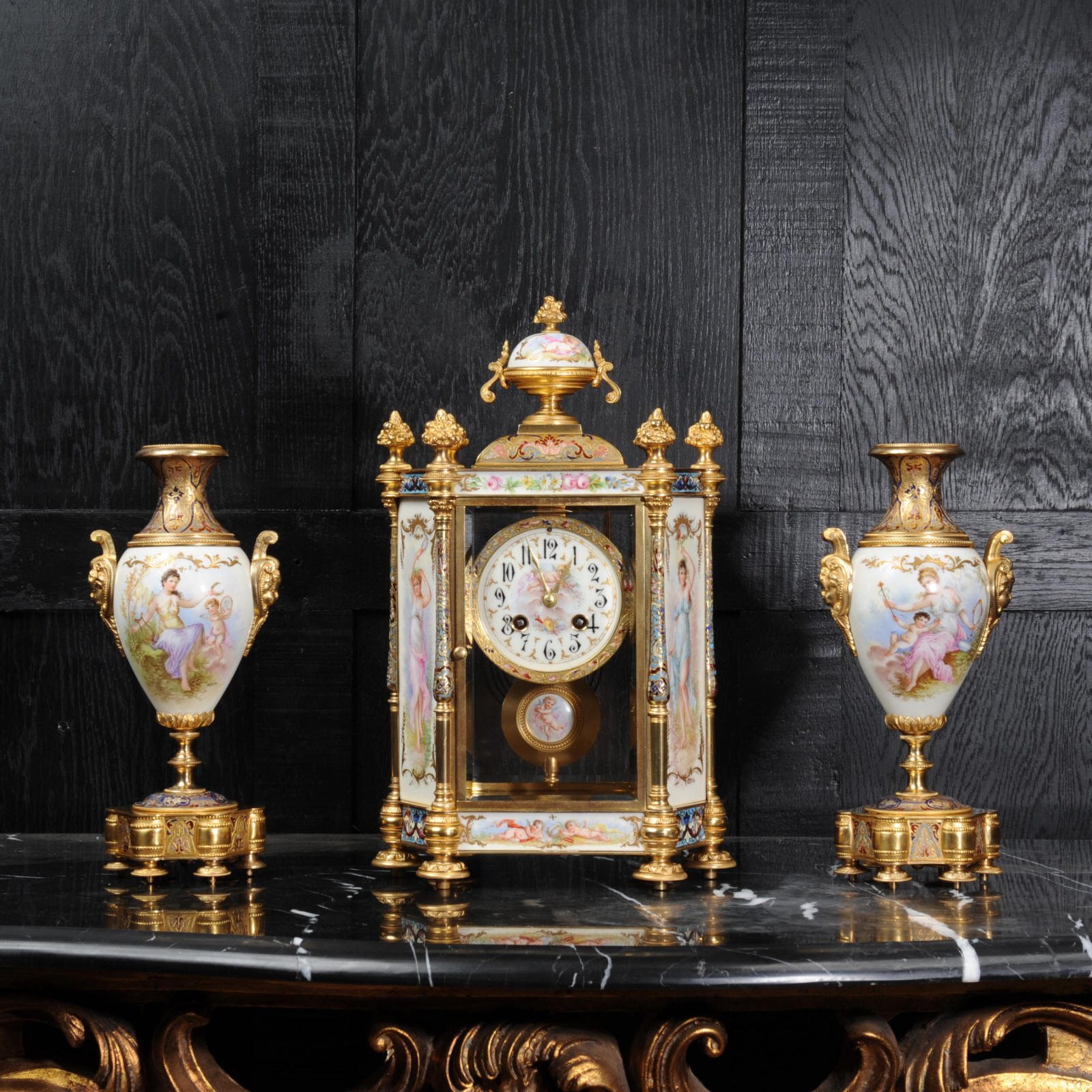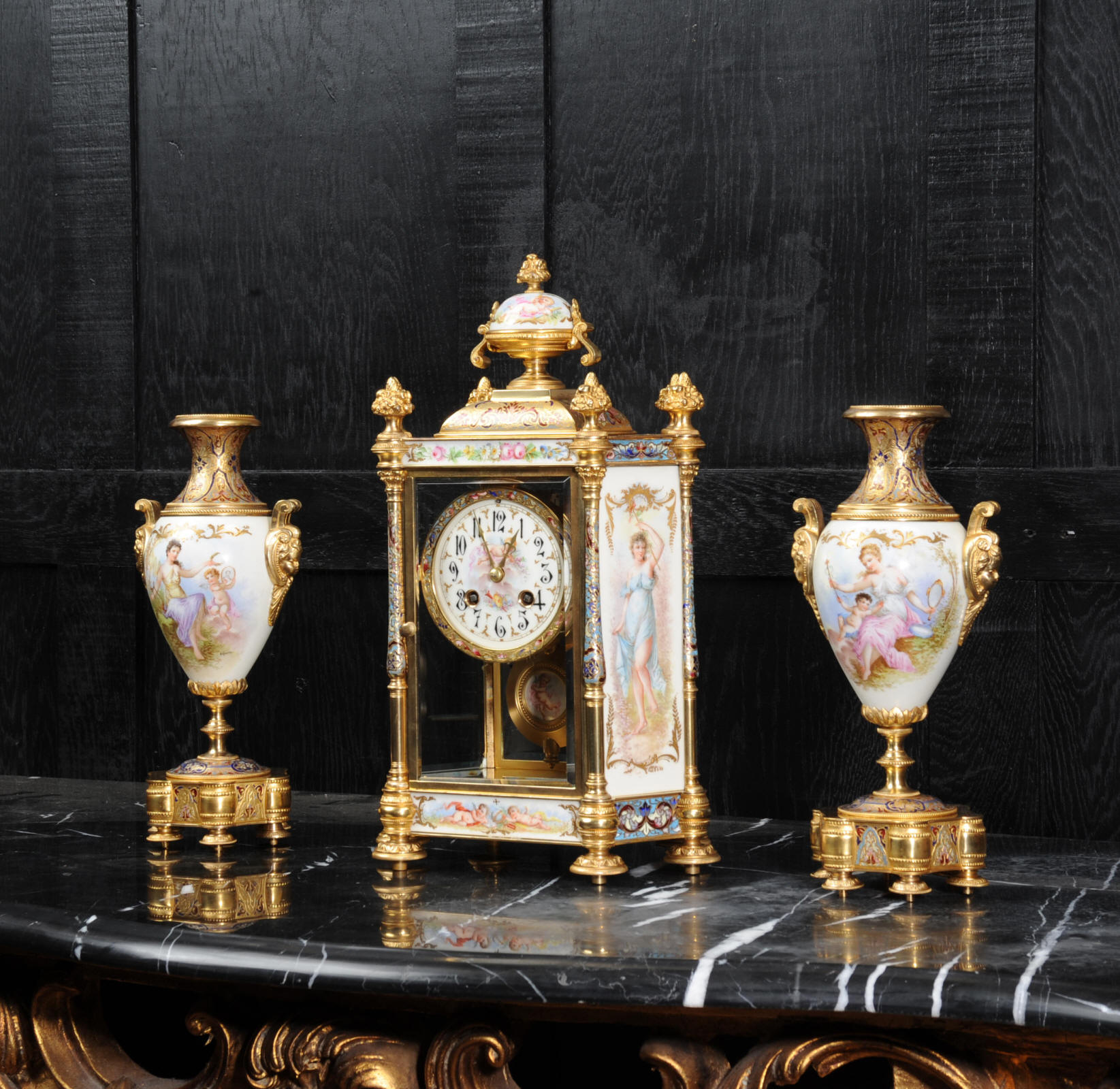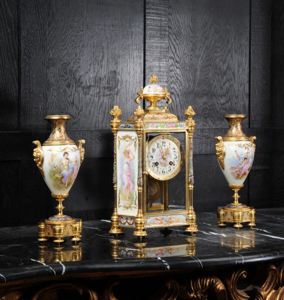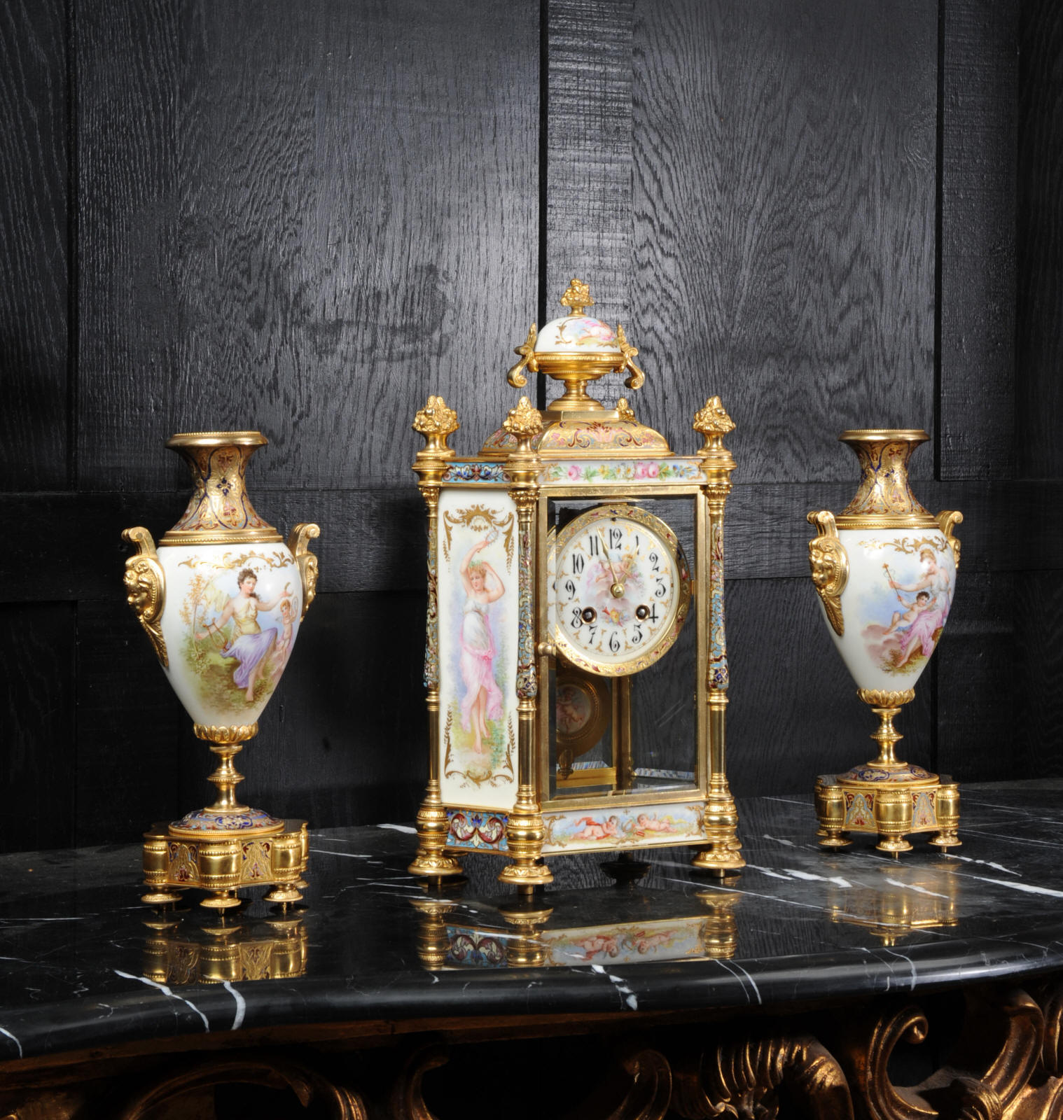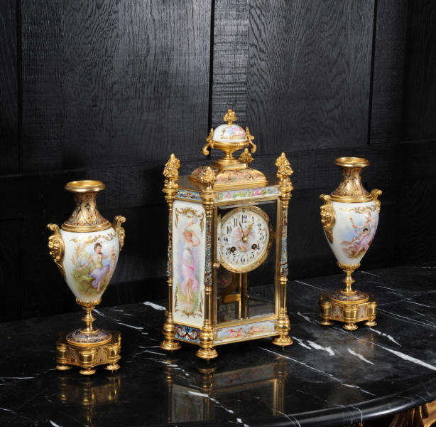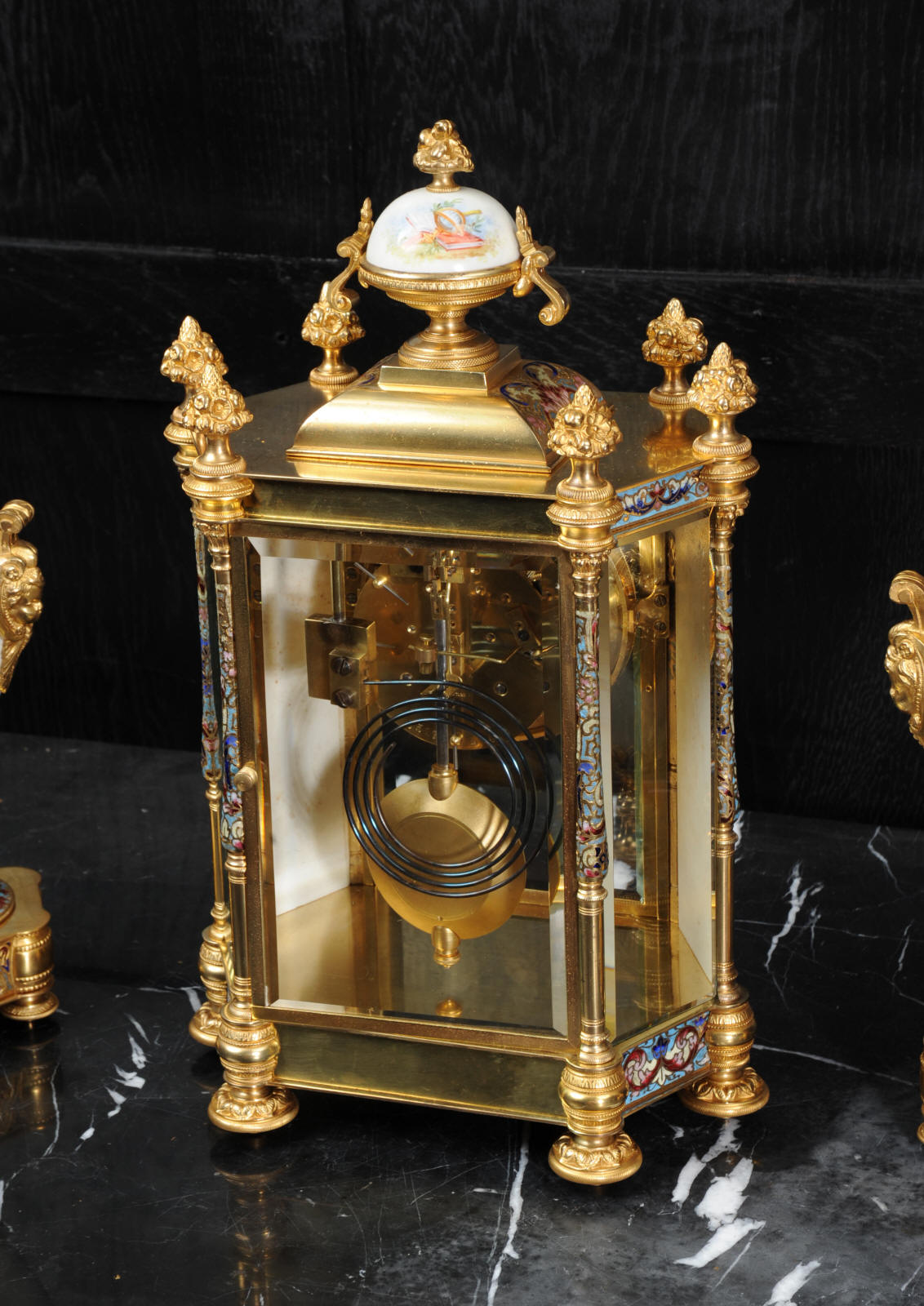 The case is hexagonal in shape with beveled glass to the rear 3 sides to allow the movement to be seen and the pendulum gently swinging within. The dial is also porcelain decorated with a putto with a Champlevé enamel surround. The French movement is of high quality and is in excellent clean and running condition having been fully overhauled by our clockmaker. Pendulum is original, ormolu with silver steel rod and inset with porcelain. It runs for 8 days and strikes the hours and halves on a gong. Click the video clip below to hear the gong and watch the clock running! Condition of the case is excellent, the original gilding is beautifully clean and bright with only minor marks and discolouration. The porcelain is also excellent with no damage just some very slight wear to the over-glaze gilt decoration mainly to the dial. Champlevé enamel is in good condition with some slight losses in places. The front glass has some light scratches and the right hand glass panel has small chip to the edge which is not noticable.