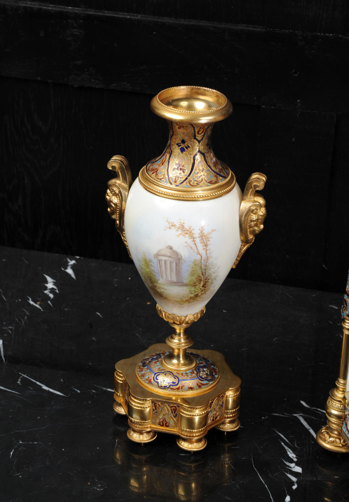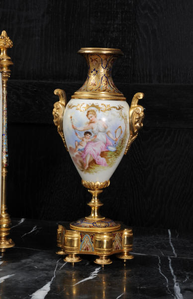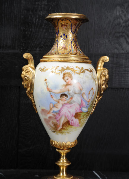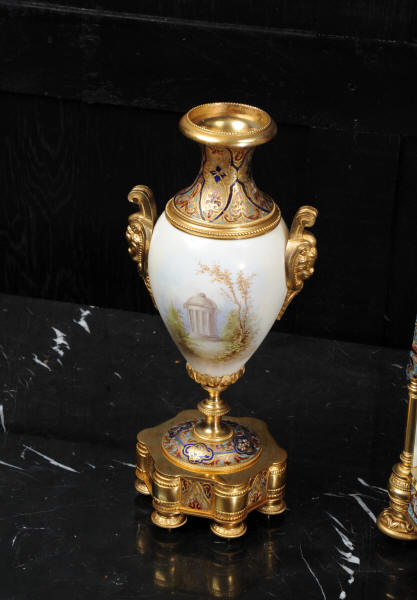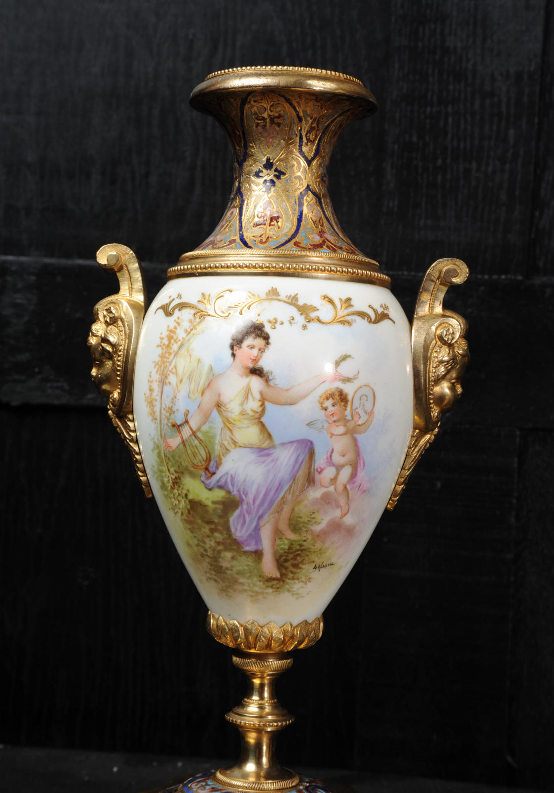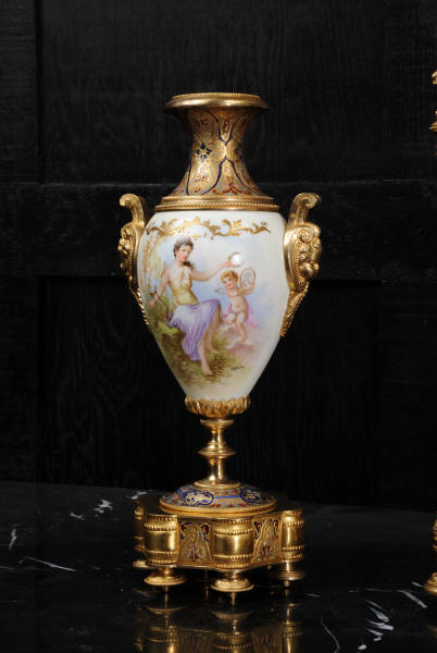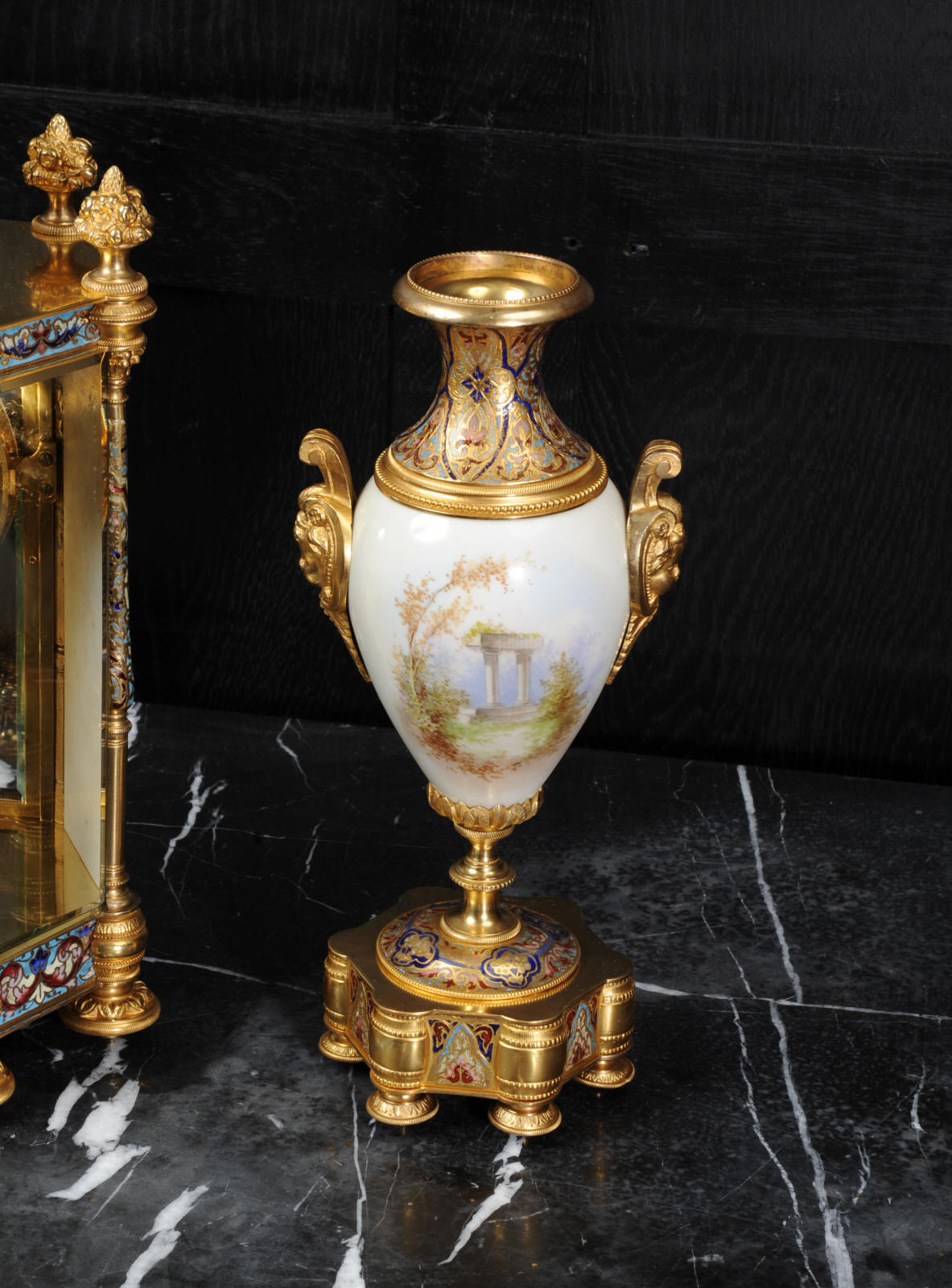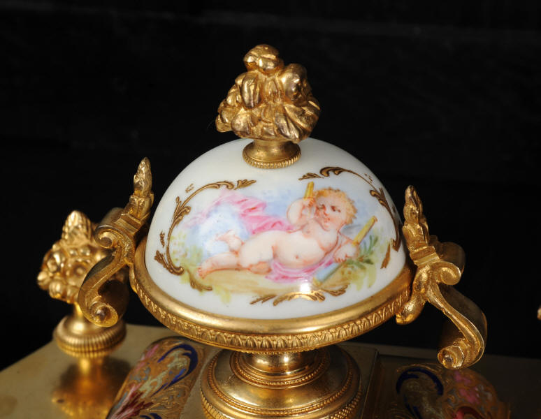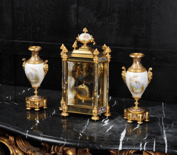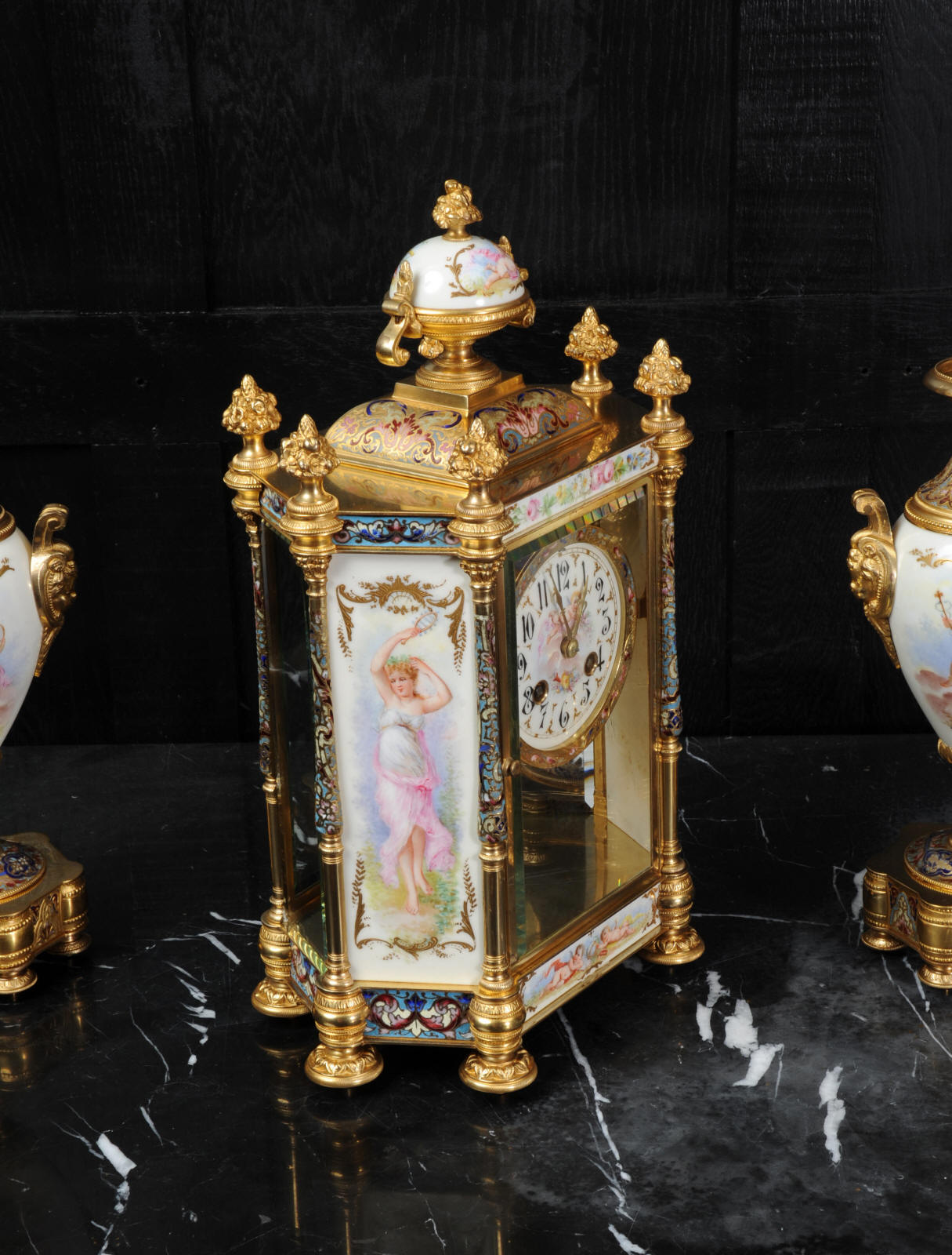 The case is hexagonal in shape with beveled glass to the rear 3 sides to allow the movement to be seen and the pendulum gently swinging within. The dial is also porcelain decorated with a putto with a Champlevé enamel surround. The French movement is of high quality and is in excellent clean and running condition having been fully overhauled by our clockmaker. Pendulum is original, ormolu with silver steel rod and inset with porcelain. It runs for 8 days and strikes the hours and halves on a gong. Click the video clip below to hear the gong and watch the clock running! Condition of the case is excellent, the original gilding is beautifully clean and bright with only minor marks and discolouration. The porcelain is also excellent with no damage just some very slight wear to the over-glaze gilt decoration mainly to the dial. Champlevé enamel is in good condition with some slight losses in places. The front glass has some light scratches and the right hand glass panel has small chip to the edge which is not noticable.