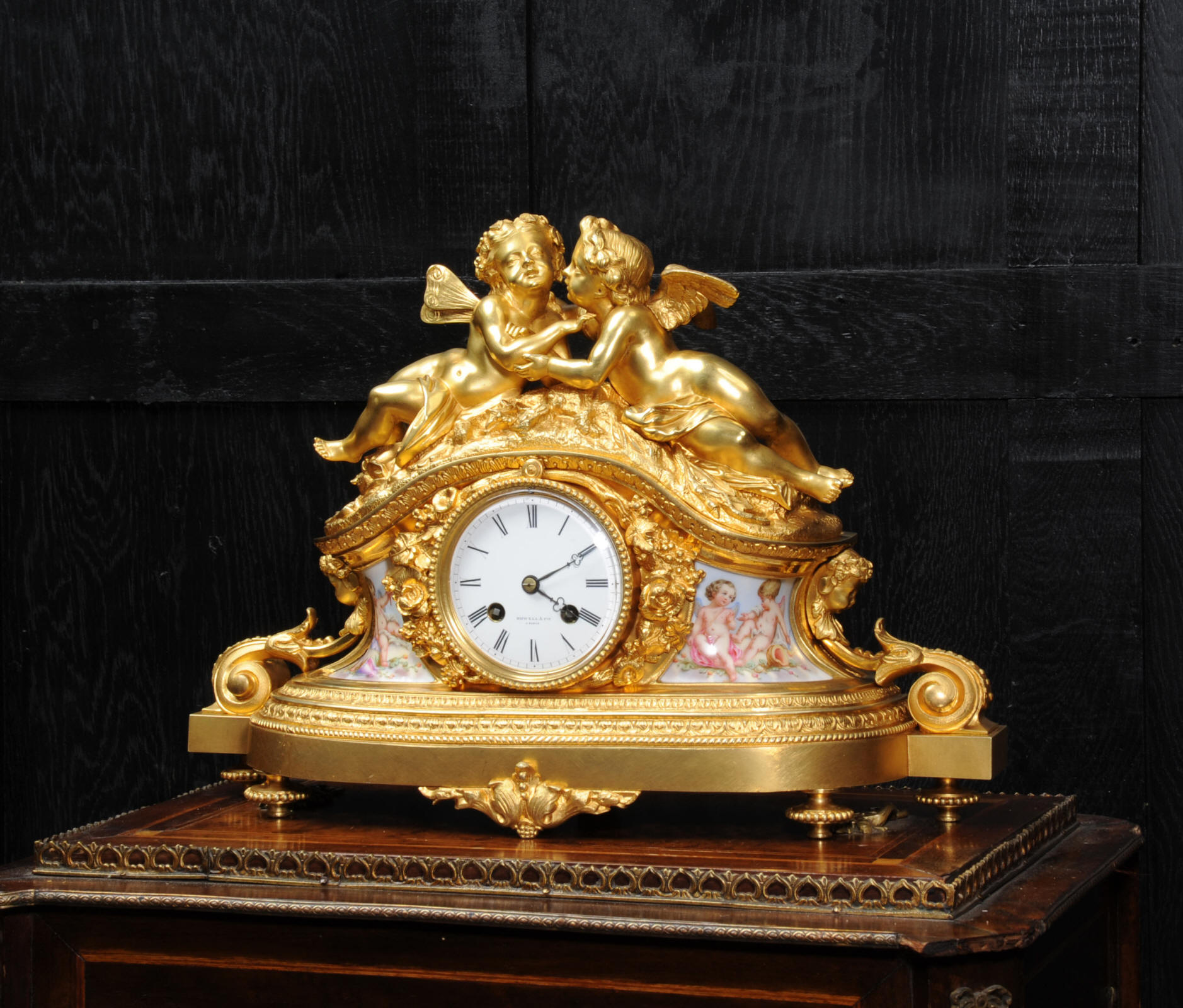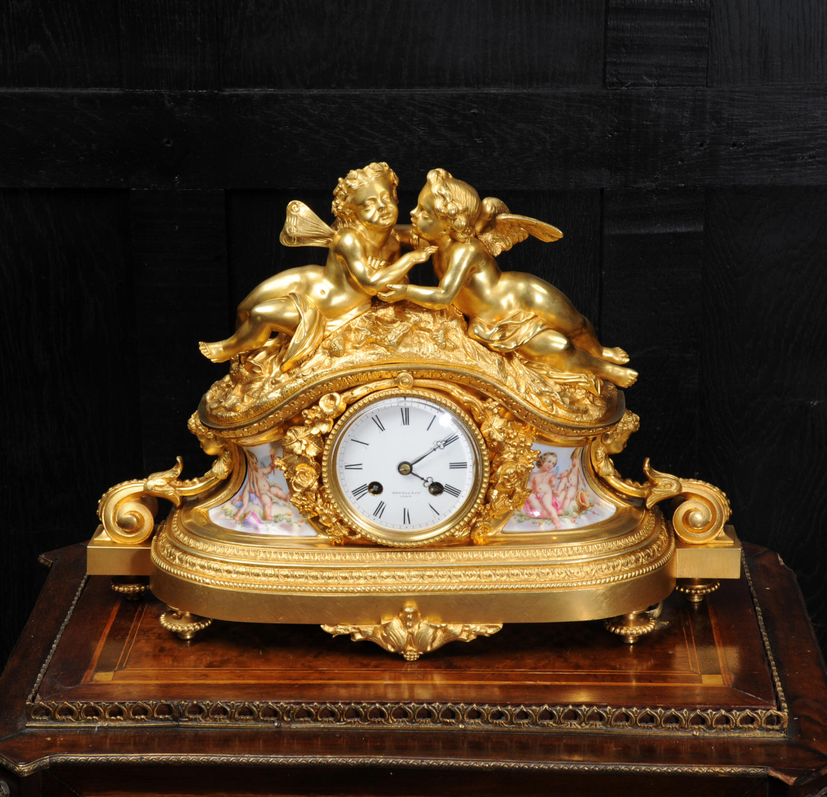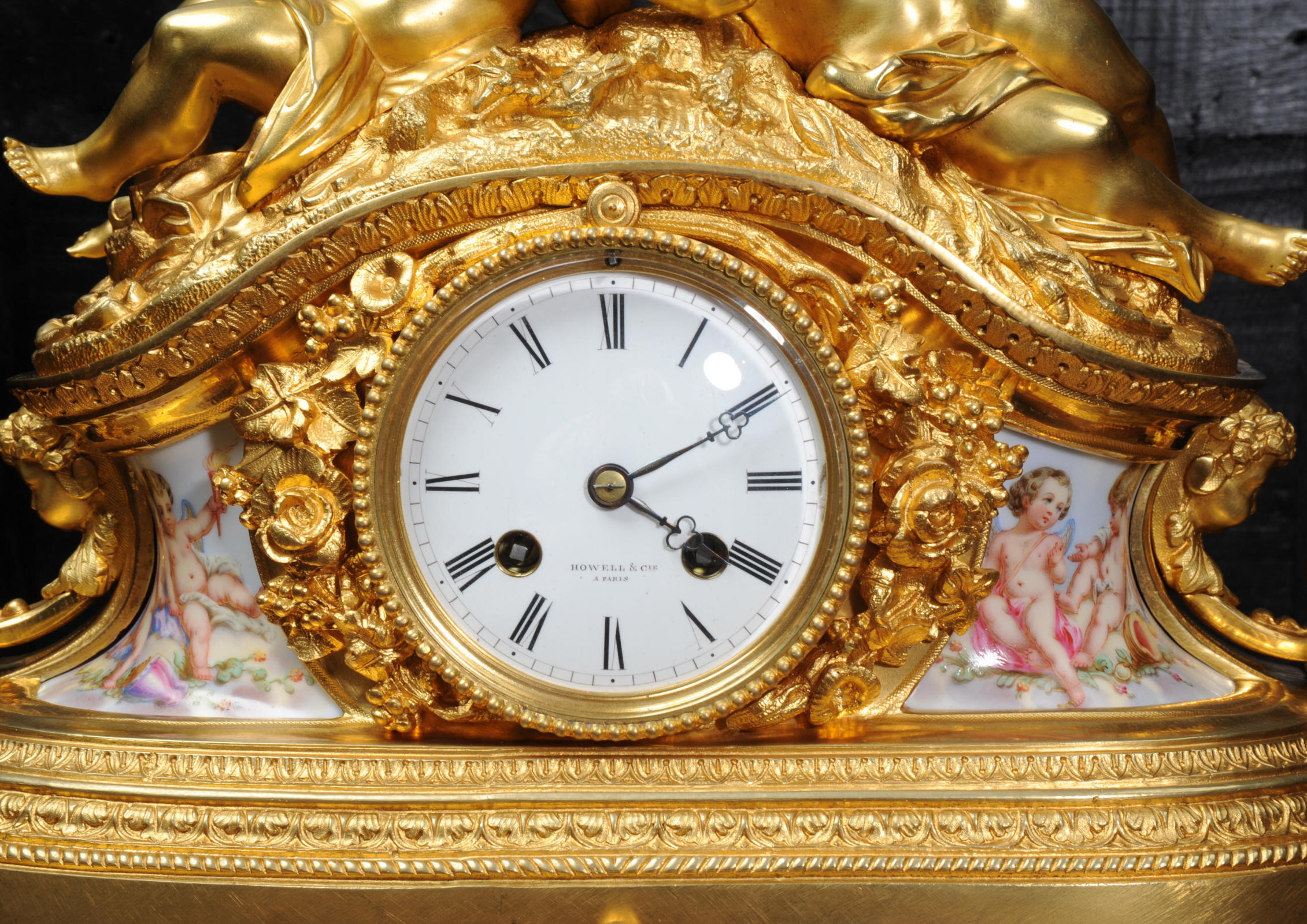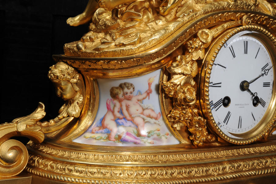 The gilding is in lovely original condition with a colour and finish that can only be achieved with mercury gilding. The bronze work is heavy but beautifully light in design with a fine crispness. The bronze is frequently marked J. D, The serial number of the clock is on the porcelain, case and pendulum. The dial is porcelain enamel on copper with convex glass and gilded hobnail bezel. It is signed for Howell et Cie Paris. The firm Howell and James was founded in 1819 by James Howell and Isaac James who were originally silk mercers and retail jewellers. The company had premises at 5, 7 and 9 Regent Street and was noted for the variety and quality of its stock. In 1838 James left the business and the partnership then became known as Howell James & Co. The French movement is of high quality and is in excellent clean and running condition having been fully overhauled by our clockmaker. It is a silk suspension movement with a later modification to steel spring suspension but retaining the original pendulum. It runs for 8 days and strikes the hours and halves on a bell. Click the video clip below to hear the bell and watch the clock running! Condition of the case is excellent, the original gilding is beautifully clean and bright with just some slight wear to the high spots. The dial is also in good condition, just a slight chip to the edge near the three o'clock.
