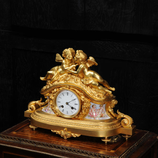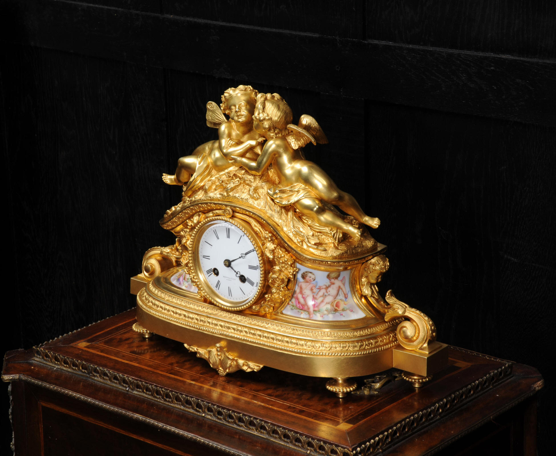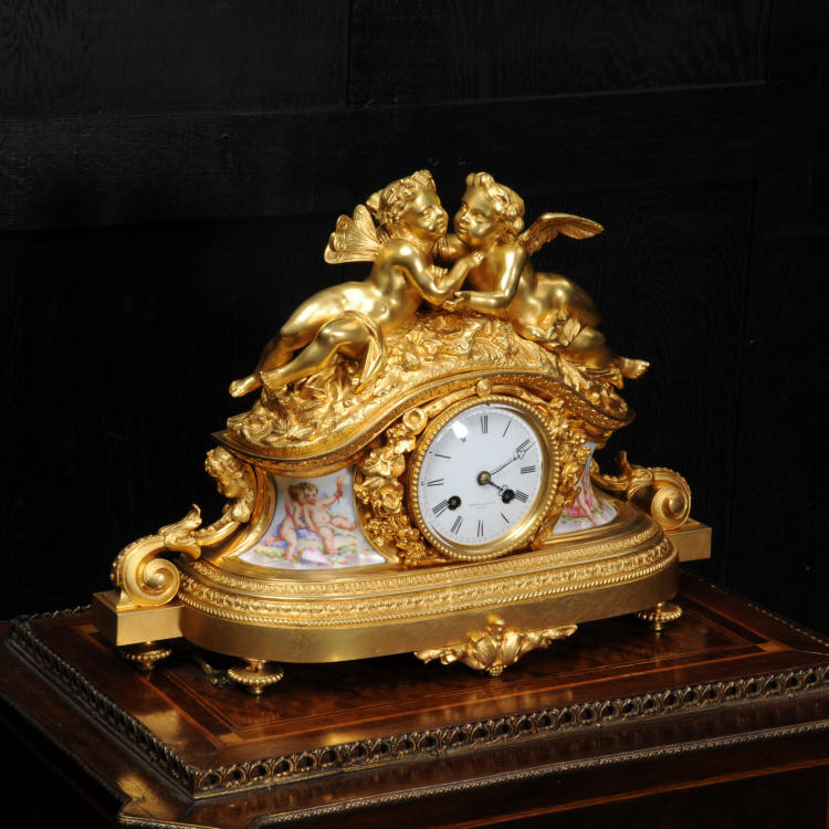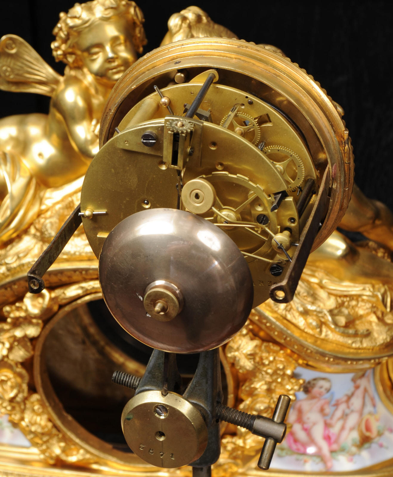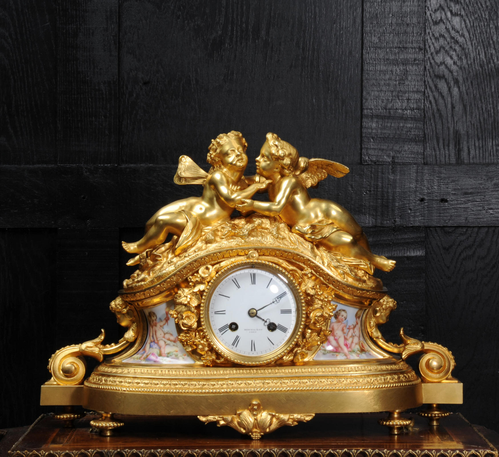 The gilding is in lovely original condition with a colour and finish that can only be achieved with mercury gilding. The bronze work is heavy but beautifully light in design with a fine crispness. The bronze is frequently marked J. D, The serial number of the clock is on the porcelain, case and pendulum. The dial is porcelain enamel on copper with convex glass and gilded hobnail bezel. It is signed for Howell et Cie Paris. The firm Howell and James was founded in 1819 by James Howell and Isaac James who were originally silk mercers and retail jewellers. The company had premises at 5, 7 and 9 Regent Street and was noted for the variety and quality of its stock. In 1838 James left the business and the partnership then became known as Howell James & Co. The French movement is of high quality and is in excellent clean and running condition having been fully overhauled by our clockmaker. It is a silk suspension movement with a later modification to steel spring suspension but retaining the original pendulum. It runs for 8 days and strikes the hours and halves on a bell. Click the video clip below to hear the bell and watch the clock running! Condition of the case is excellent, the original gilding is beautifully clean and bright with just some slight wear to the high spots. The dial is also in good condition, just a slight chip to the edge near the three o'clock.