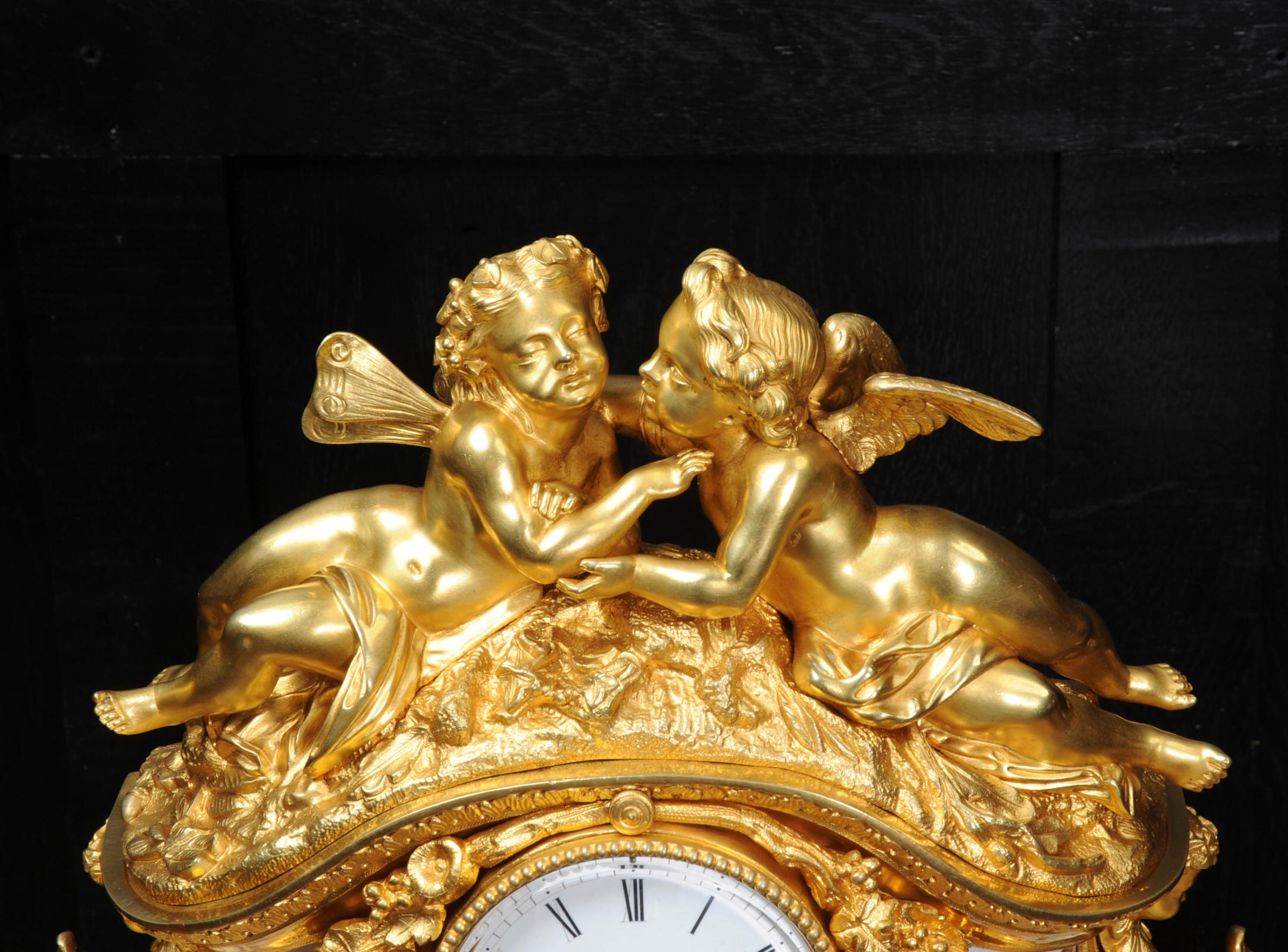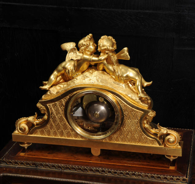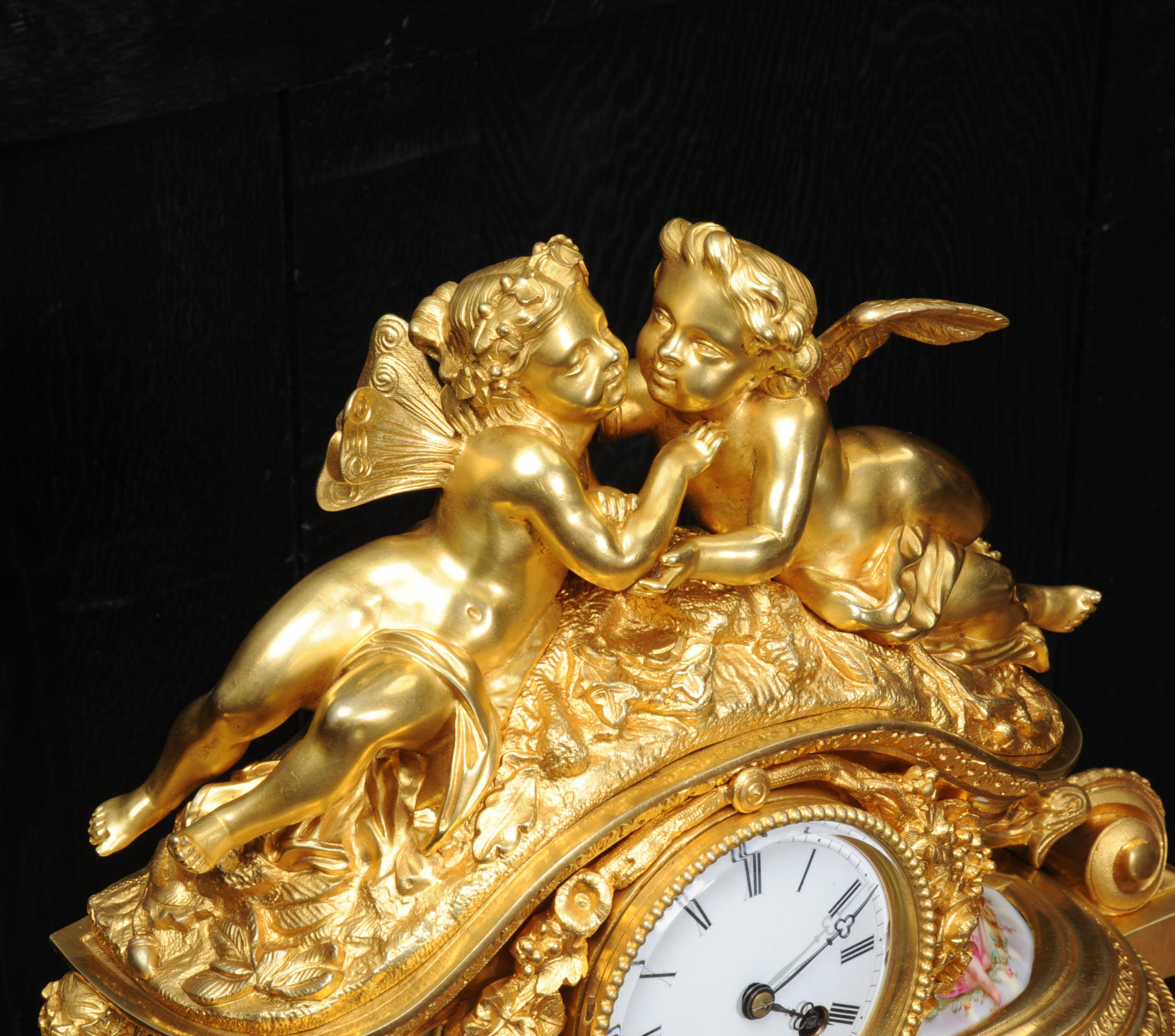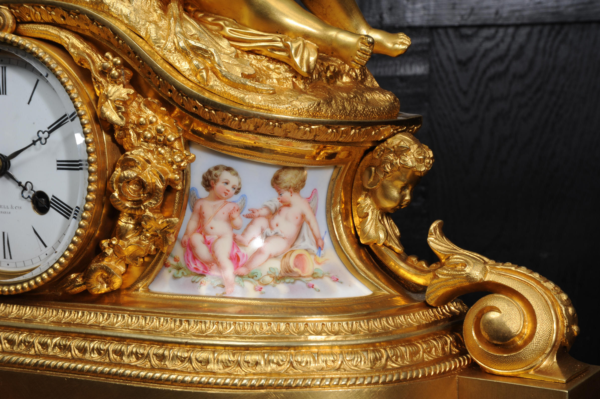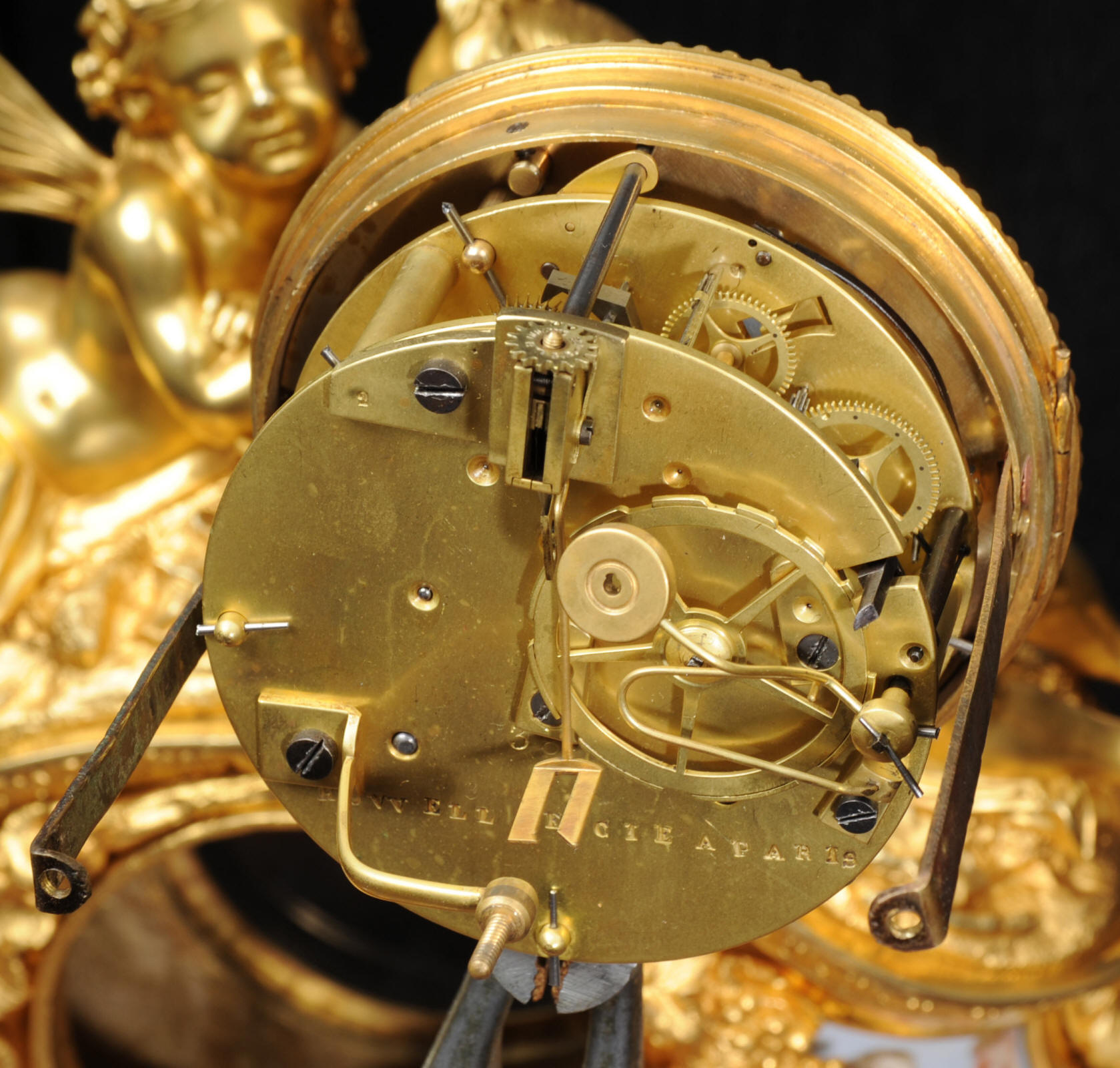 The gilding is in lovely original condition with a colour and finish that can only be achieved with mercury gilding. The bronze work is heavy but beautifully light in design with a fine crispness. The bronze is frequently marked J. D, The serial number of the clock is on the porcelain, case and pendulum. The dial is porcelain enamel on copper with convex glass and gilded hobnail bezel. It is signed for Howell et Cie Paris. The firm Howell and James was founded in 1819 by James Howell and Isaac James who were originally silk mercers and retail jewellers. The company had premises at 5, 7 and 9 Regent Street and was noted for the variety and quality of its stock. In 1838 James left the business and the partnership then became known as Howell James & Co. The French movement is of high quality and is in excellent clean and running condition having been fully overhauled by our clockmaker. It is a silk suspension movement with a later modification to steel spring suspension but retaining the original pendulum. It runs for 8 days and strikes the hours and halves on a bell. Click the video clip below to hear the bell and watch the clock running! Condition of the case is excellent, the original gilding is beautifully clean and bright with just some slight wear to the high spots. The dial is also in good condition, just a slight chip to the edge near the three o'clock.