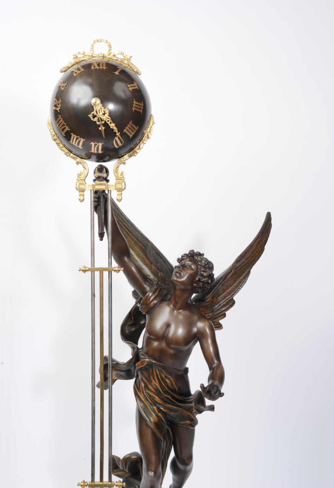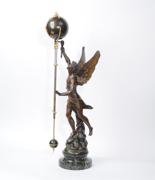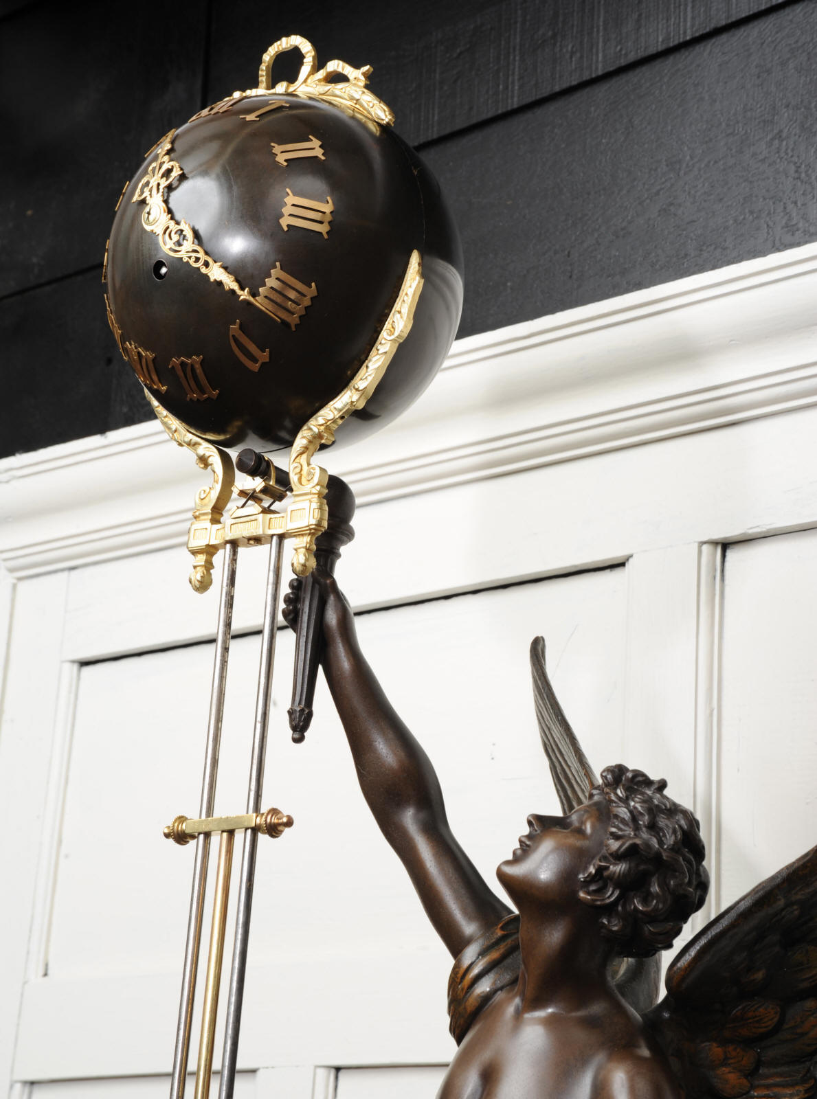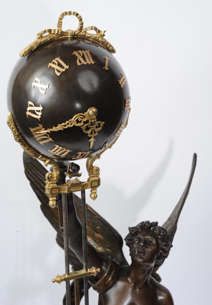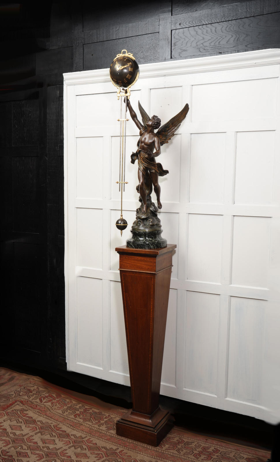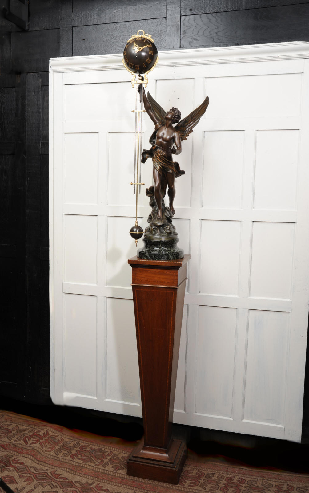The secret is that this is a compound pendulum, a small, heavy pendulum swings in harmony inside the bronzed sphere to actuate the movement. The winged figure of victory holds the large pendulum aloft triumphantly which swings gently to-and-fro. The modelling is beautifully sharp and crisp, full of drama and movement. The patination of the figure is a lovely deep bronze with the wings and the rocky base having a slight coloured tint. The two spheres of the pendulum have a beautiful bronze patination. The figure has the incised signature 'Bruchon' and a mark 'Paris'. The mahogany pedestal in the pictures is also available. Émile Bruchon is listed in Dictionary if sculptors, Pierre Kjellberg as working in 1880. He was a student of Mathurin Moreau. The French movement is of high quality and is in excellent clean and running condition having been fully overhauled by our clockmaker. It runs for 8 days, click the video clip below to watch this amazing clock running! Condition is excellent, the patinated finish of the figure is in excellent original condition, just some occasional marks, rubs or discolouration. The bronzed finish of the pendulum is also excellent, just a couple of small dents to the rear cover and the silver steel rods of the pendulum are pitted with some plating lacking. Some very slight evidence of old repairs to the dial letters. The gilded parts are beautifully clean and bright. A rare and stunning clock to add to your collection.