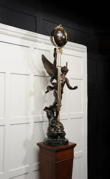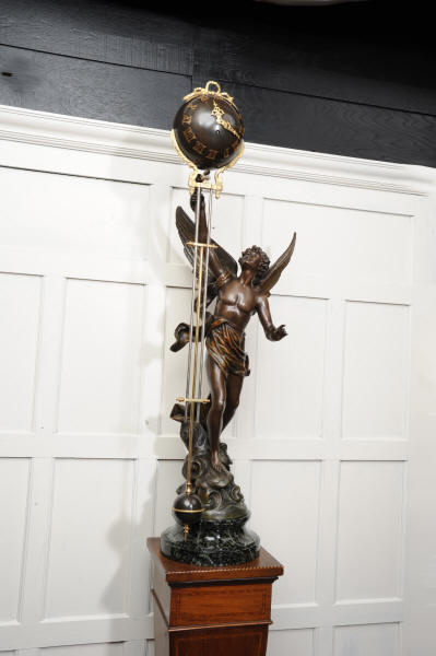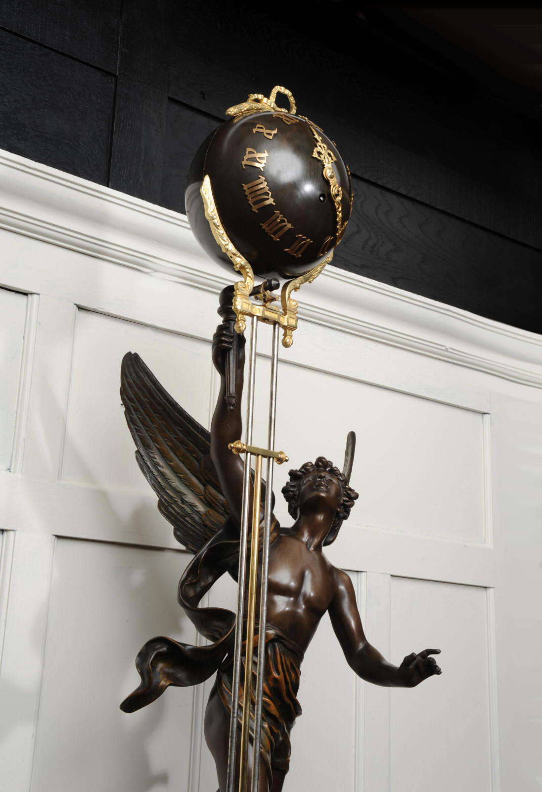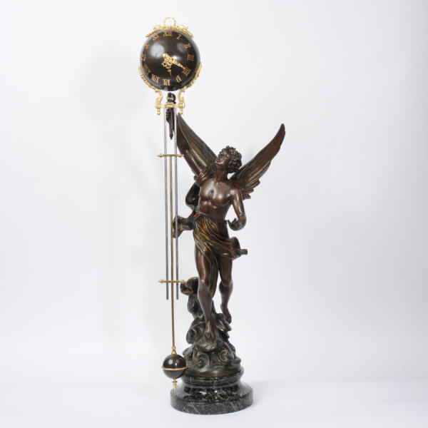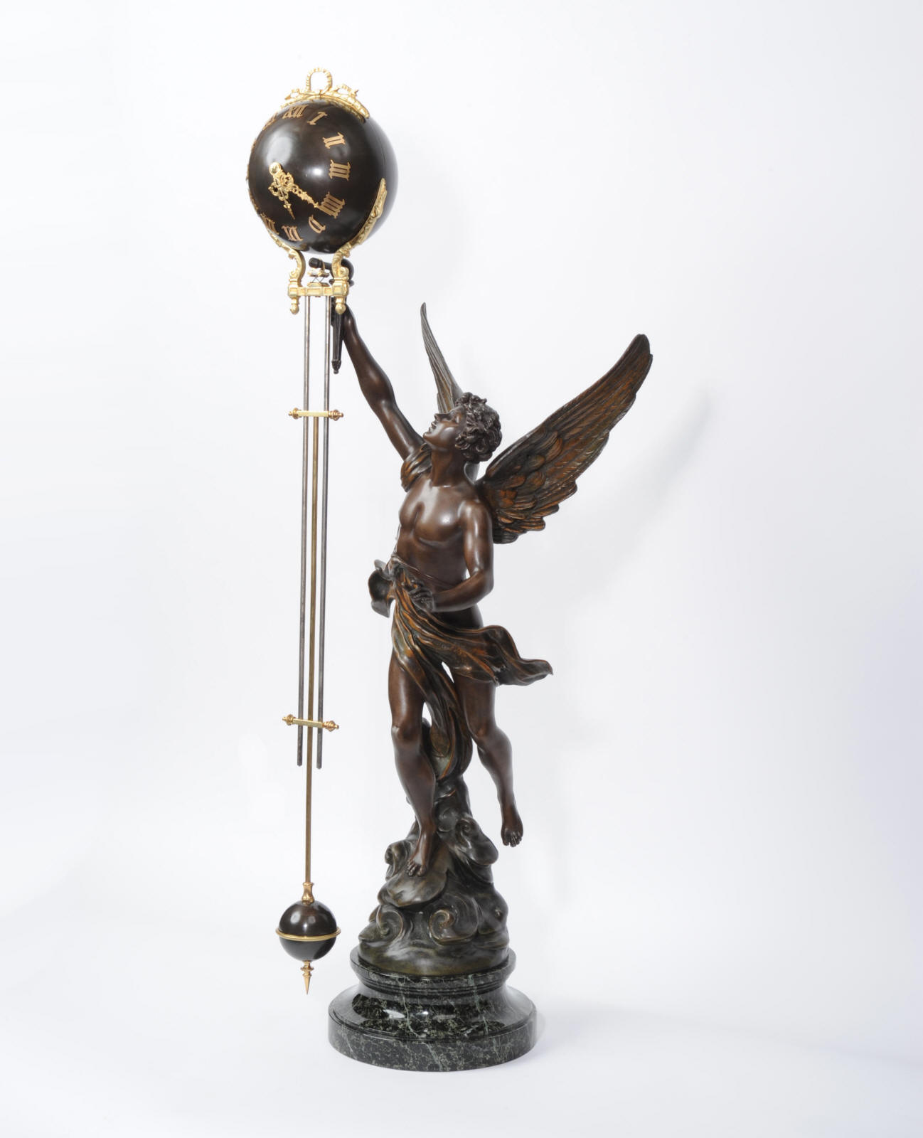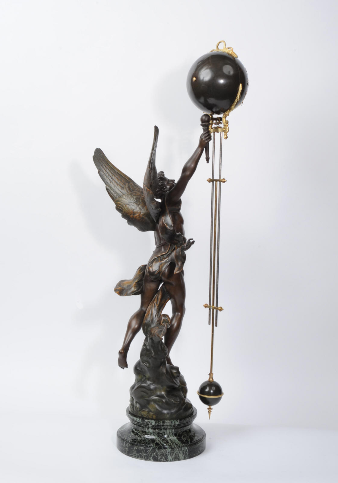 The secret is that this is a compound pendulum, a small, heavy pendulum swings in harmony inside the bronzed sphere to actuate the movement. The winged figure of victory holds the large pendulum aloft triumphantly which swings gently to-and-fro. The modelling is beautifully sharp and crisp, full of drama and movement. The patination of the figure is a lovely deep bronze with the wings and the rocky base having a slight coloured tint. The two spheres of the pendulum have a beautiful bronze patination. The figure has the incised signature 'Bruchon' and a mark 'Paris'. The mahogany pedestal in the pictures is also available. Émile Bruchon is listed in Dictionary if sculptors, Pierre Kjellberg as working in 1880. He was a student of Mathurin Moreau. The French movement is of high quality and is in excellent clean and running condition having been fully overhauled by our clockmaker. It runs for 8 days, click the video clip below to watch this amazing clock running! Condition is excellent, the patinated finish of the figure is in excellent original condition, just some occasional marks, rubs or discolouration. The bronzed finish of the pendulum is also excellent, just a couple of small dents to the rear cover and the silver steel rods of the pendulum are pitted with some plating lacking. Some very slight evidence of old repairs to the dial letters. The gilded parts are beautifully clean and bright. A rare and stunning clock to add to your collection.