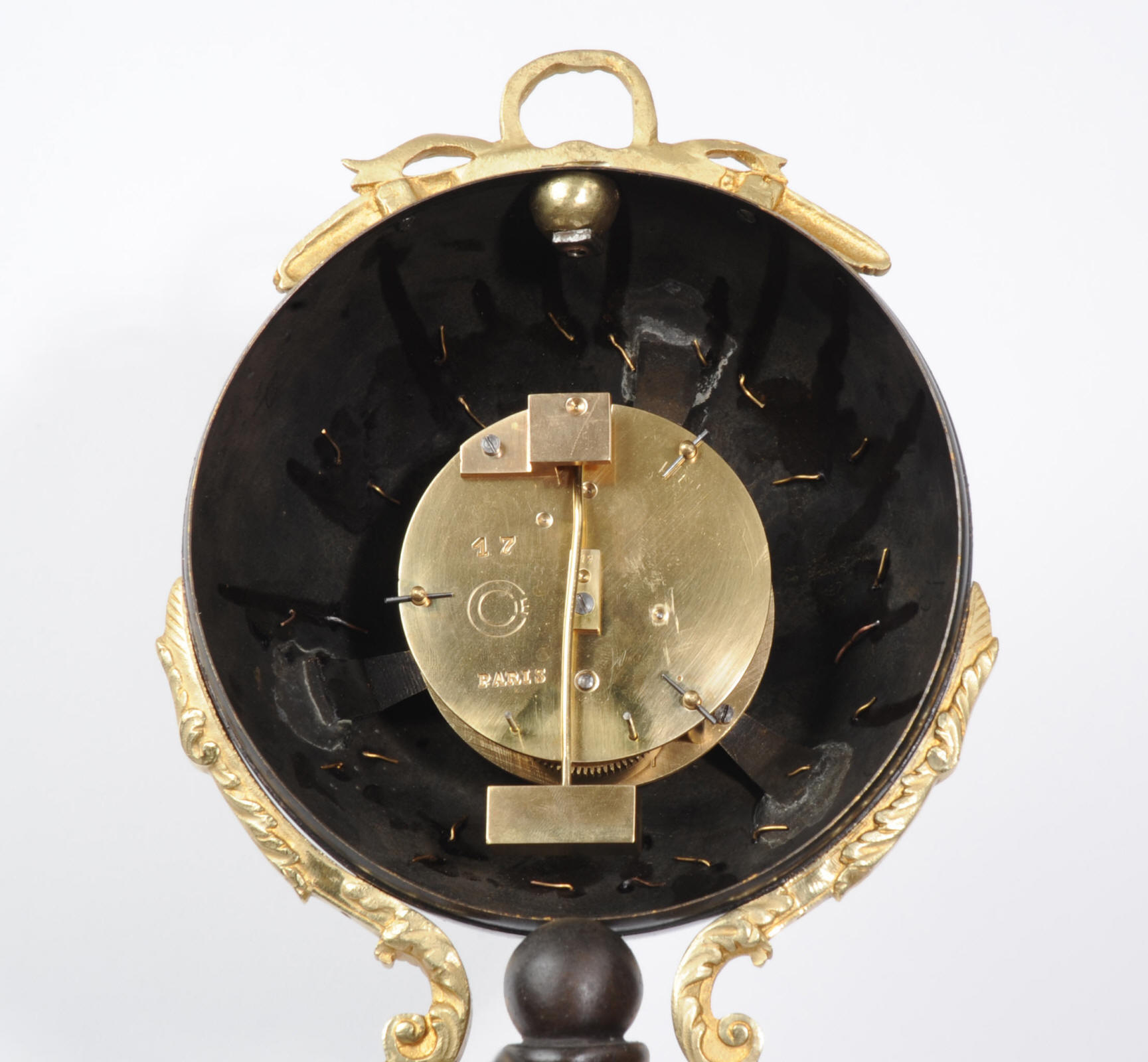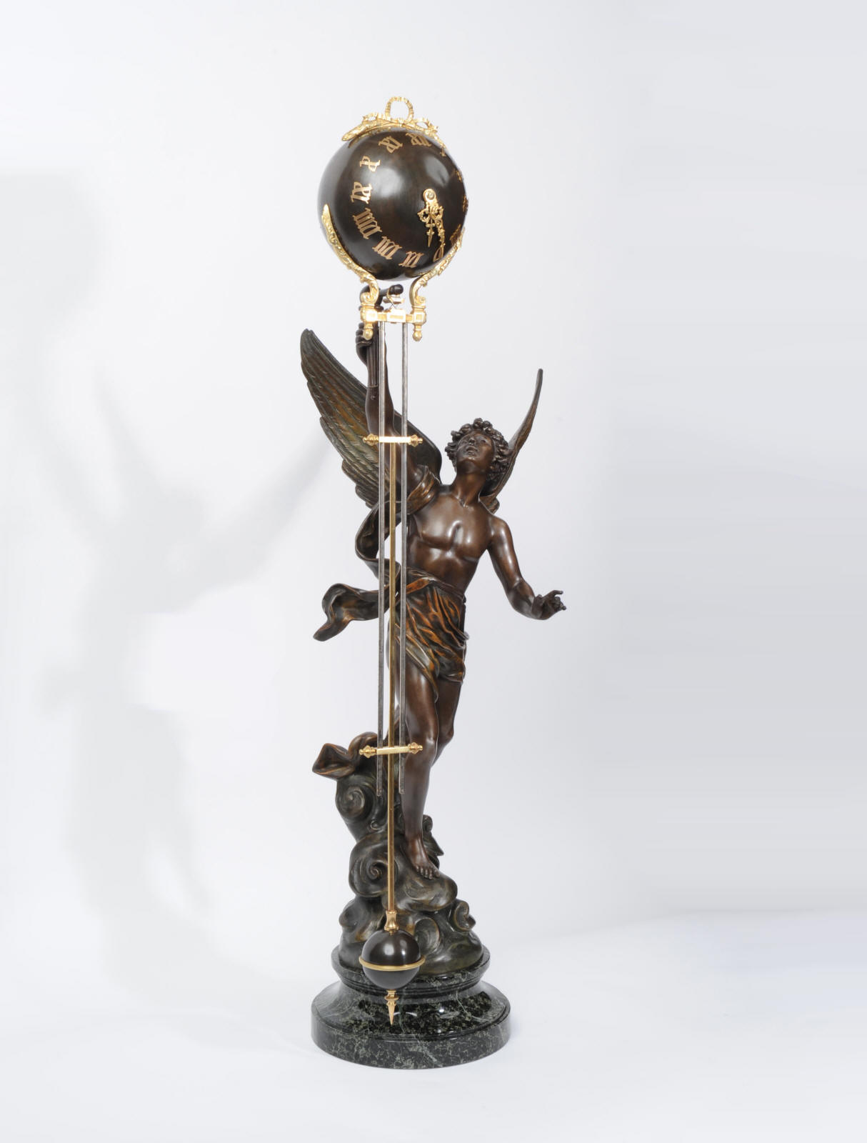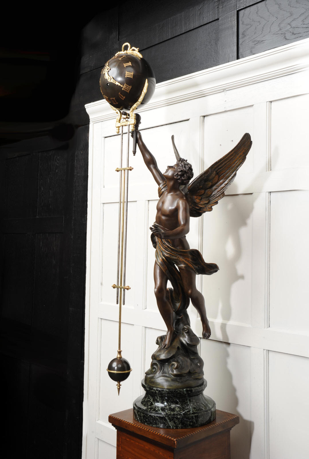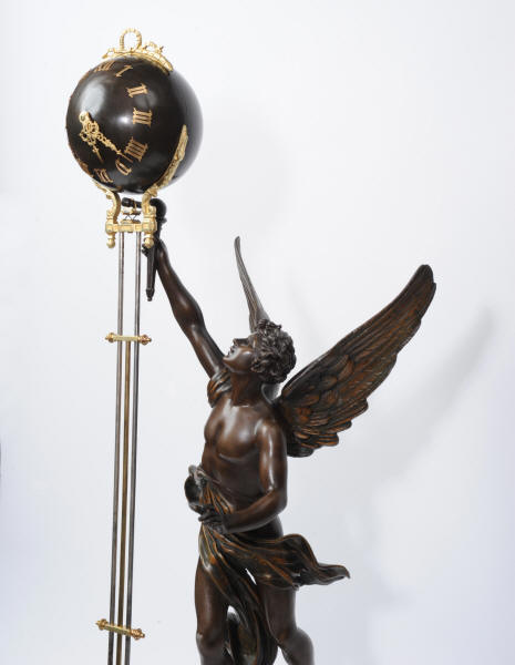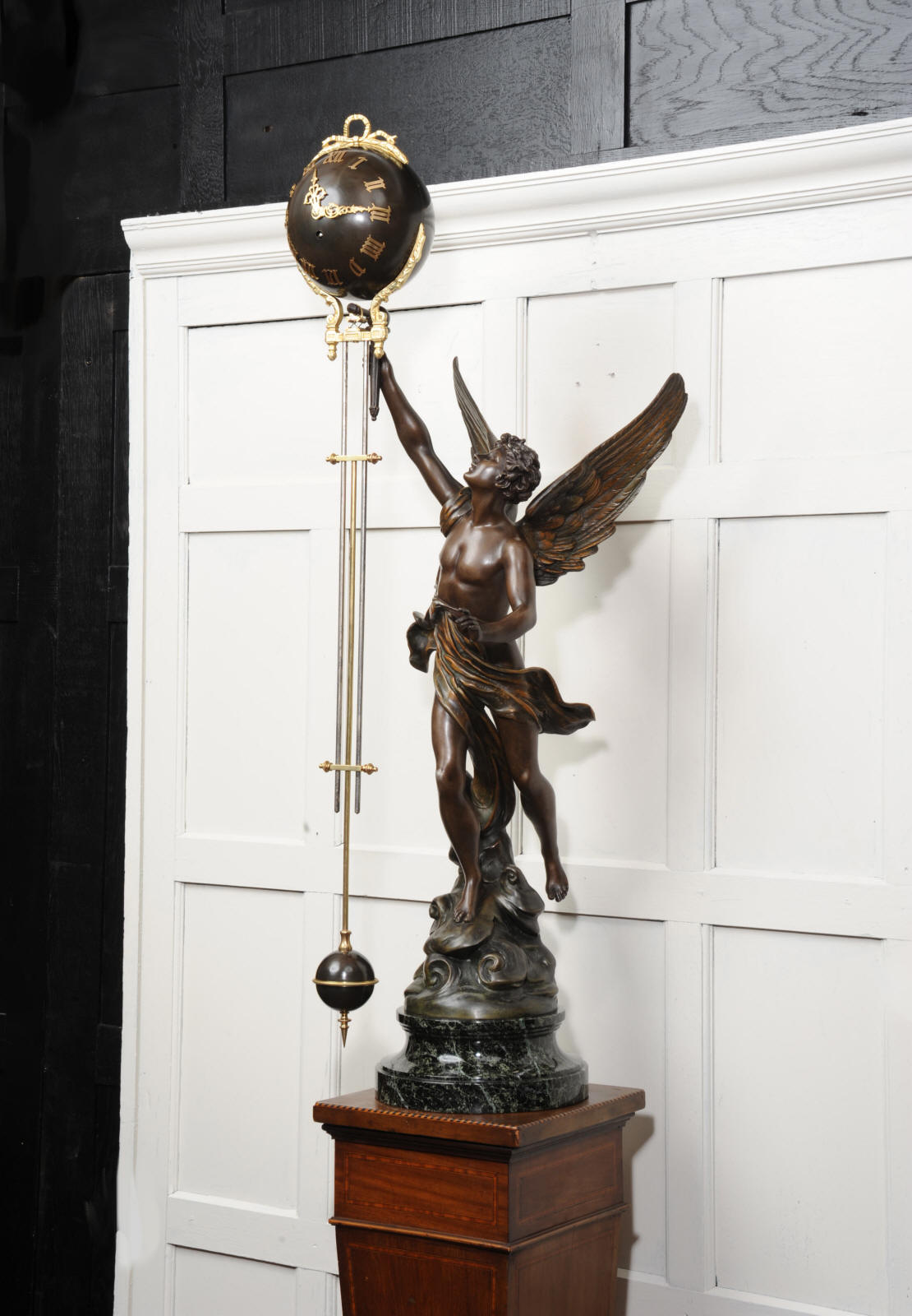 The secret is that this is a compound pendulum, a small, heavy pendulum swings in harmony inside the bronzed sphere to actuate the movement. The winged figure of victory holds the large pendulum aloft triumphantly which swings gently to-and-fro. The modelling is beautifully sharp and crisp, full of drama and movement. The patination of the figure is a lovely deep bronze with the wings and the rocky base having a slight coloured tint. The two spheres of the pendulum have a beautiful bronze patination. The figure has the incised signature 'Bruchon' and a mark 'Paris'. The mahogany pedestal in the pictures is also available. Émile Bruchon is listed in Dictionary if sculptors, Pierre Kjellberg as working in 1880. He was a student of Mathurin Moreau. The French movement is of high quality and is in excellent clean and running condition having been fully overhauled by our clockmaker. It runs for 8 days, click the video clip below to watch this amazing clock running! Condition is excellent, the patinated finish of the figure is in excellent original condition, just some occasional marks, rubs or discolouration. The bronzed finish of the pendulum is also excellent, just a couple of small dents to the rear cover and the silver steel rods of the pendulum are pitted with some plating lacking. Some very slight evidence of old repairs to the dial letters. The gilded parts are beautifully clean and bright. A rare and stunning clock to add to your collection.