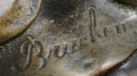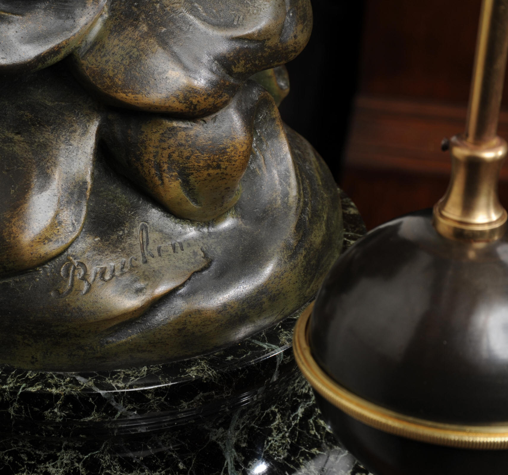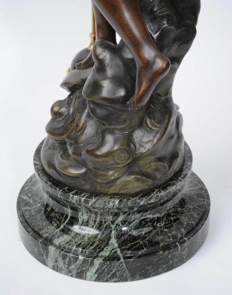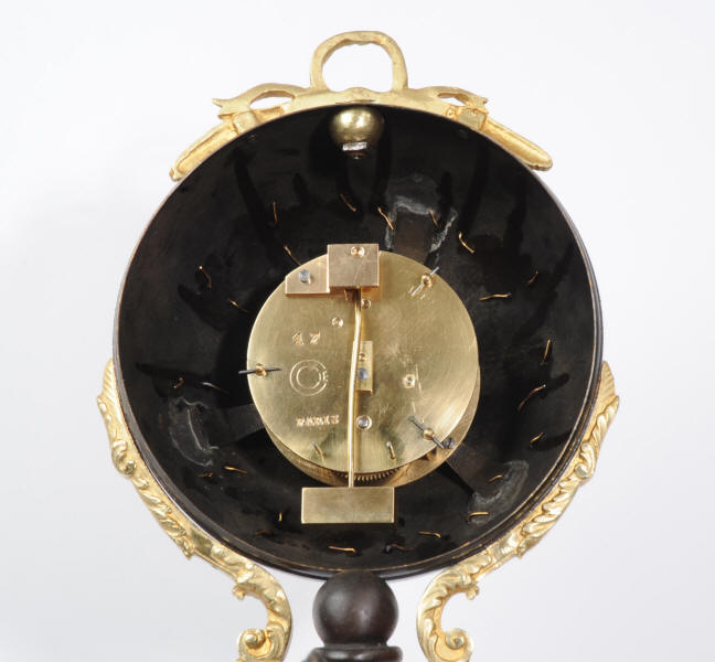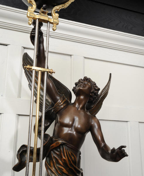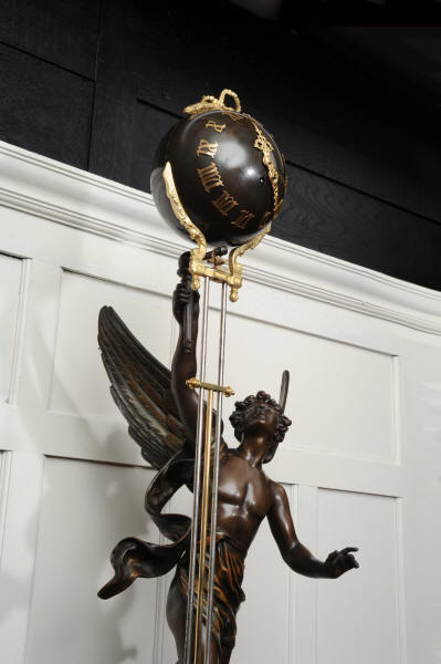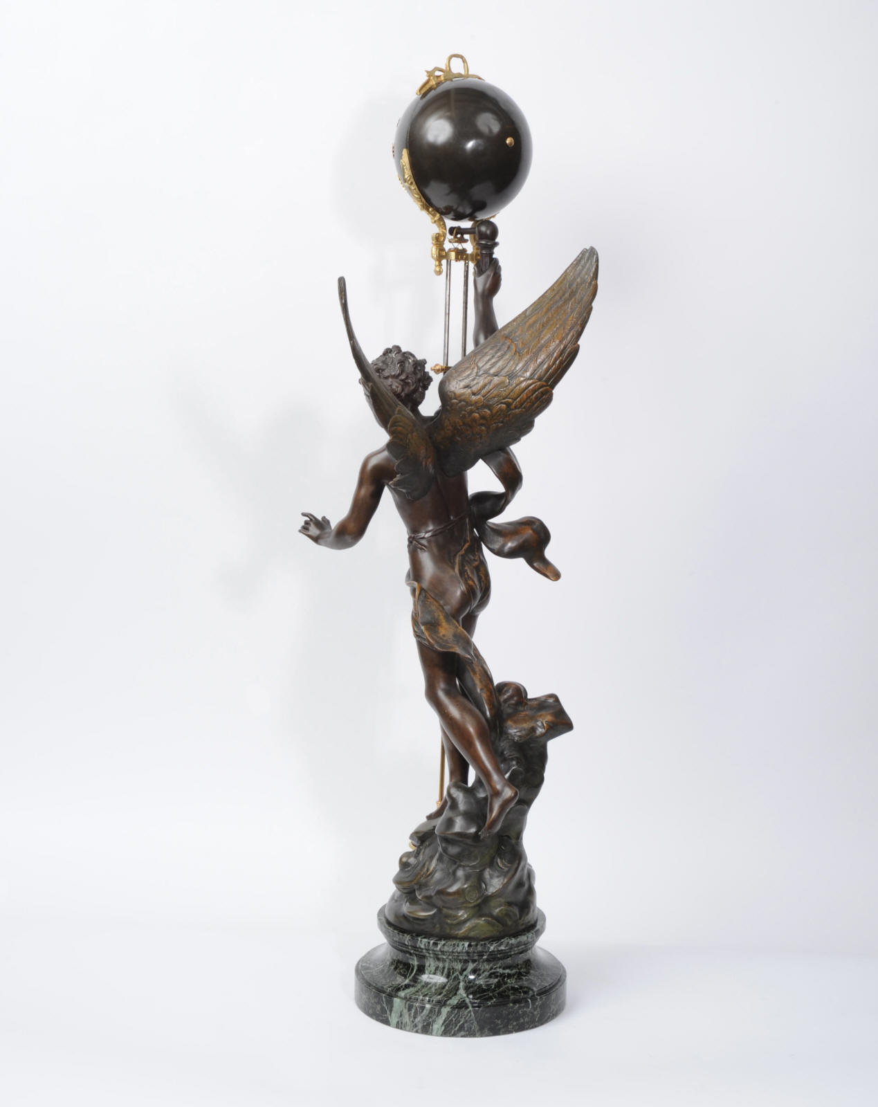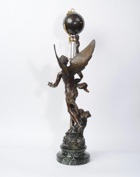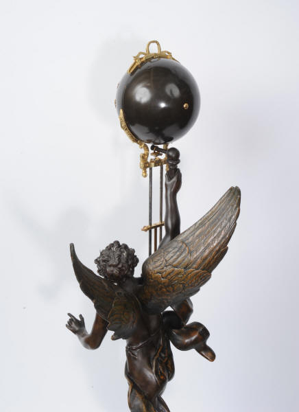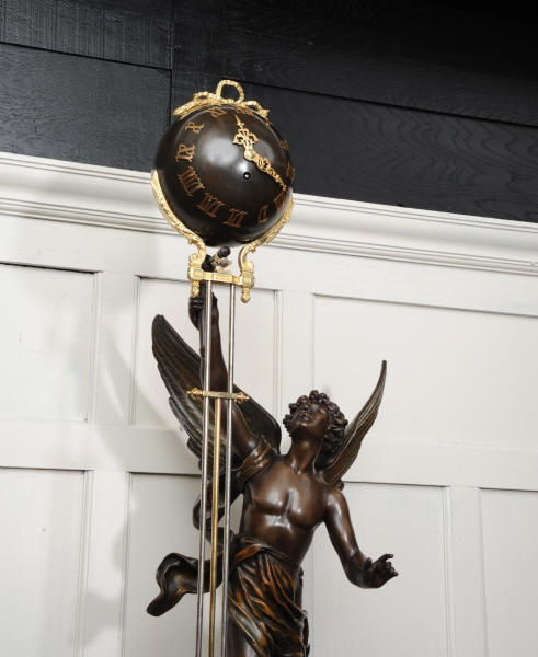 The secret is that this is a compound pendulum, a small, heavy pendulum swings in harmony inside the bronzed sphere to actuate the movement. The winged figure of victory holds the large pendulum aloft triumphantly which swings gently to-and-fro. The modelling is beautifully sharp and crisp, full of drama and movement. The patination of the figure is a lovely deep bronze with the wings and the rocky base having a slight coloured tint. The two spheres of the pendulum have a beautiful bronze patination. The figure has the incised signature 'Bruchon' and a mark 'Paris'. The mahogany pedestal in the pictures is also available. Émile Bruchon is listed in Dictionary if sculptors, Pierre Kjellberg as working in 1880. He was a student of Mathurin Moreau. The French movement is of high quality and is in excellent clean and running condition having been fully overhauled by our clockmaker. It runs for 8 days, click the video clip below to watch this amazing clock running! Condition is excellent, the patinated finish of the figure is in excellent original condition, just some occasional marks, rubs or discolouration. The bronzed finish of the pendulum is also excellent, just a couple of small dents to the rear cover and the silver steel rods of the pendulum are pitted with some plating lacking. Some very slight evidence of old repairs to the dial letters. The gilded parts are beautifully clean and bright. A rare and stunning clock to add to your collection.