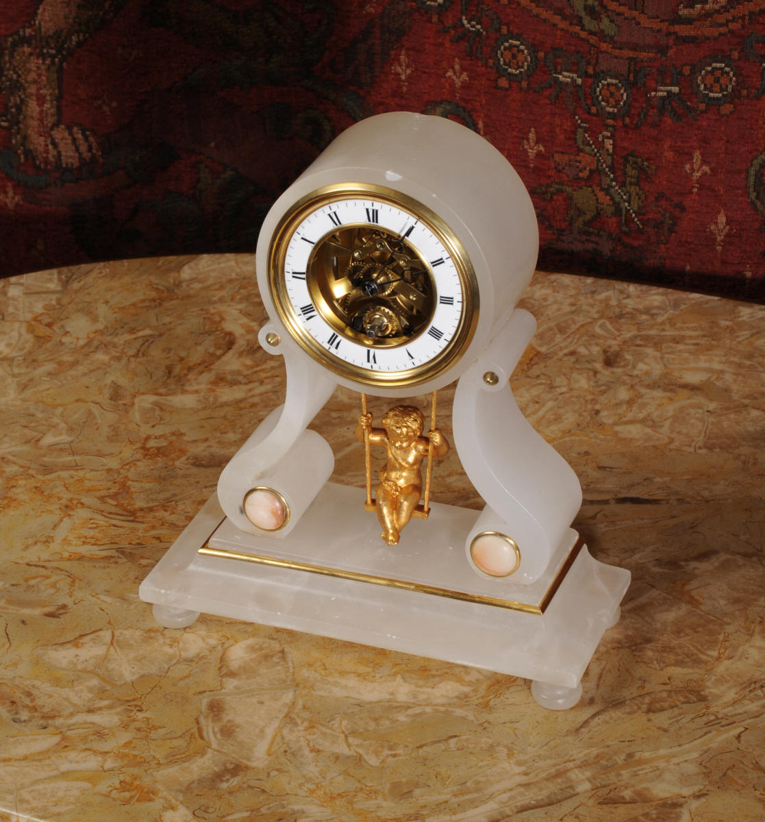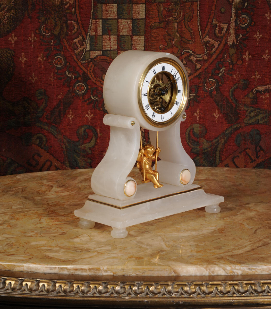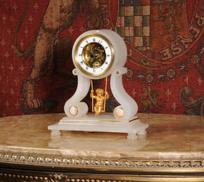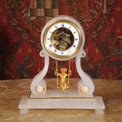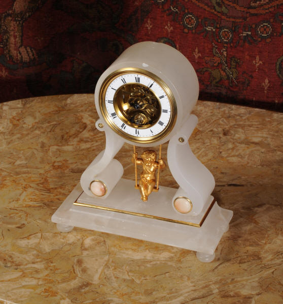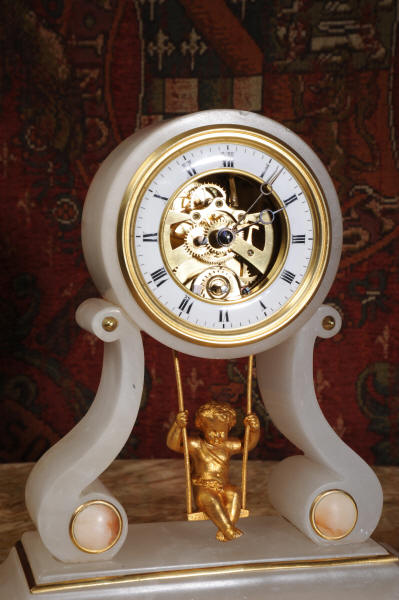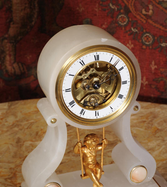 Cherub On A Swing Boudoir Clock with visible escapement